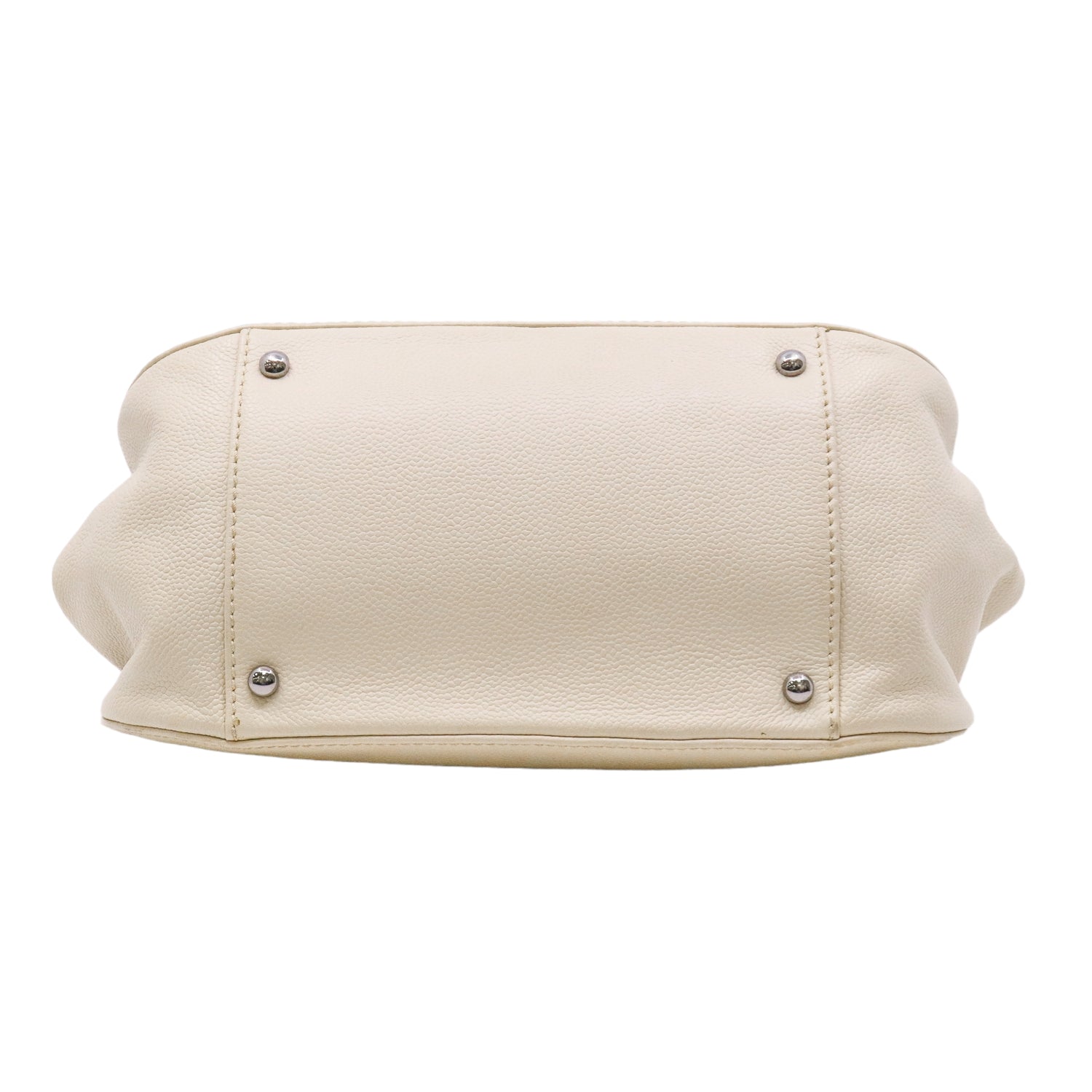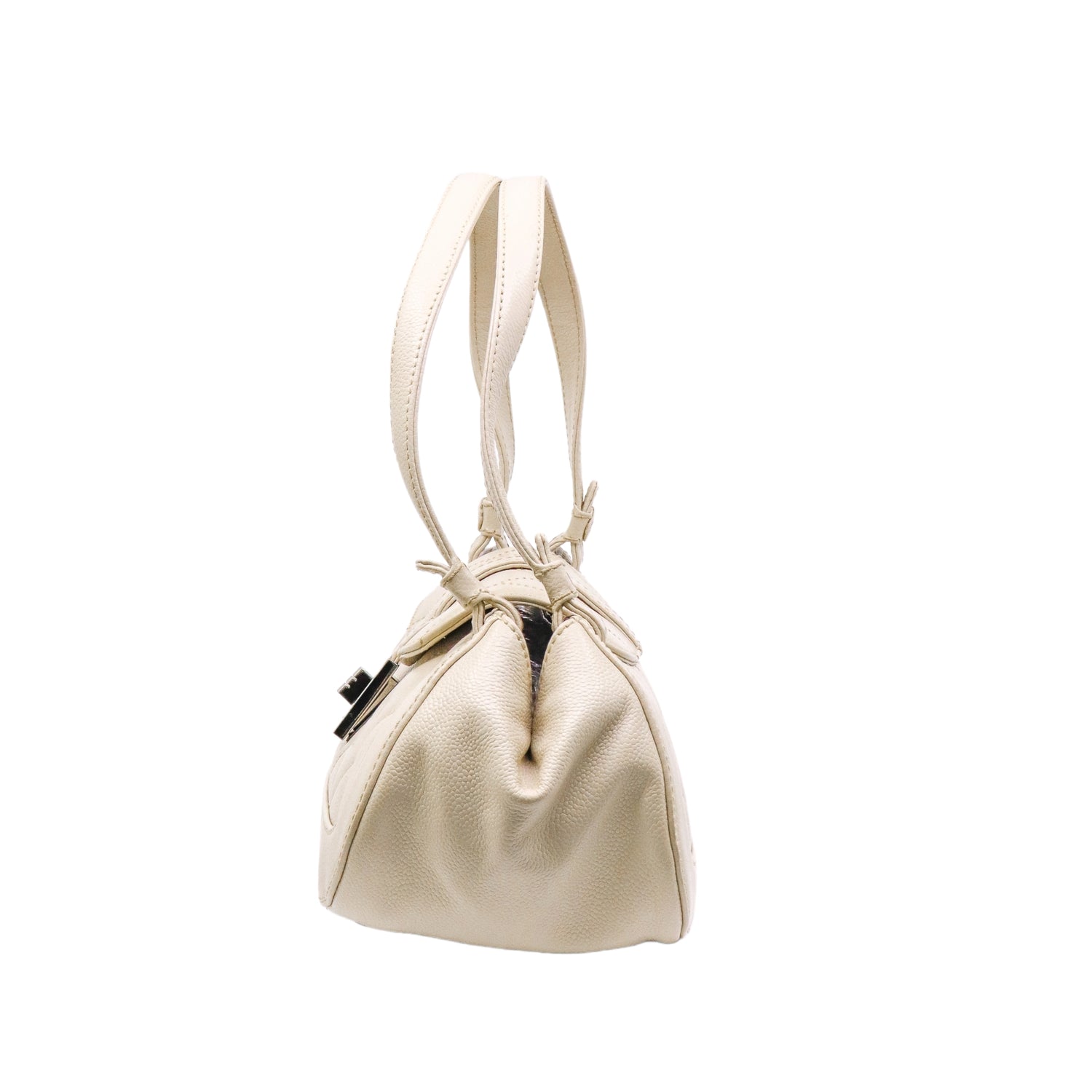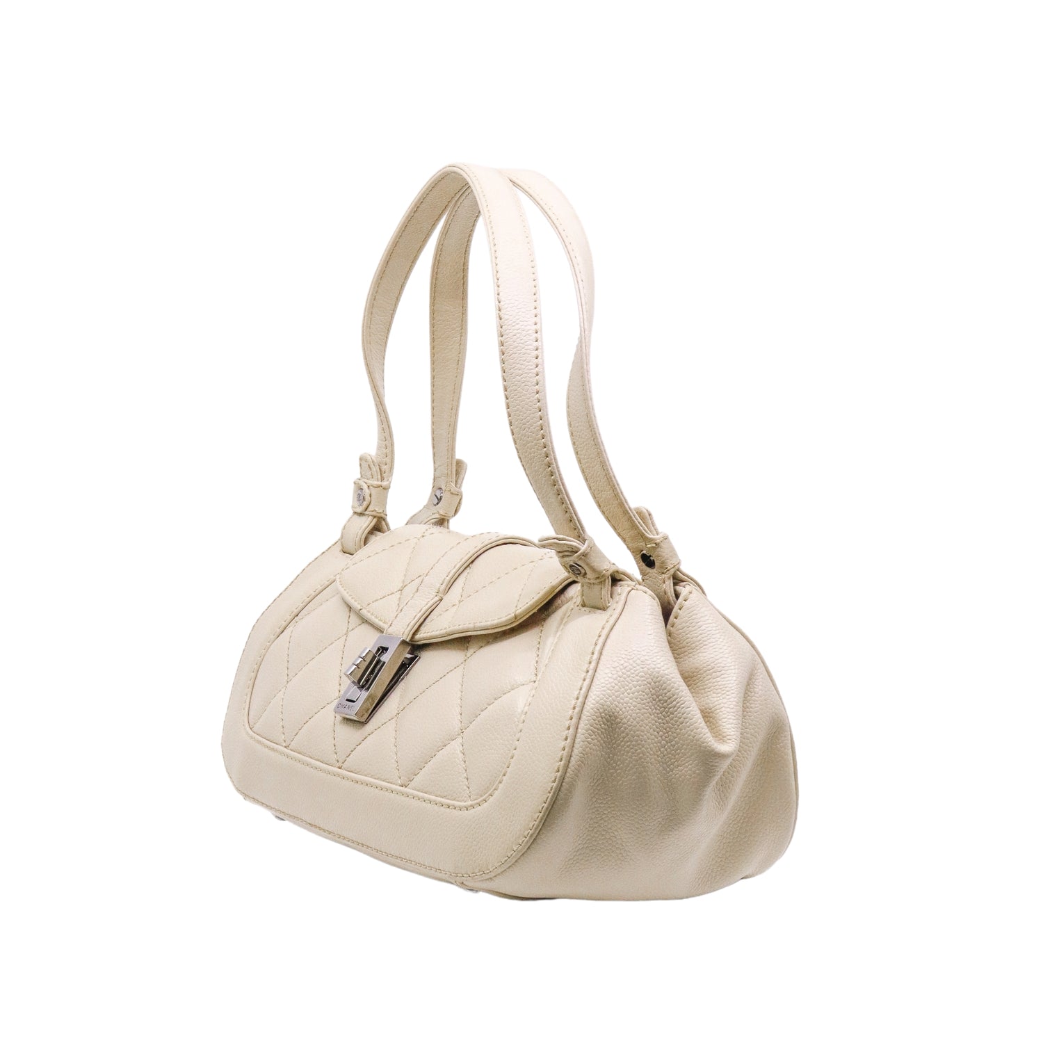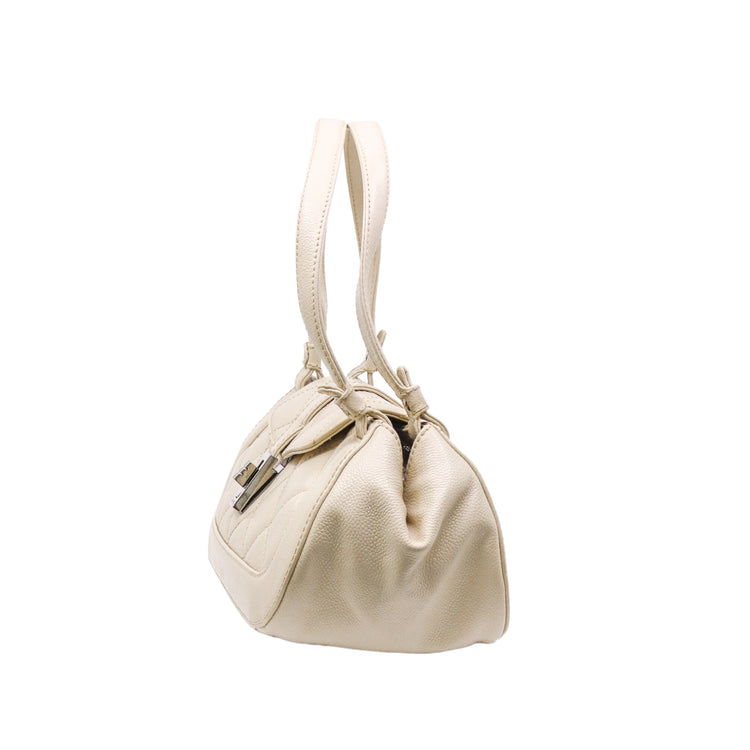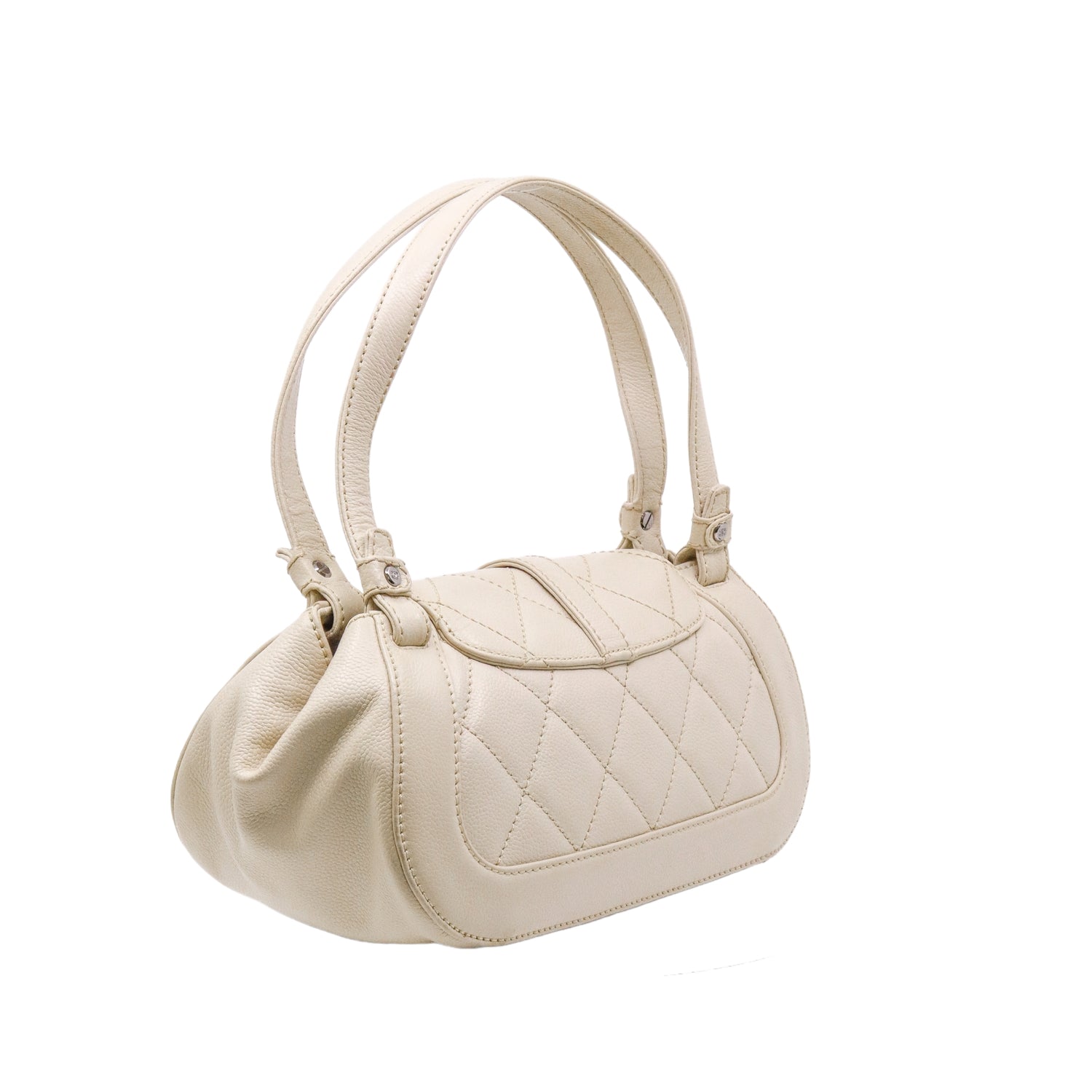 Bolso clásico Chanel Mademoiselle en piel tipo caviar acolchada en color beige, forro interno poco sucio en mismo tono, con 2 asas semi-rígidas, bolso interno con cierre de cremallera, broche frontal y herrajes en metal plateado.