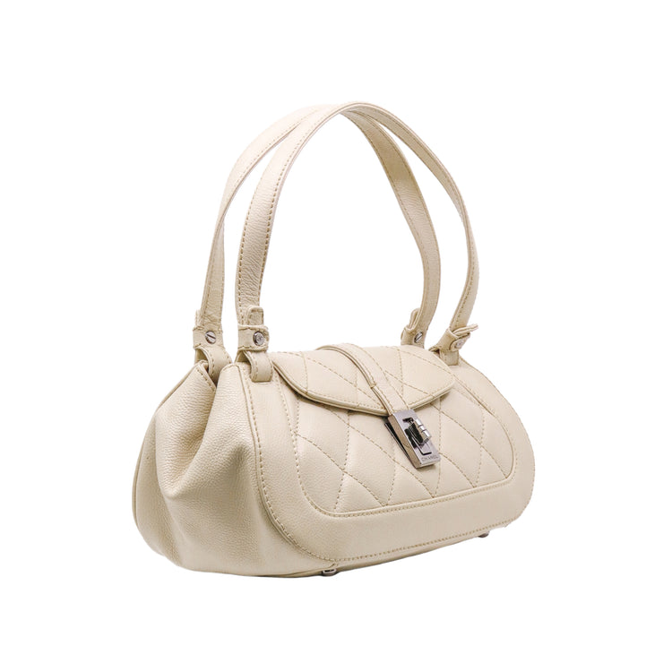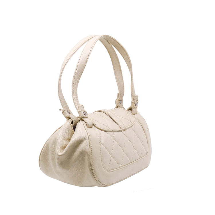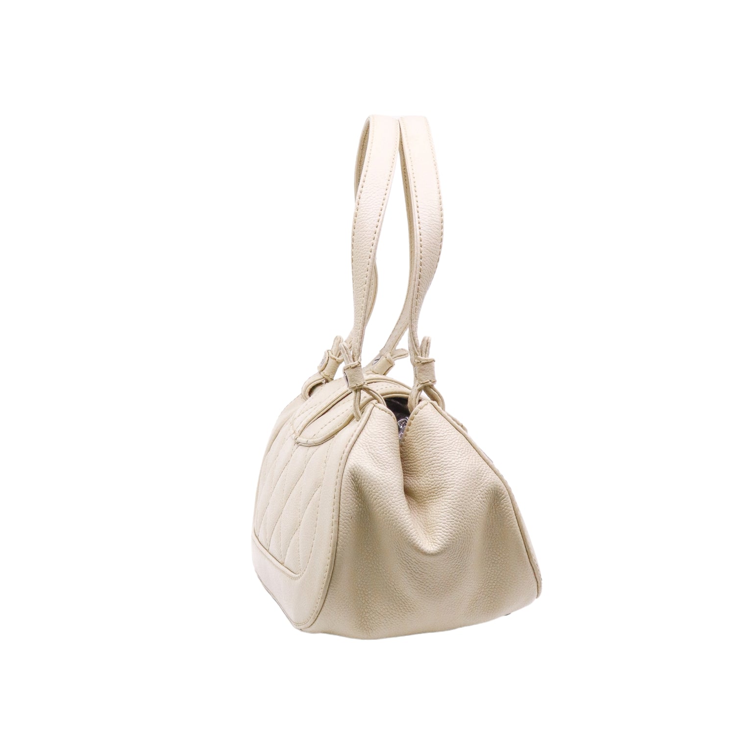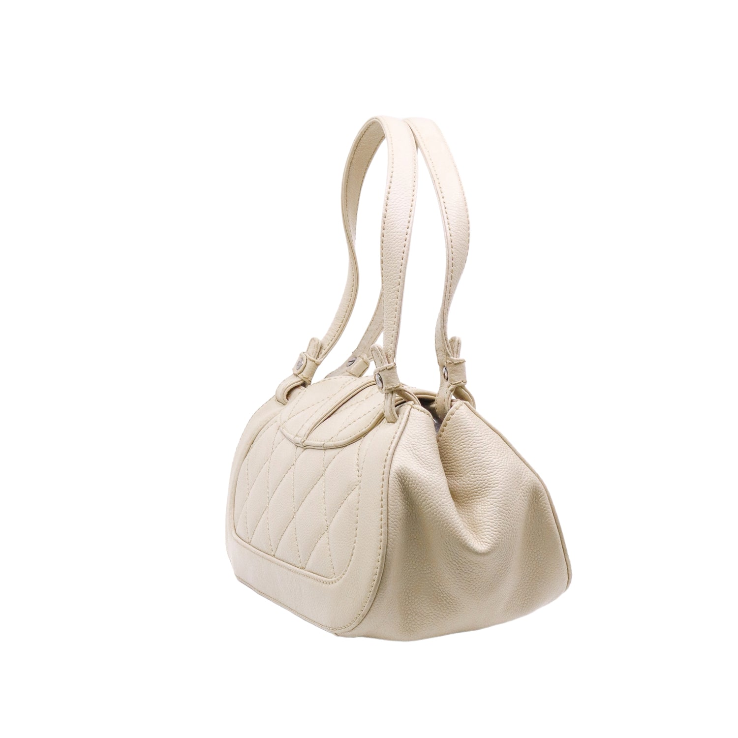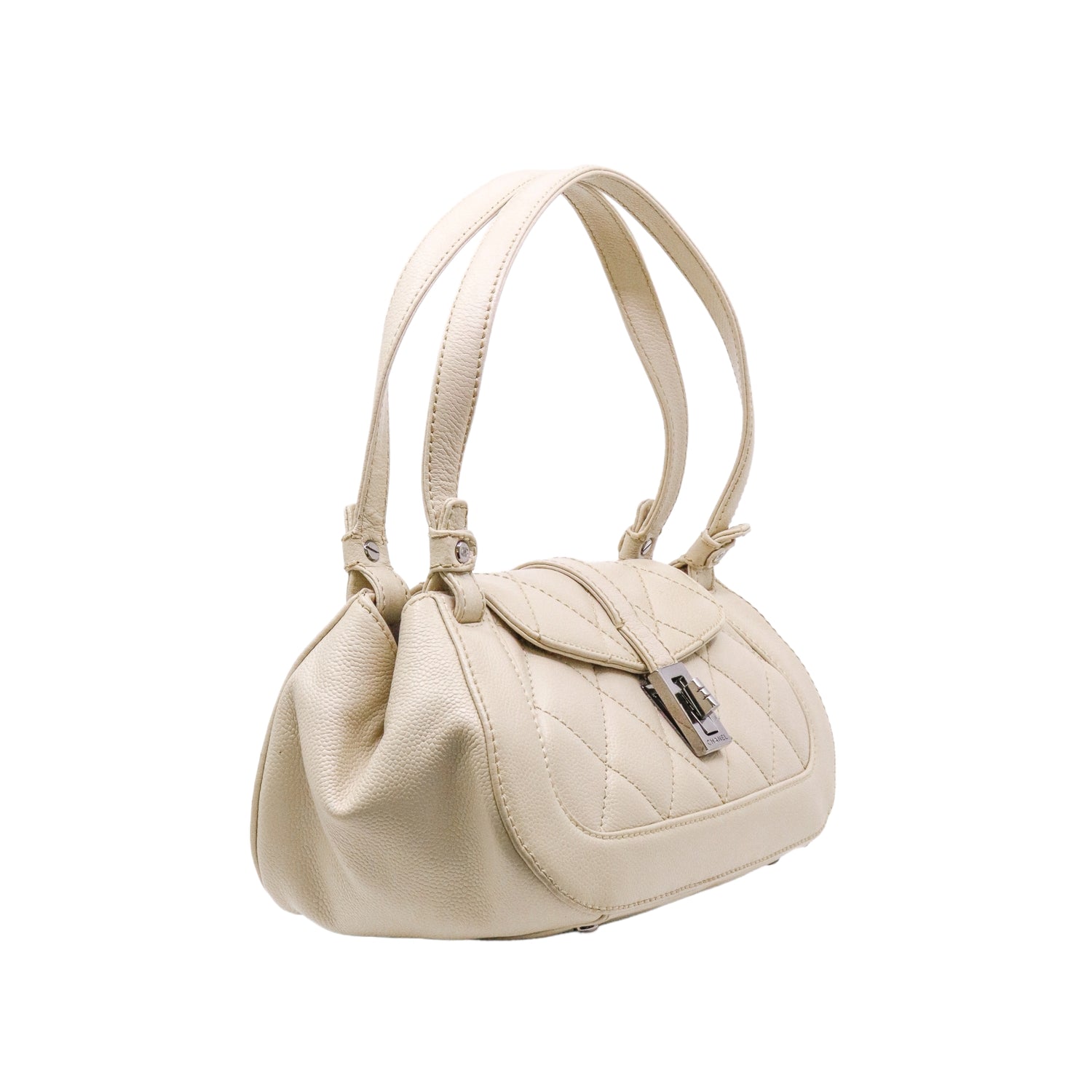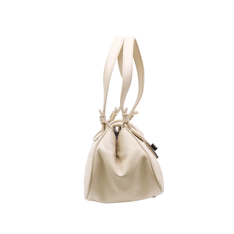 Bolso clásico Chanel Mademoiselle en piel tipo caviar acolchada en color beige, forro interno poco sucio en mismo tono, con 2 asas semi-rígidas, bolso interno con cierre de cremallera, broche frontal y herrajes en metal plateado.