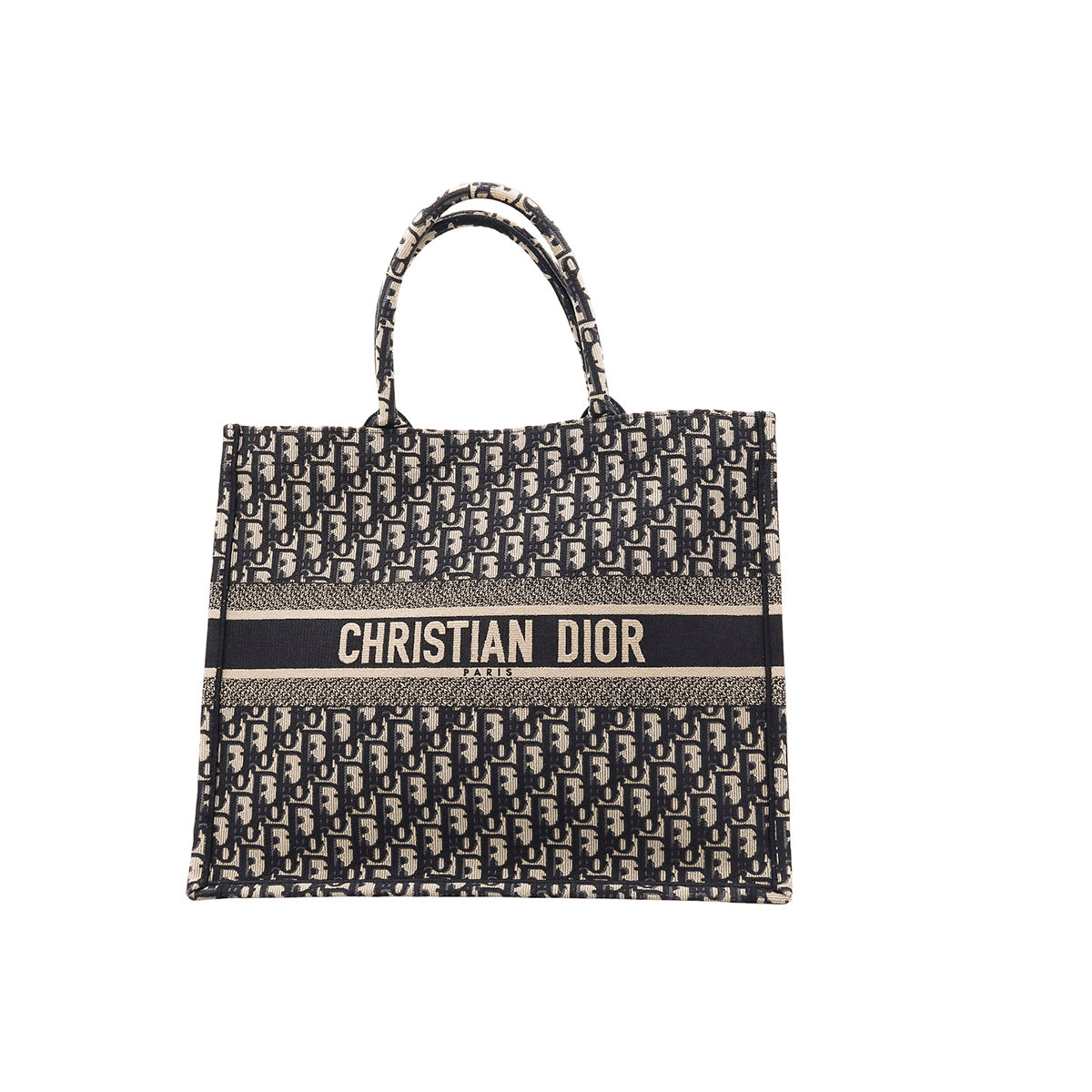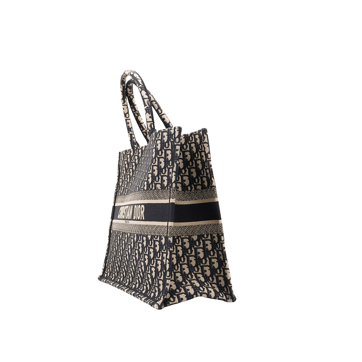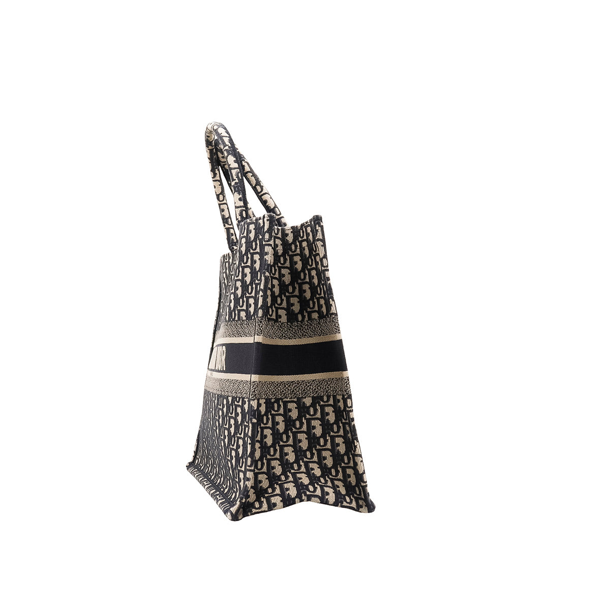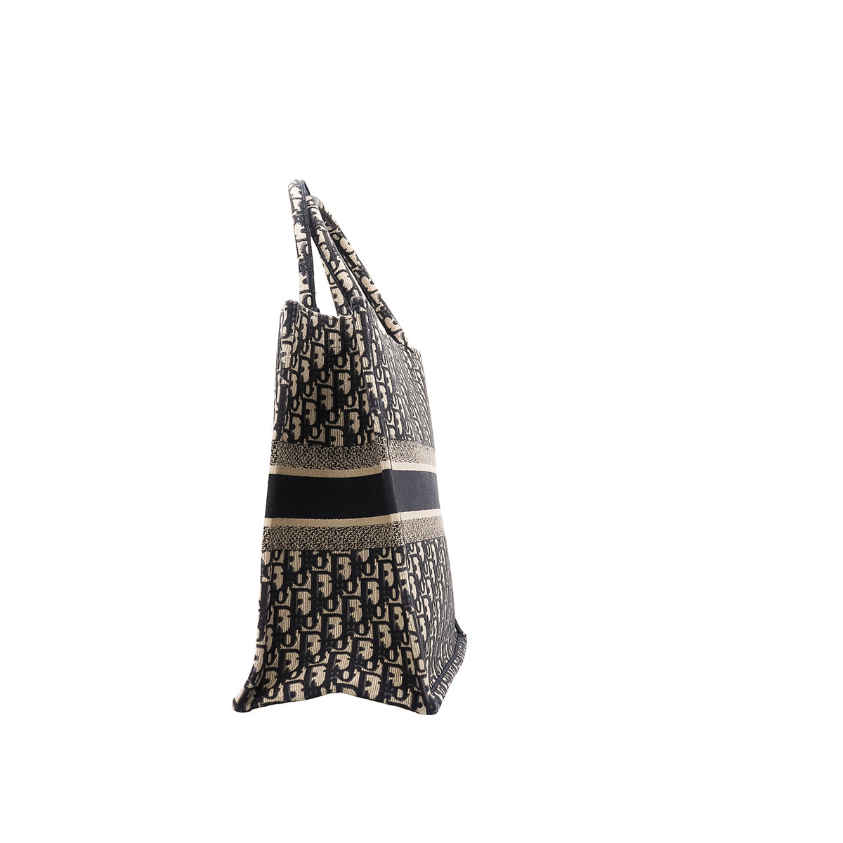 Bolso tipo Tote de la linea Book de Christian Dior, confeccionada en jacquard Oblique color negro-beige, con doble asa rígida de mano.