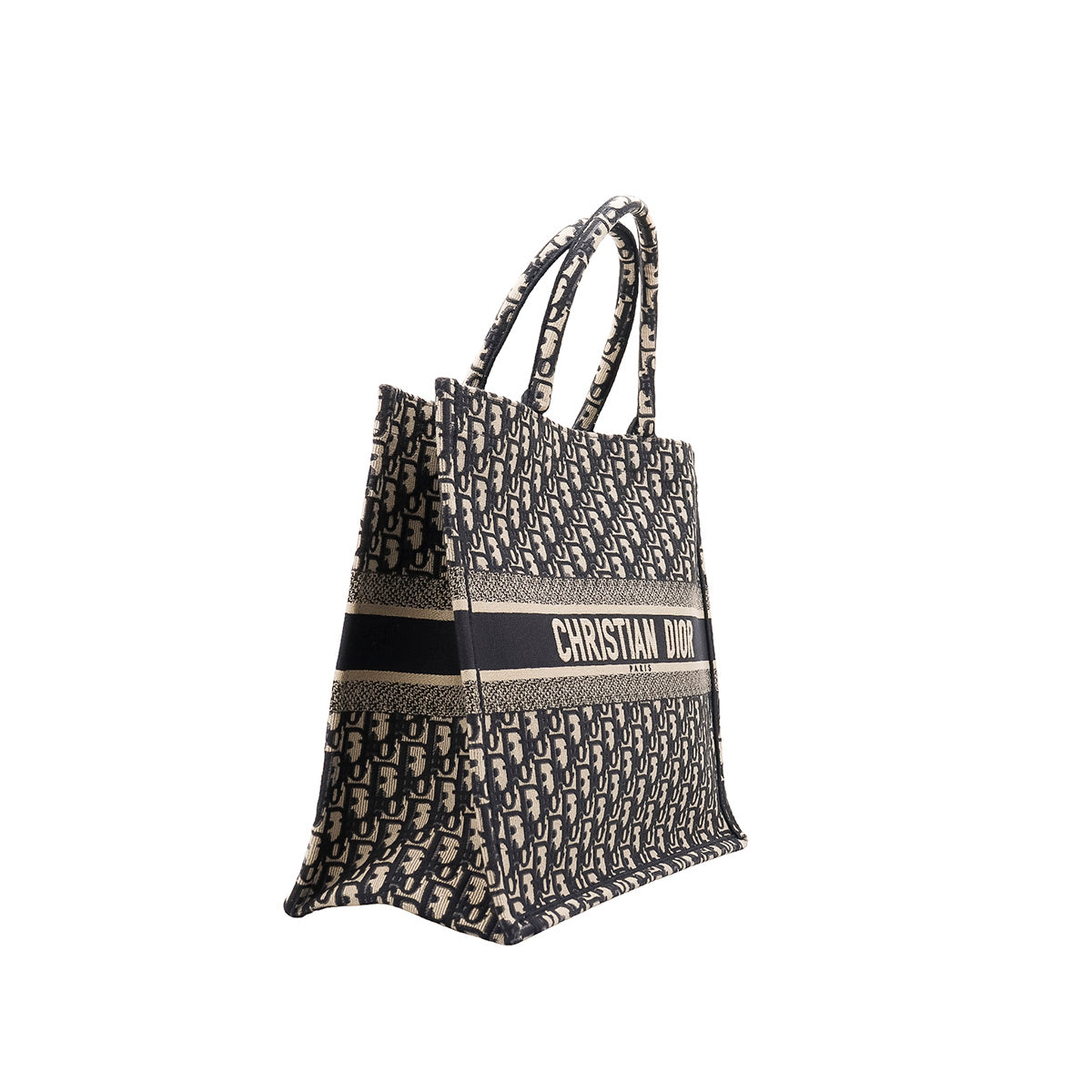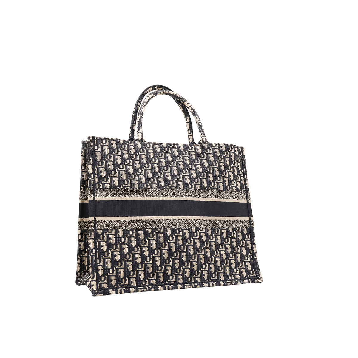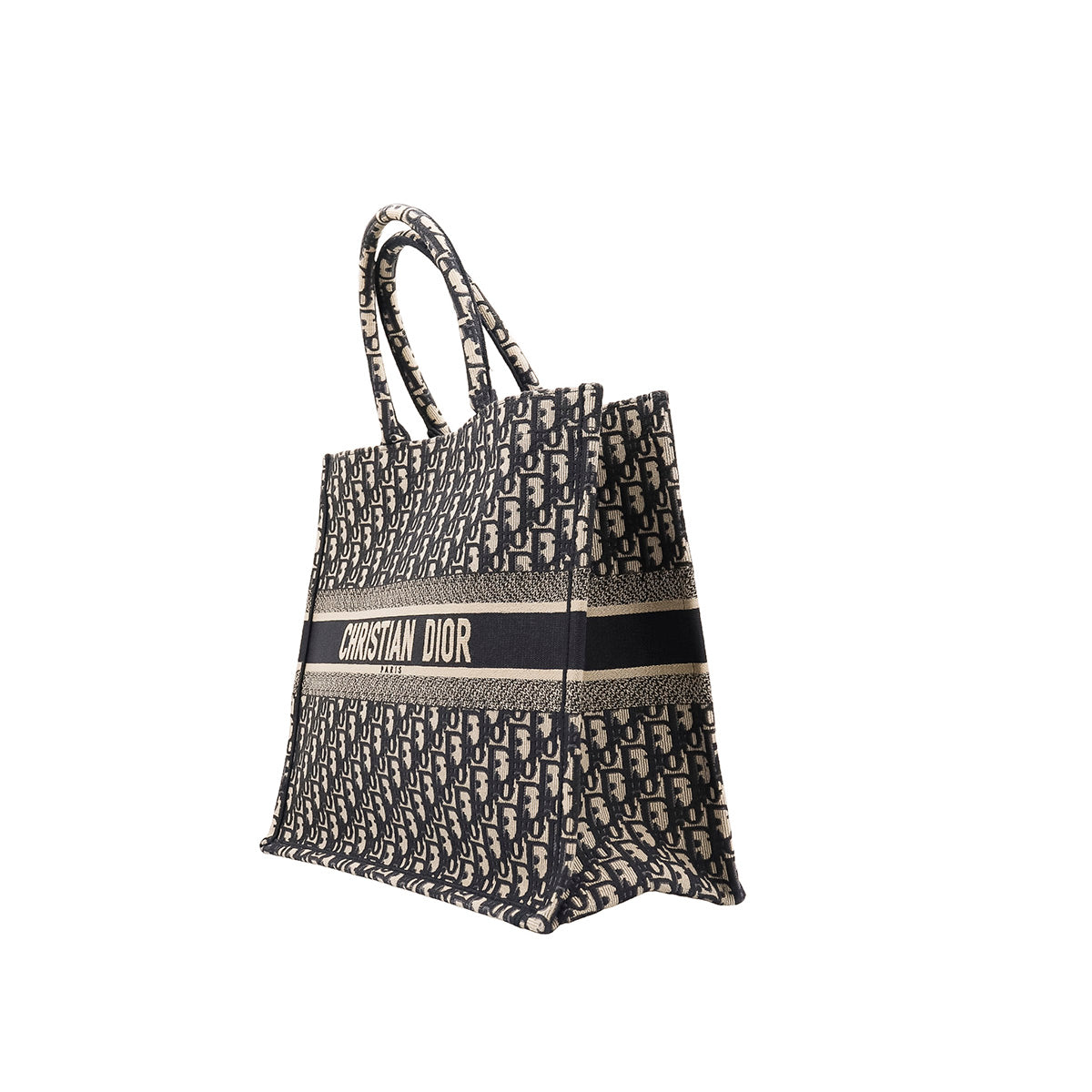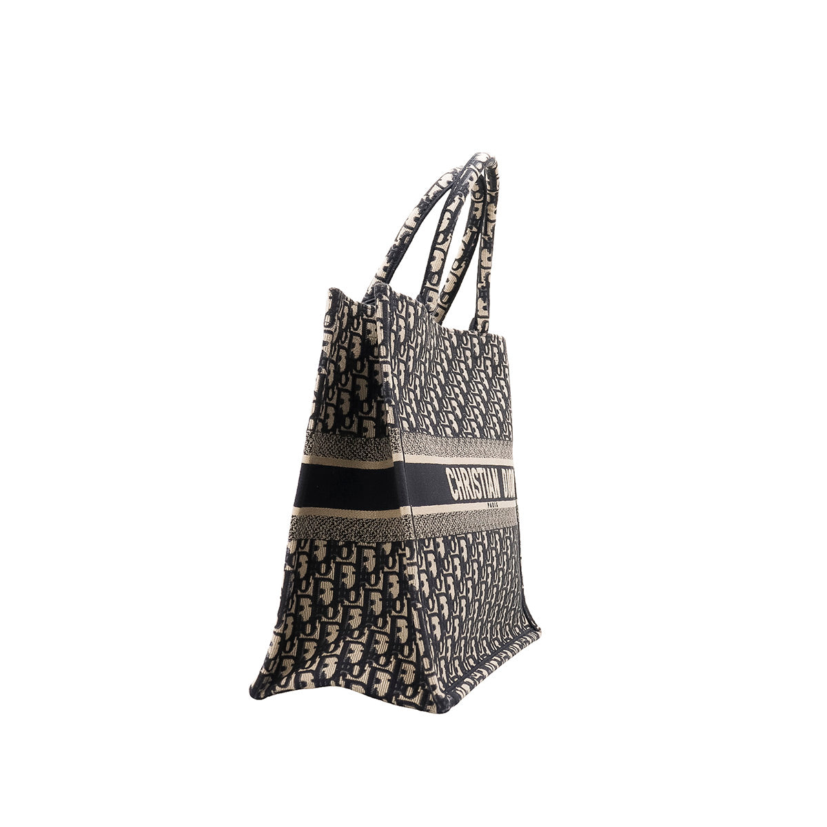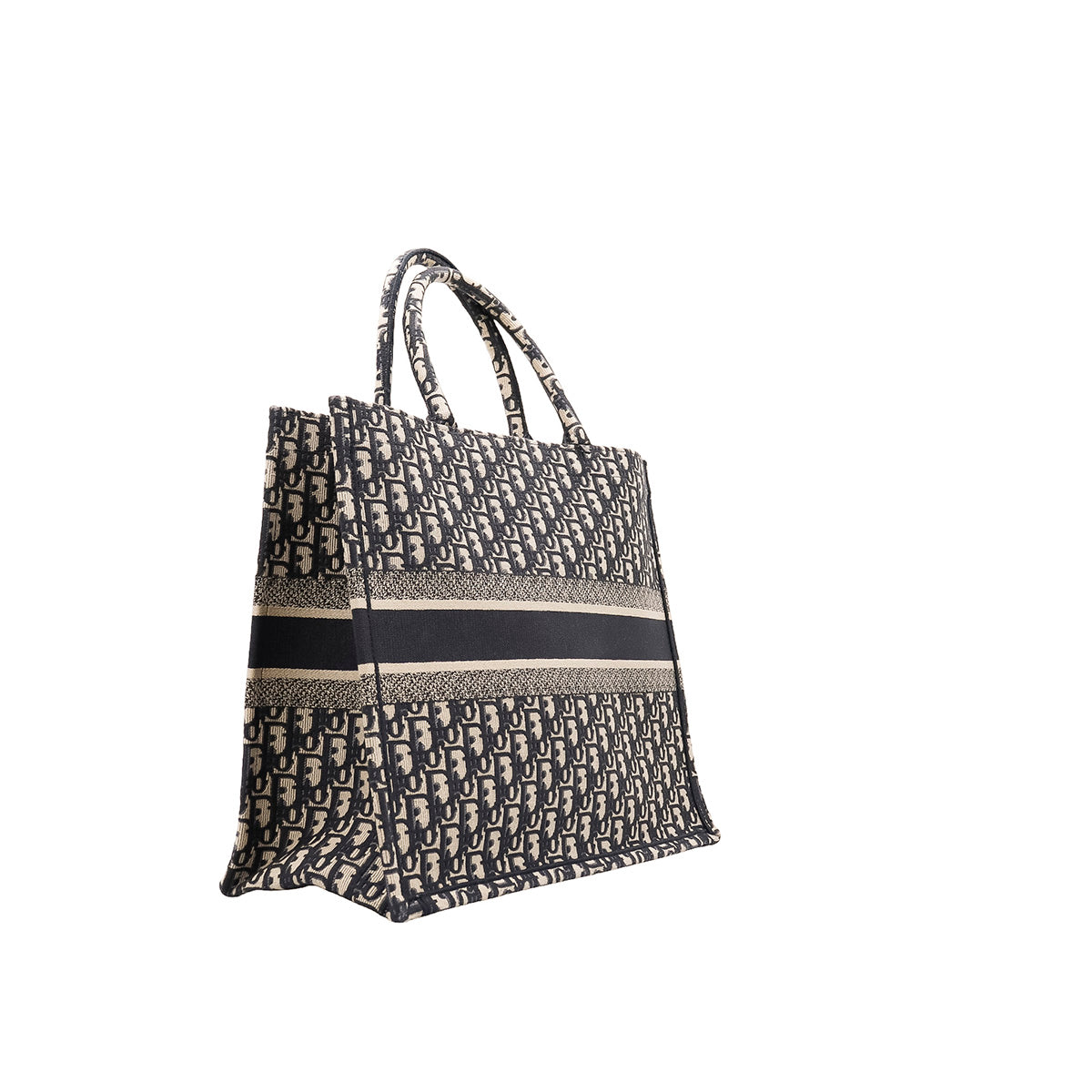 Bolso tipo Tote de la linea Book de Christian Dior, confeccionada en jacquard Oblique color negro-beige, con doble asa rígida de mano.