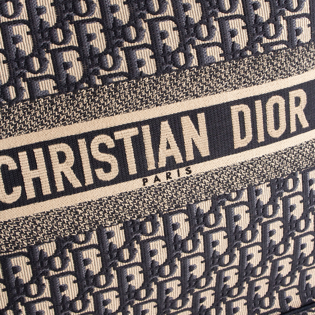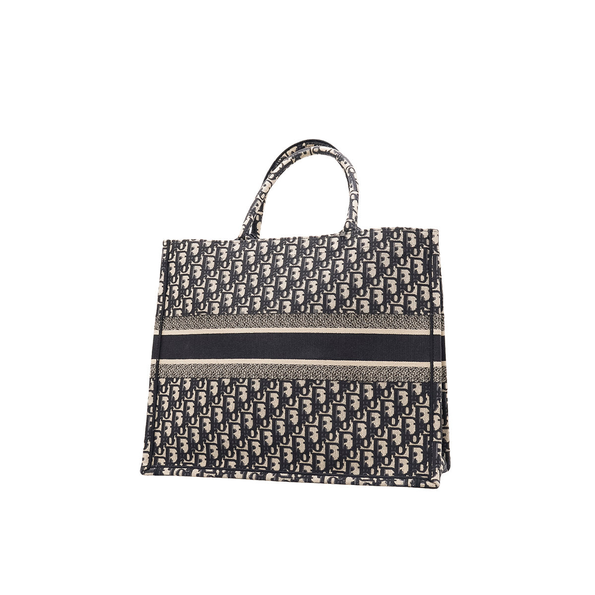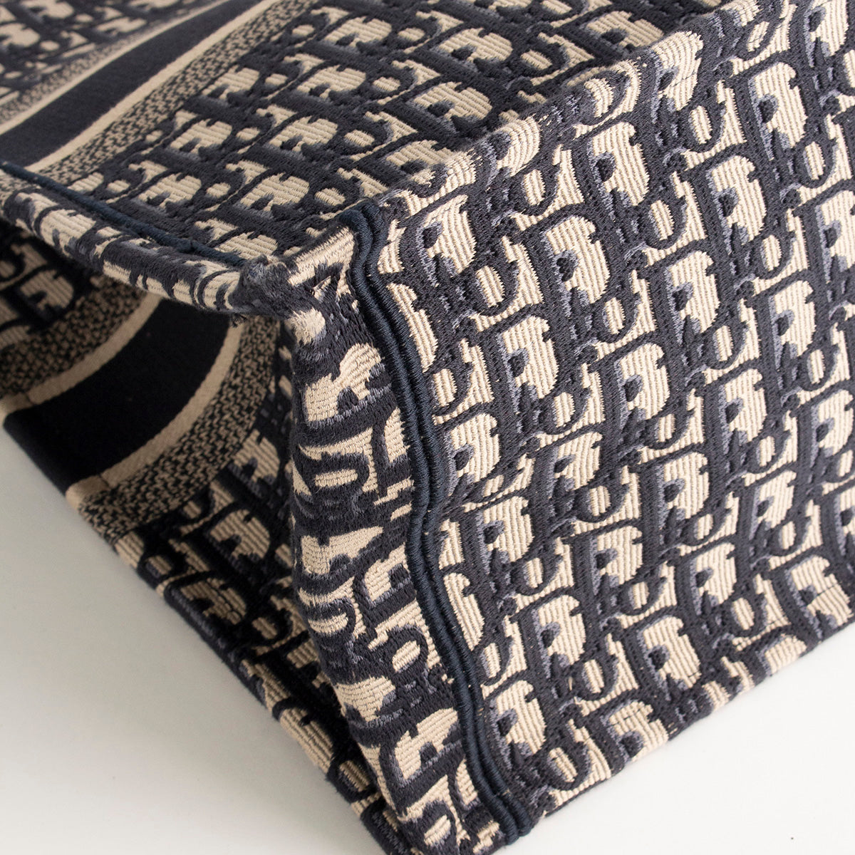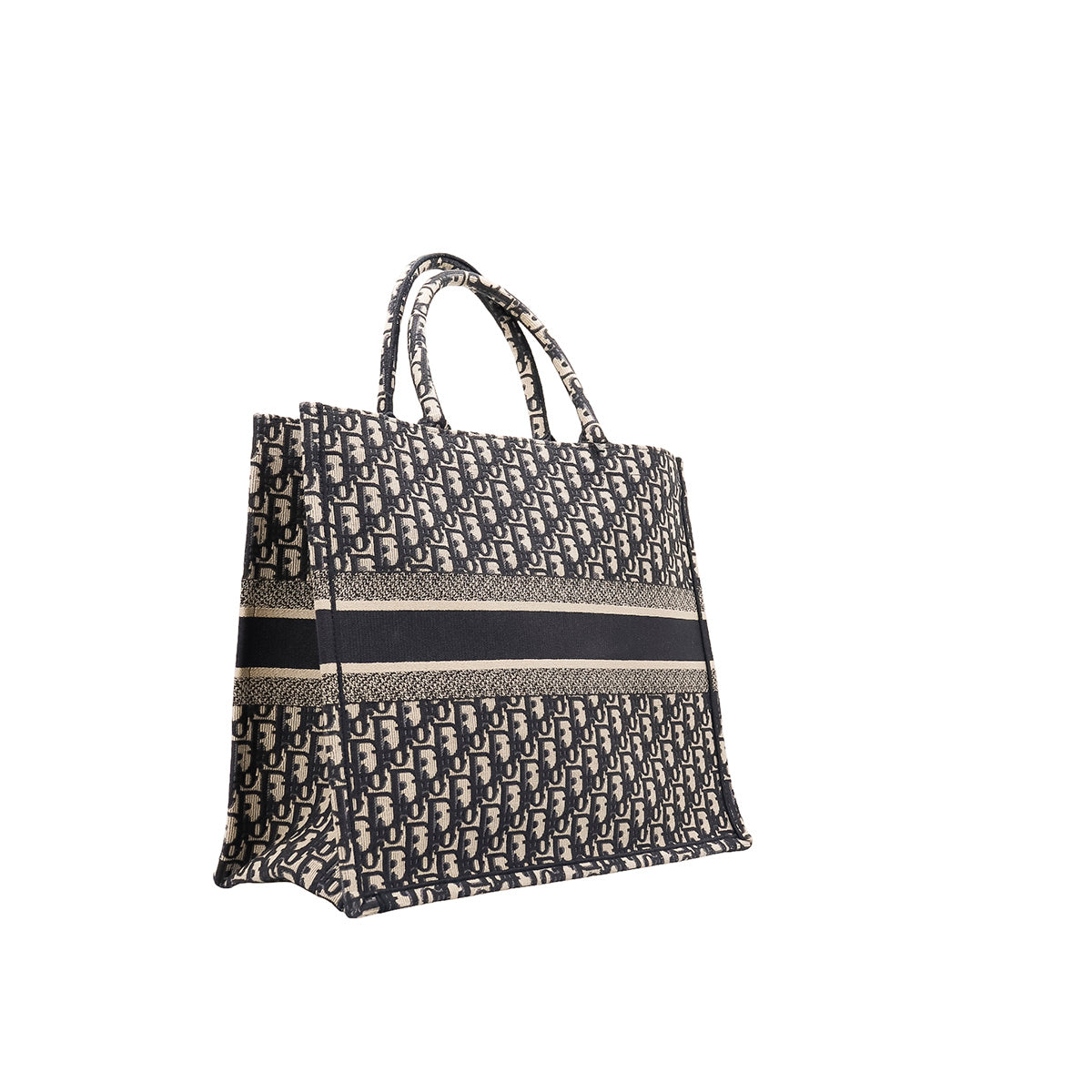 Bolso tipo Tote de la linea Book de Christian Dior, confeccionada en jacquard Oblique color negro-beige, con doble asa rígida de mano.
