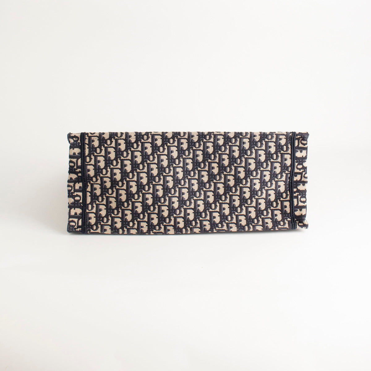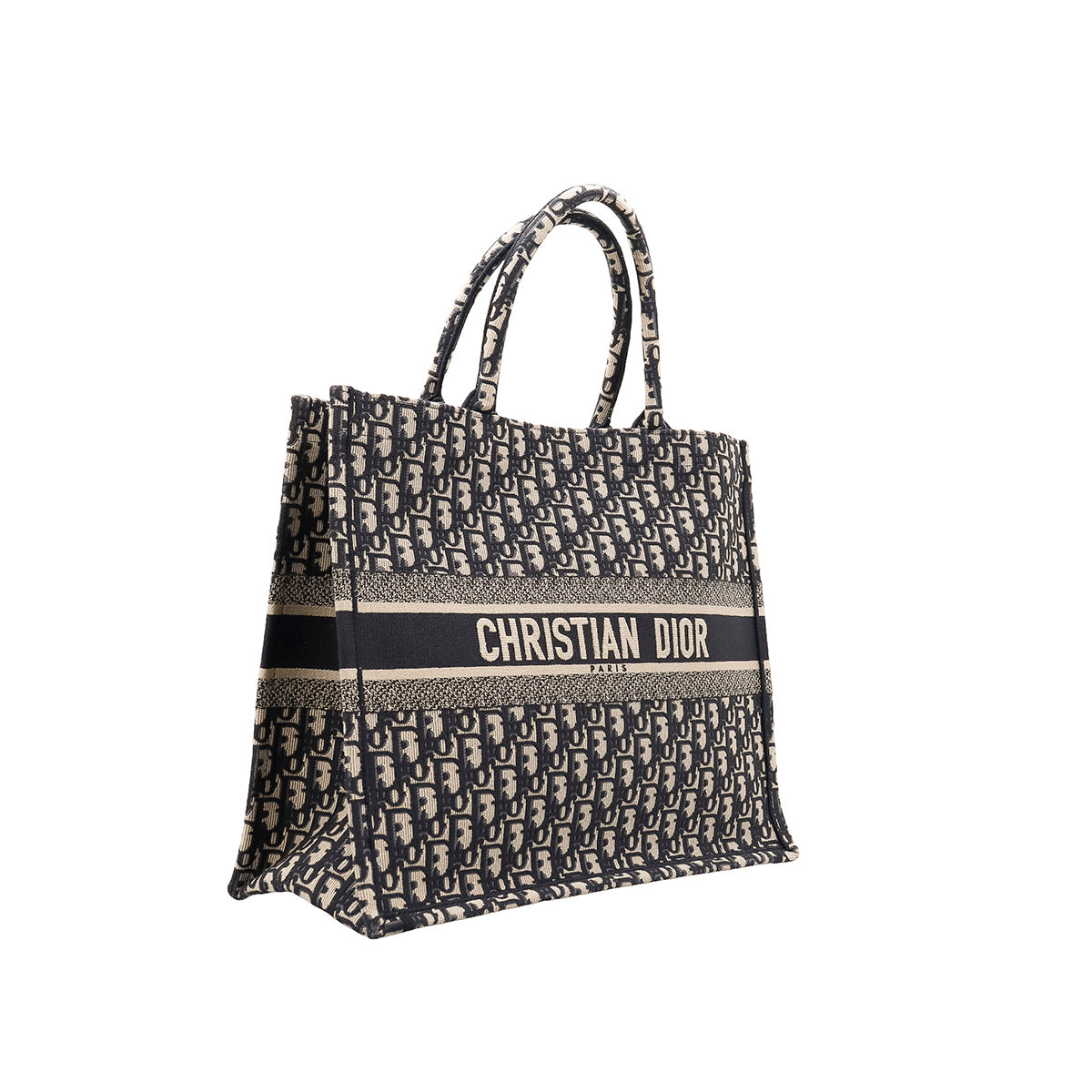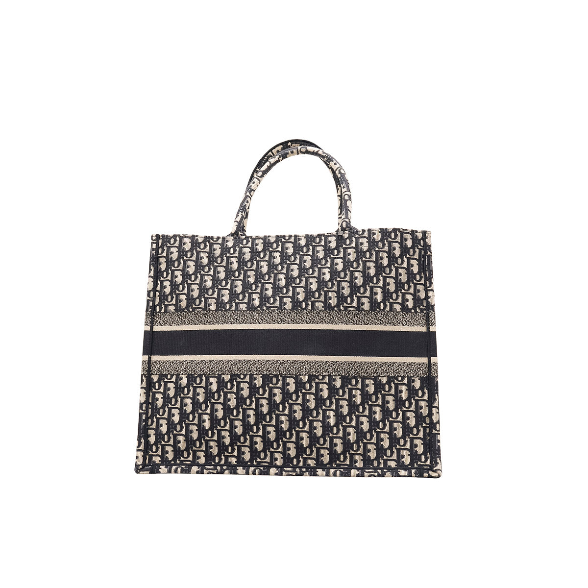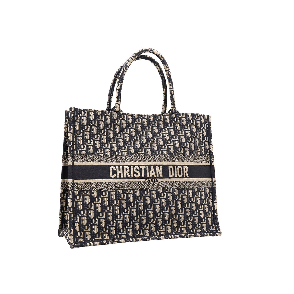 Bolso tipo Tote de la linea Book de Christian Dior, confeccionada en jacquard Oblique color negro-beige, con doble asa rígida de mano.