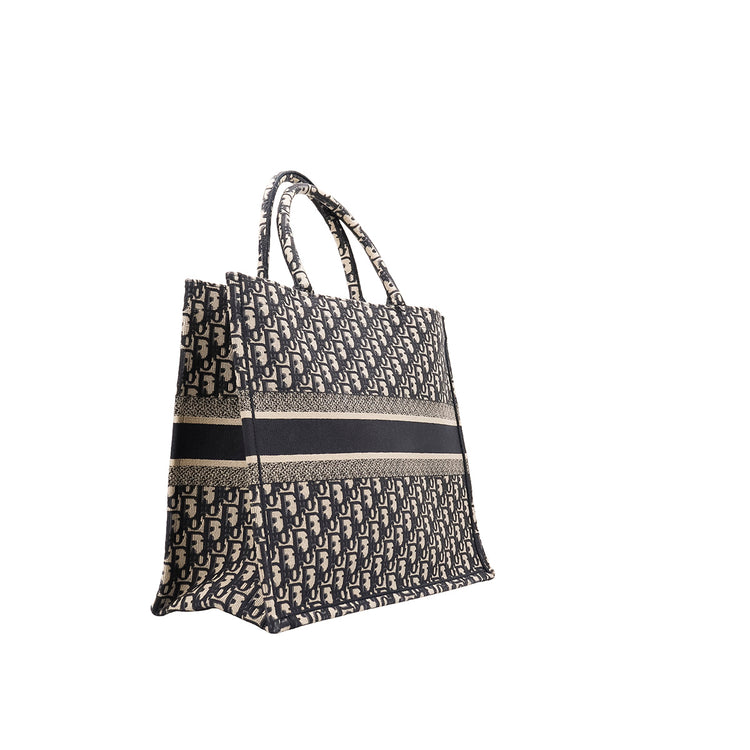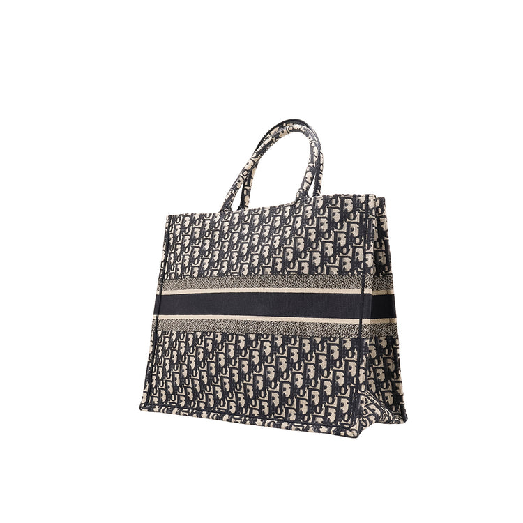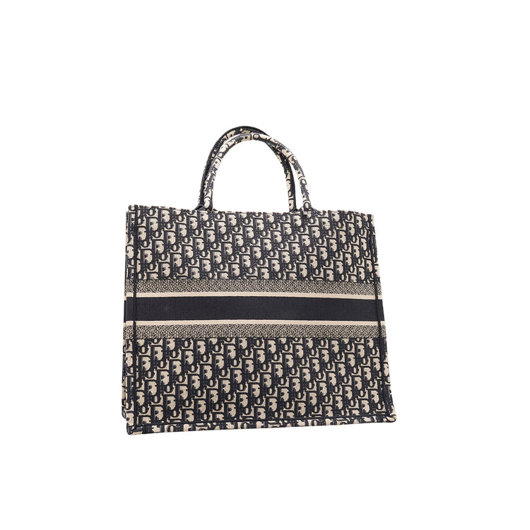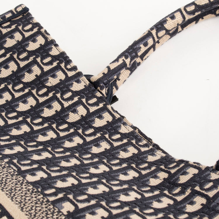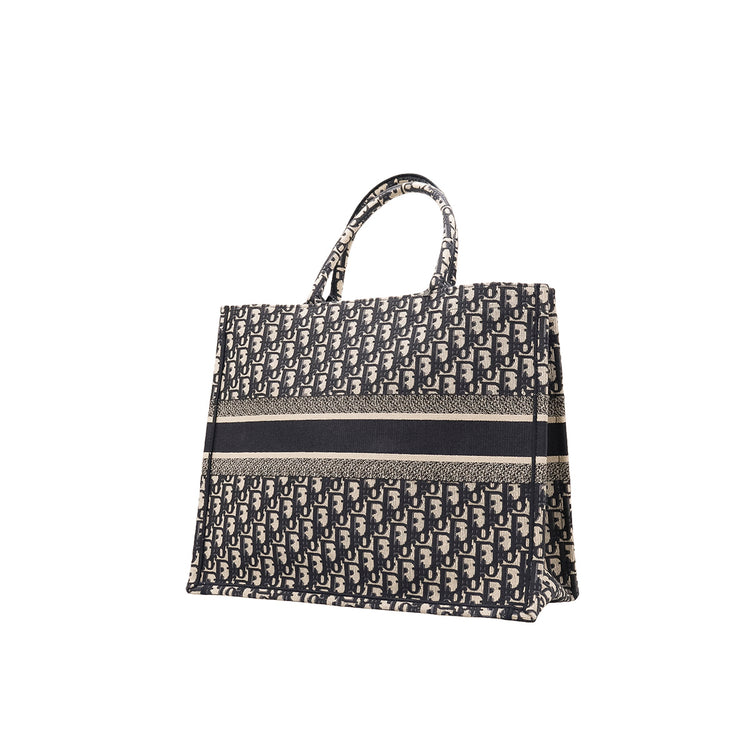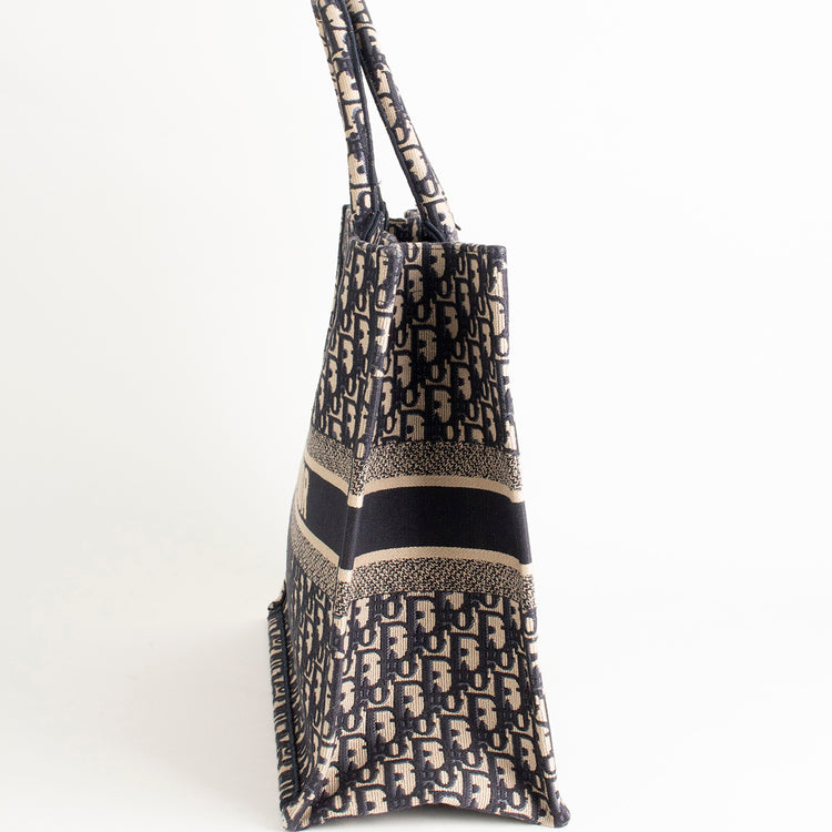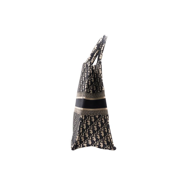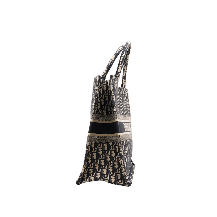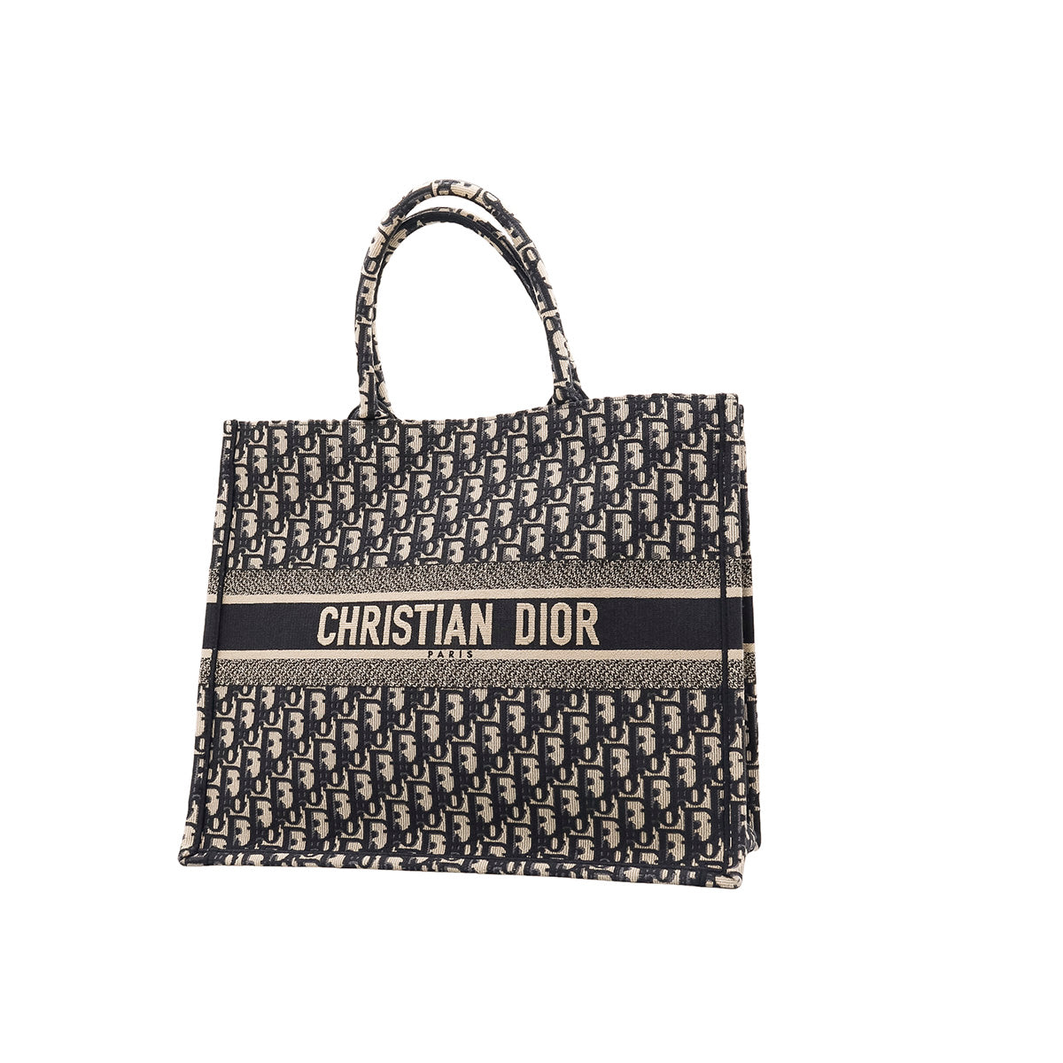 Bolso tipo Tote de la linea Book de Christian Dior, confeccionada en jacquard Oblique color negro-beige, con doble asa rígida de mano.