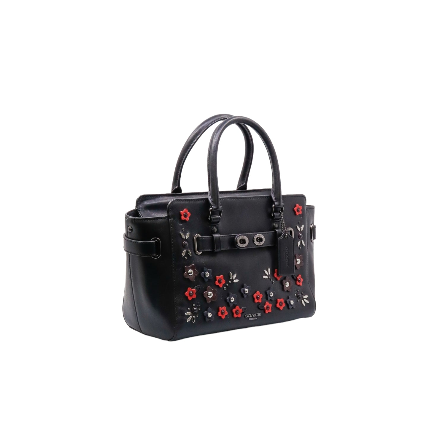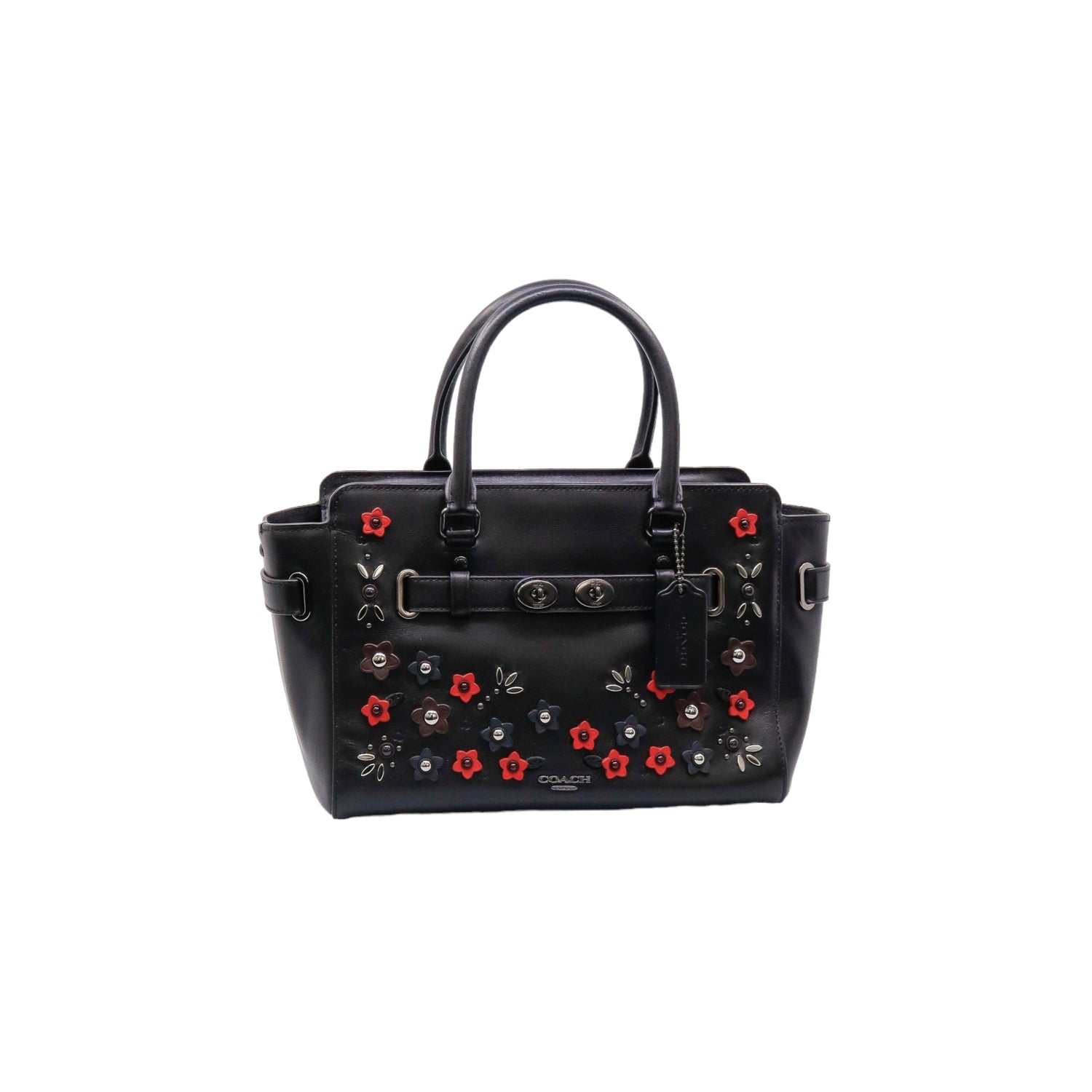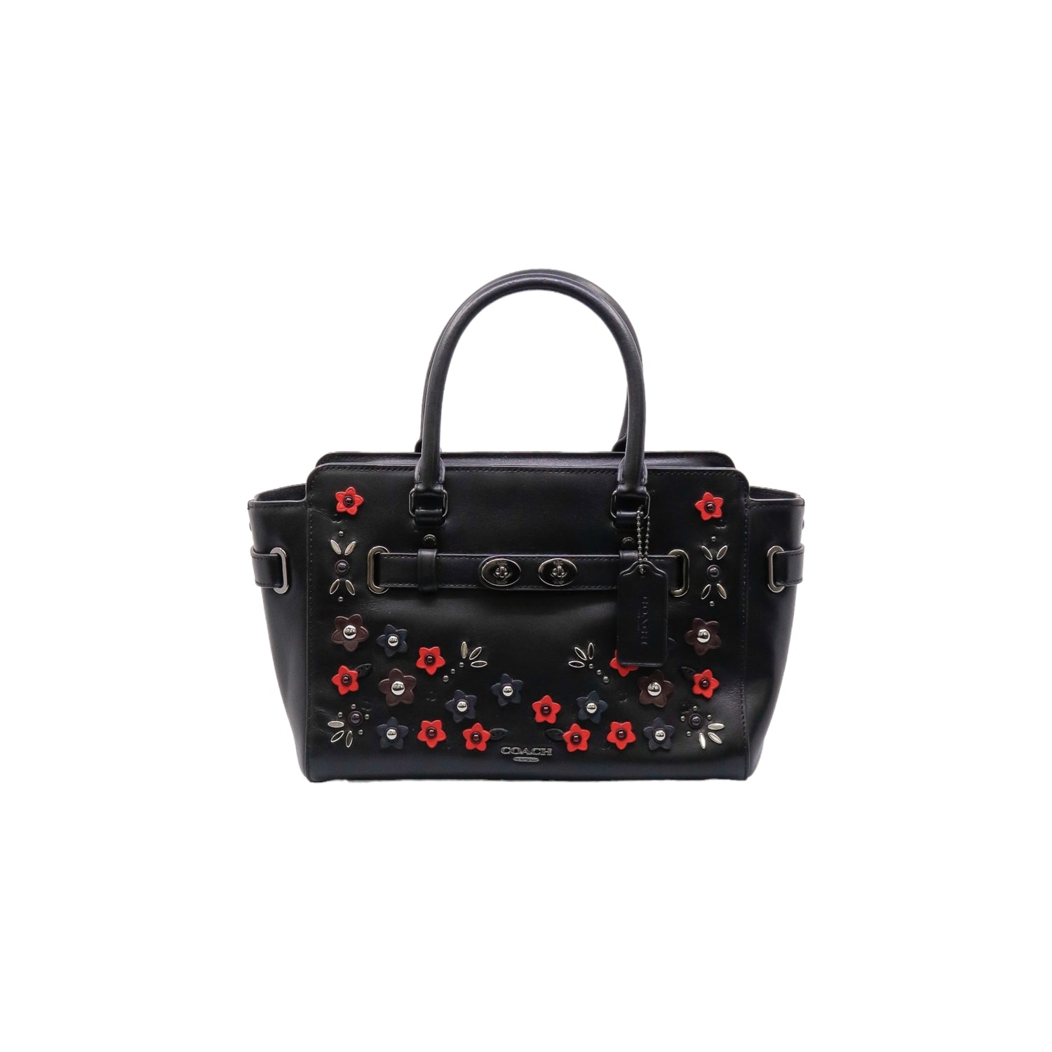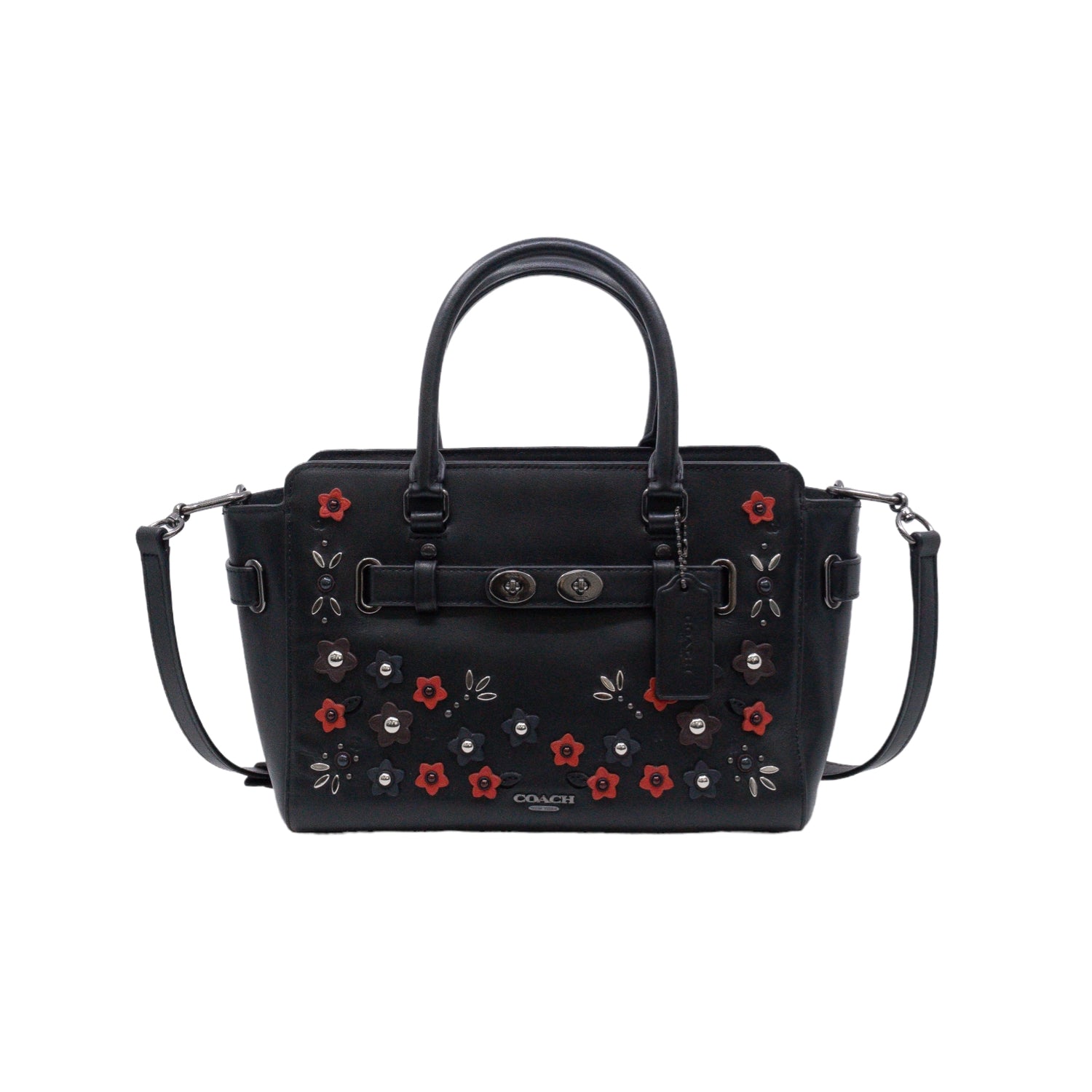 Bolso Coach de la línea Mini Blake, confeccionado en piel color negro, con 2 asas rígidas y correa en mismo material, forro interno en tela negra con 2 bolsillos internos, frente exterior con adornos florales, cierre superior tipo cremallera.