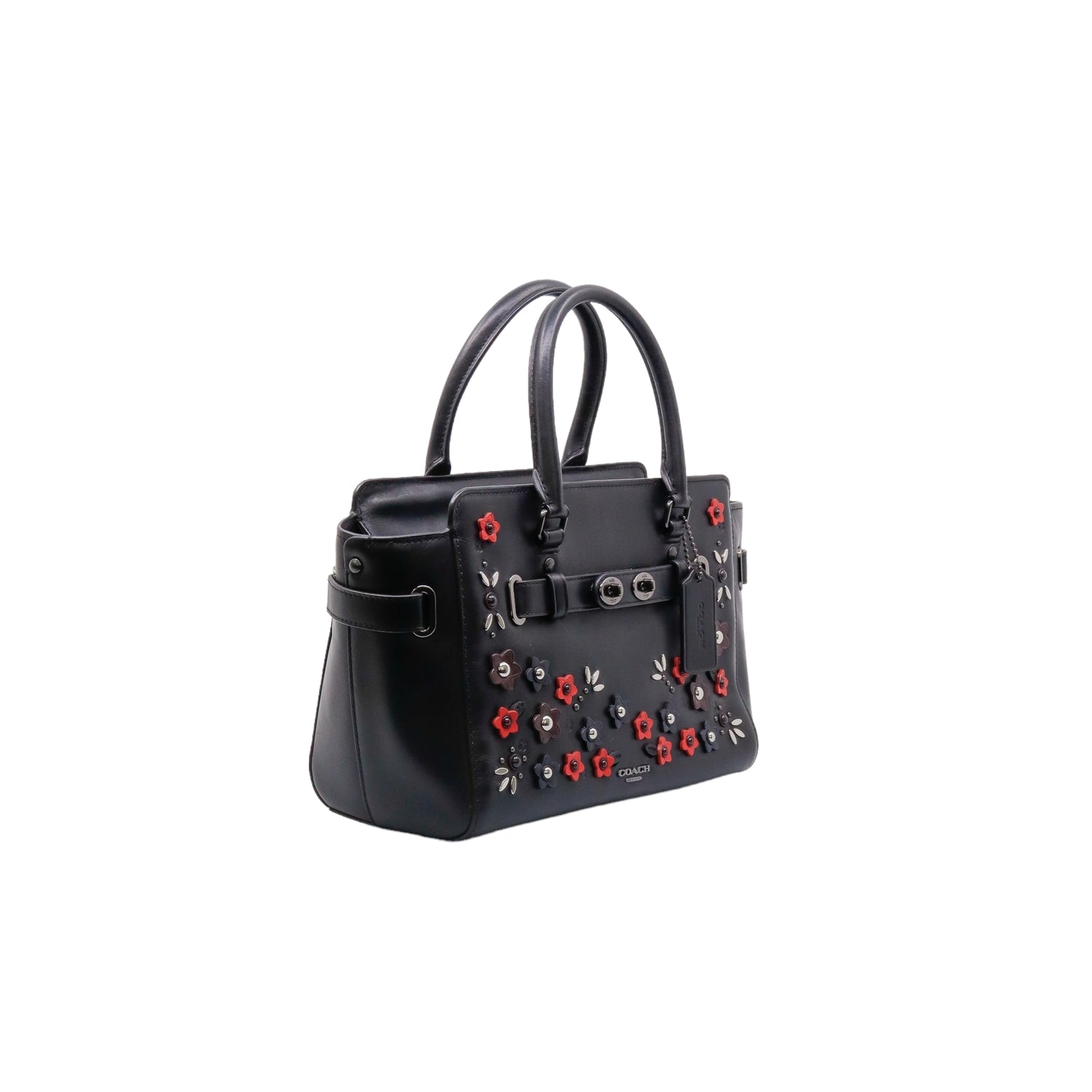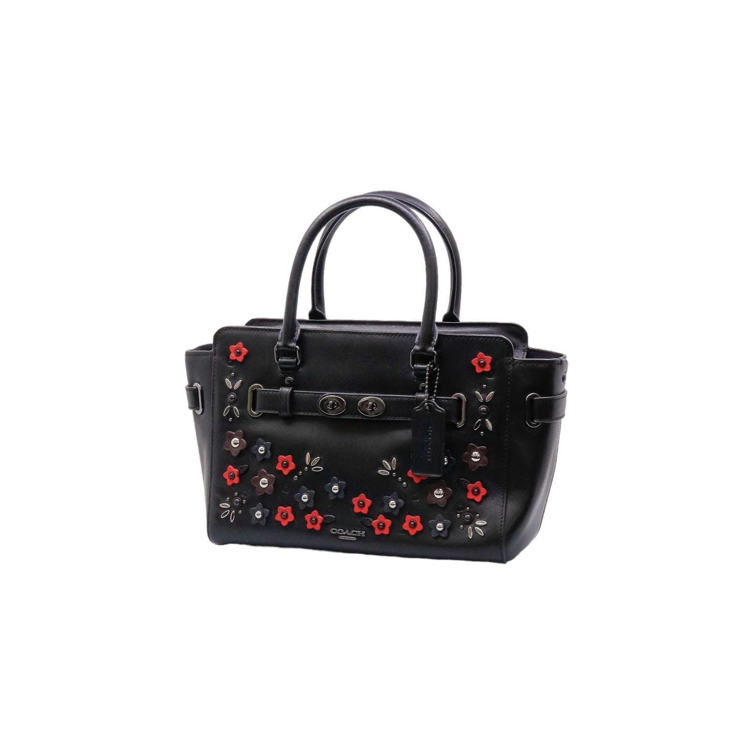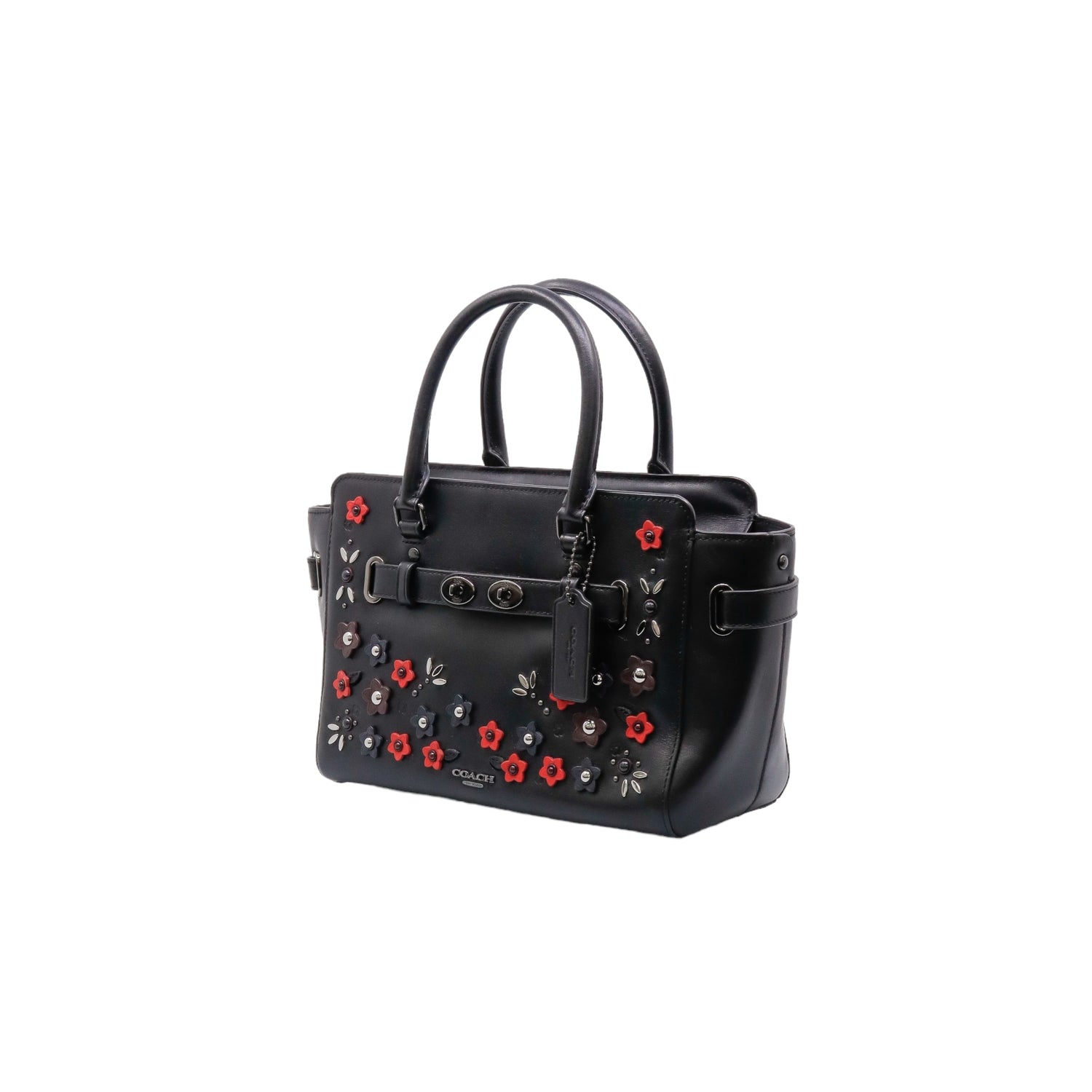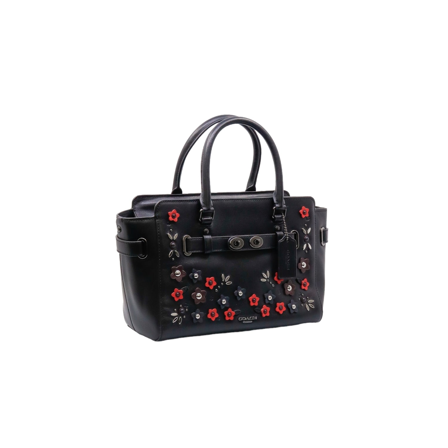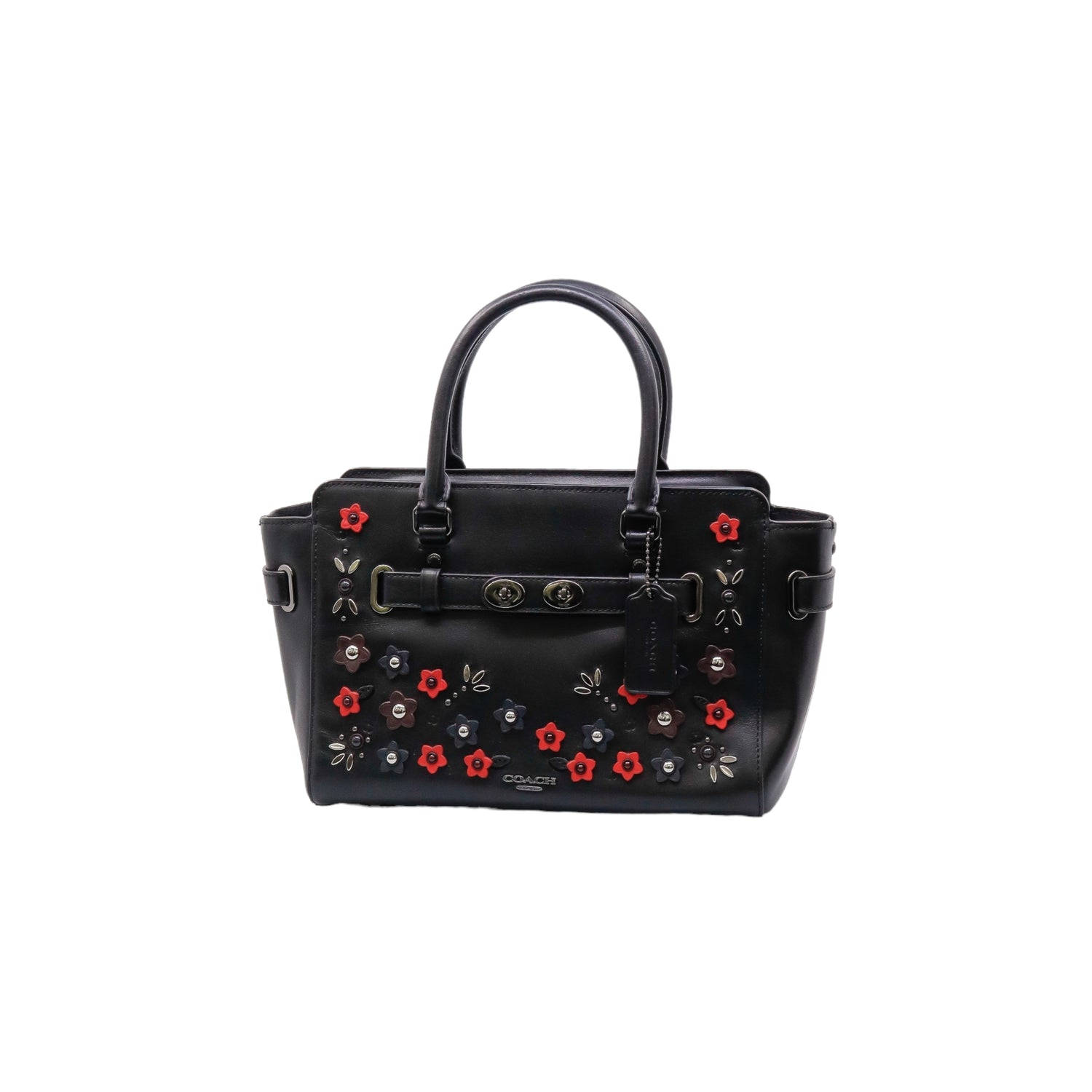 Bolso Coach de la línea Mini Blake, confeccionado en piel color negro, con 2 asas rígidas y correa en mismo material, forro interno en tela negra con 2 bolsillos internos, frente exterior con adornos florales, cierre superior tipo cremallera.