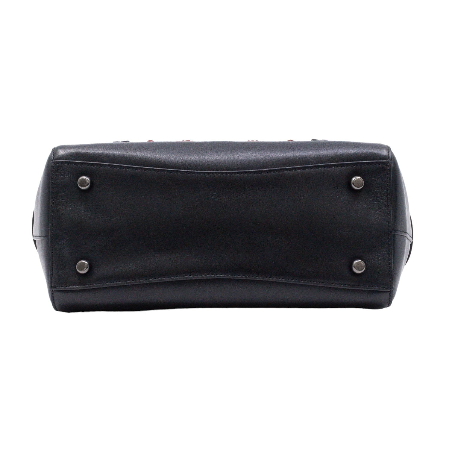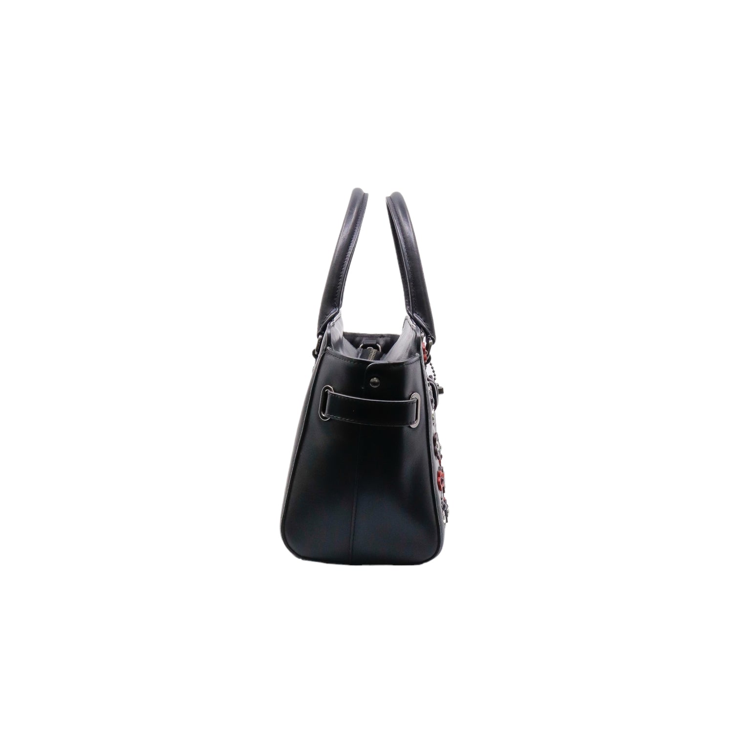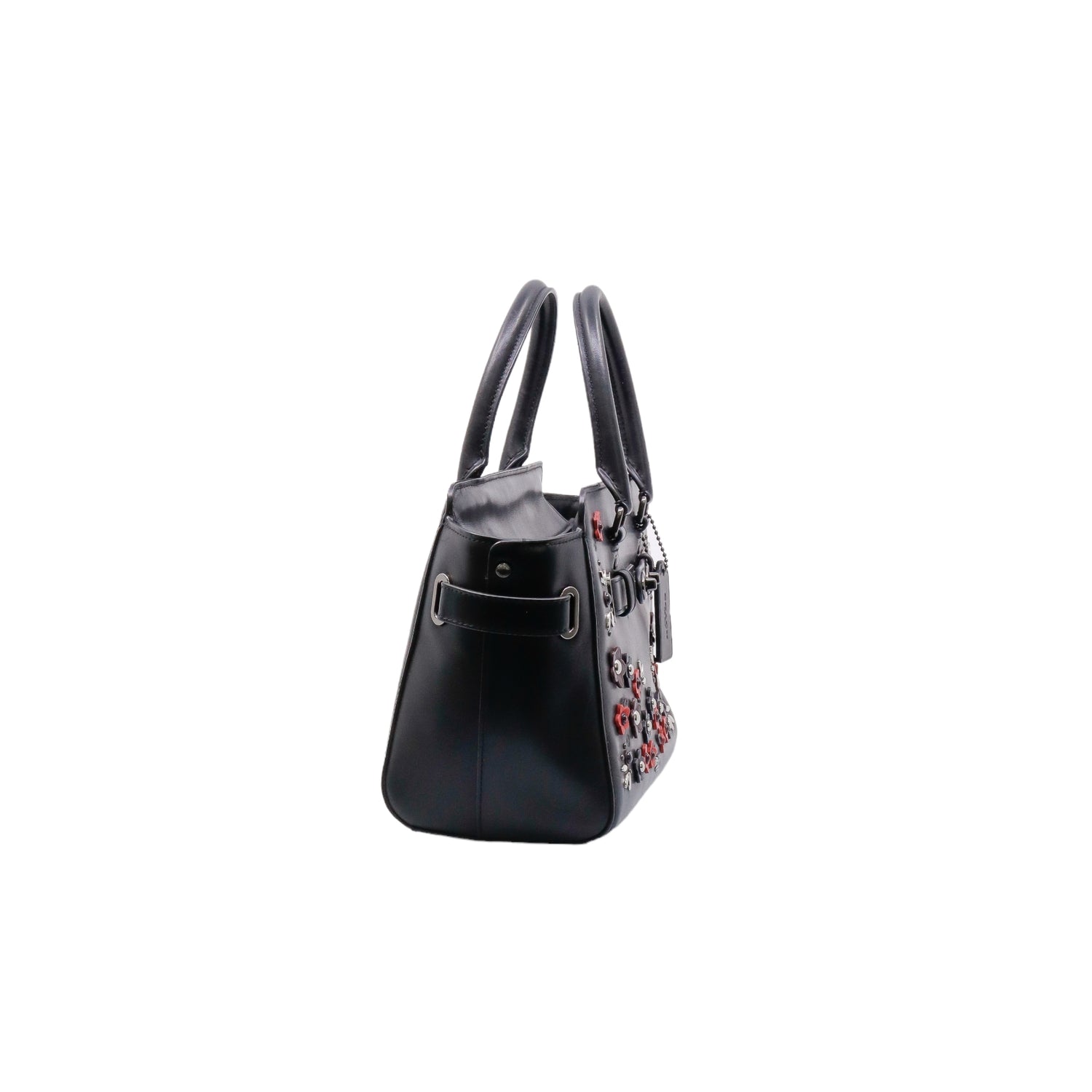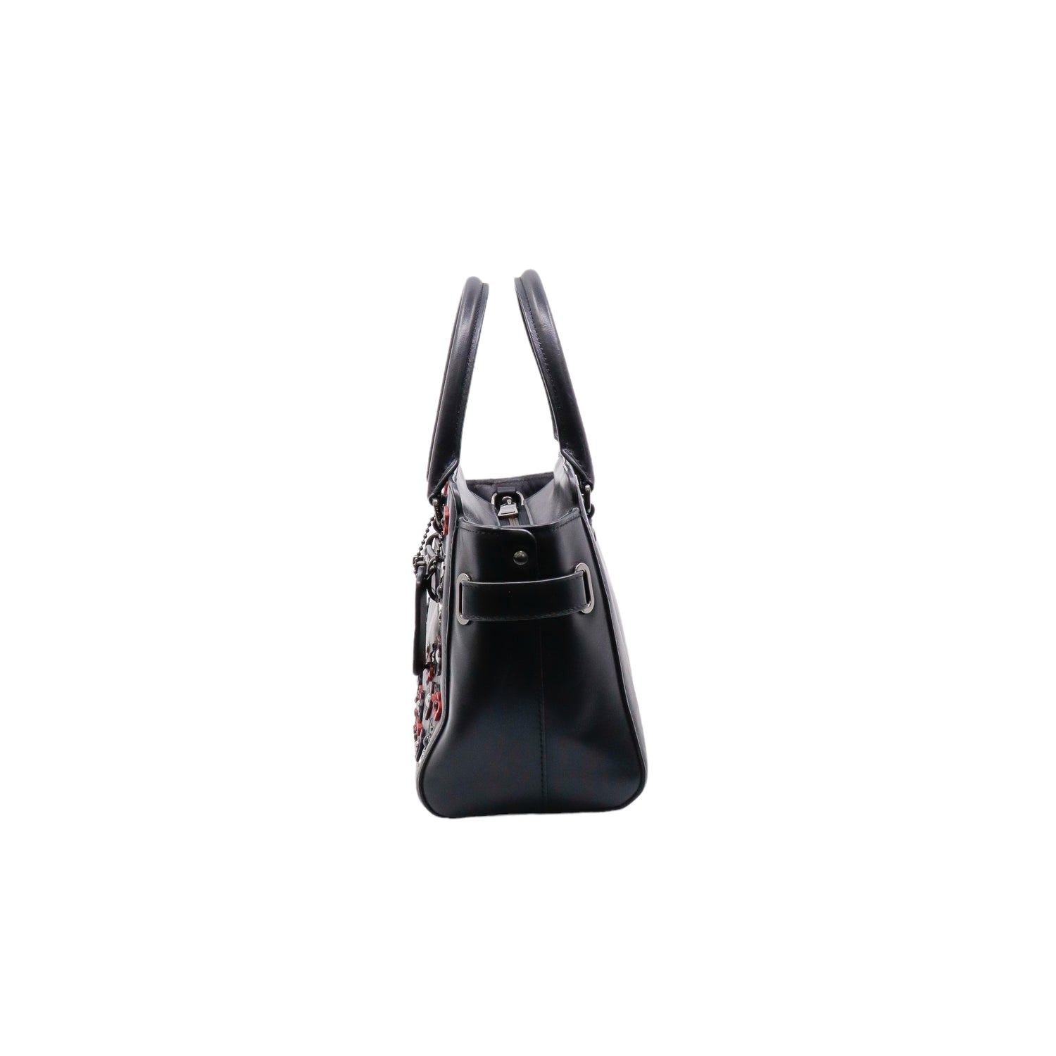 Bolso Coach de la línea Mini Blake, confeccionado en piel color negro, con 2 asas rígidas y correa en mismo material, forro interno en tela negra con 2 bolsillos internos, frente exterior con adornos florales, cierre superior tipo cremallera.