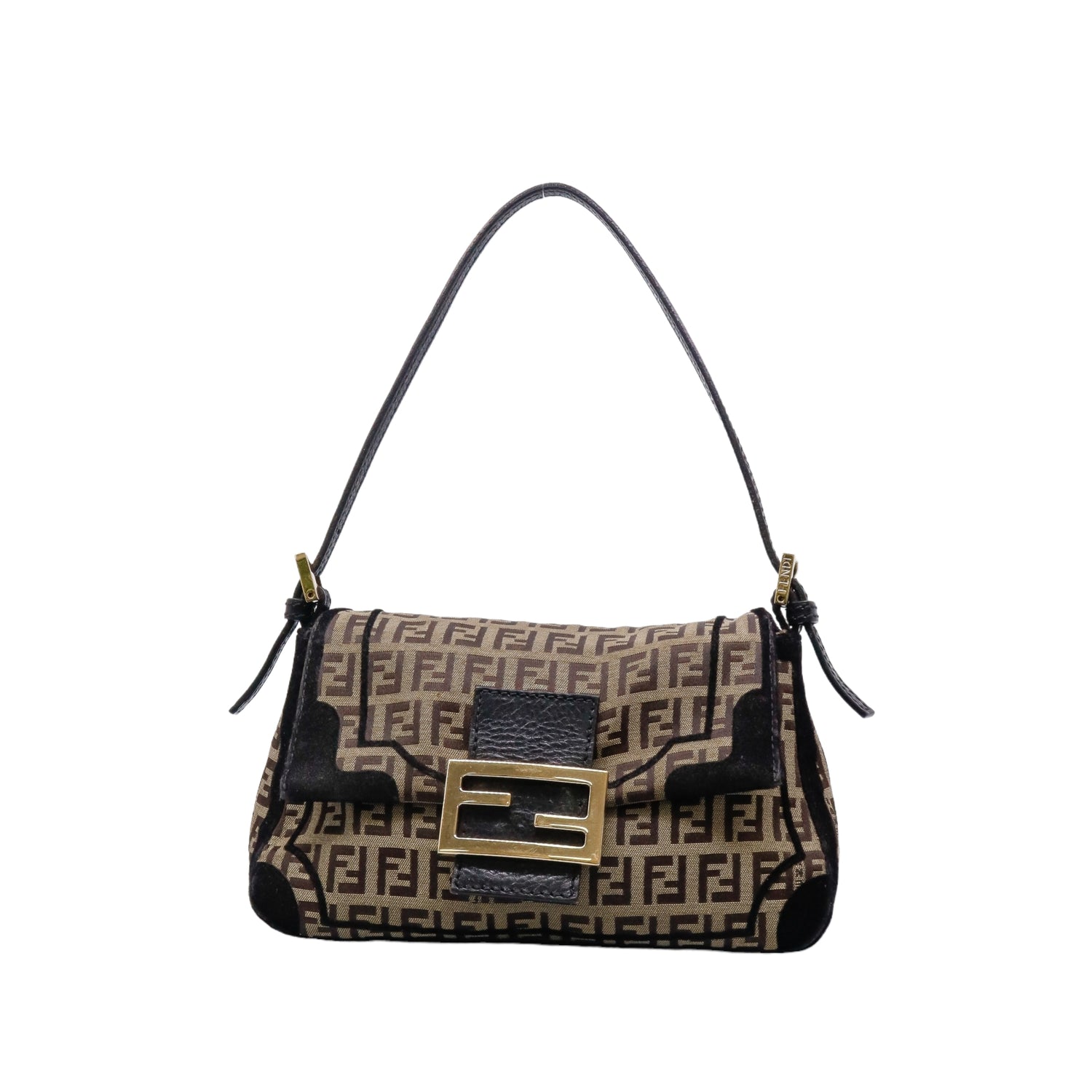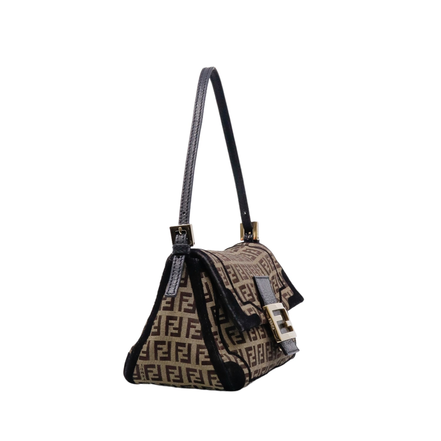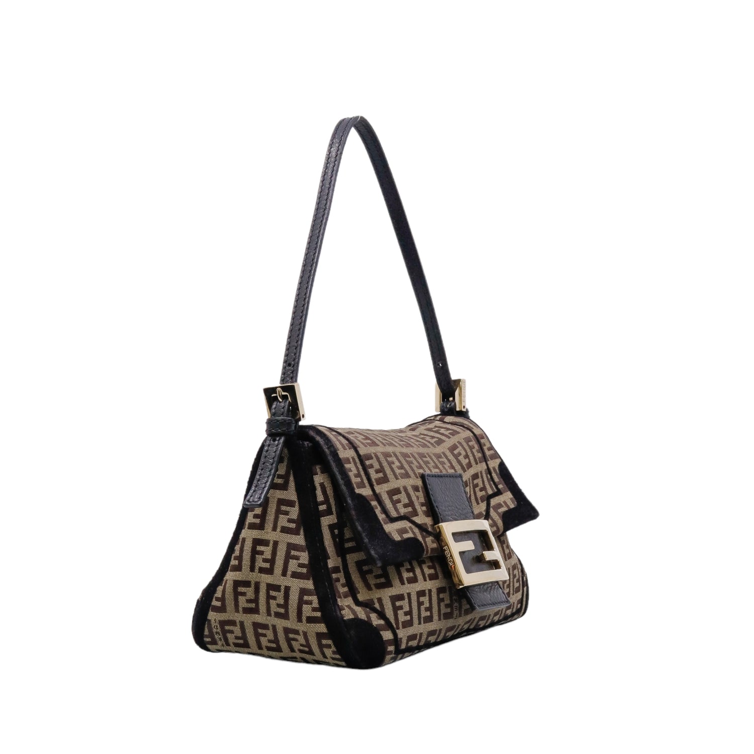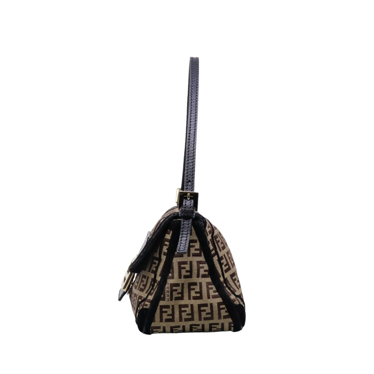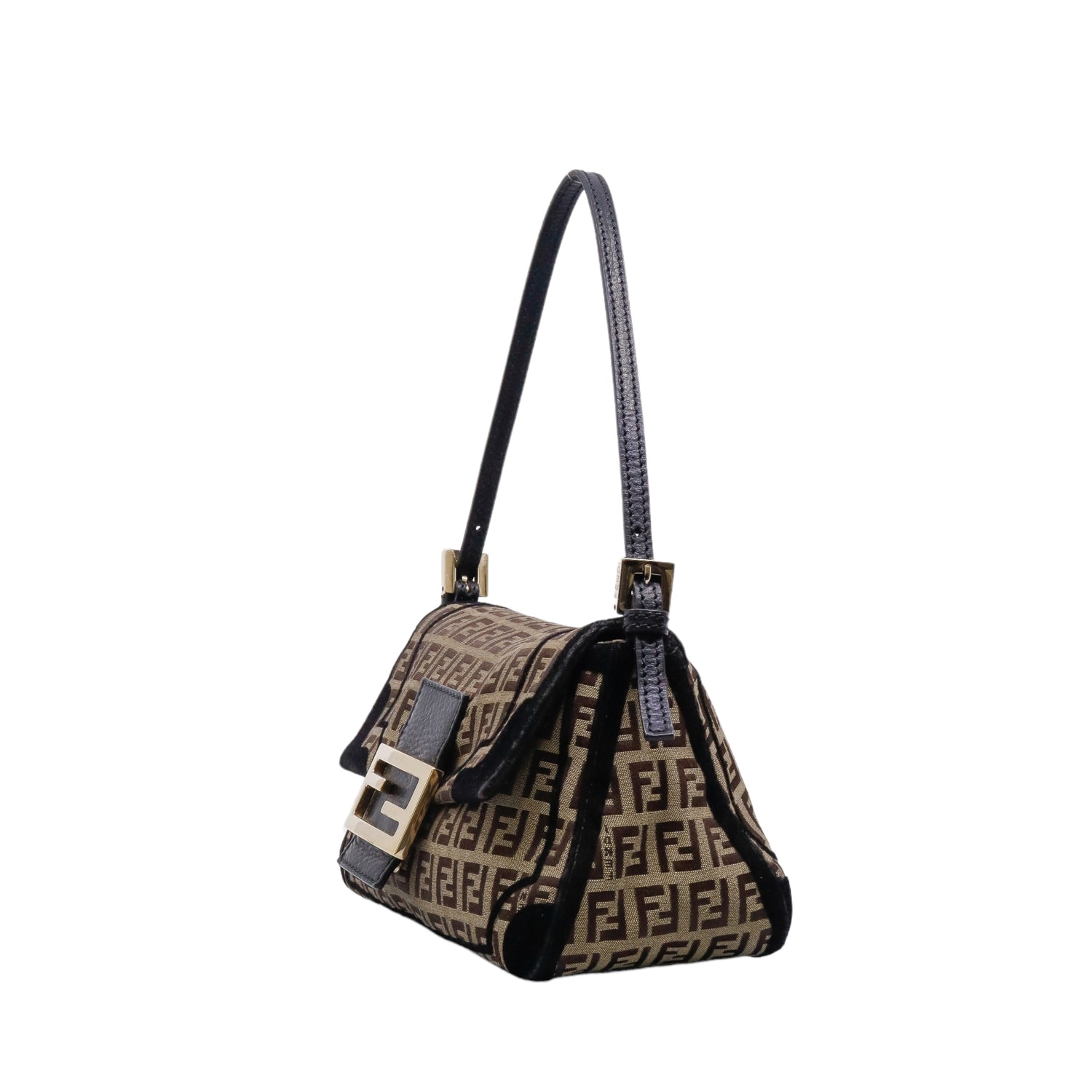 Mini bolso tipo baguette de la marca Fendi, confeccionado en lienzo Zucchino FF color café con apliques en terciopelo color negro, con pequeña asa de piel al hombro, herrajes en color dorado, solapa con cierre de botón magnético.