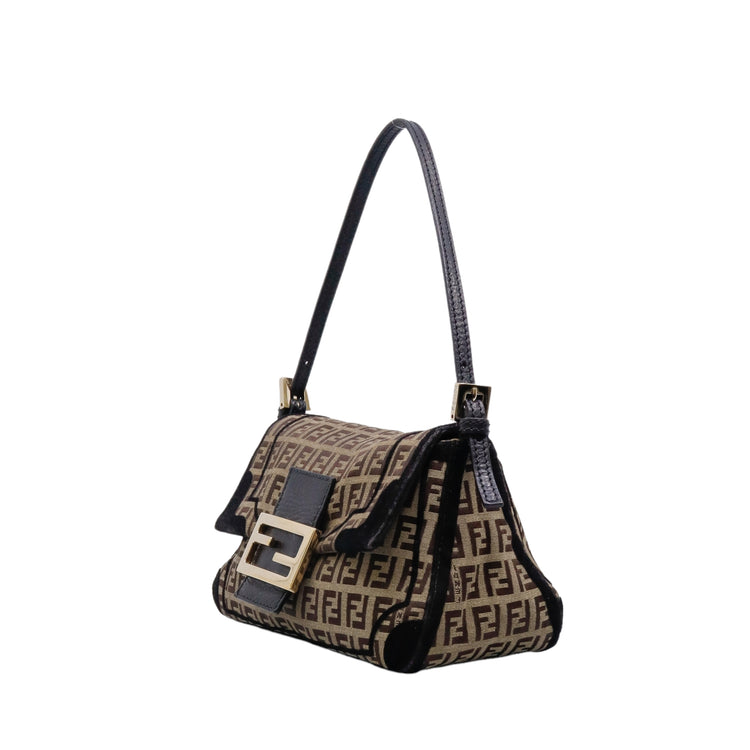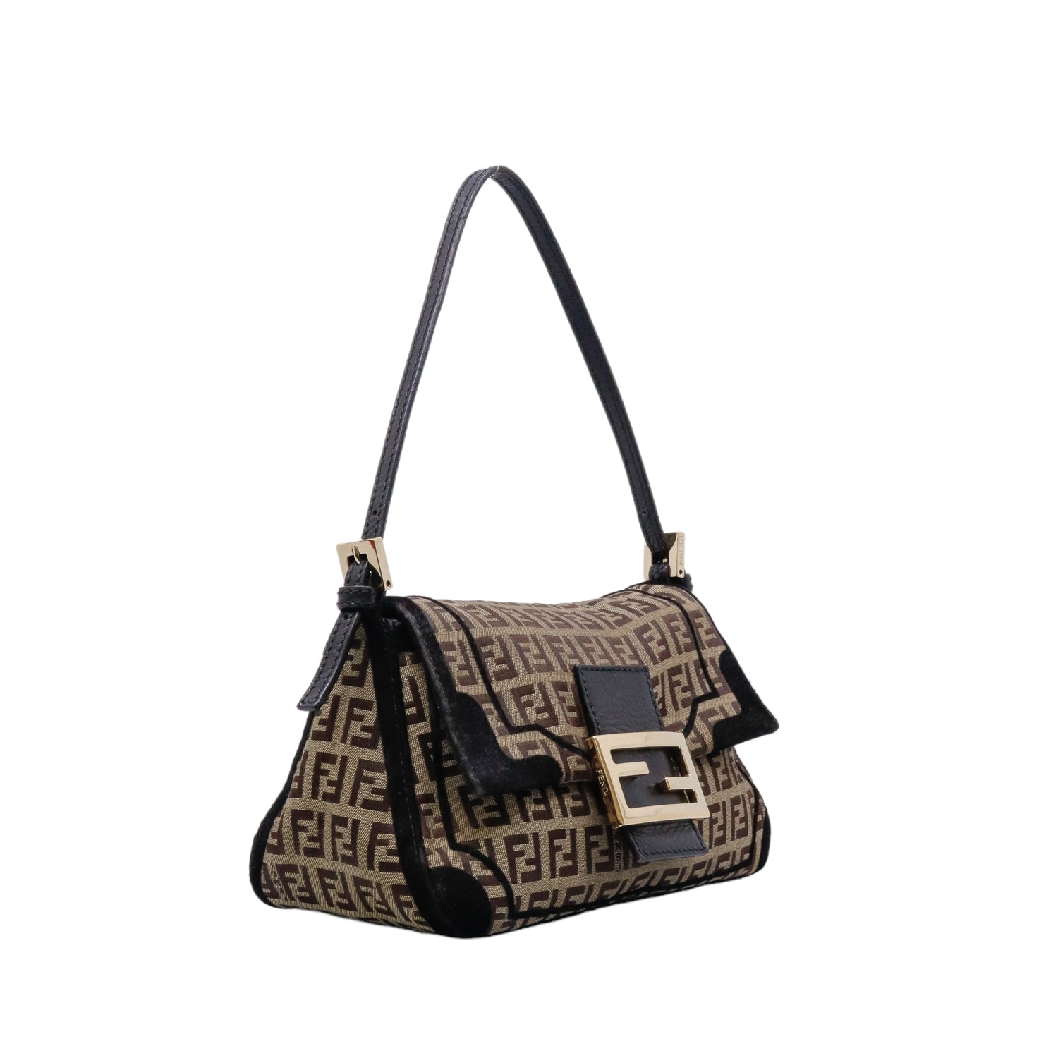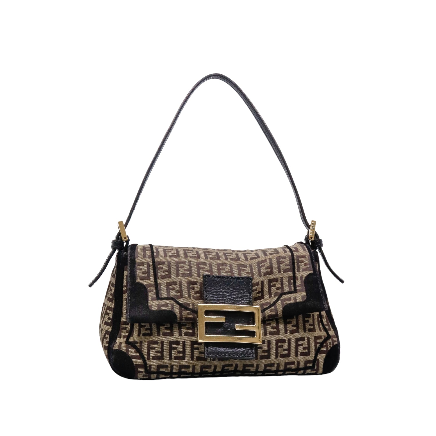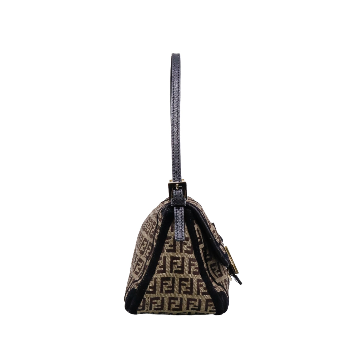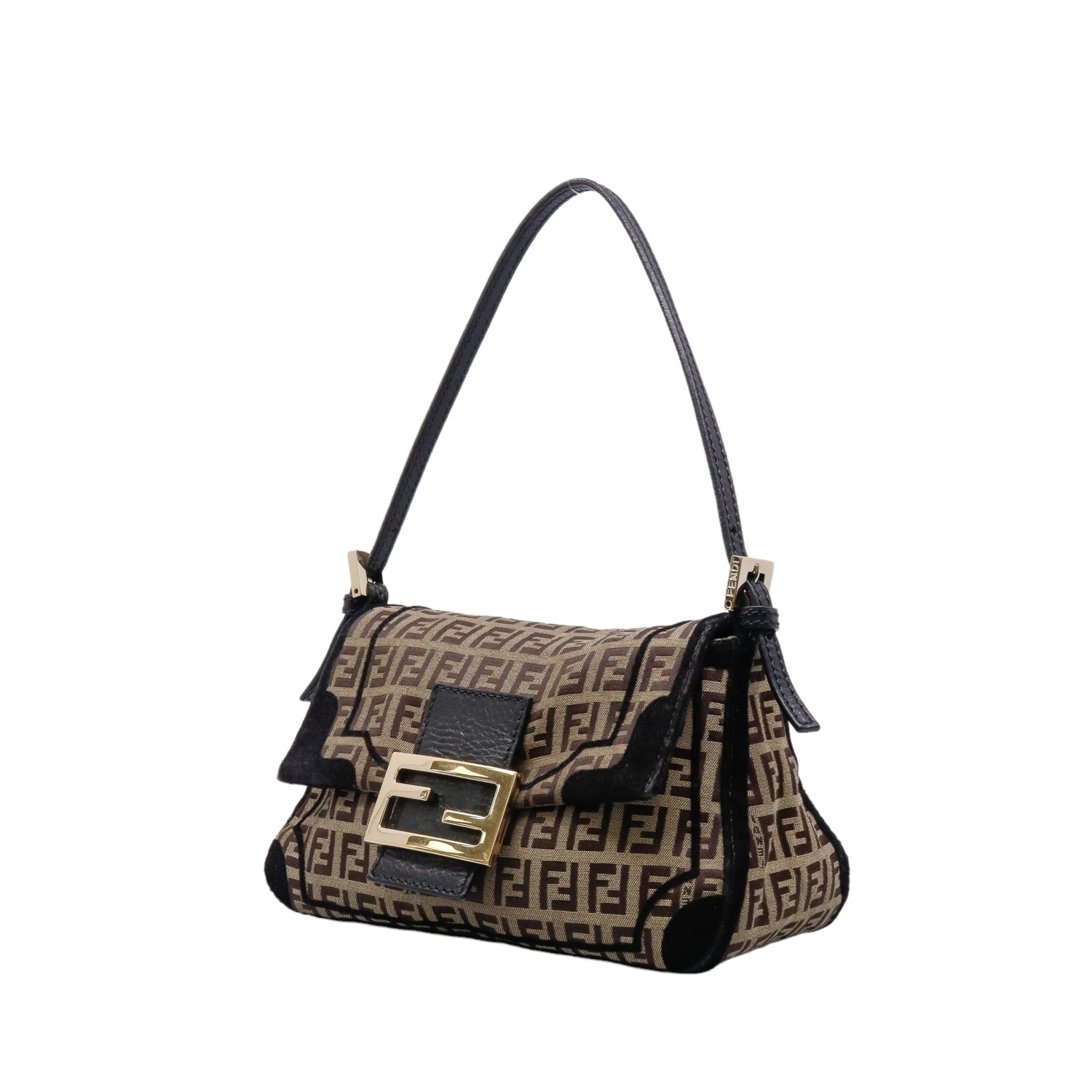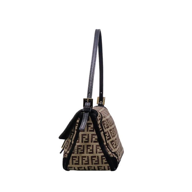Mini bolso tipo baguette de la marca Fendi, confeccionado en lienzo Zucchino FF color café con apliques en terciopelo color negro, con pequeña asa de piel al hombro, herrajes en color dorado, solapa con cierre de botón magnético.
