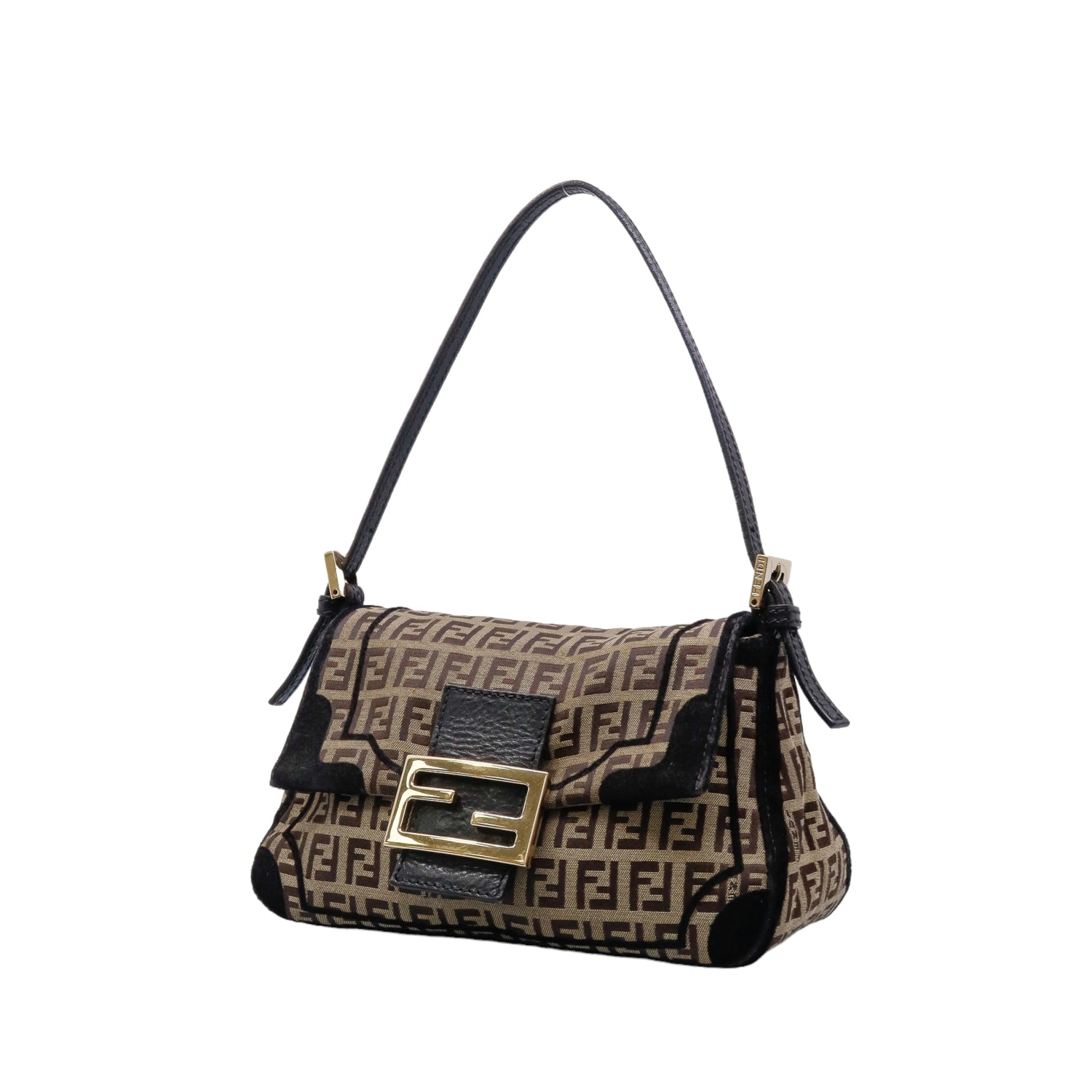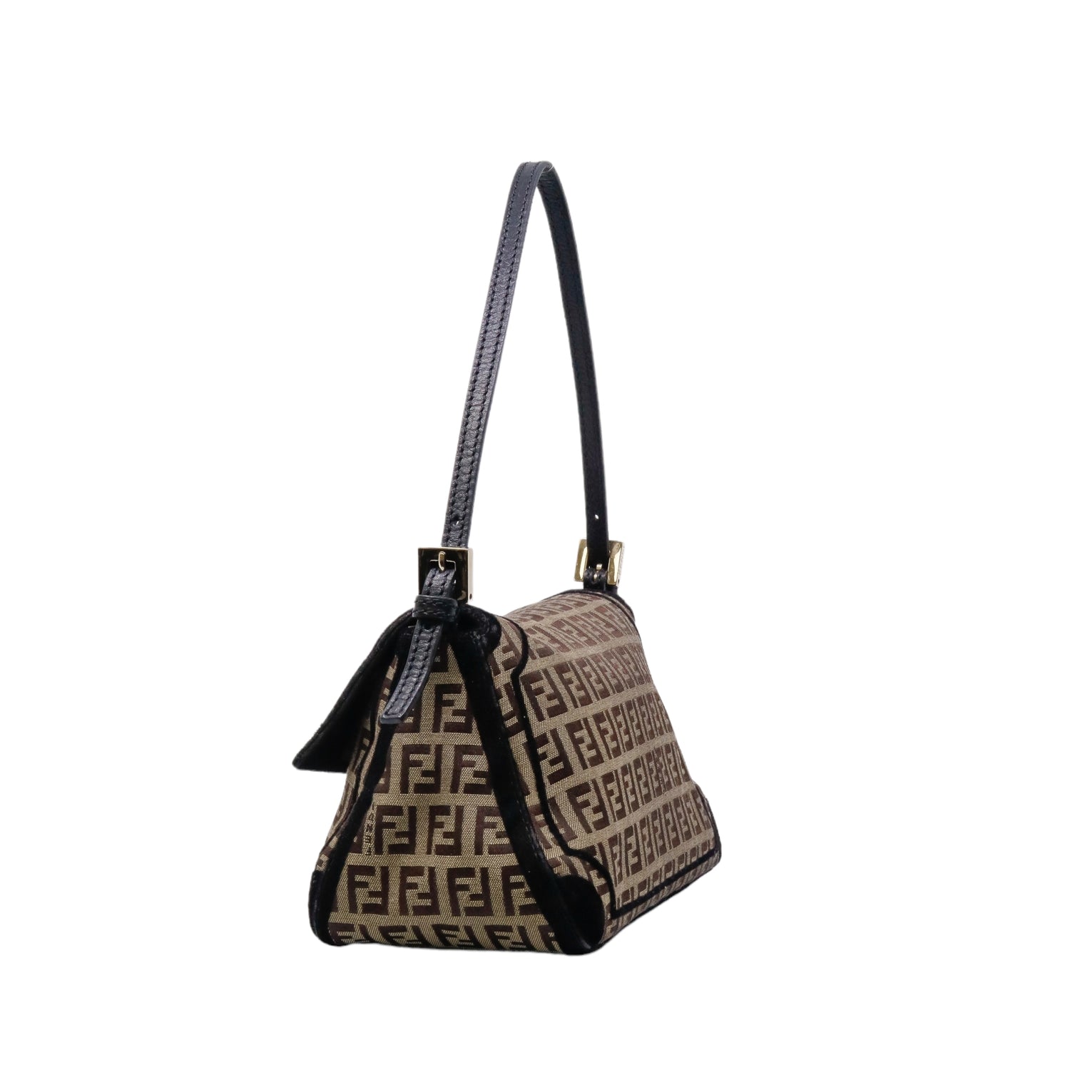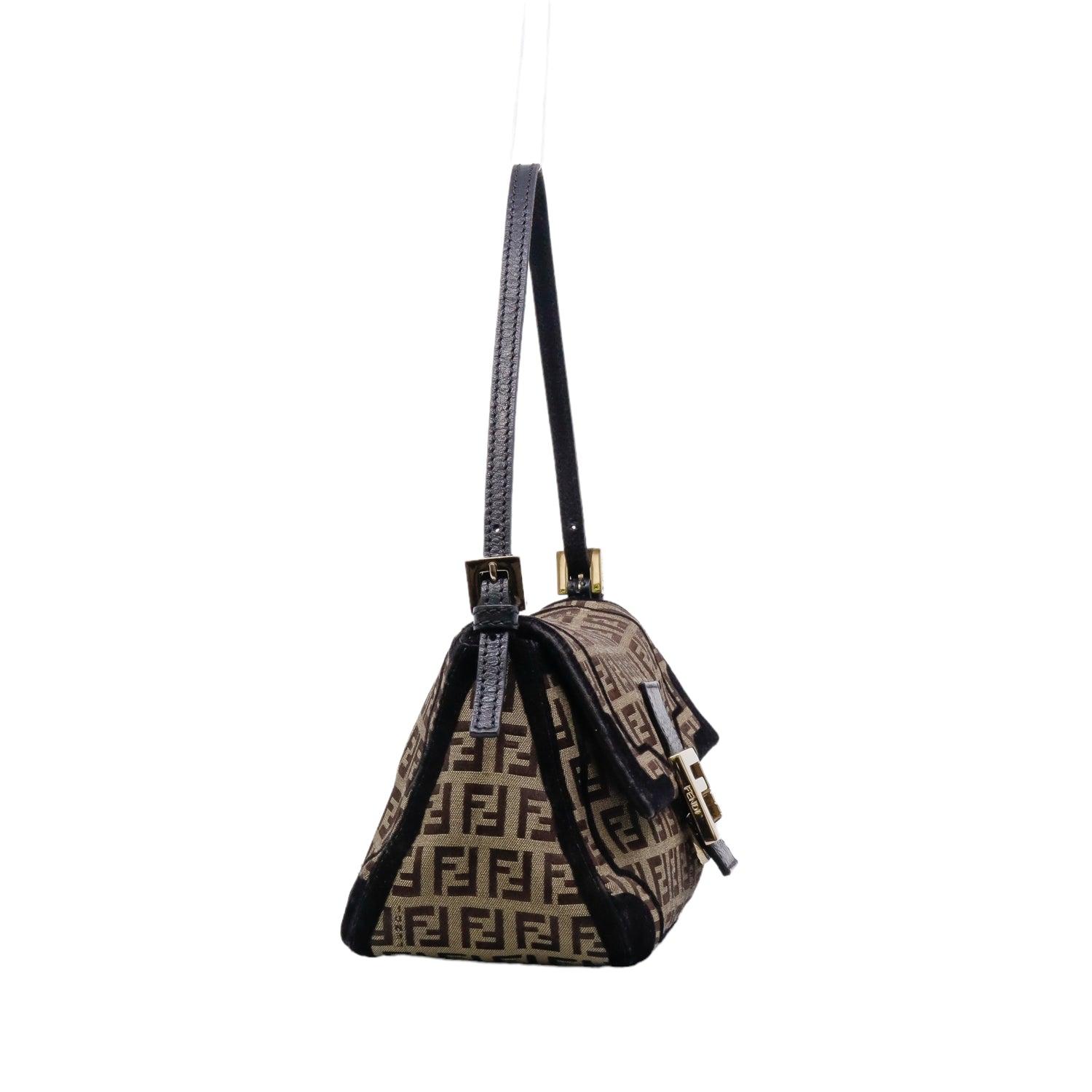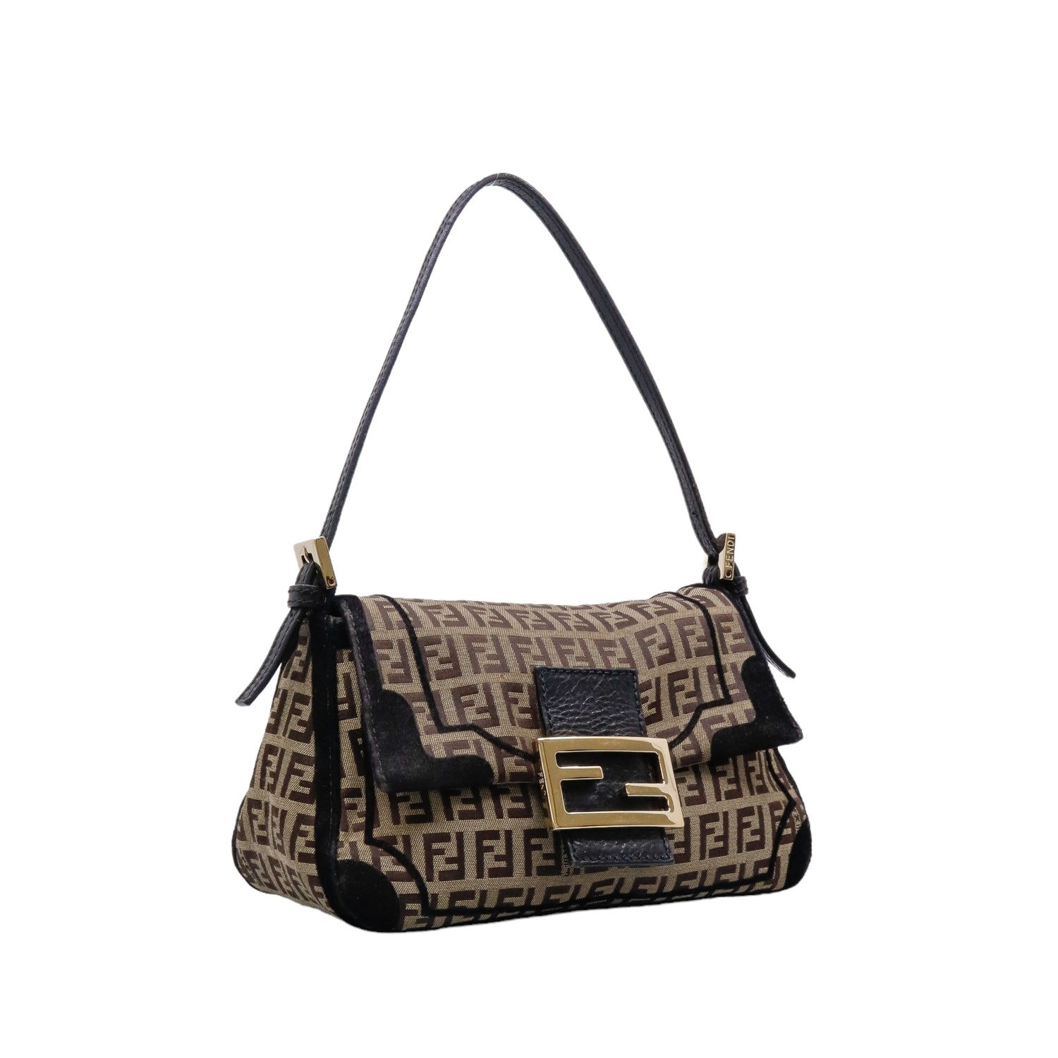 Mini bolso tipo baguette de la marca Fendi, confeccionado en lienzo Zucchino FF color café con apliques en terciopelo color negro, con pequeña asa de piel al hombro, herrajes en color dorado, solapa con cierre de botón magnético.
