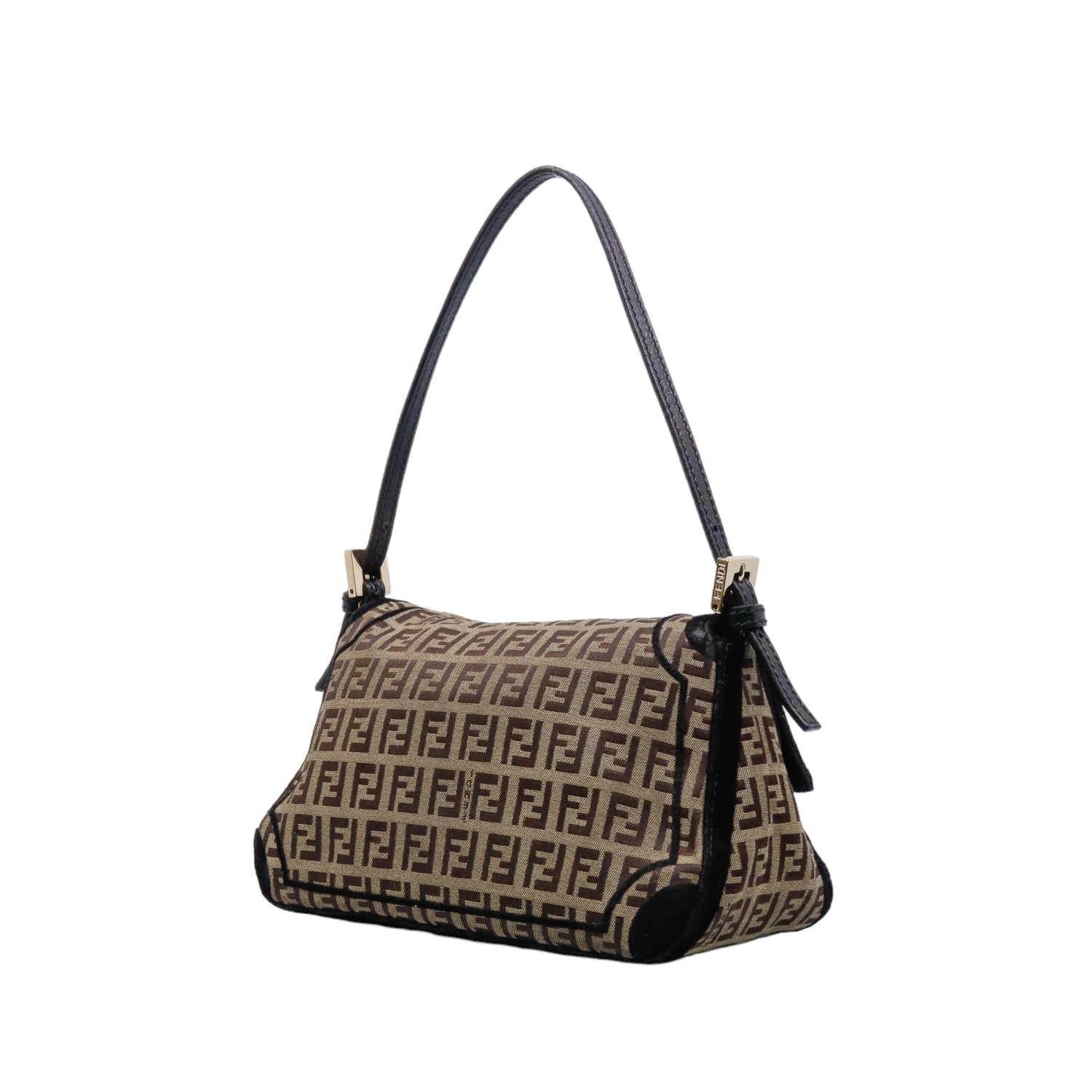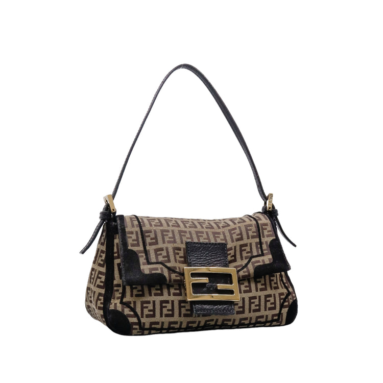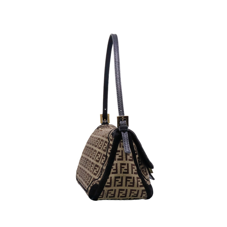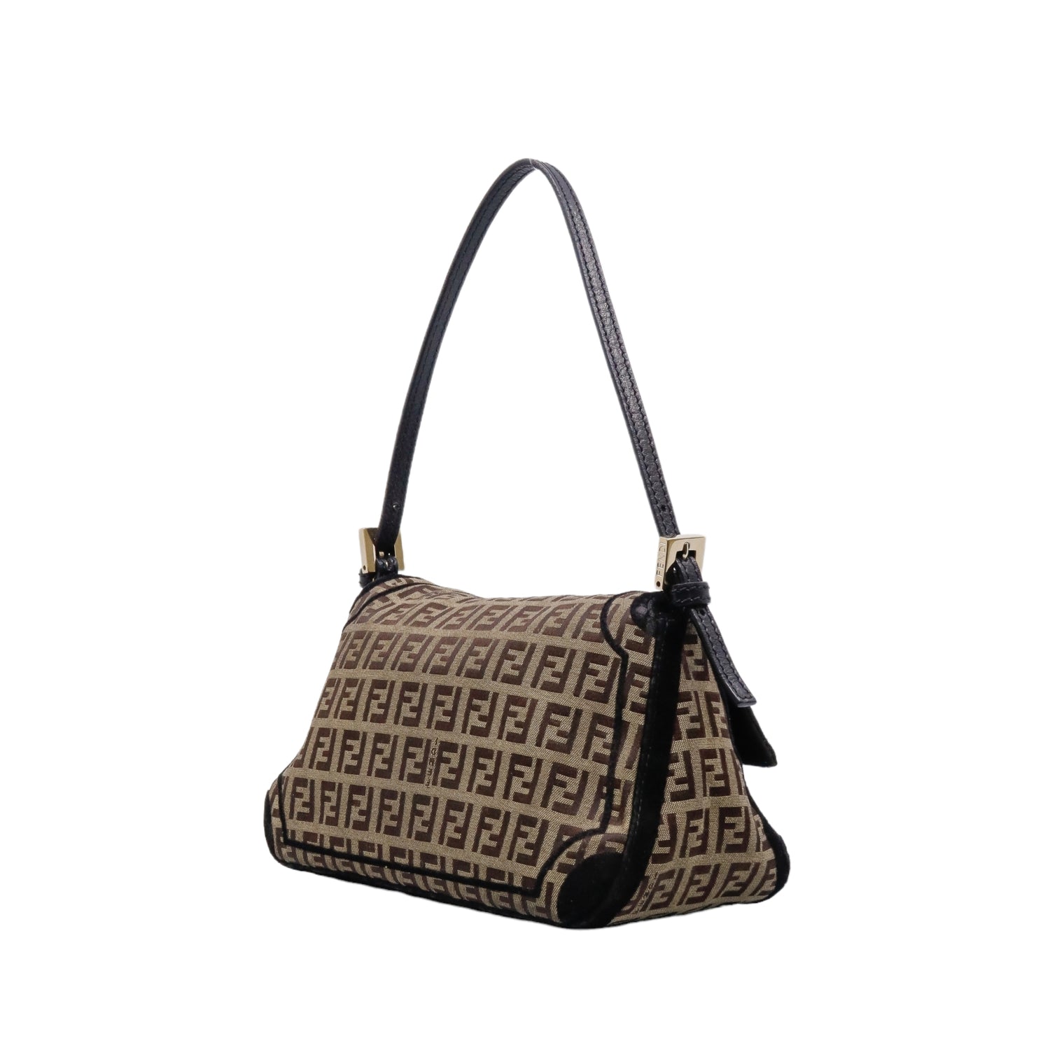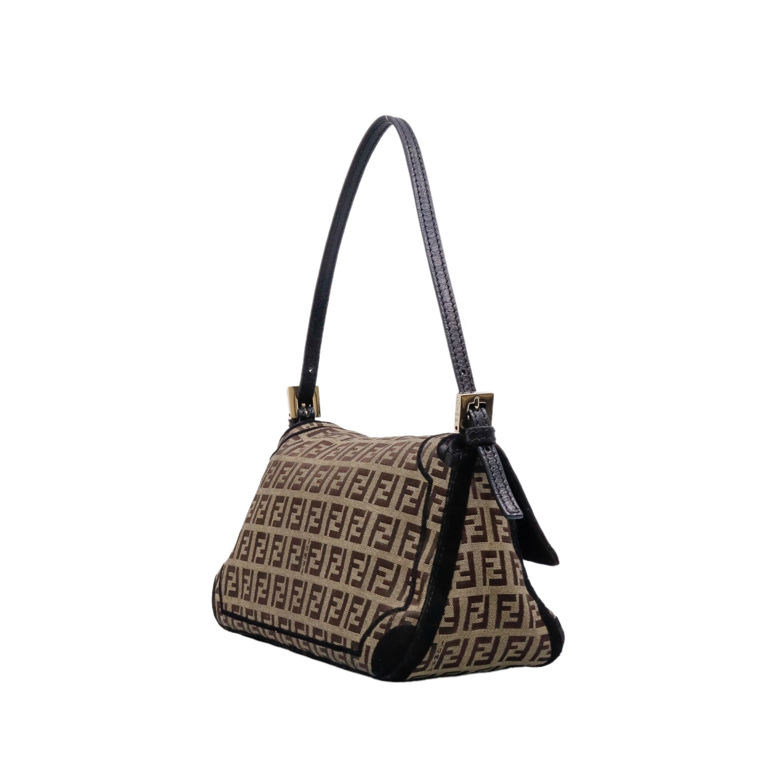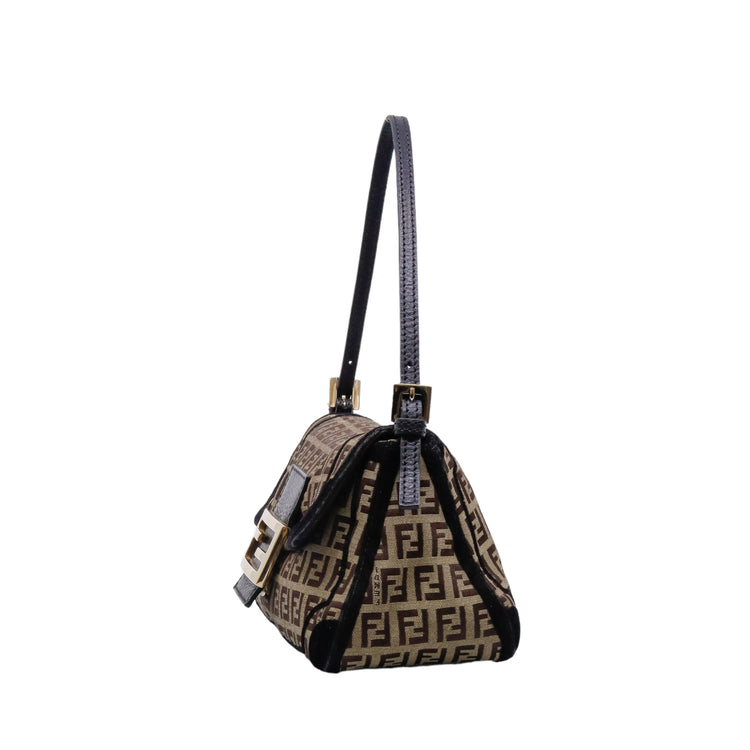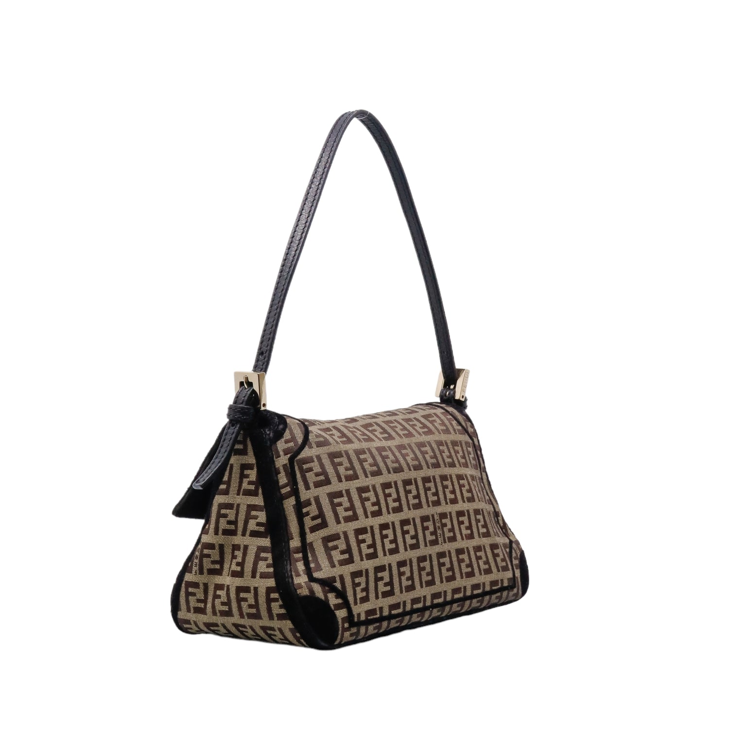 Mini bolso tipo baguette de la marca Fendi, confeccionado en lienzo Zucchino FF color café con apliques en terciopelo color negro, con pequeña asa de piel al hombro, herrajes en color dorado, solapa con cierre de botón magnético.