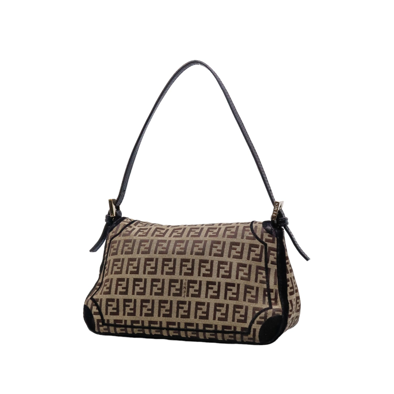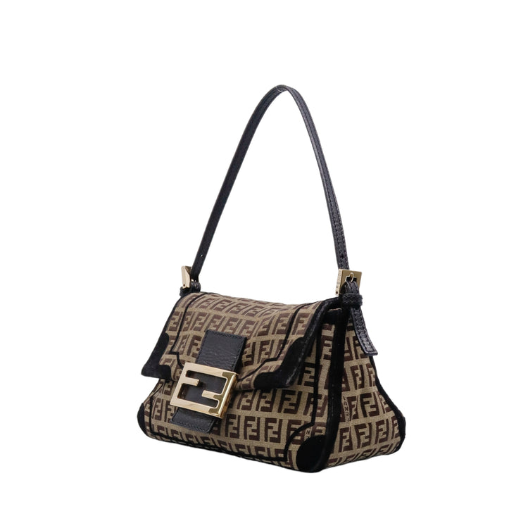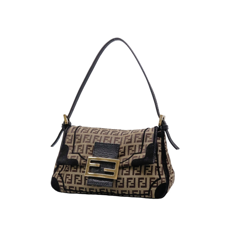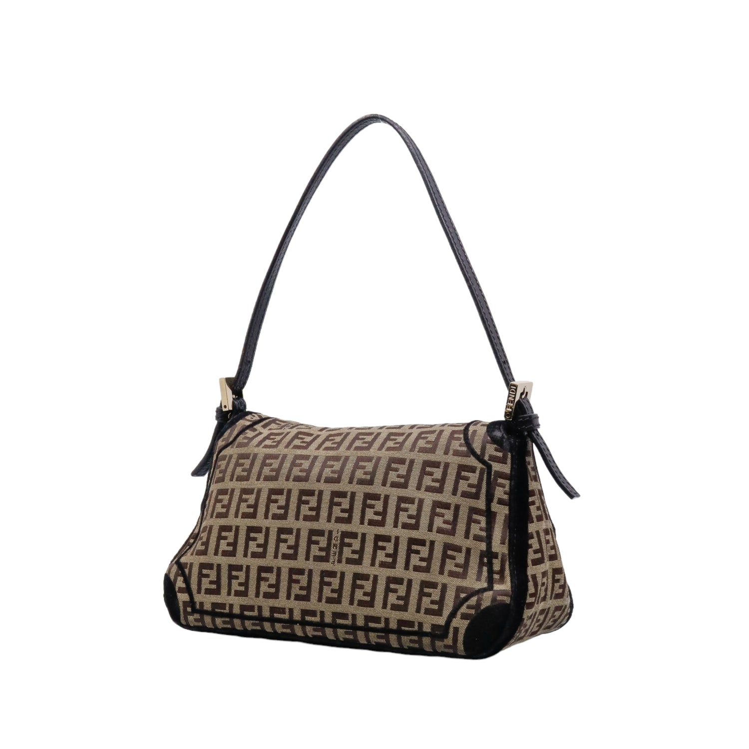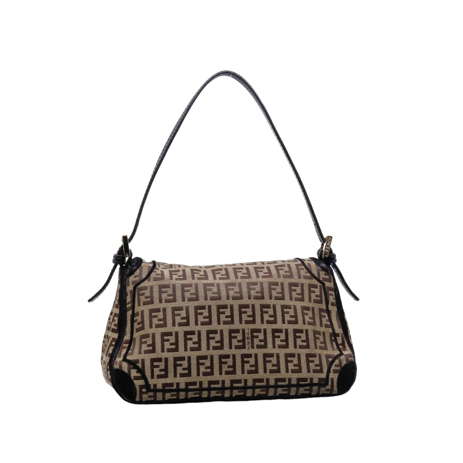 Mini bolso tipo baguette de la marca Fendi, confeccionado en lienzo Zucchino FF color café con apliques en terciopelo color negro, con pequeña asa de piel al hombro, herrajes en color dorado, solapa con cierre de botón magnético.