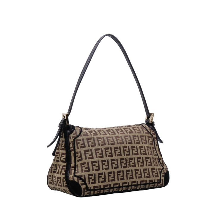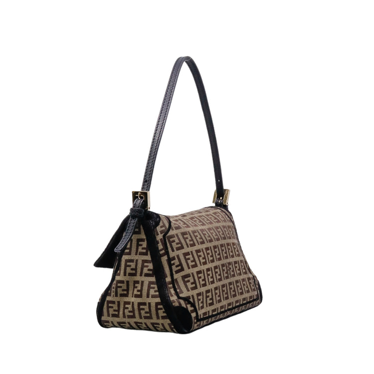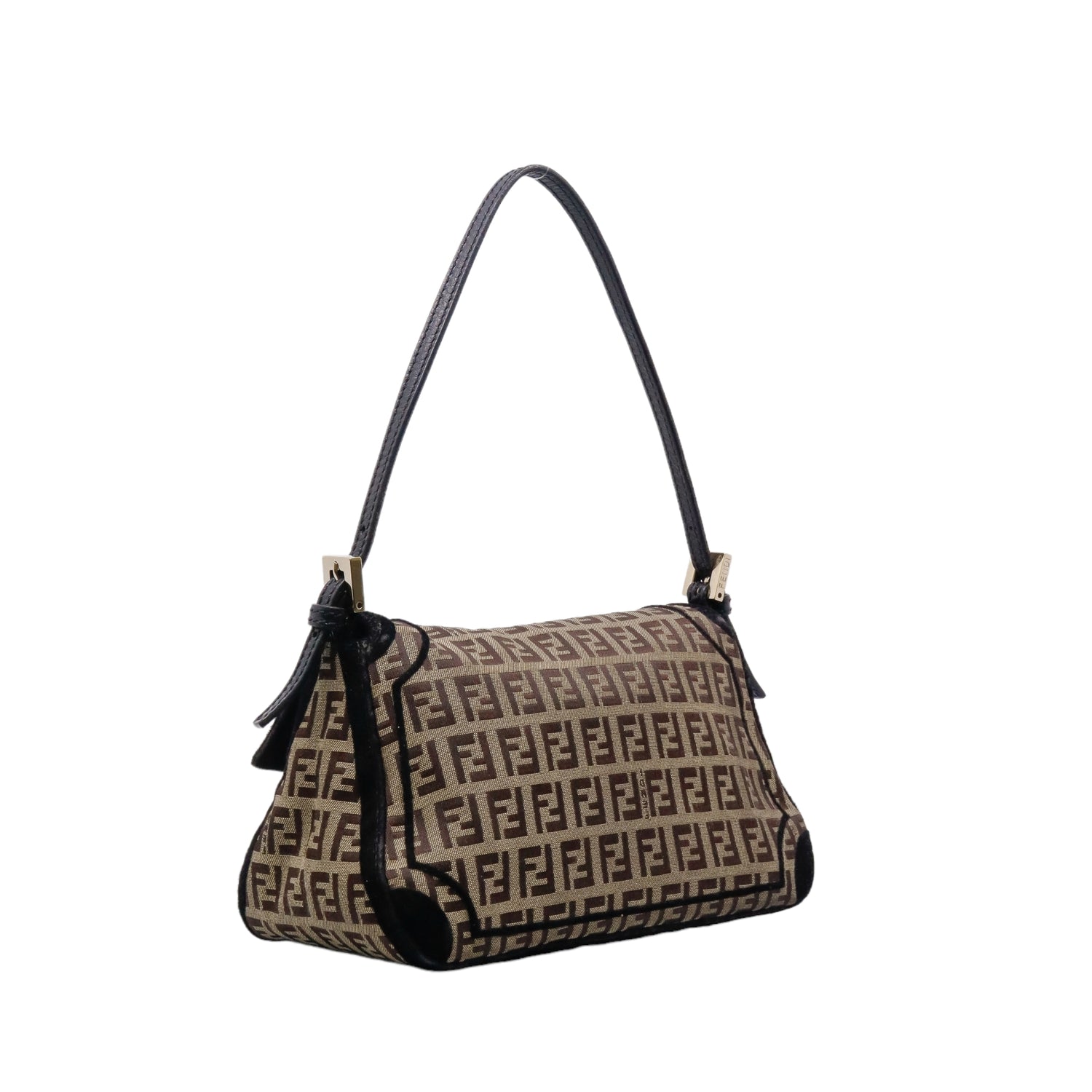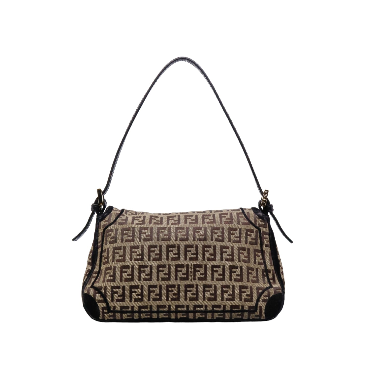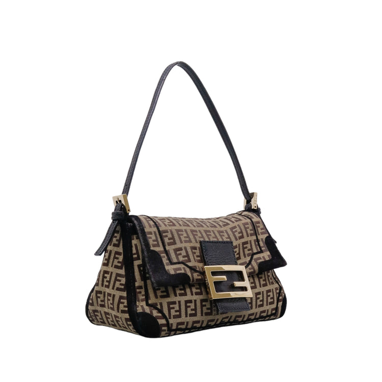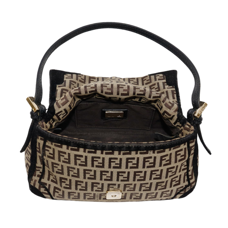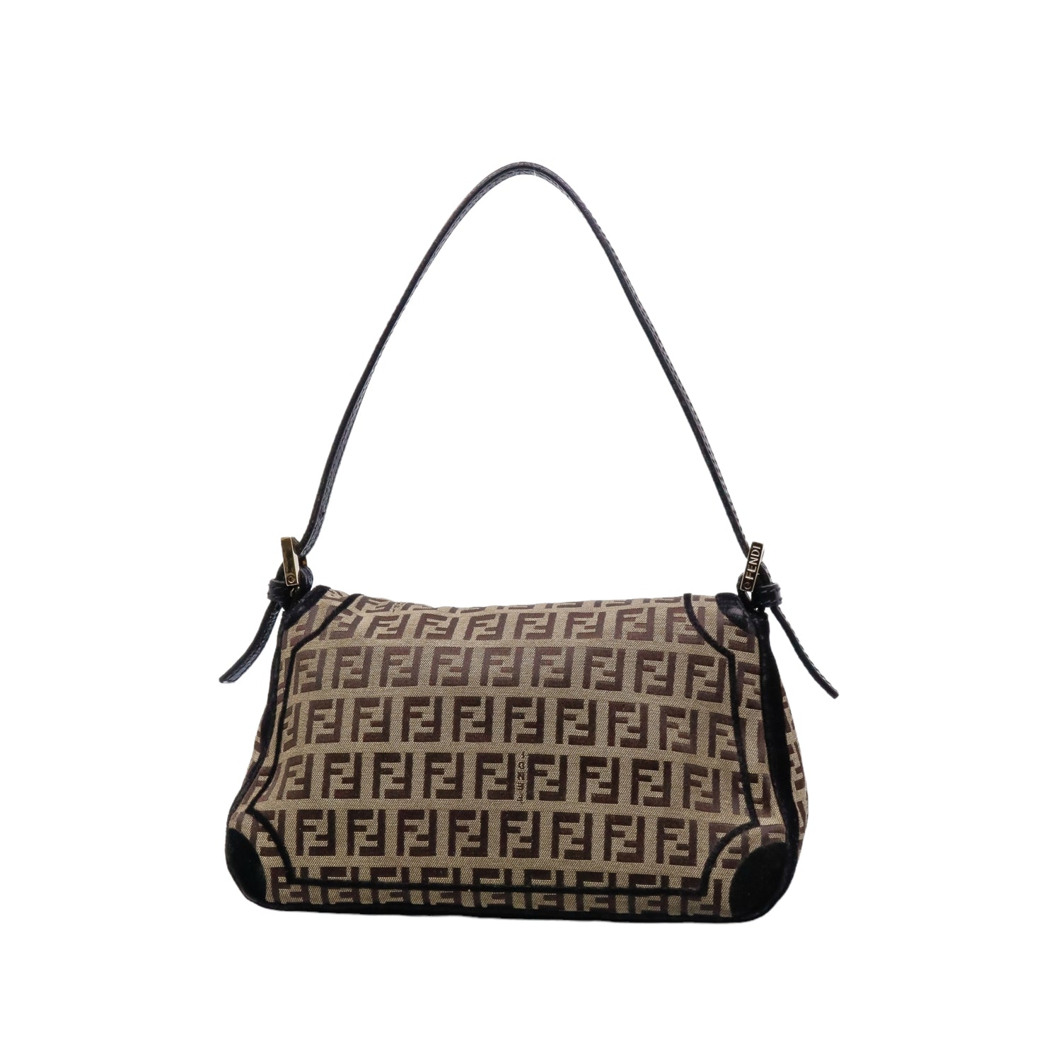 Mini bolso tipo baguette de la marca Fendi, confeccionado en lienzo Zucchino FF color café con apliques en terciopelo color negro, con pequeña asa de piel al hombro, herrajes en color dorado, solapa con cierre de botón magnético.