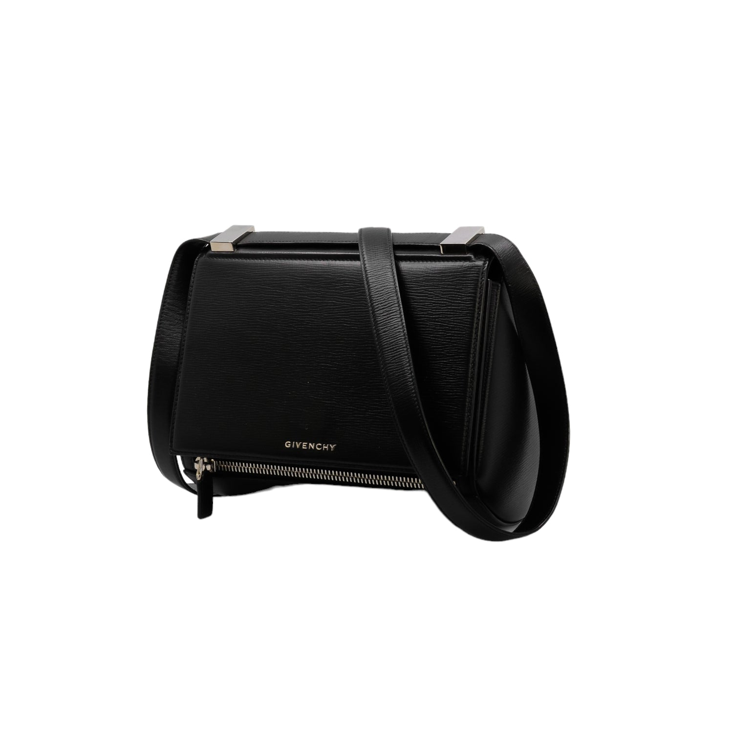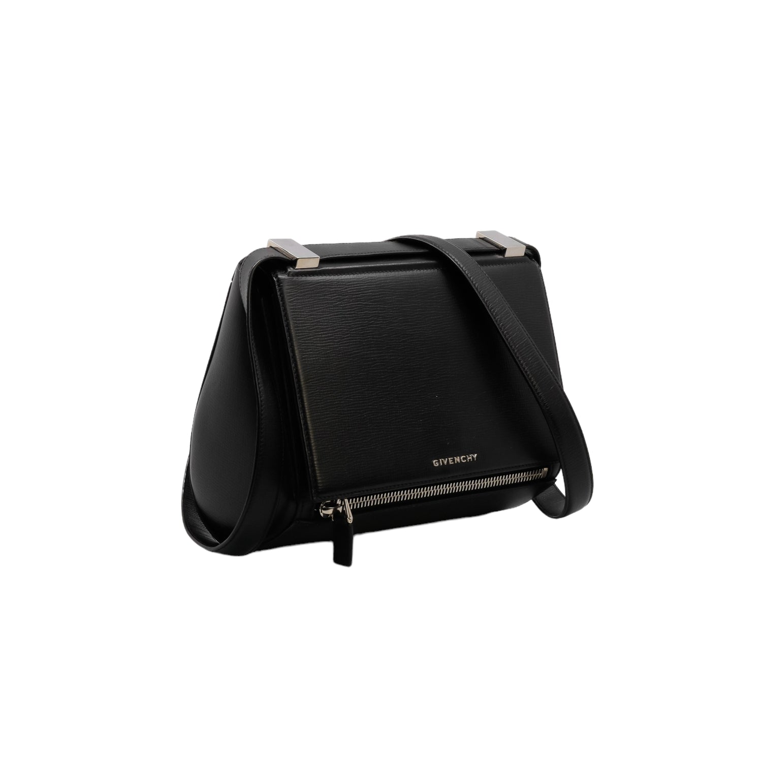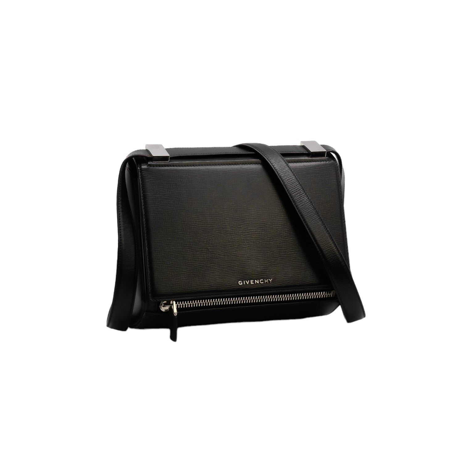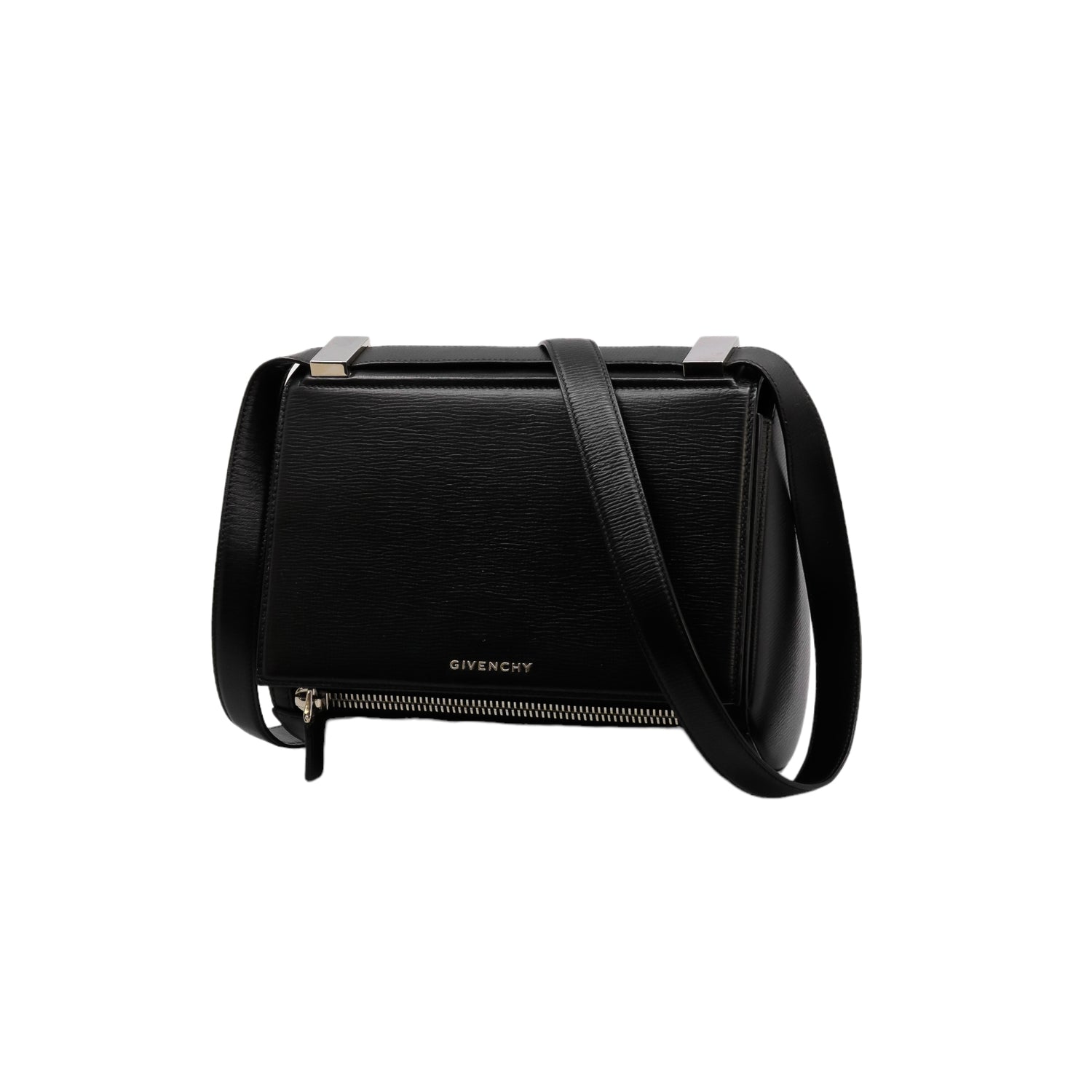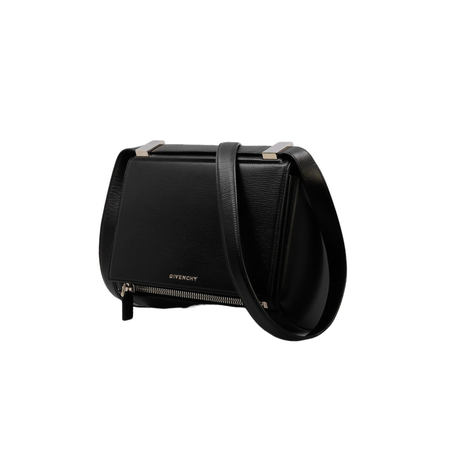 Bolso de la marca Givenchy modelo Caja de Pandora, confeccionado en piel rígida color negro, con asa-bandolera autoajustable en mismo material, interior en ante negro, con bolsillo interno, cierres de cremallera y herrajes en color dorado, solapa con seguro de botón.