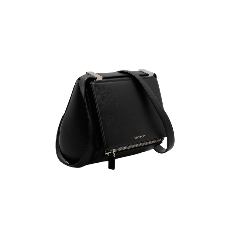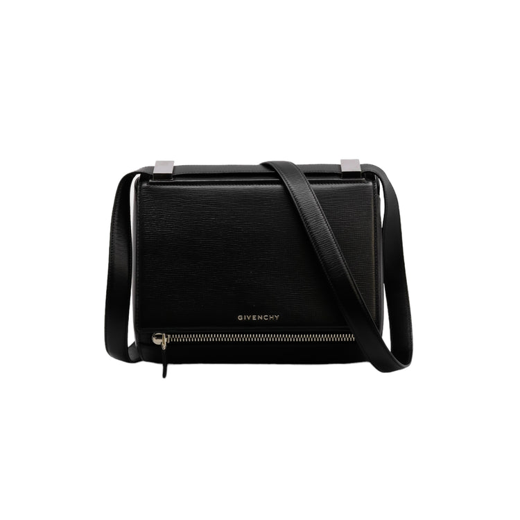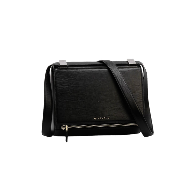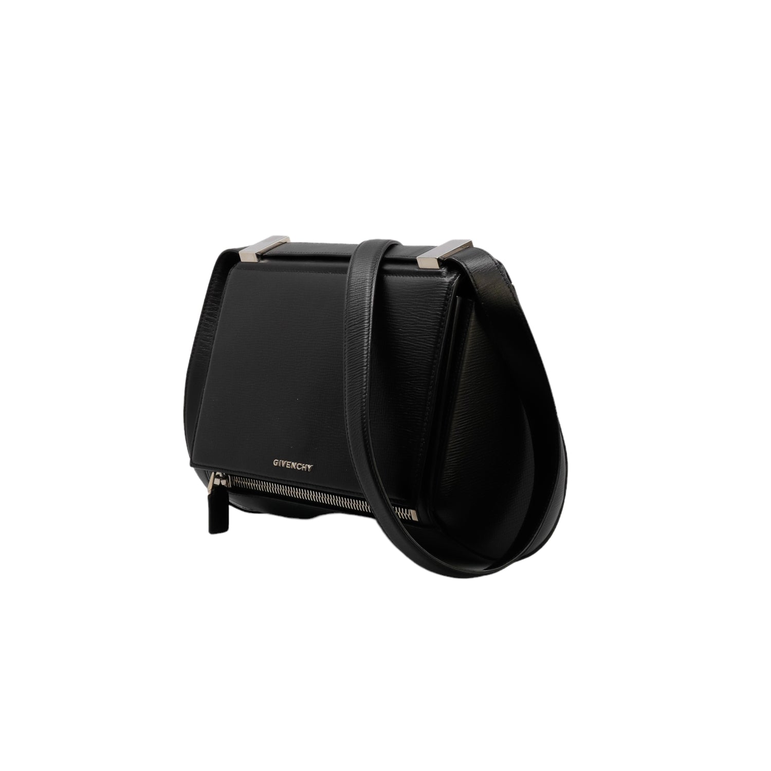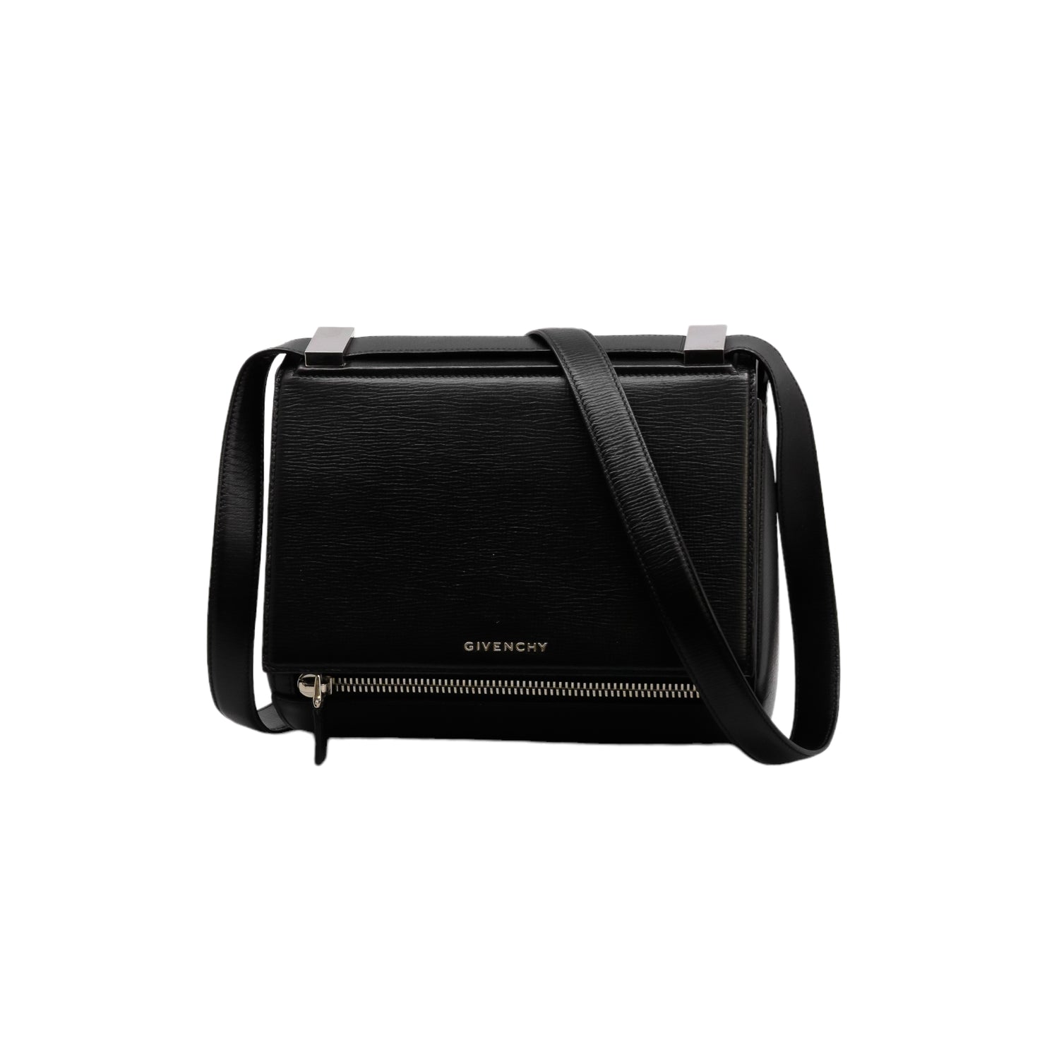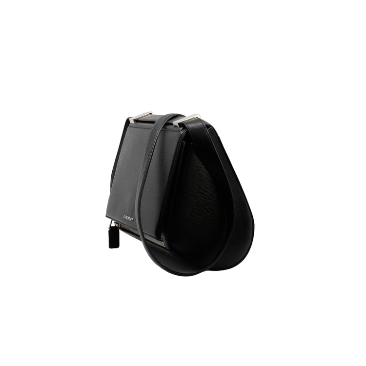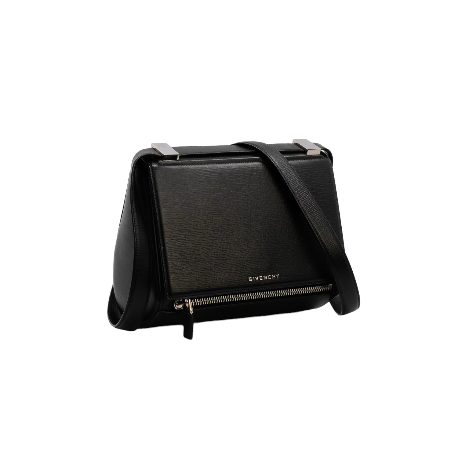 Bolso de la marca Givenchy modelo Caja de Pandora, confeccionado en piel rígida color negro, con asa-bandolera autoajustable en mismo material, interior en ante negro, con bolsillo interno, cierres de cremallera y herrajes en color dorado, solapa con seguro de botón.