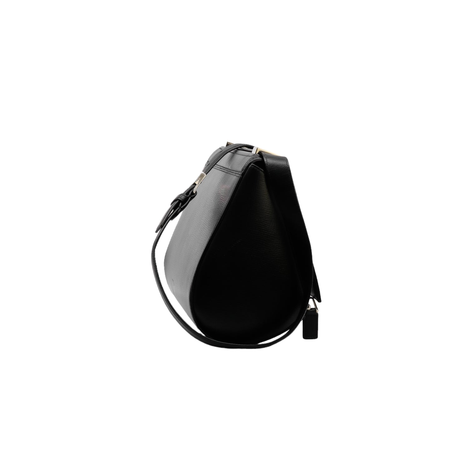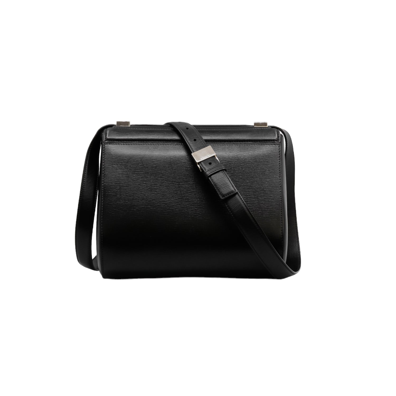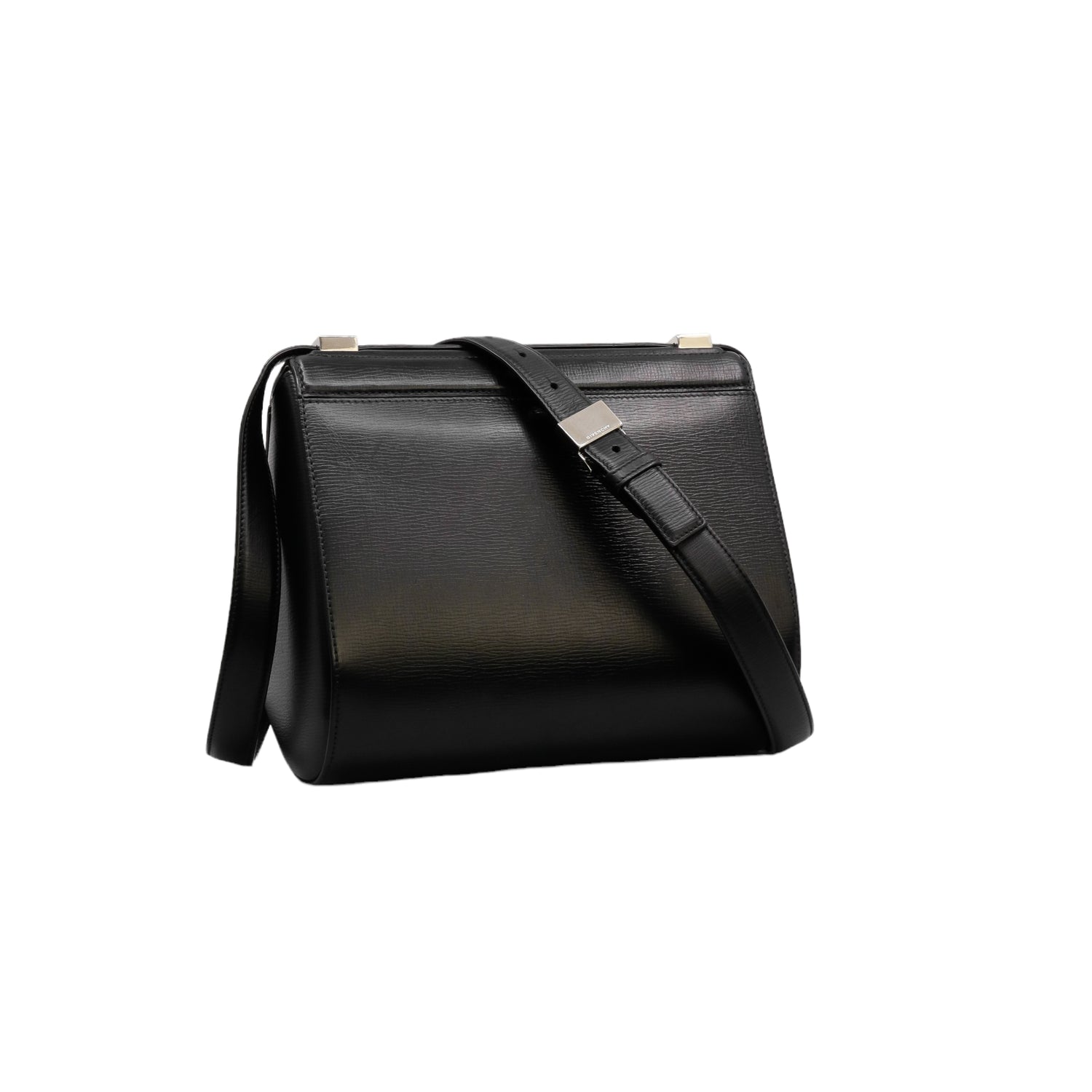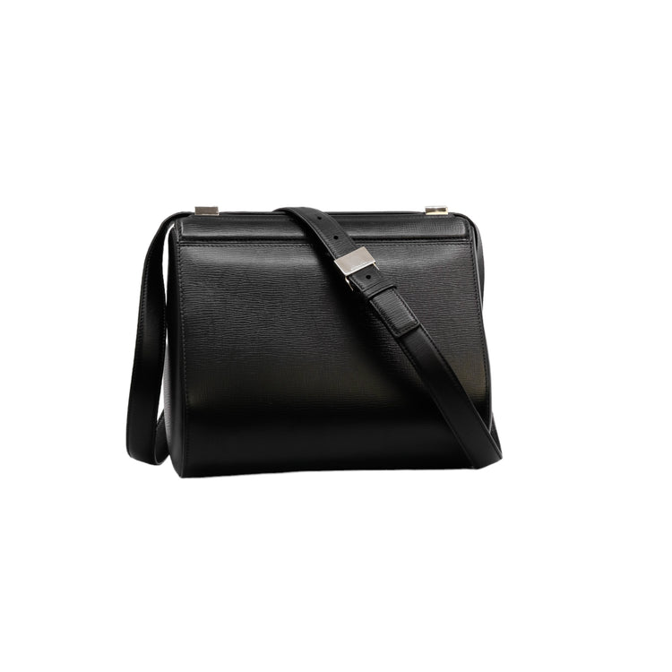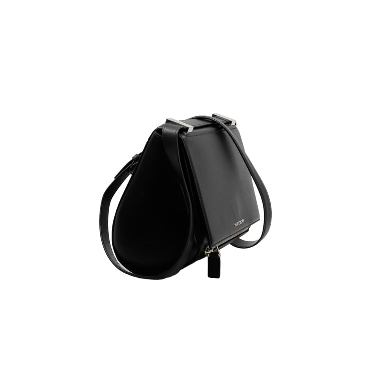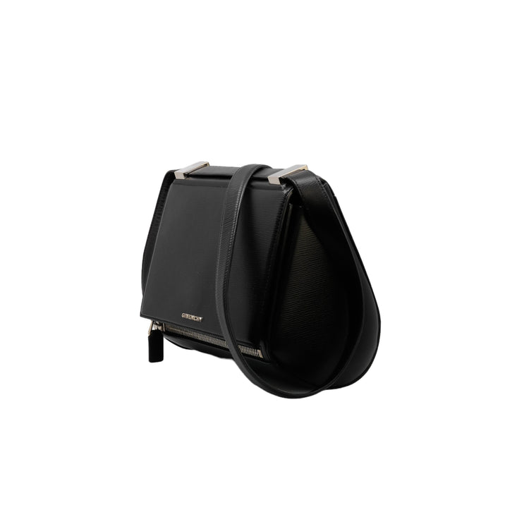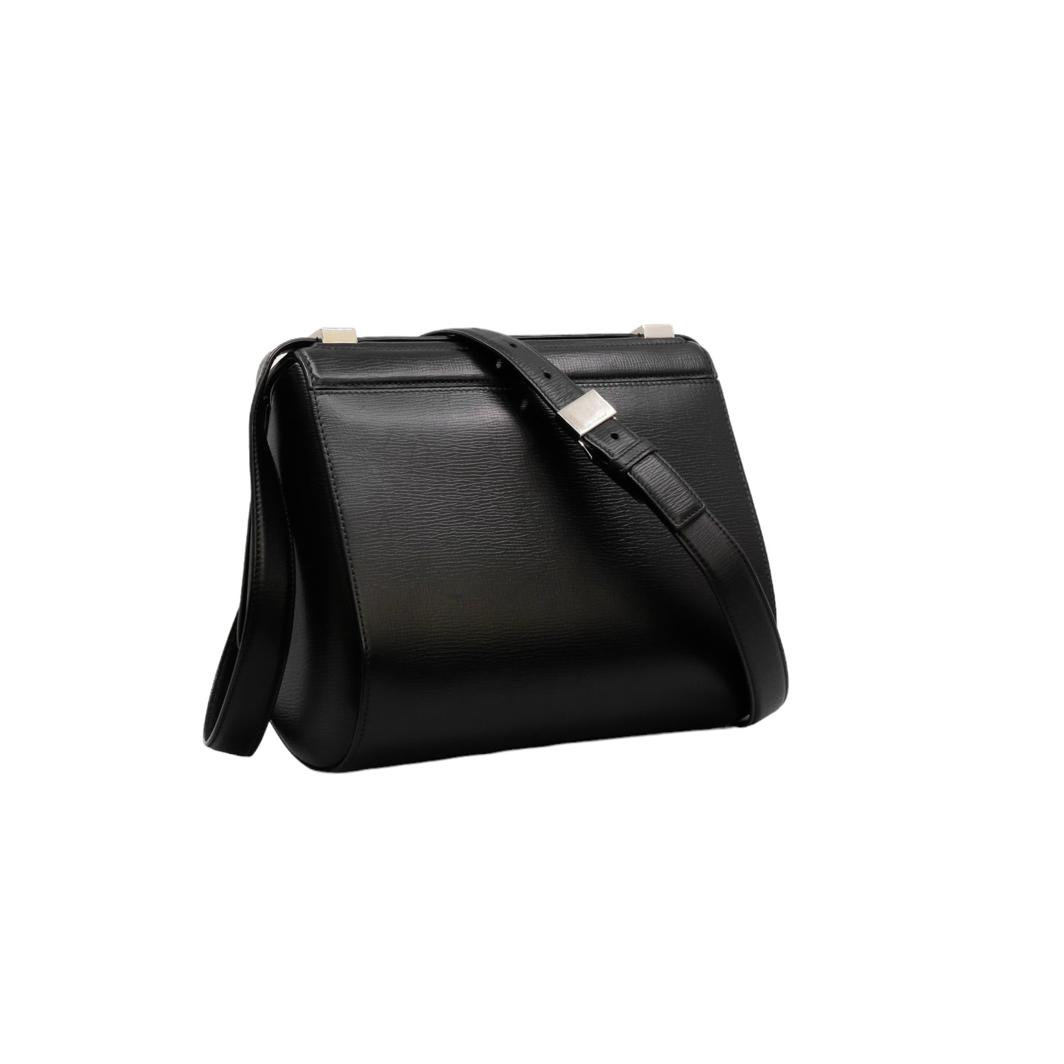 Bolso de la marca Givenchy modelo Caja de Pandora, confeccionado en piel rígida color negro, con asa-bandolera autoajustable en mismo material, interior en ante negro, con bolsillo interno, cierres de cremallera y herrajes en color dorado, solapa con seguro de botón.