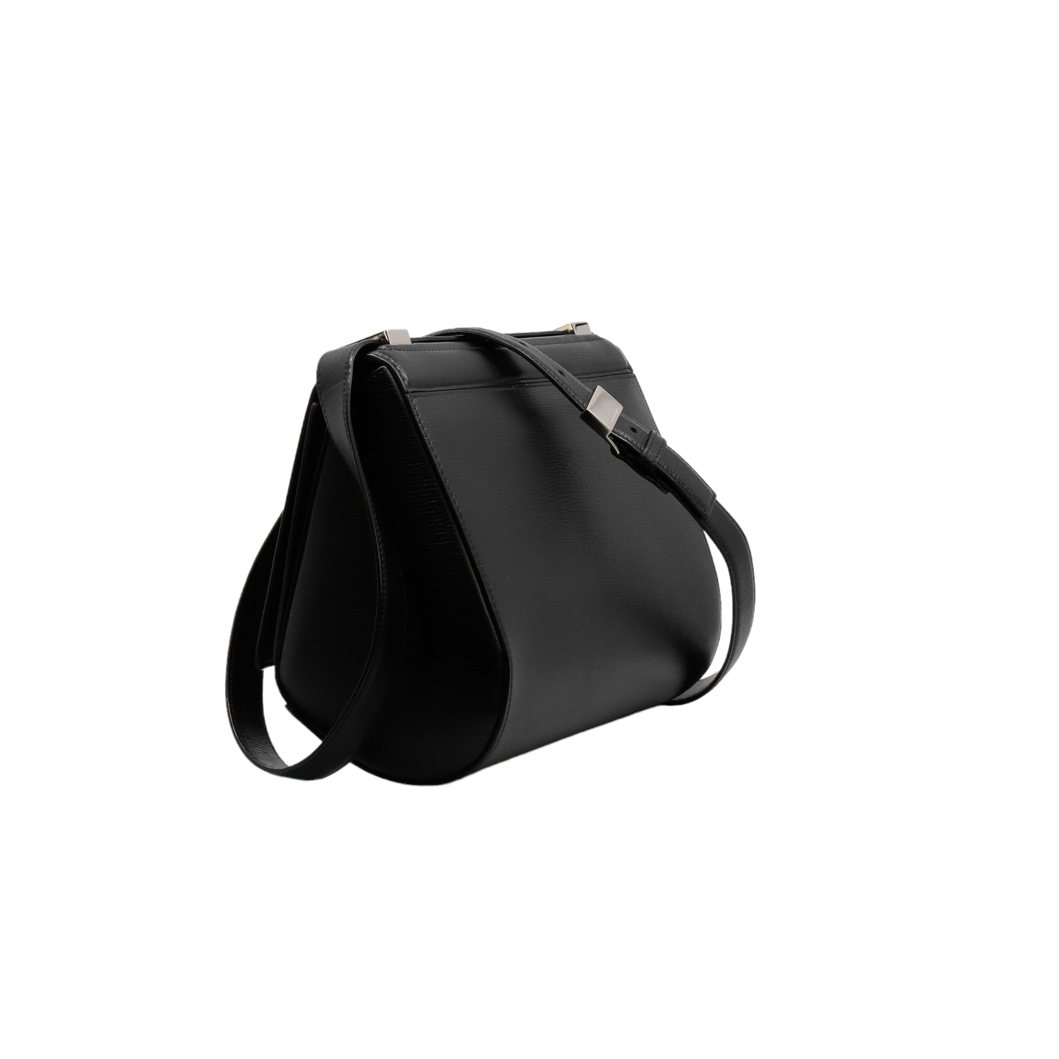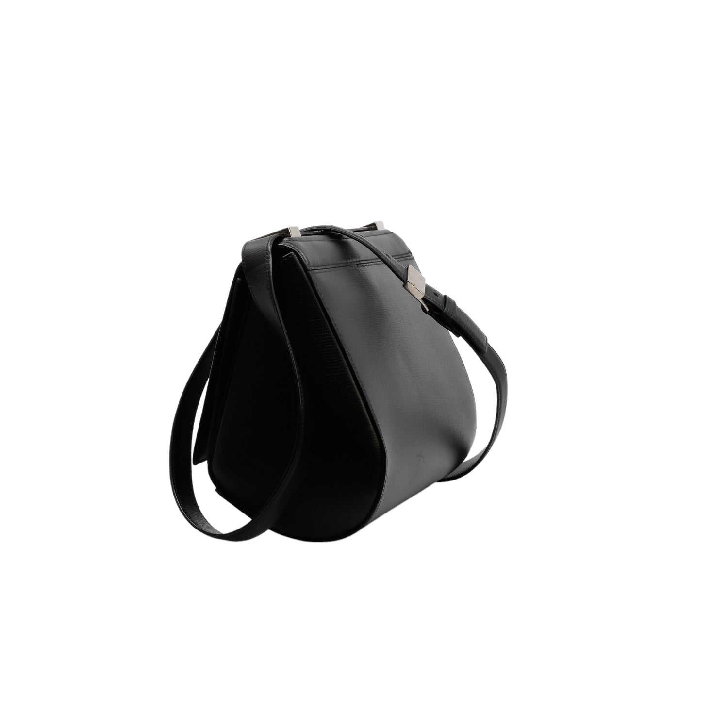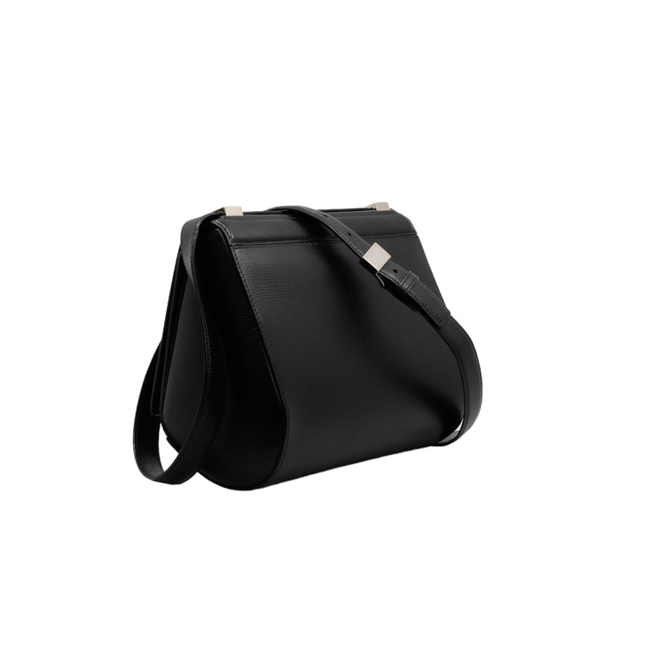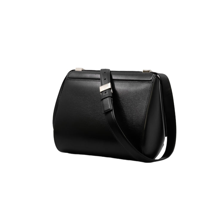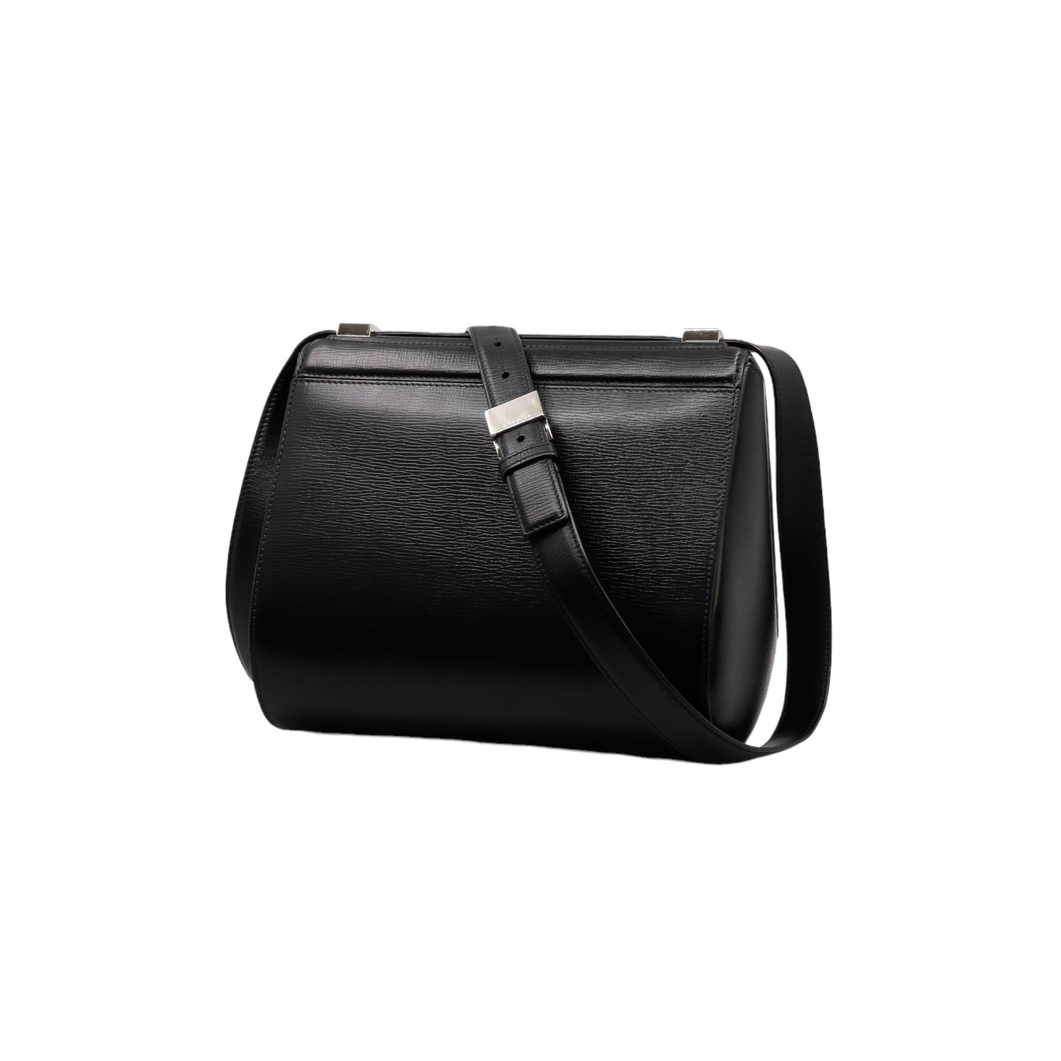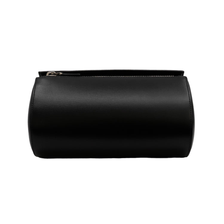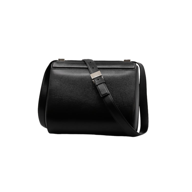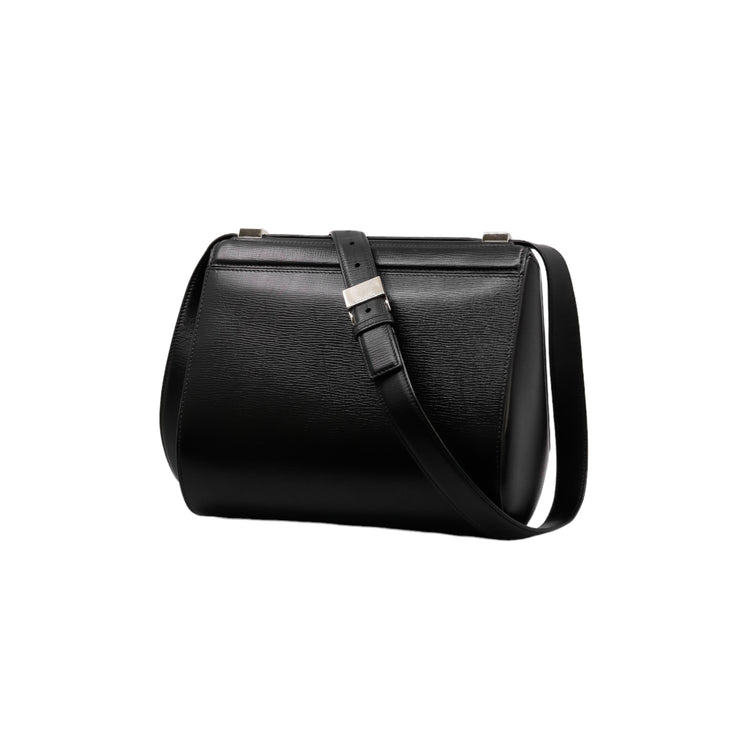 Bolso de la marca Givenchy modelo Caja de Pandora, confeccionado en piel rígida color negro, con asa-bandolera autoajustable en mismo material, interior en ante negro, con bolsillo interno, cierres de cremallera y herrajes en color dorado, solapa con seguro de botón.