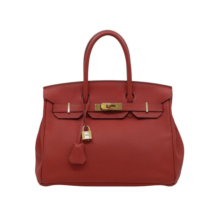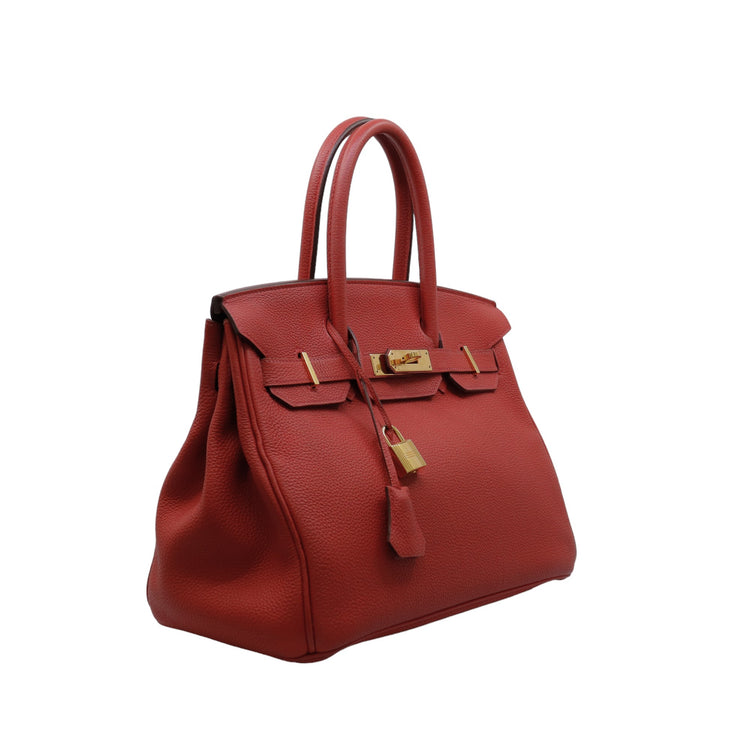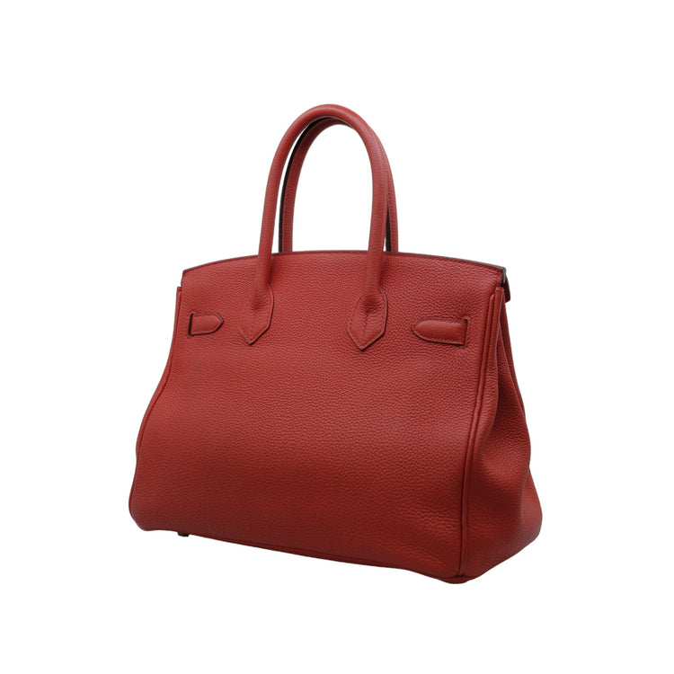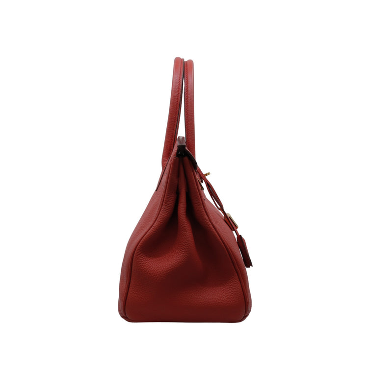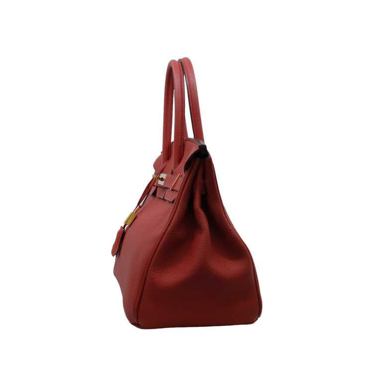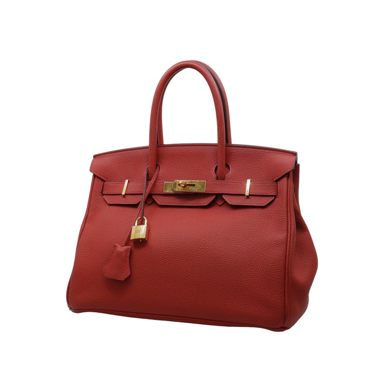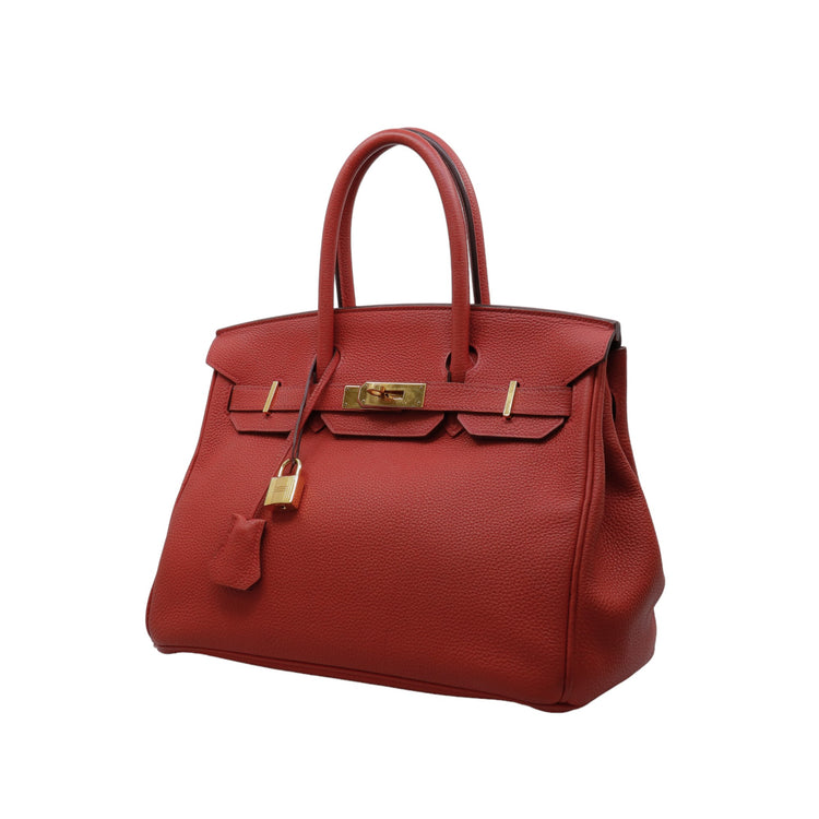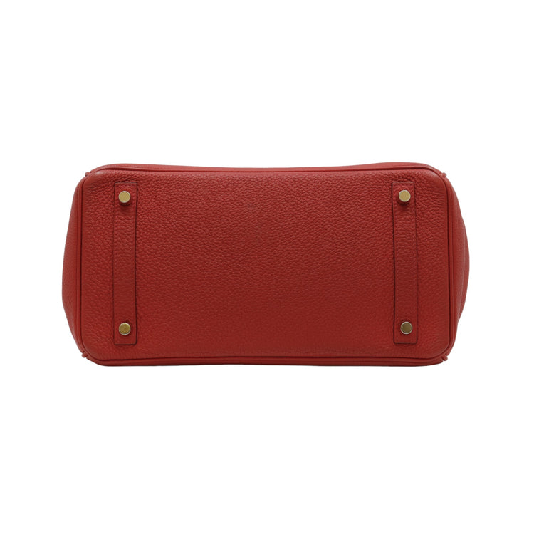 Bolso Hermés Birkin 30, confeccionado en suave piel de cordero color rojo, con 2 asas tubulares rígidas, solapa al frente con herrajes llave y candado en color dorado, placas con leves rayones. BOLSO DE SEGUNDA MANO EN MUY BUEN ESTADO. Cuenta con cubre polvo.