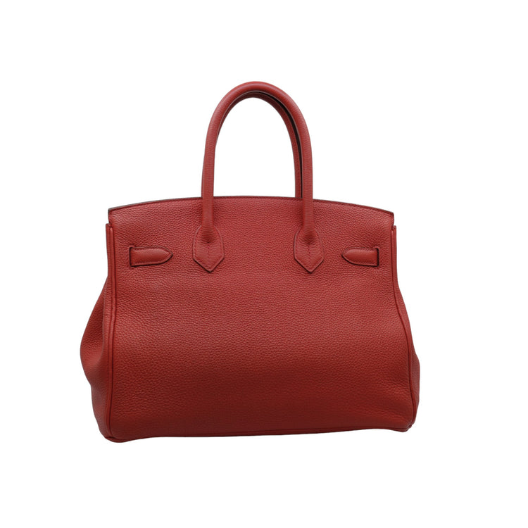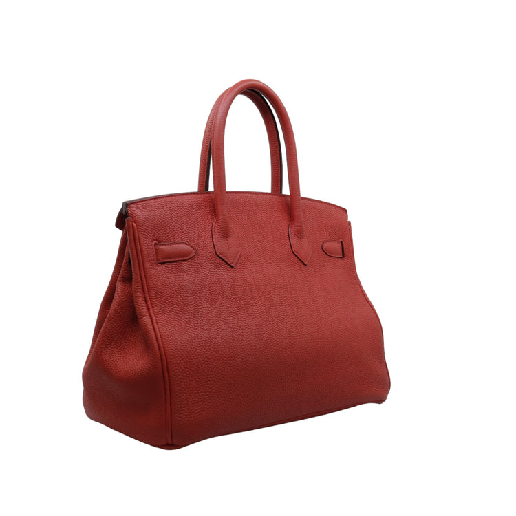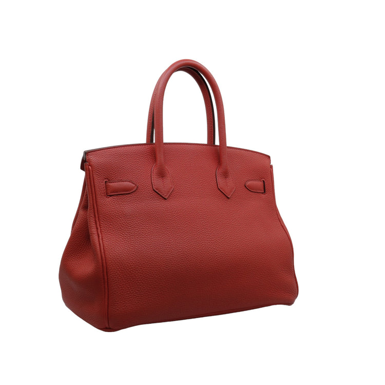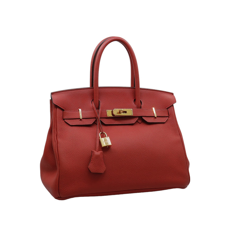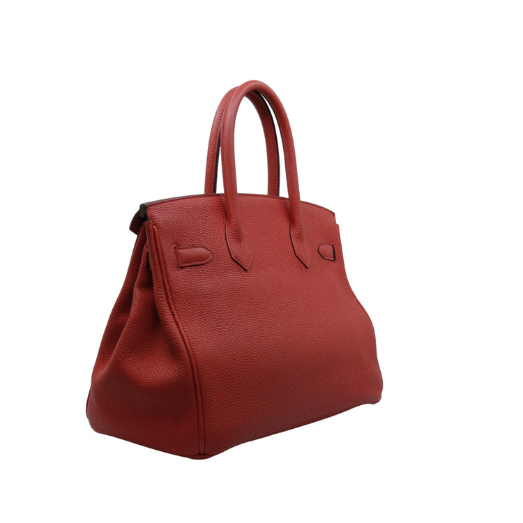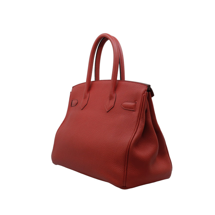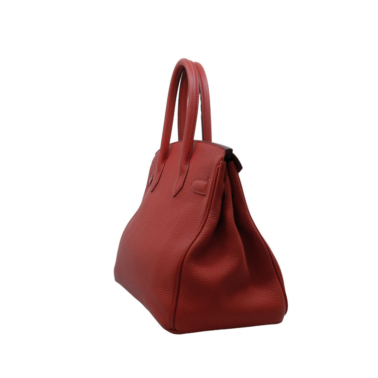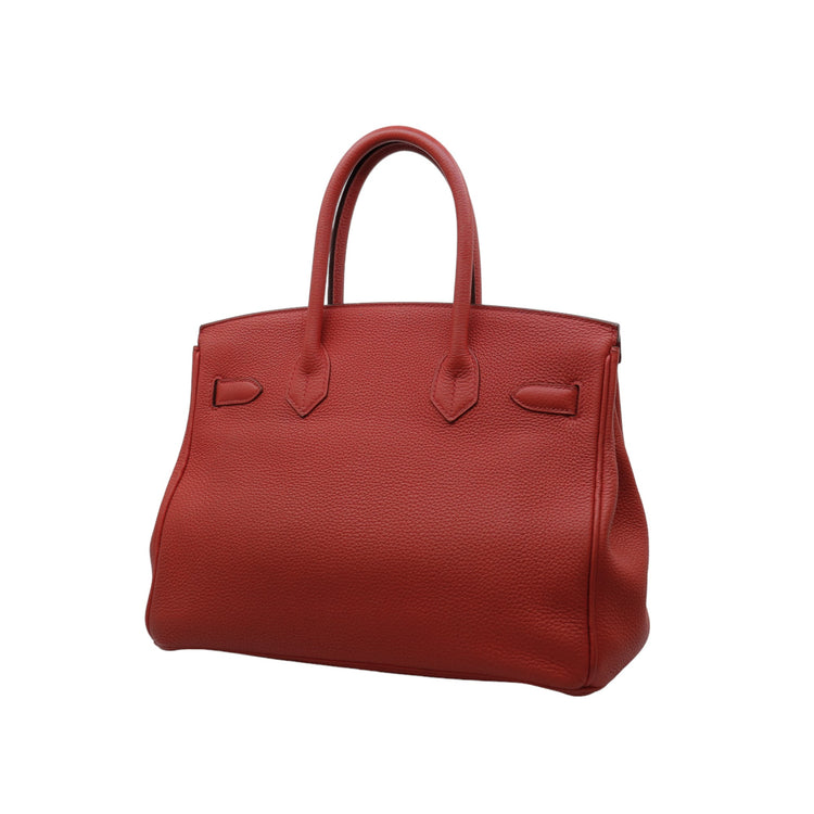 Bolso Hermés Birkin 30, confeccionado en suave piel de cordero color rojo, con 2 asas tubulares rígidas, solapa al frente con herrajes llave y candado en color dorado, placas con leves rayones. BOLSO DE SEGUNDA MANO EN MUY BUEN ESTADO. Cuenta con cubre polvo.