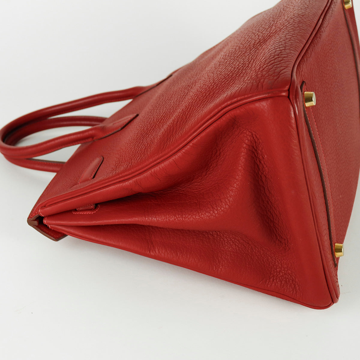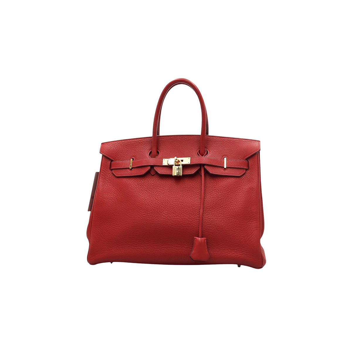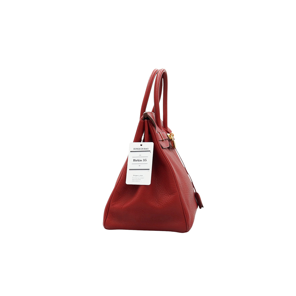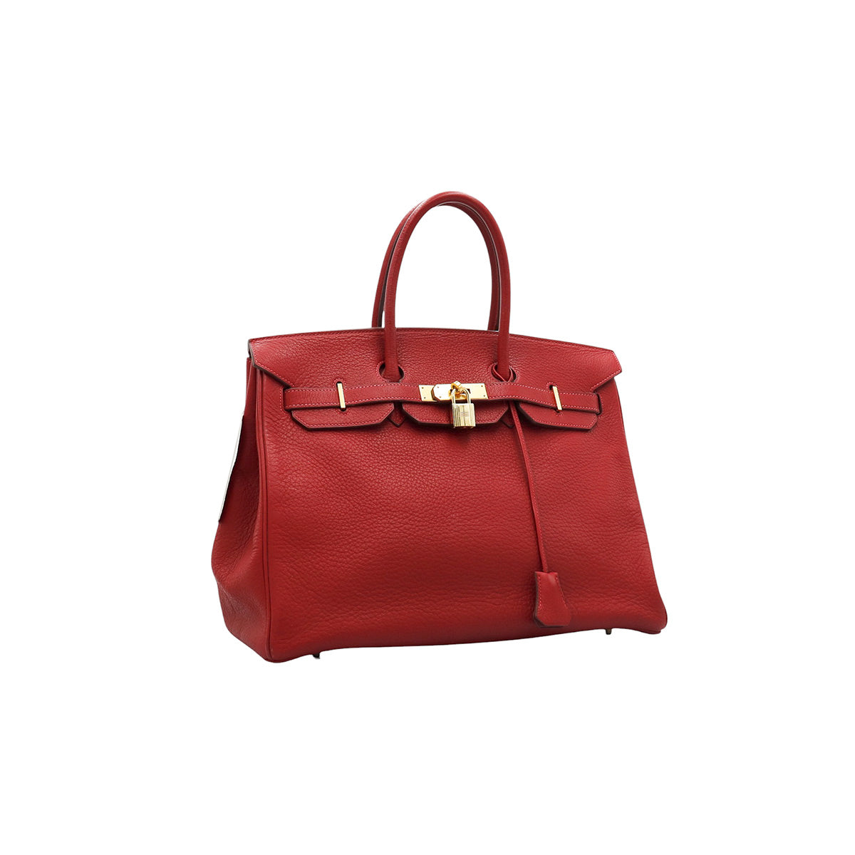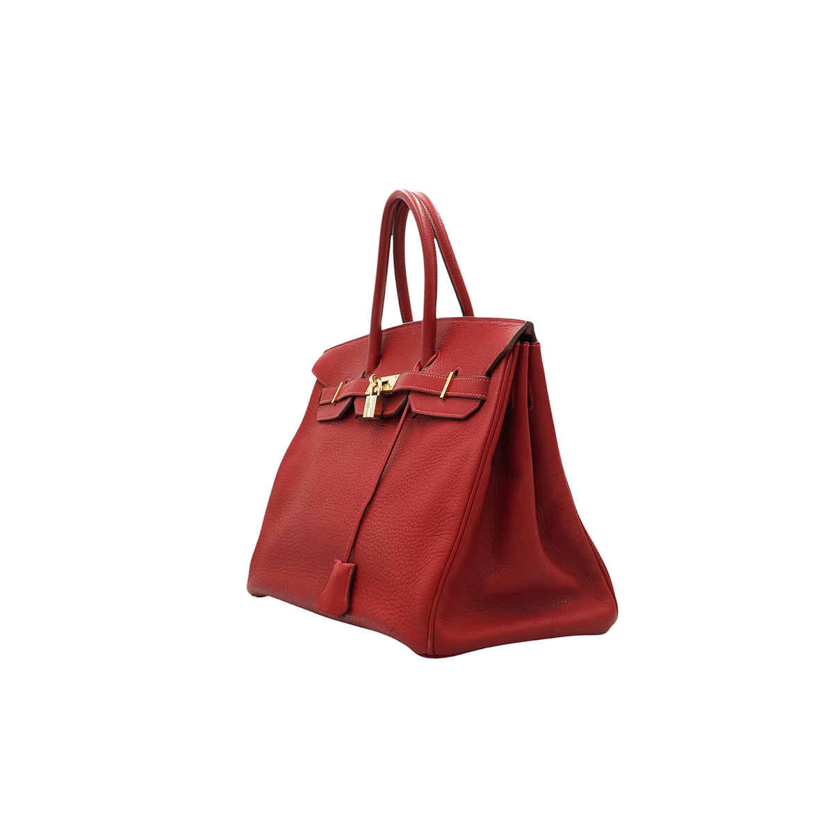 Bolso Hermès Birkin 35 confeccionado en suave piel de becerro en color rojo, con 2 asas rígidas superiores tubulares y solapa al frente, correa con herrajes dorados y tradicional cierre tipo torniquete giratorio, con 2 bolsillos internos, con cierre de cremallera interno en color dorado, cuenta con 2 llaves y candado. Leves detalles por uso, interior poco sucio y herrajes algo rayados, esquina de las bases con leves raspones.