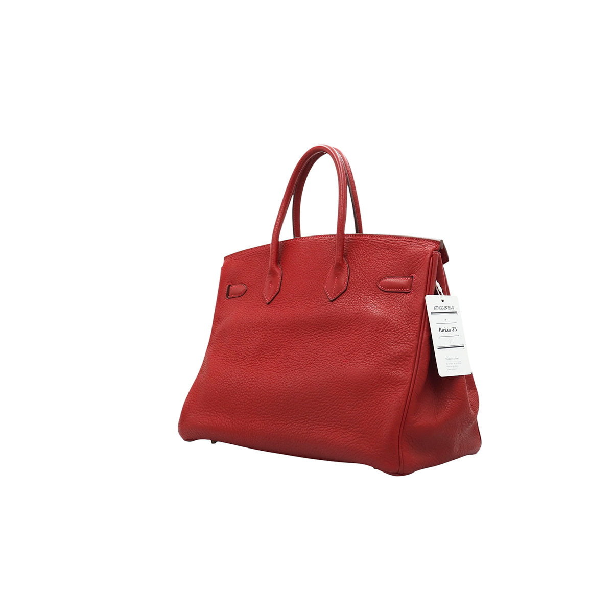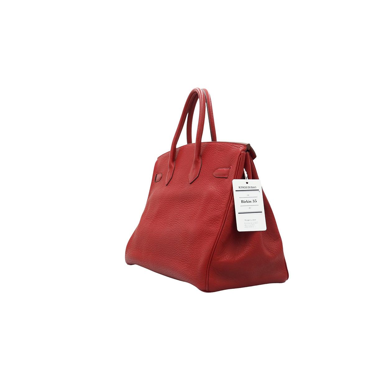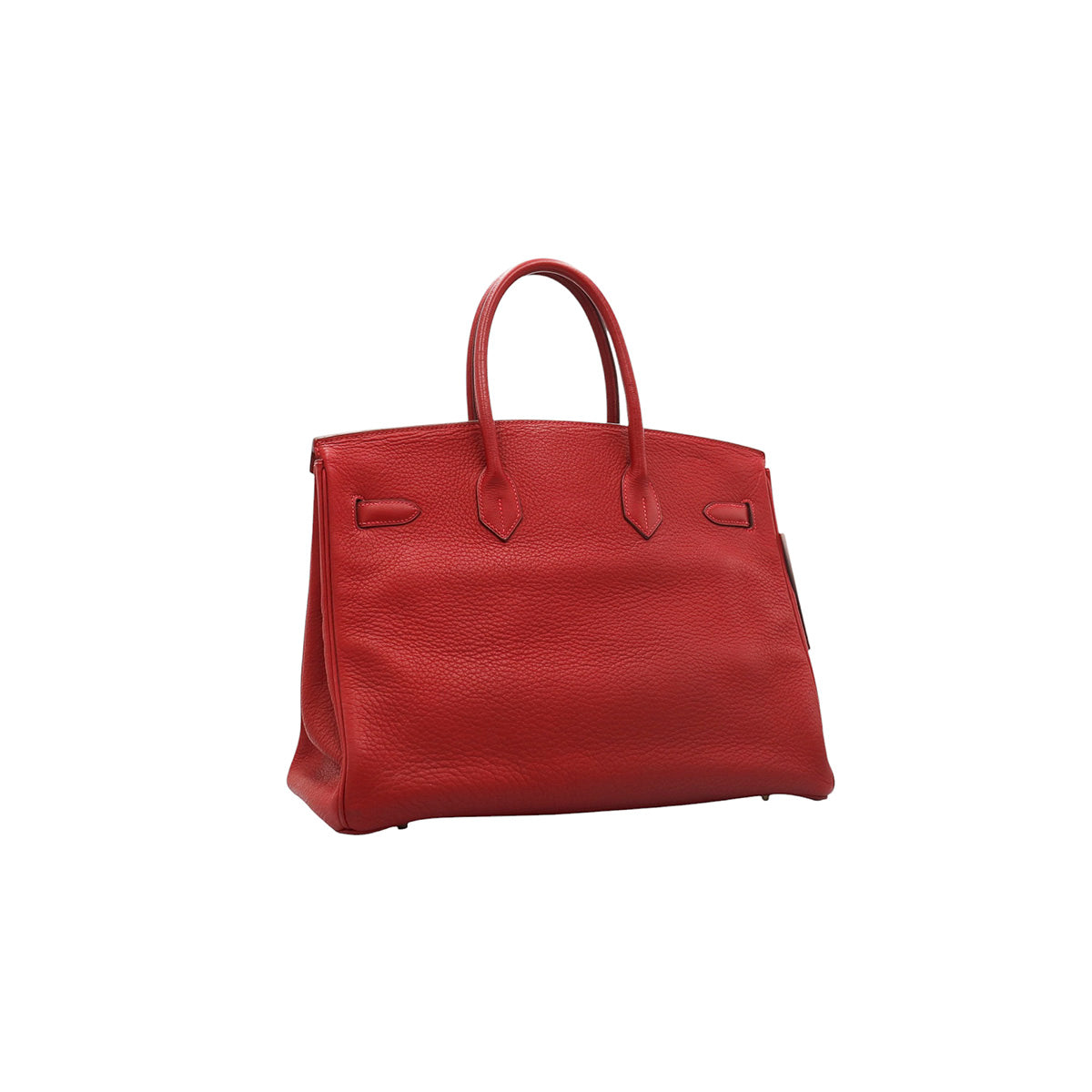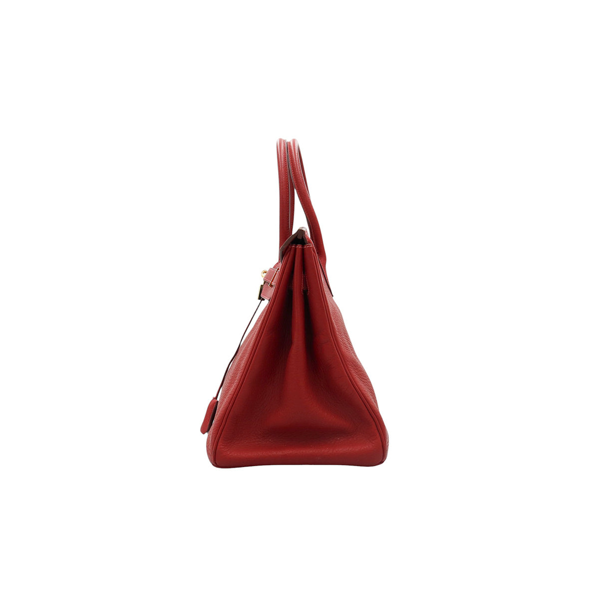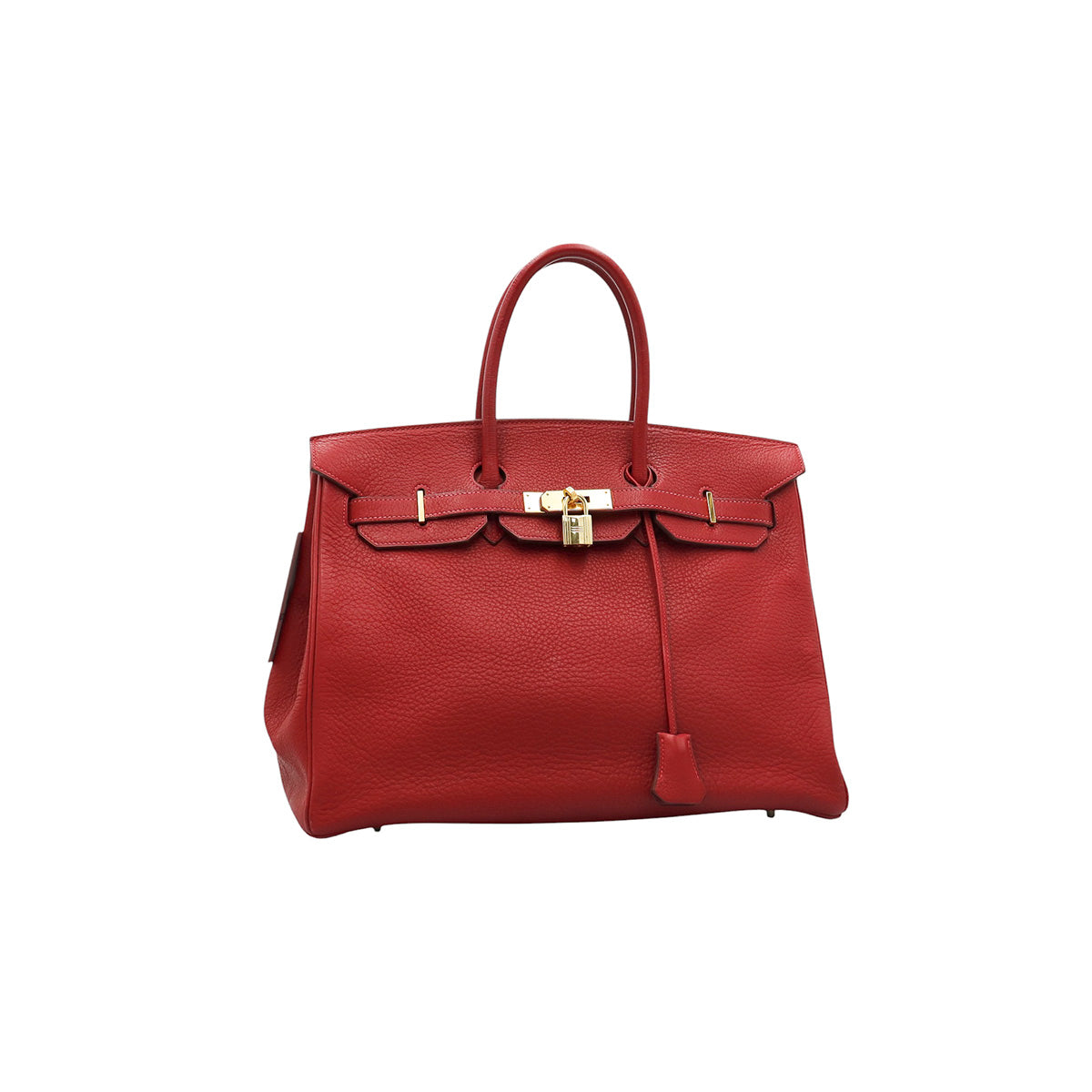 Bolso Hermès Birkin 35 confeccionado en suave piel de becerro en color rojo, con 2 asas rígidas superiores tubulares y solapa al frente, correa con herrajes dorados y tradicional cierre tipo torniquete giratorio, con 2 bolsillos internos, con cierre de cremallera interno en color dorado, cuenta con 2 llaves y candado. Leves detalles por uso, interior poco sucio y herrajes algo rayados, esquina de las bases con leves raspones.