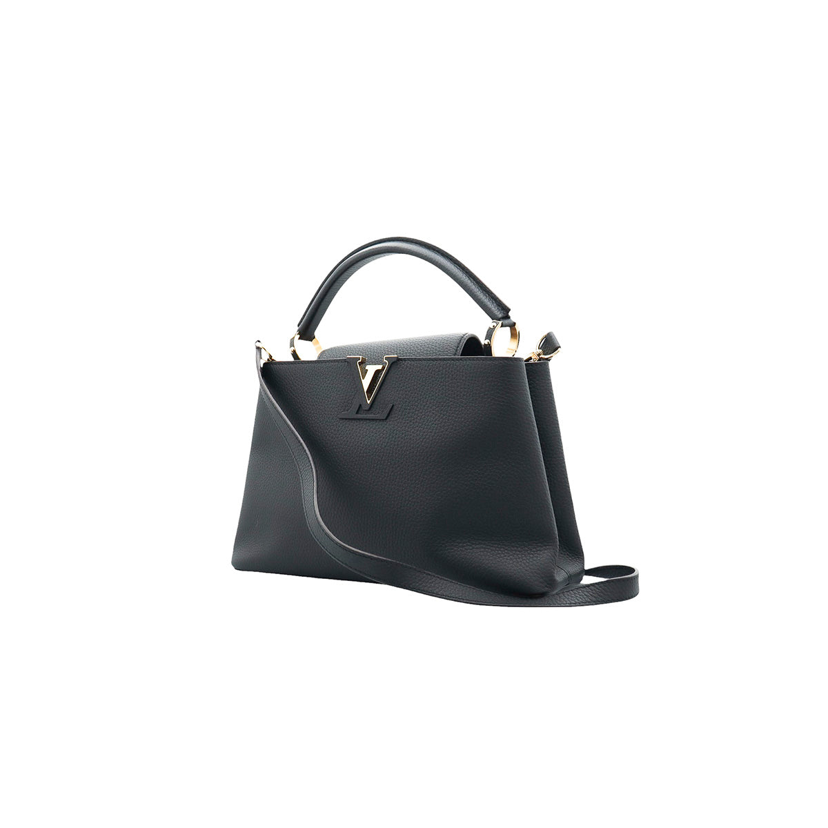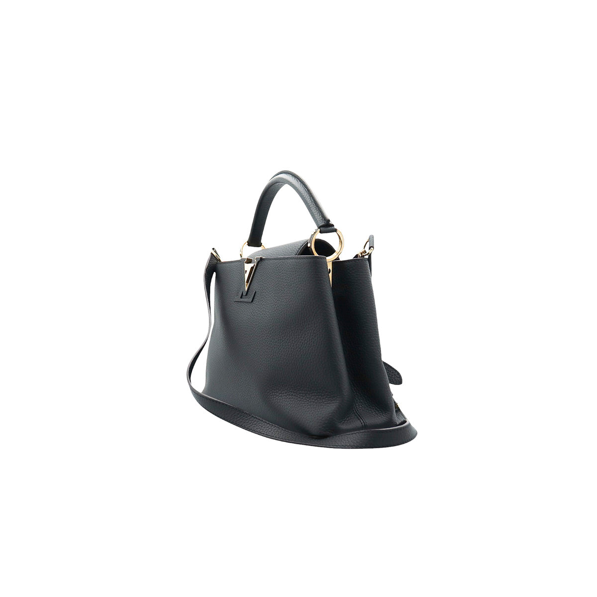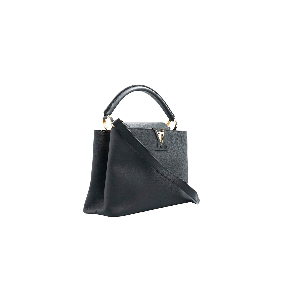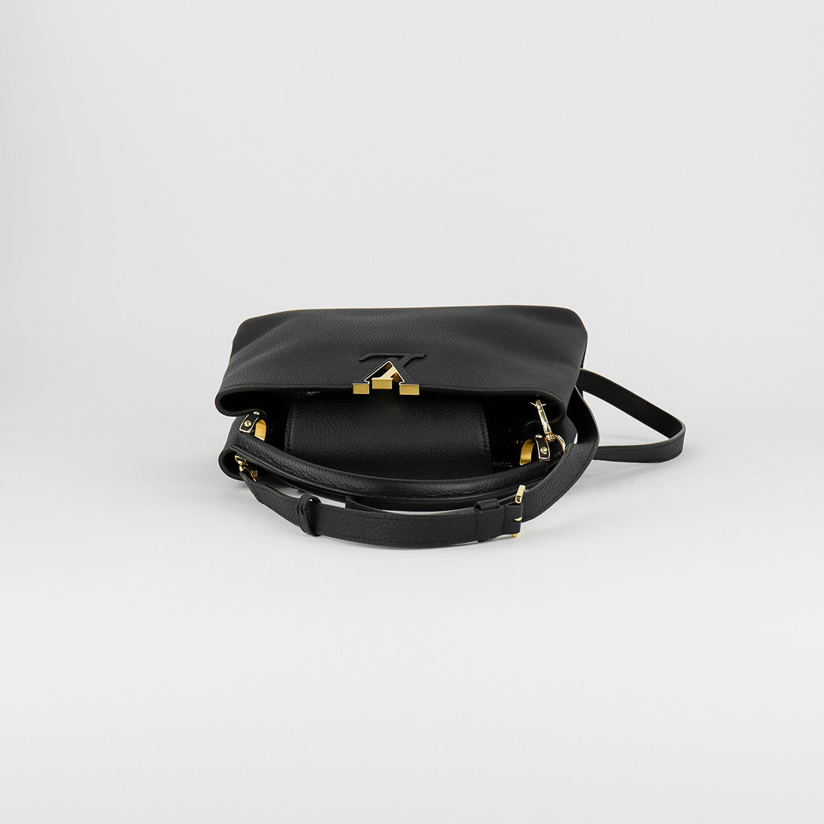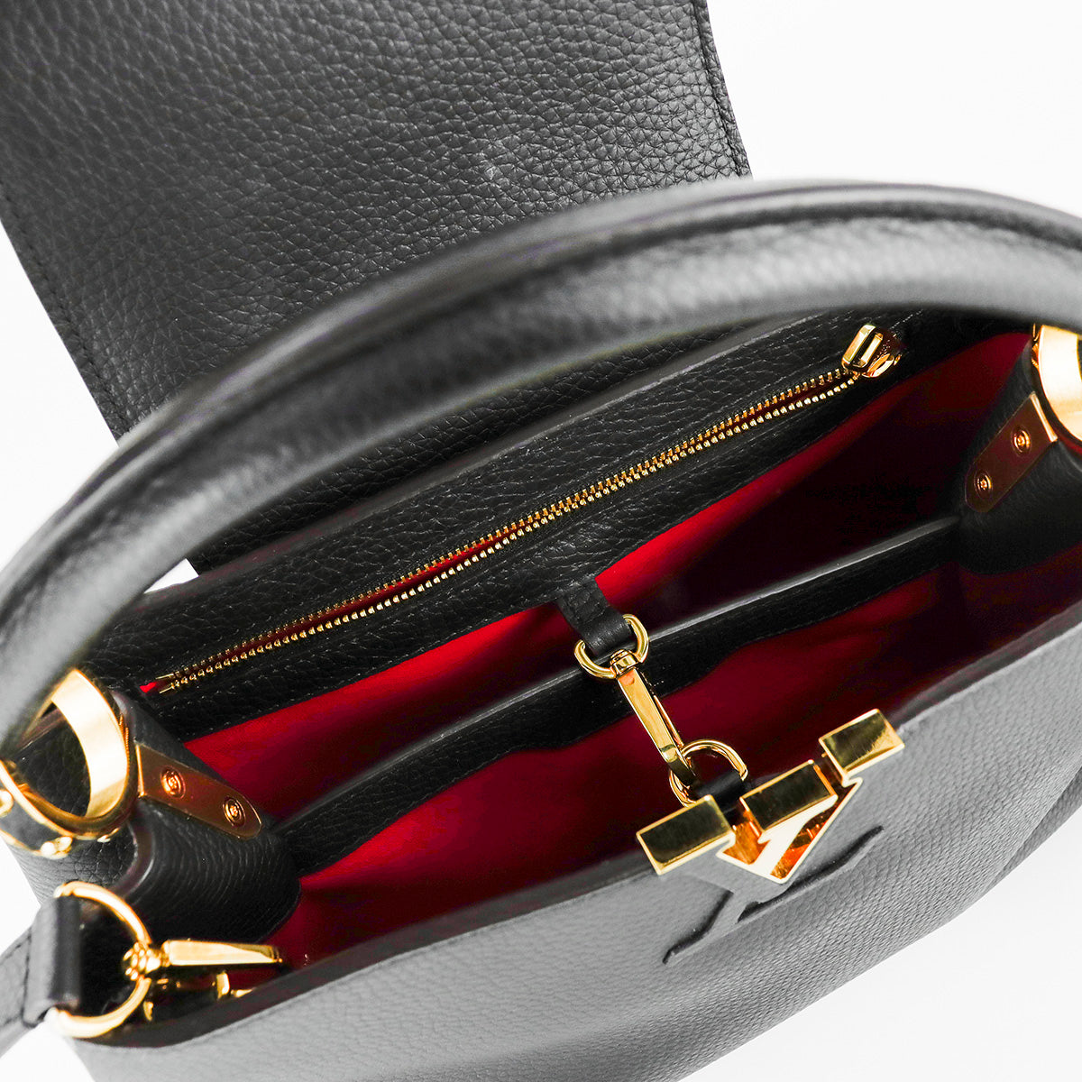 Bolso Louis Vuitton de la colección Capucines, confeccionado en piel taurillon, asa rígida y bandolera, con forro interno en piel color rosa, herrajes en color dorado, poco sucia.