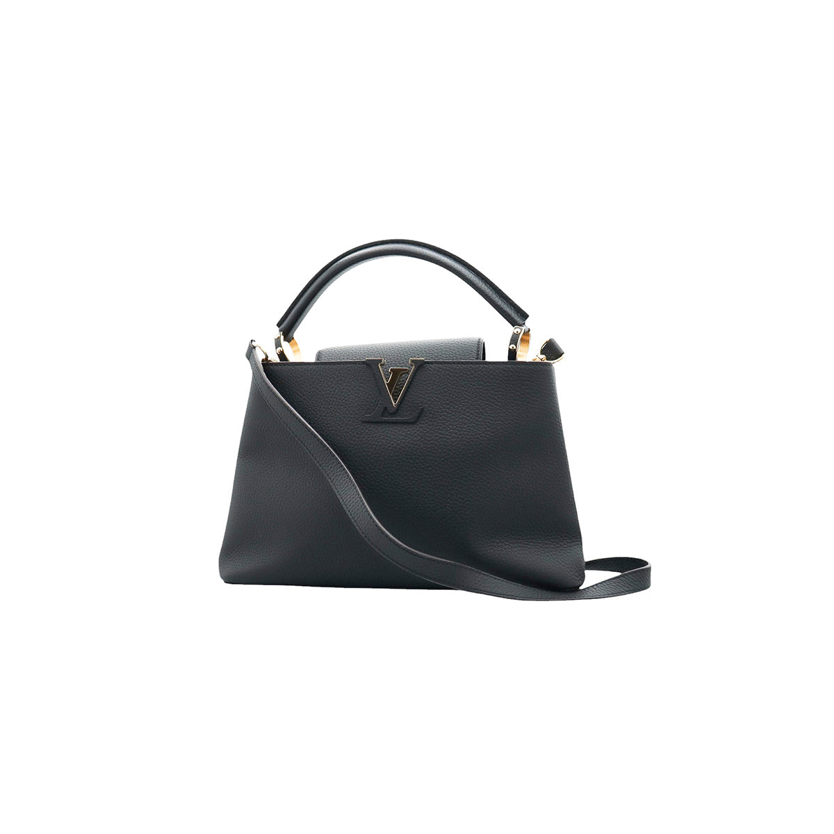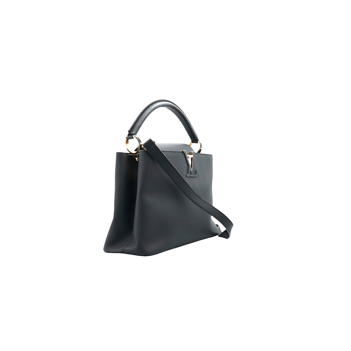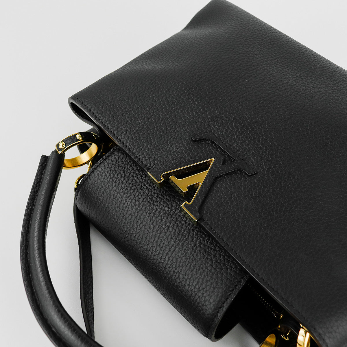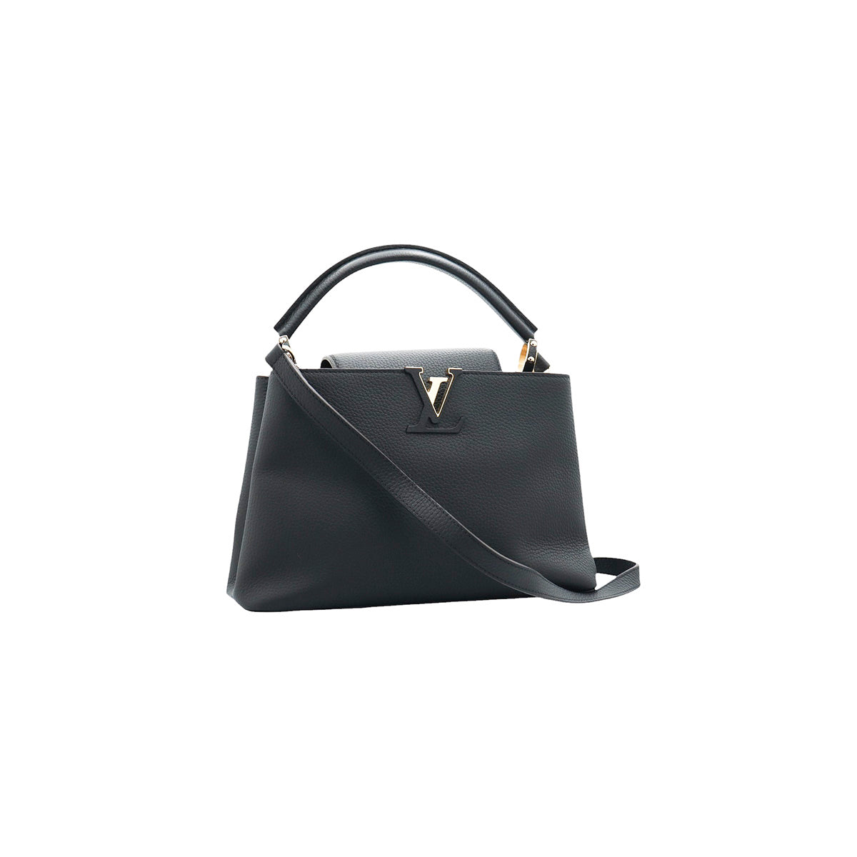 Bolso Louis Vuitton de la colección Capucines, confeccionado en piel taurillon, asa rígida y bandolera, con forro interno en piel color rosa, herrajes en color dorado, poco sucia.
