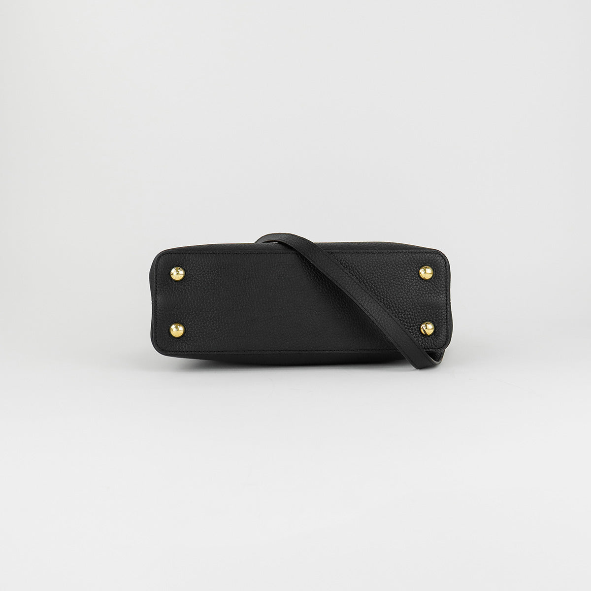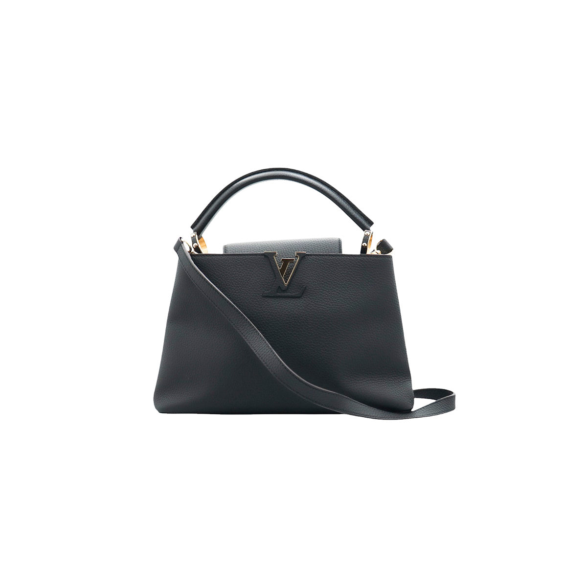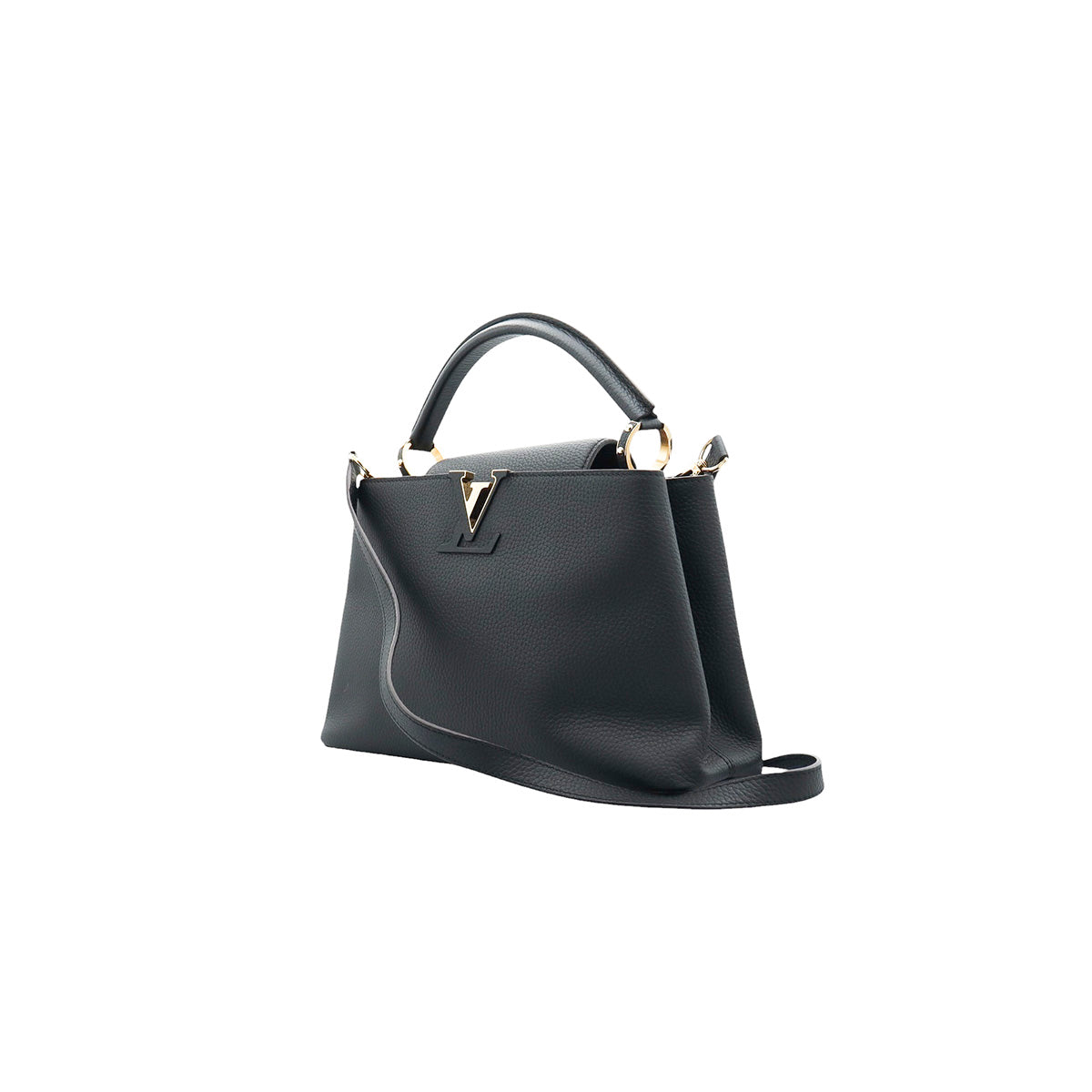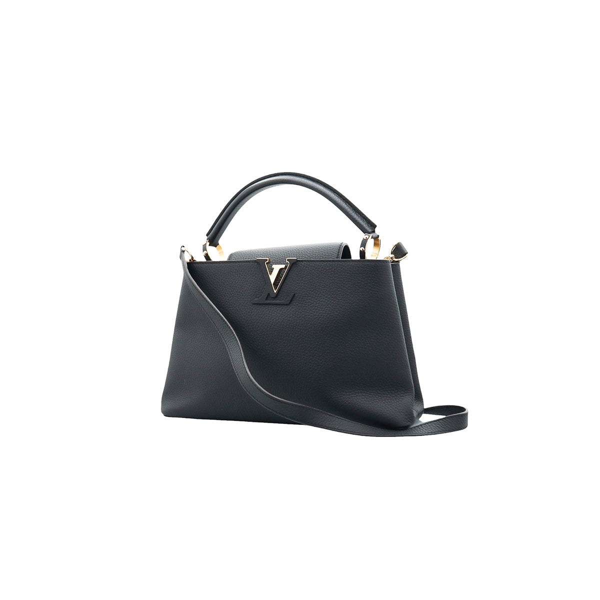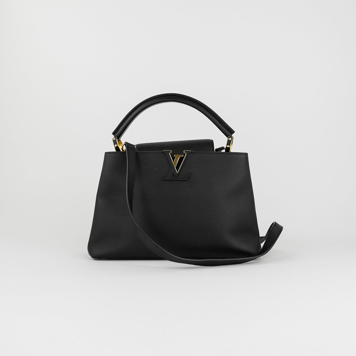 Bolso Louis Vuitton de la colección Capucines, confeccionado en piel taurillon, asa rígida y bandolera, con forro interno en piel color rosa, herrajes en color dorado, poco sucia.