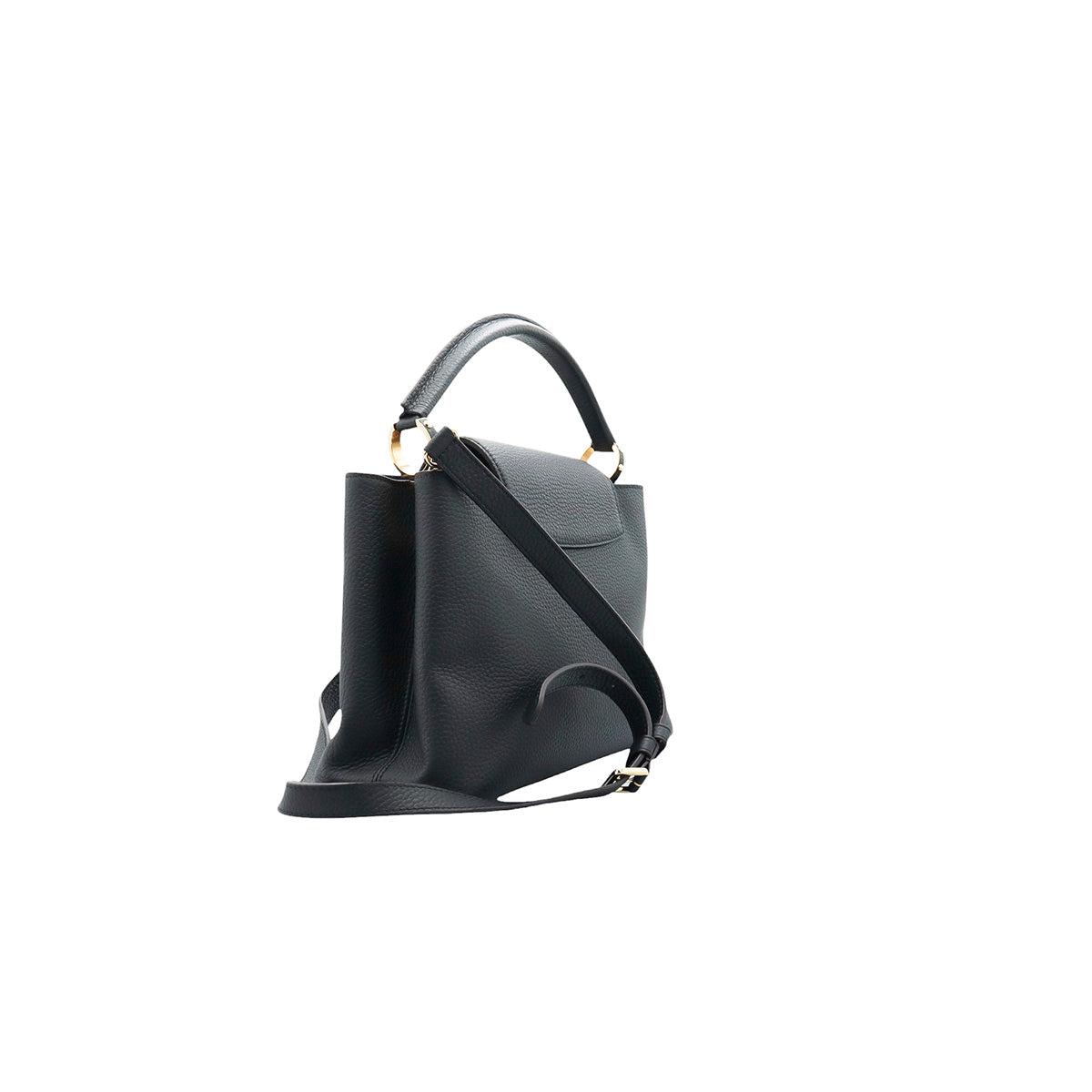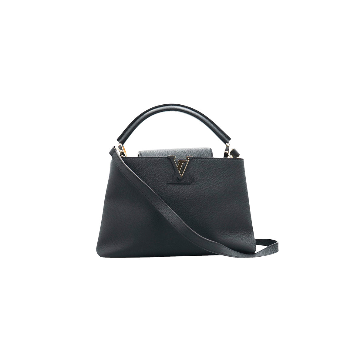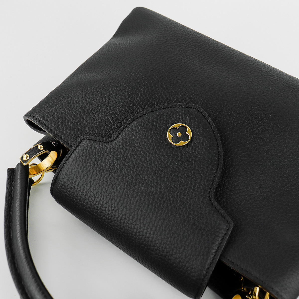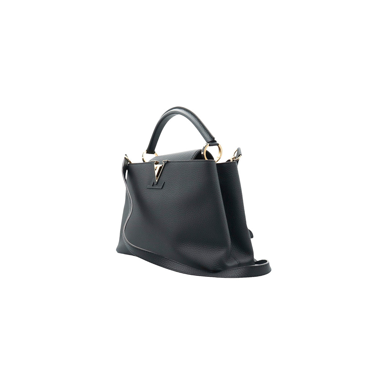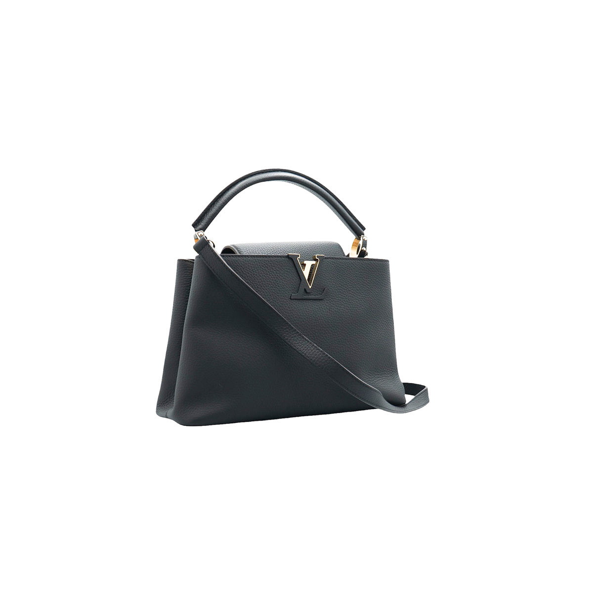 Bolso Louis Vuitton de la colección Capucines, confeccionado en piel taurillon, asa rígida y bandolera, con forro interno en piel color rosa, herrajes en color dorado, poco sucia.