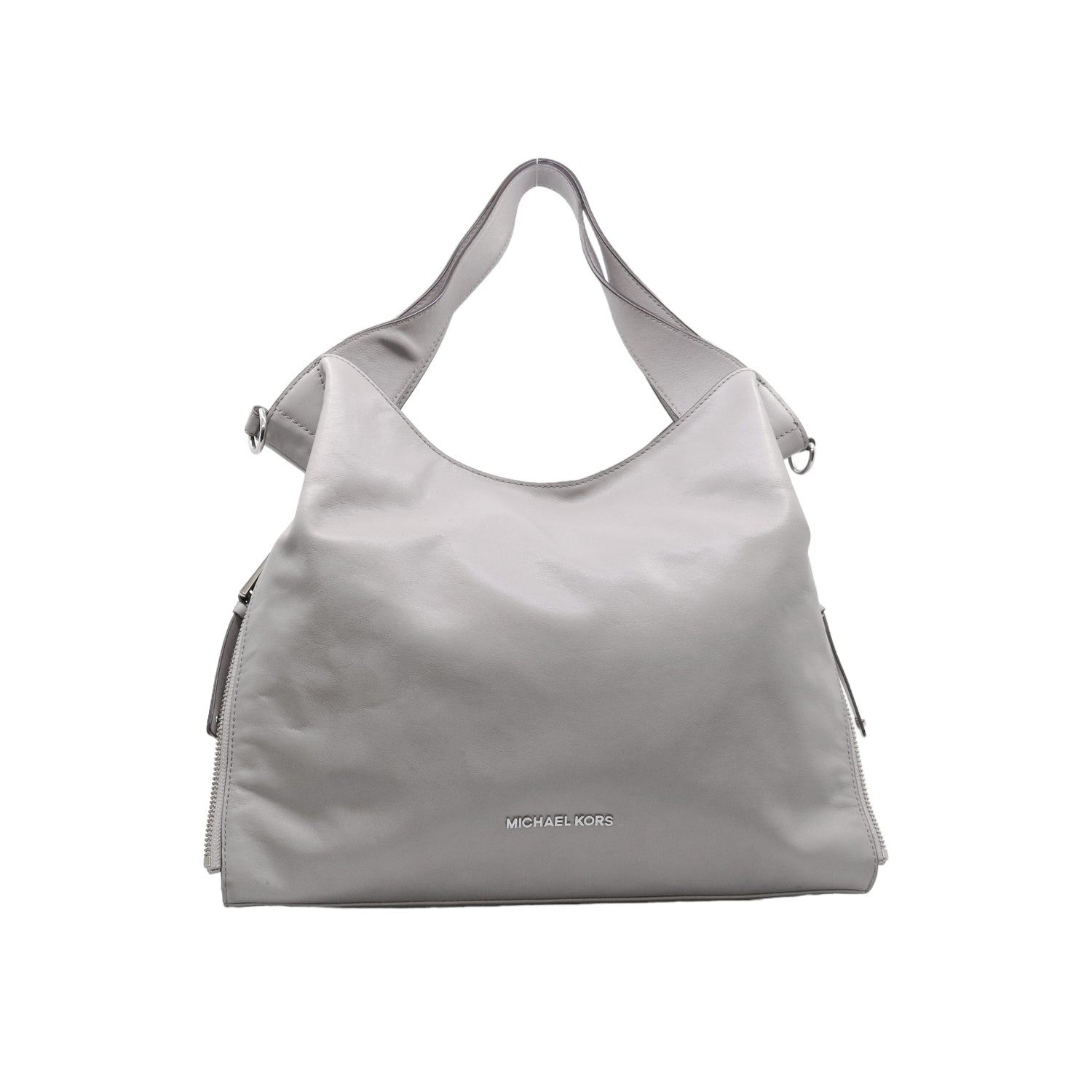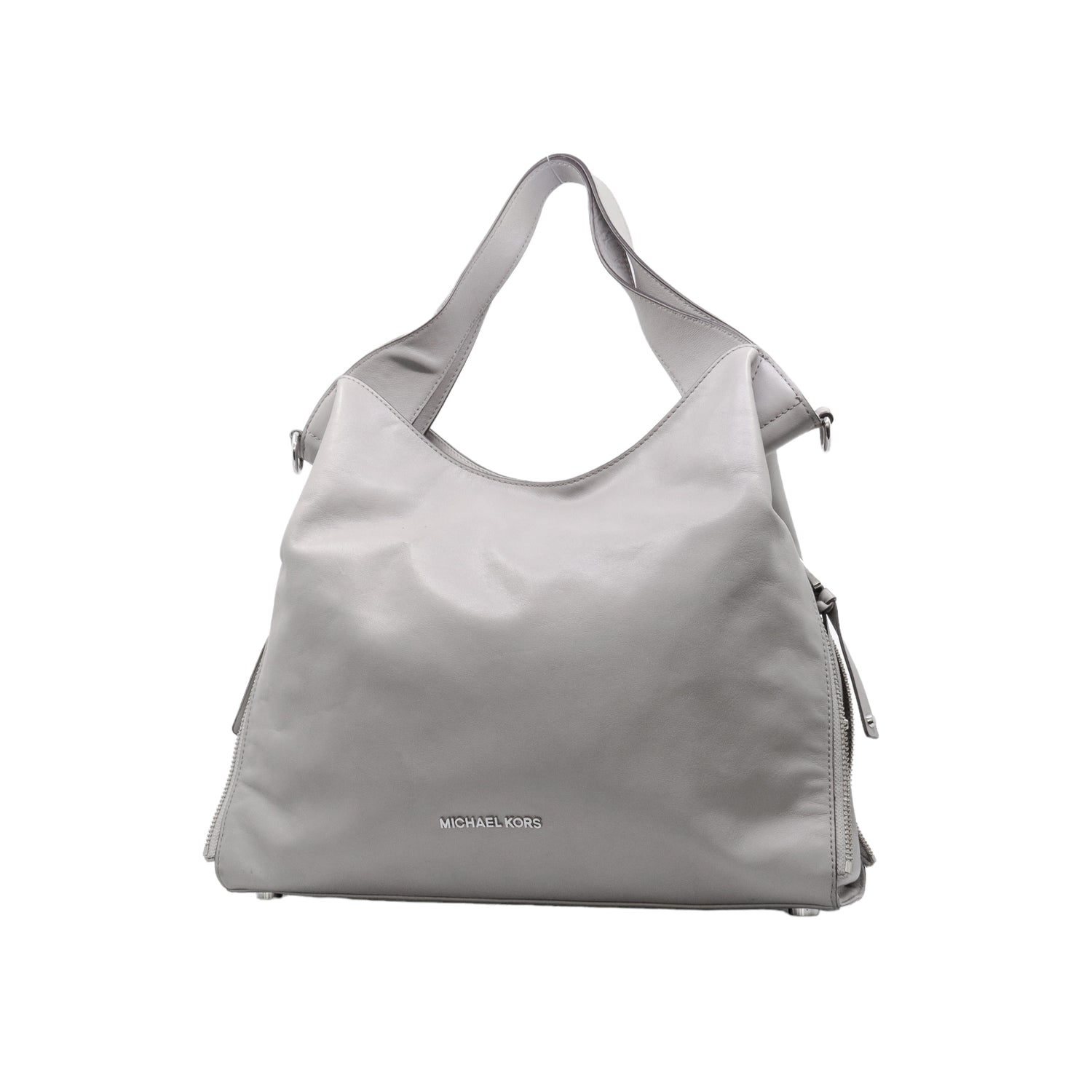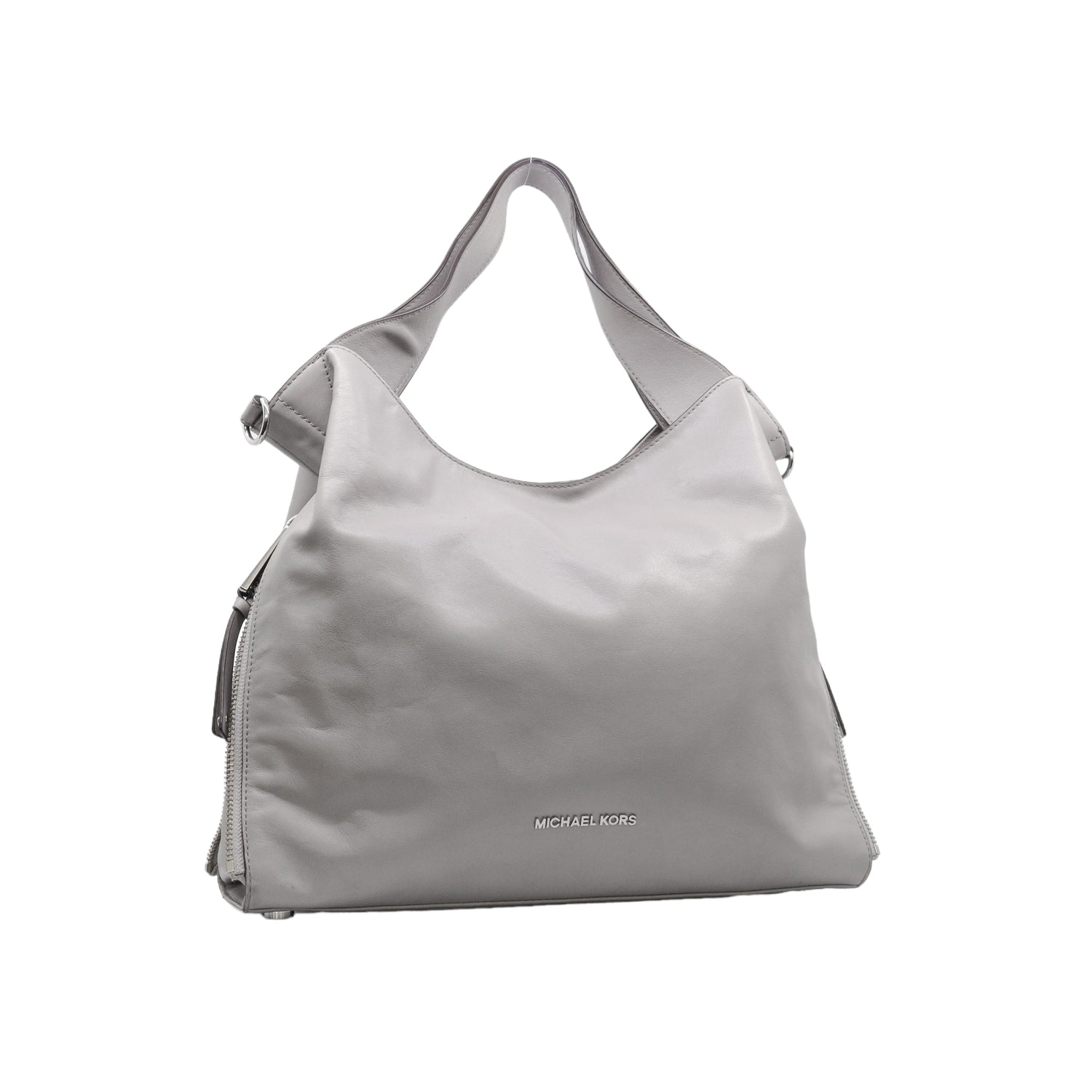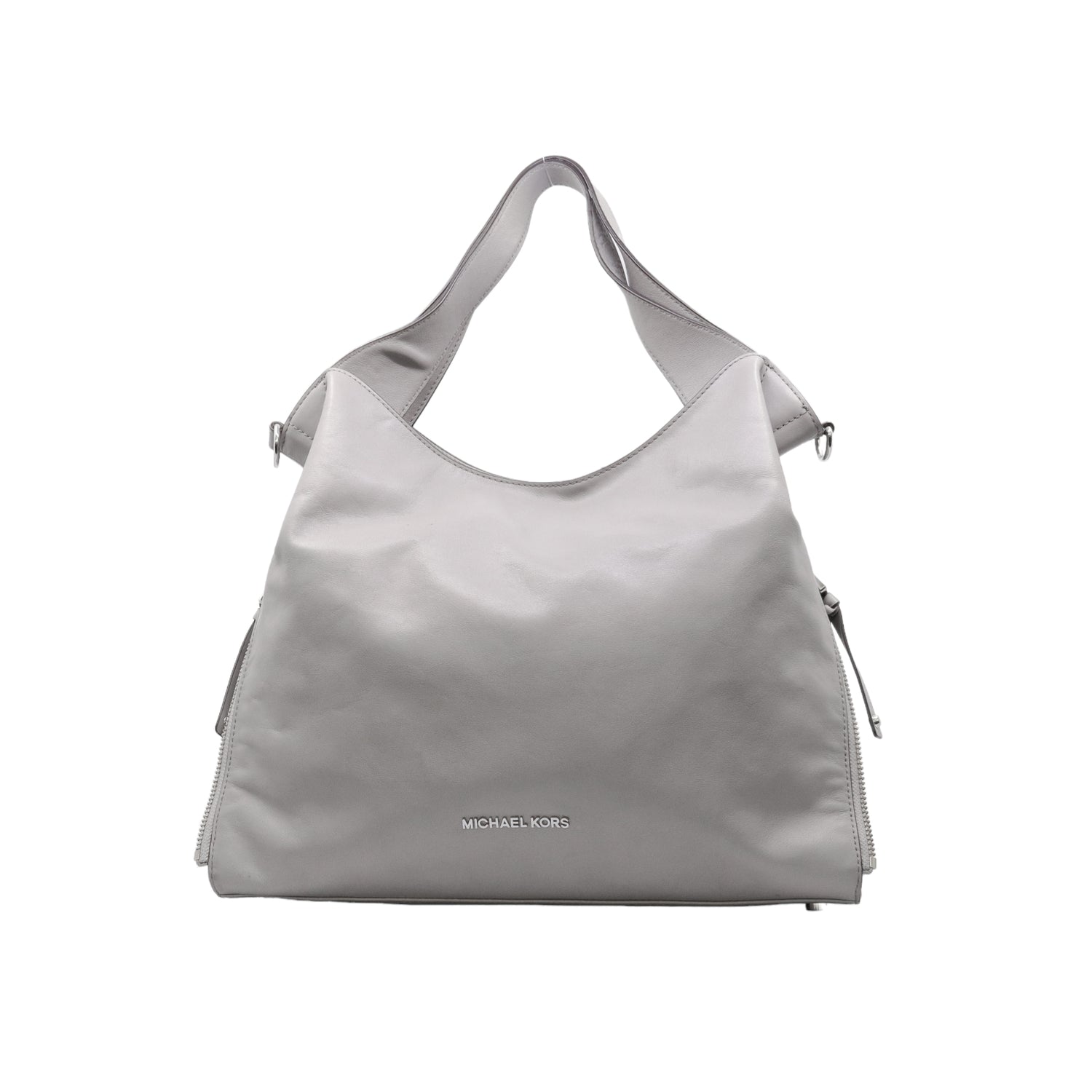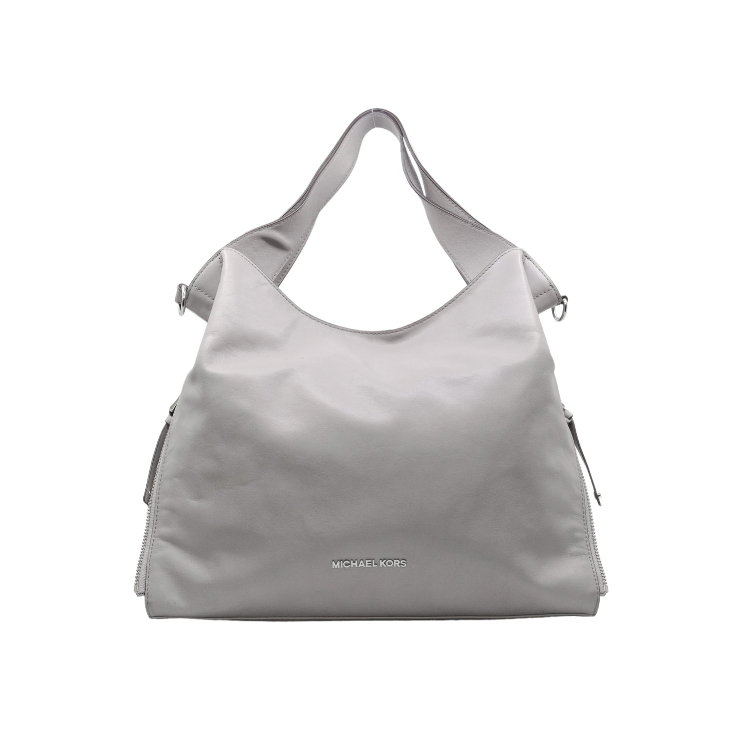Bolso Michael Kors confeccionado en piel de becerro color gris, con interior y compartimentos en nylon, 2 asas y strap desmontable, con cierre de botón magnético, mancha en parte posterior y detalles al frente.