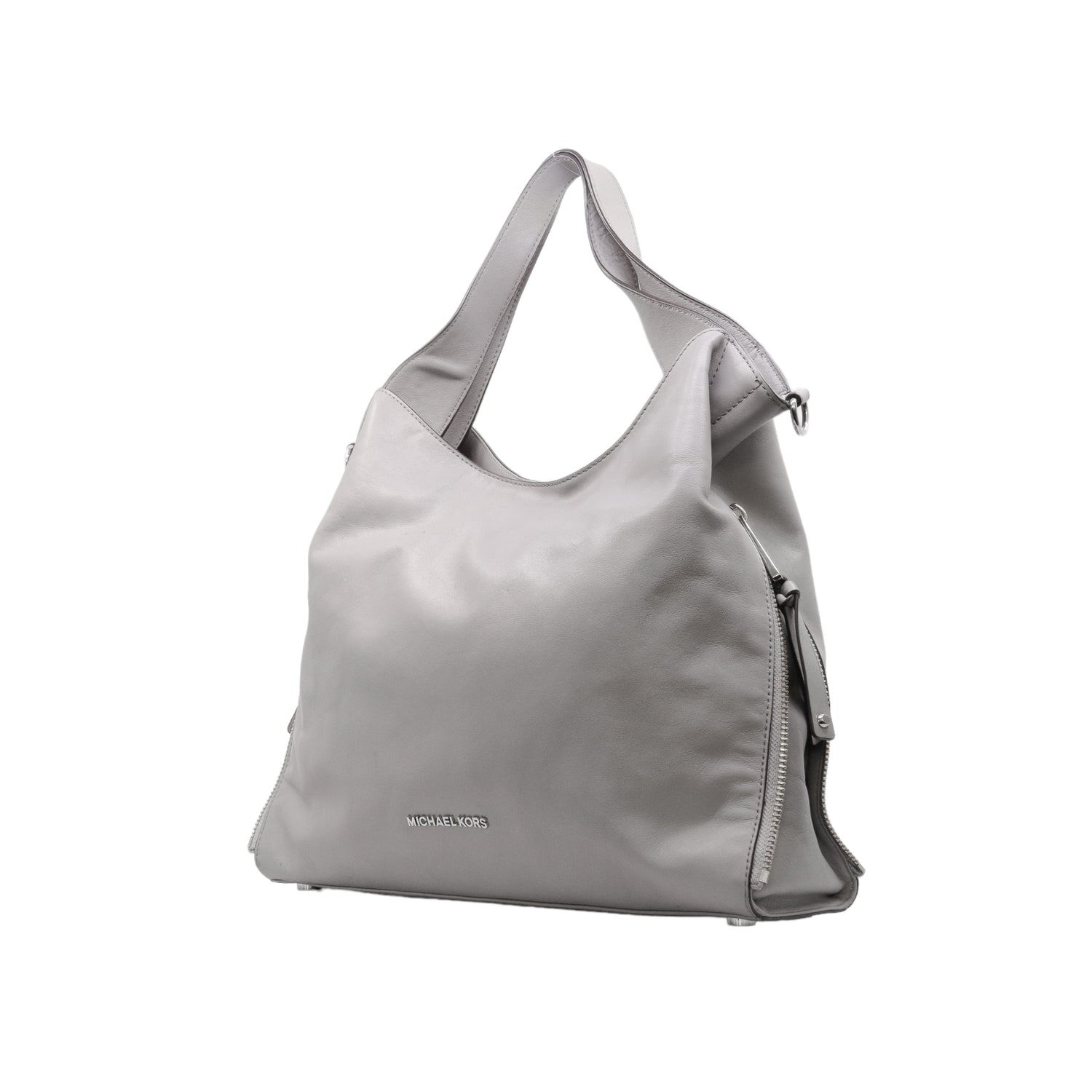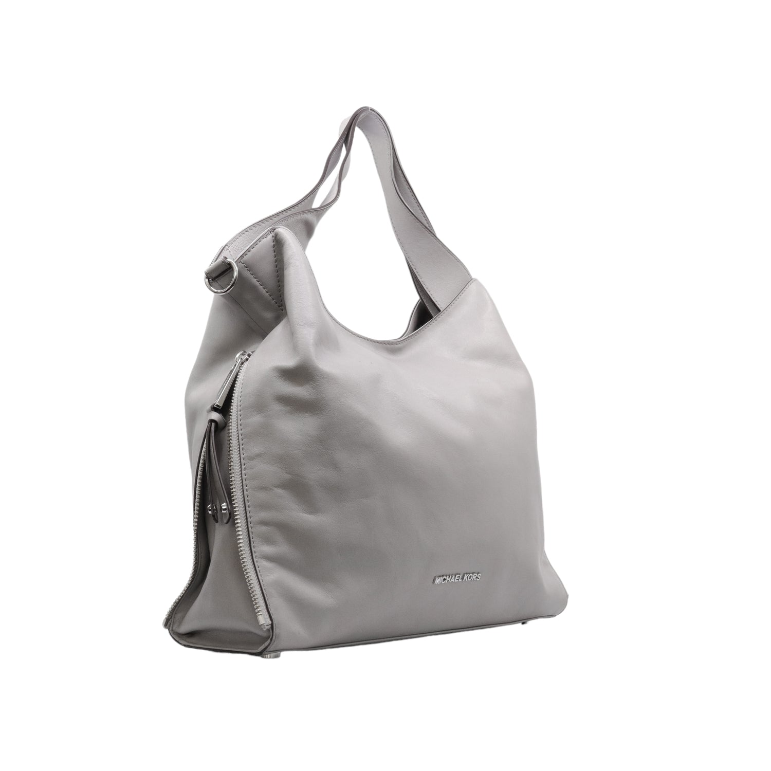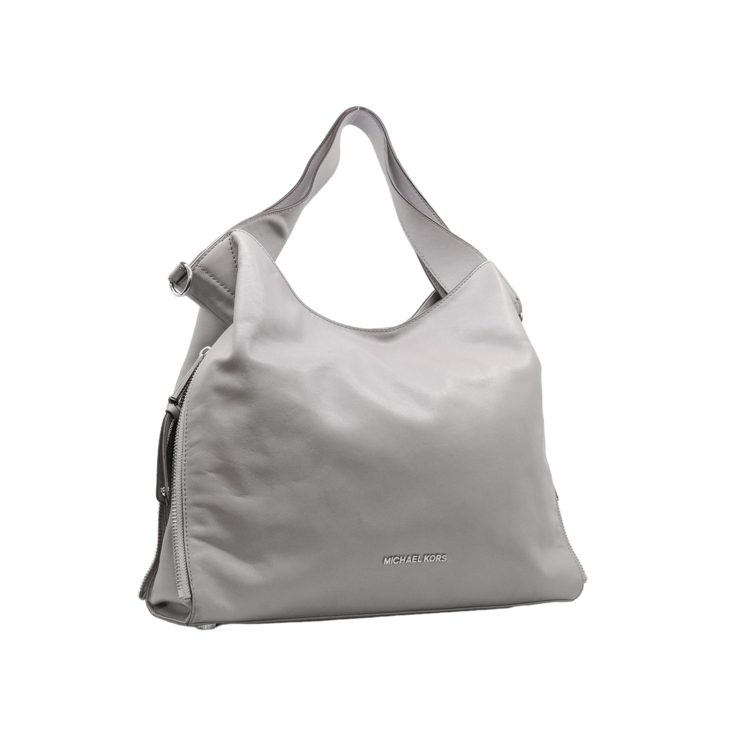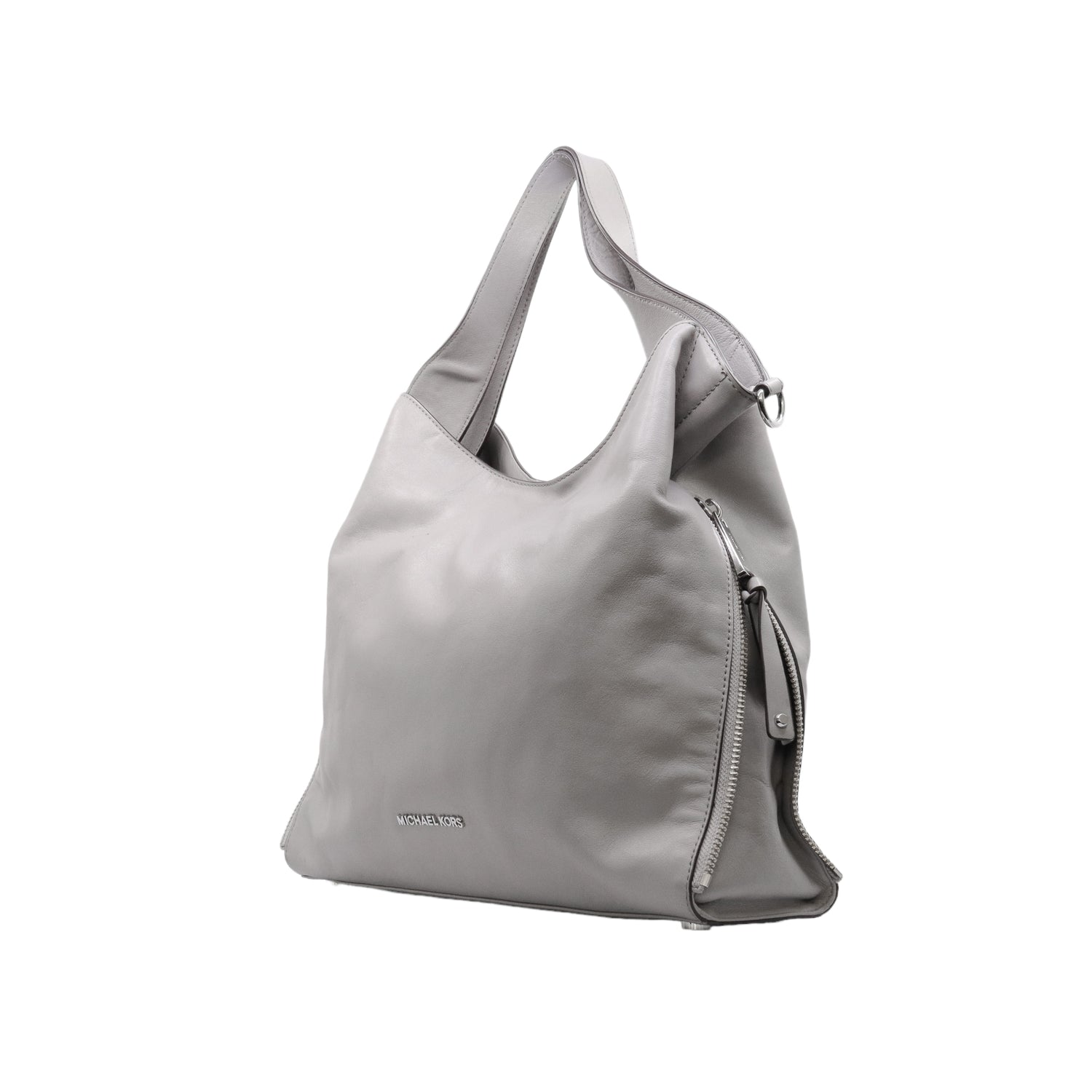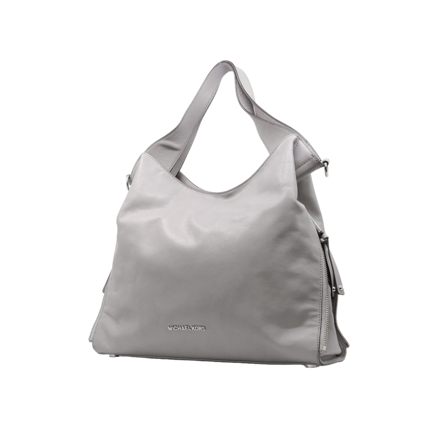 Bolso Michael Kors confeccionado en piel de becerro color gris, con interior y compartimentos en nylon, 2 asas y strap desmontable, con cierre de botón magnético, mancha en parte posterior y detalles al frente.