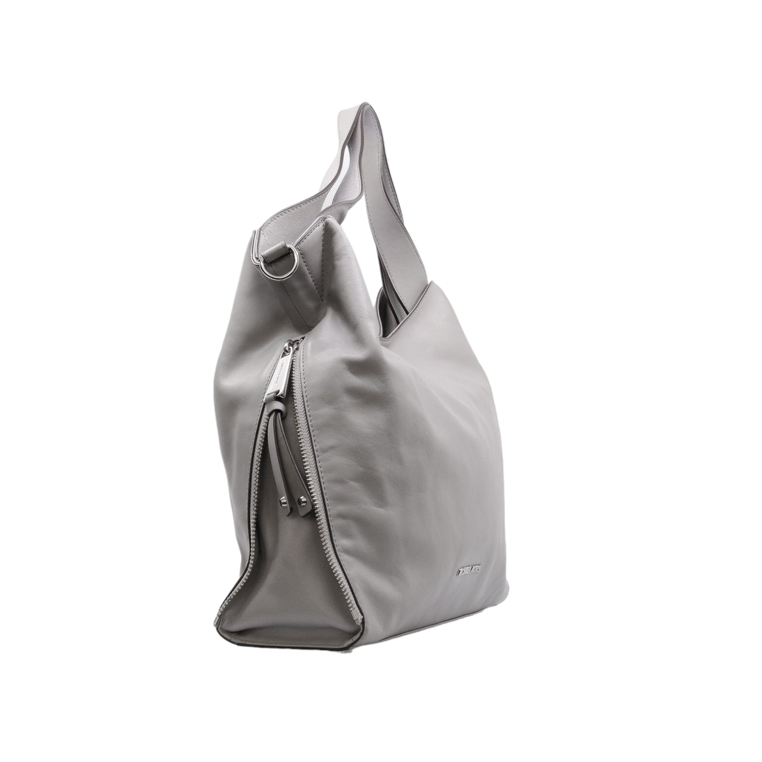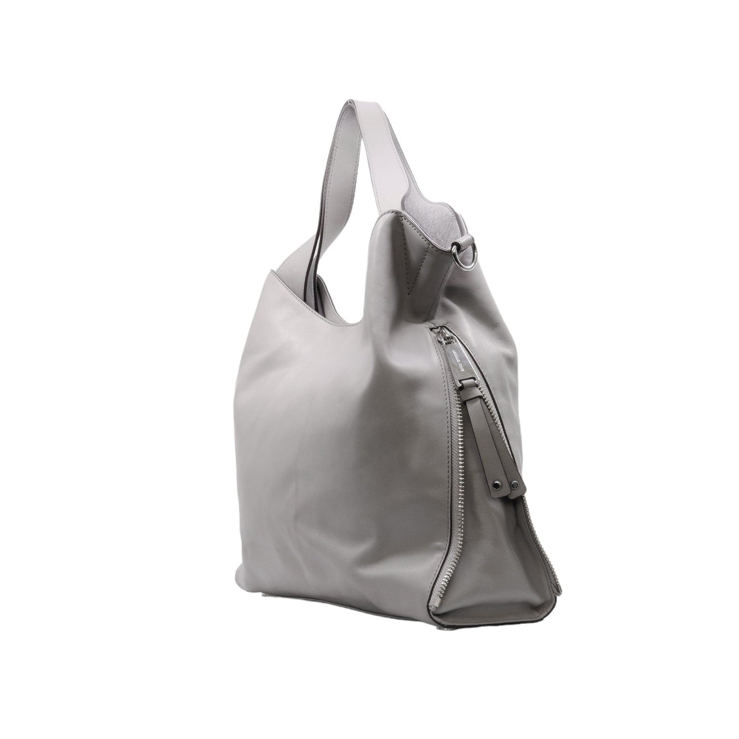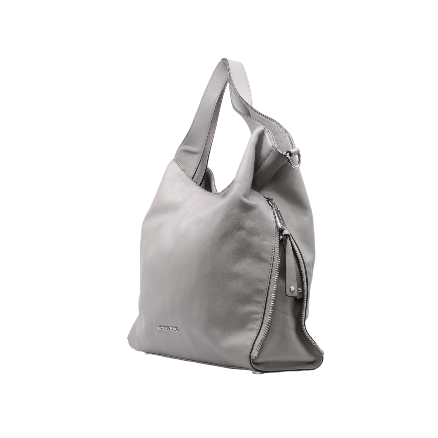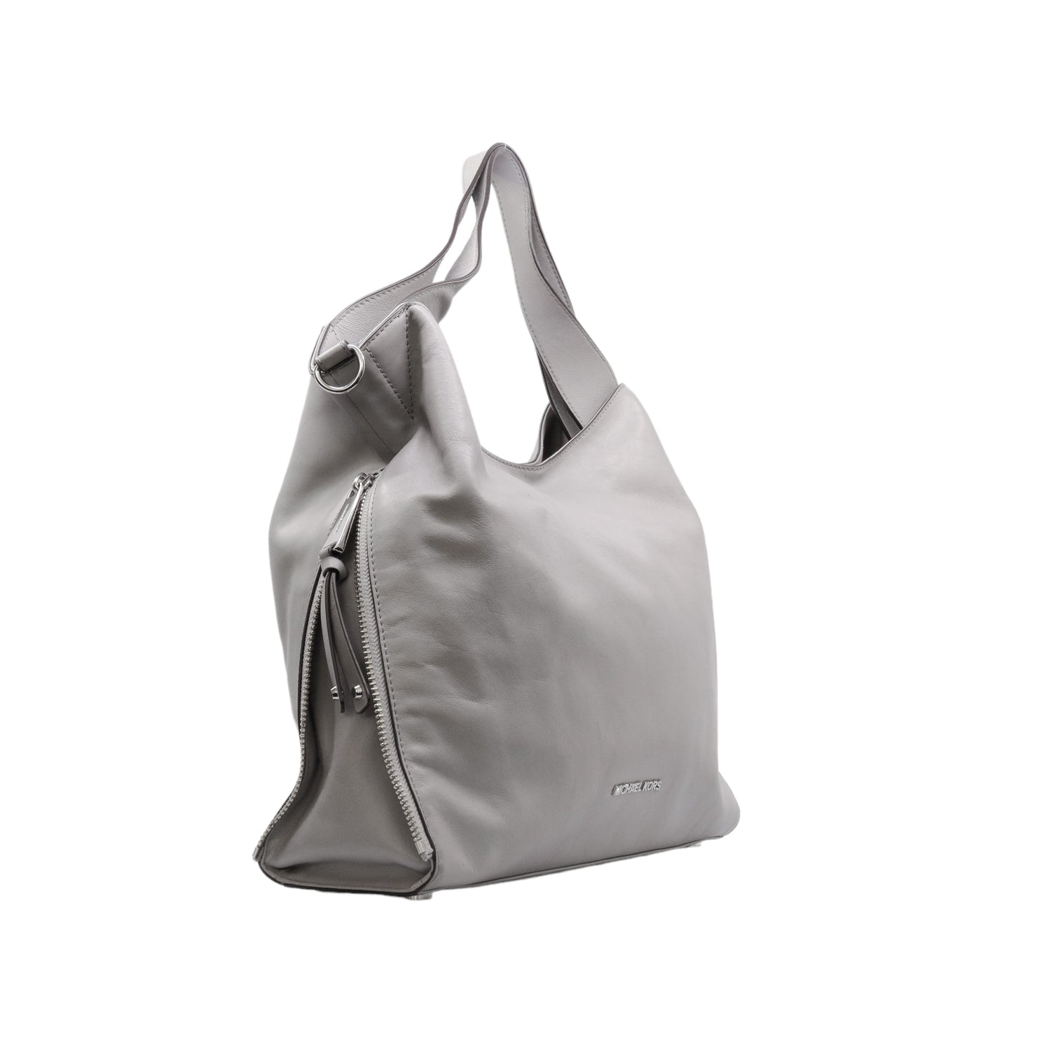 Bolso Michael Kors confeccionado en piel de becerro color gris, con interior y compartimentos en nylon, 2 asas y strap desmontable, con cierre de botón magnético, mancha en parte posterior y detalles al frente.