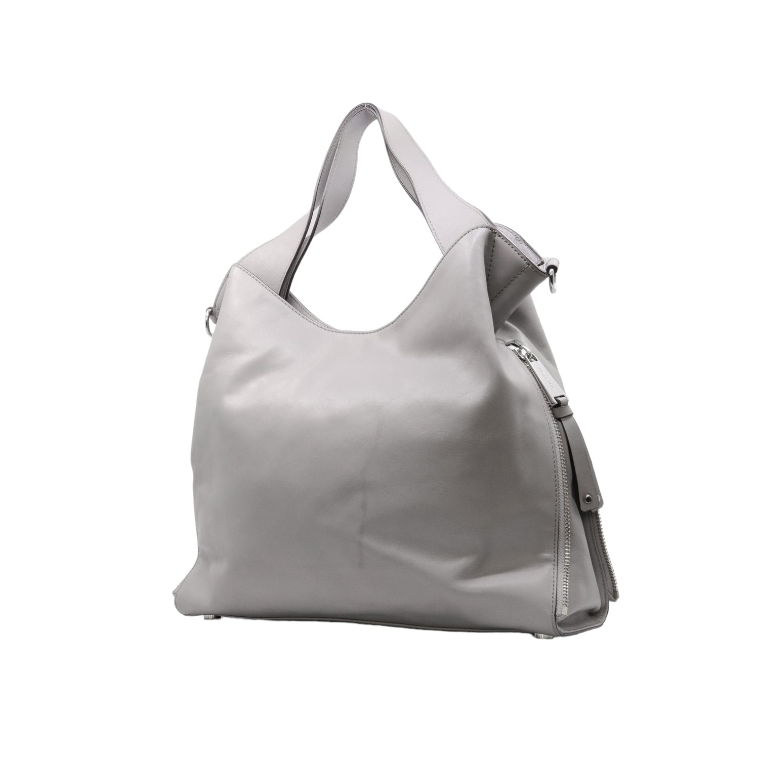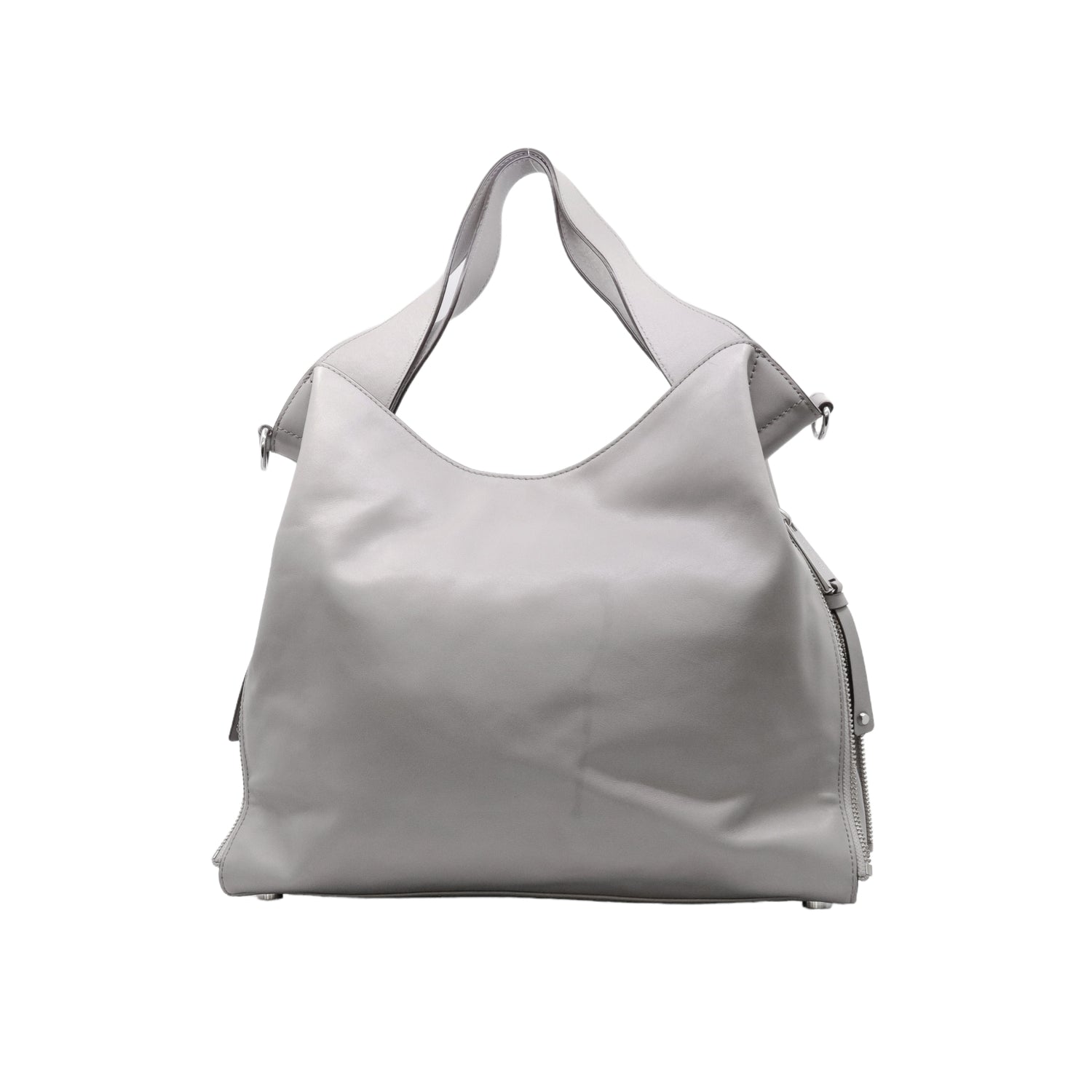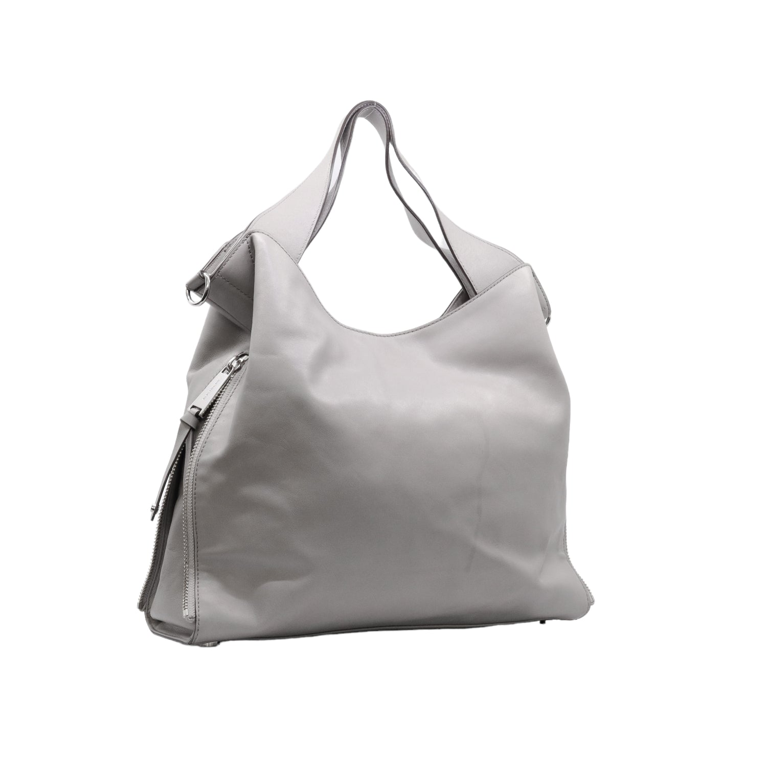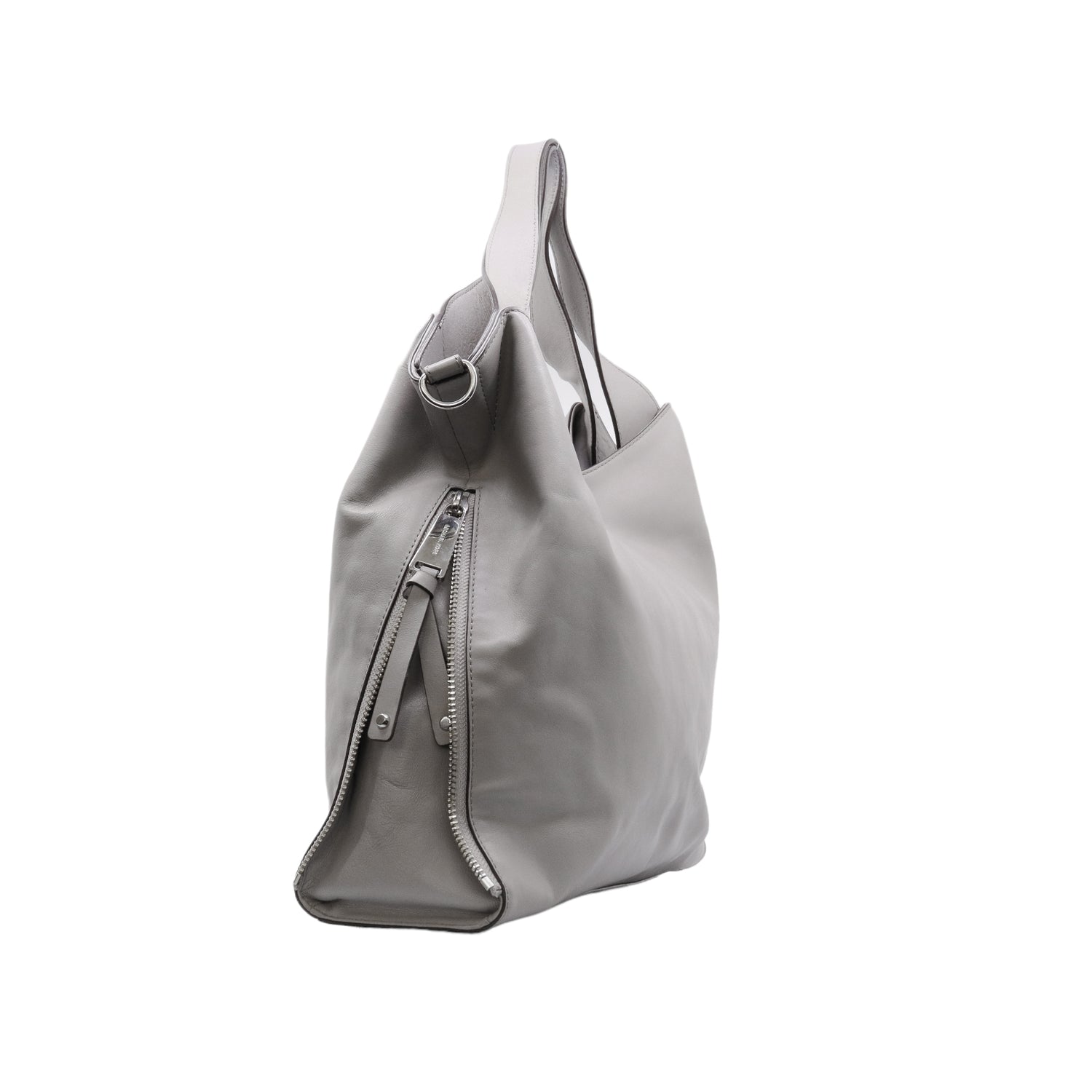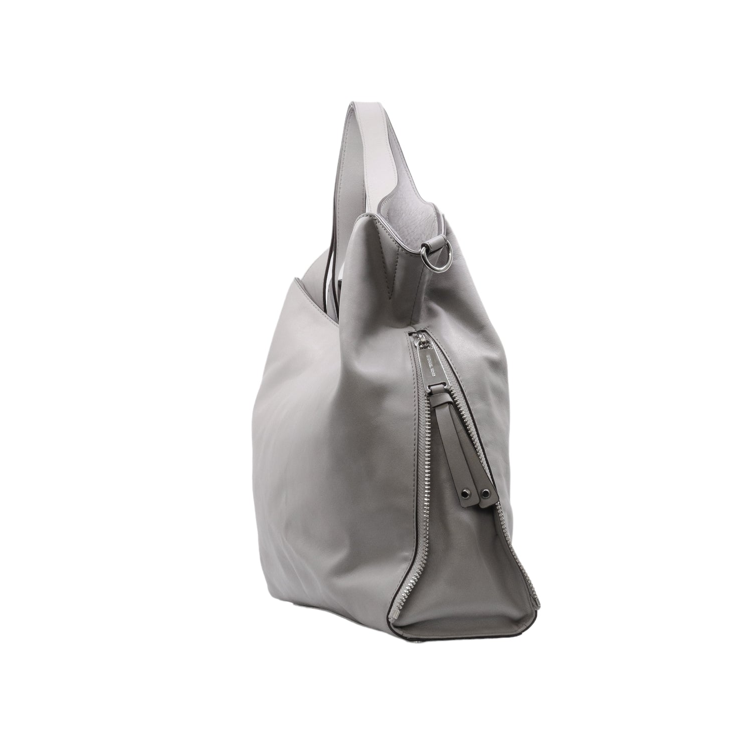 Bolso Michael Kors confeccionado en piel de becerro color gris, con interior y compartimentos en nylon, 2 asas y strap desmontable, con cierre de botón magnético, mancha en parte posterior y detalles al frente.
