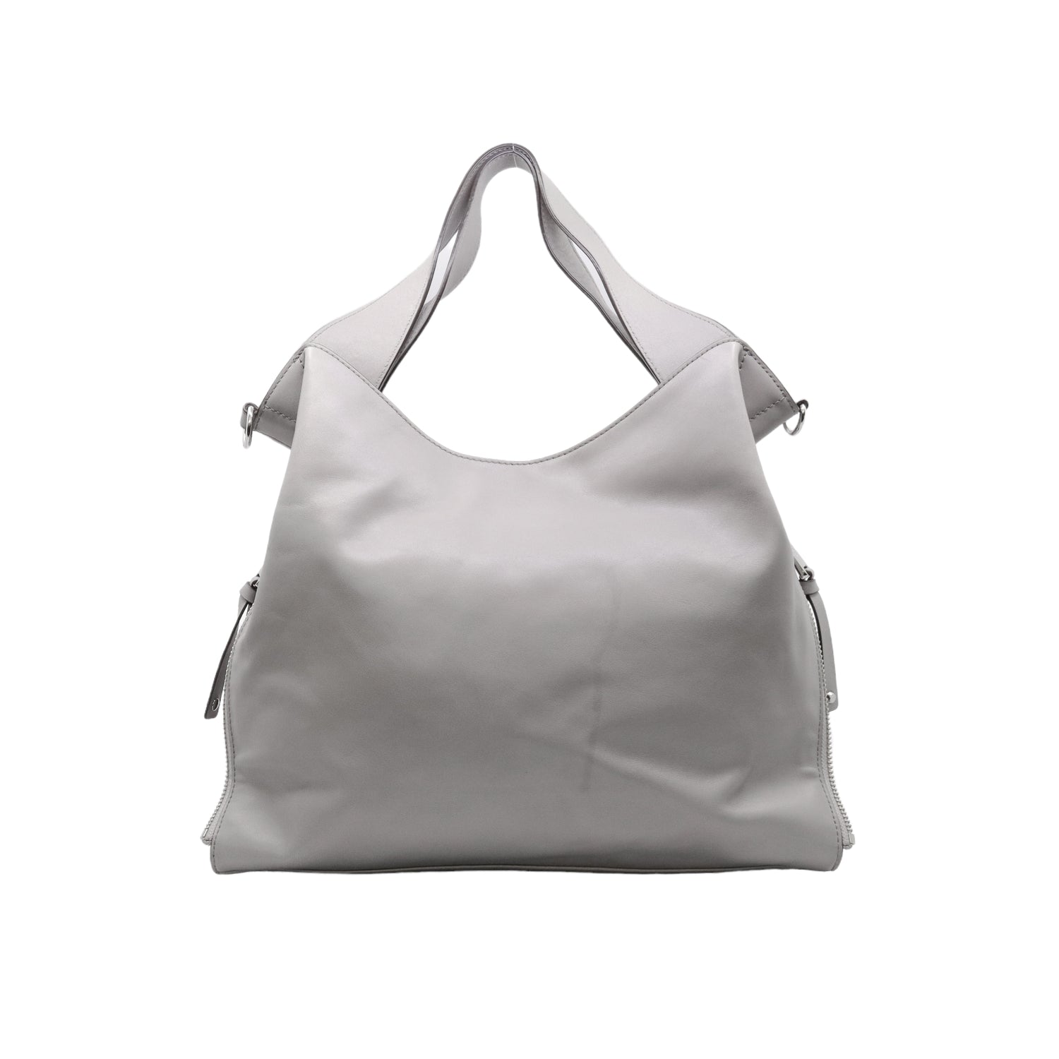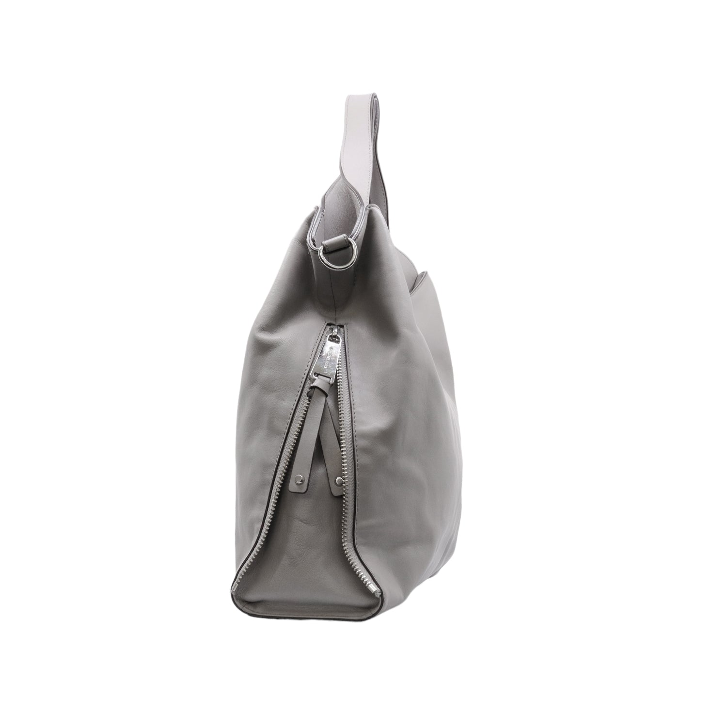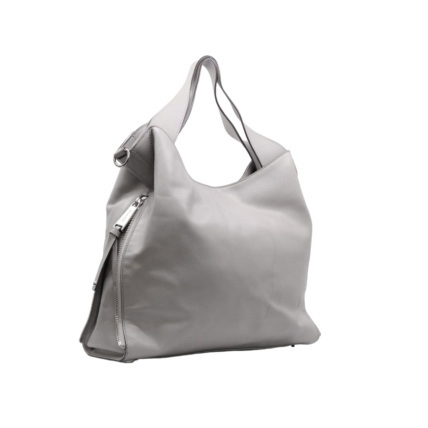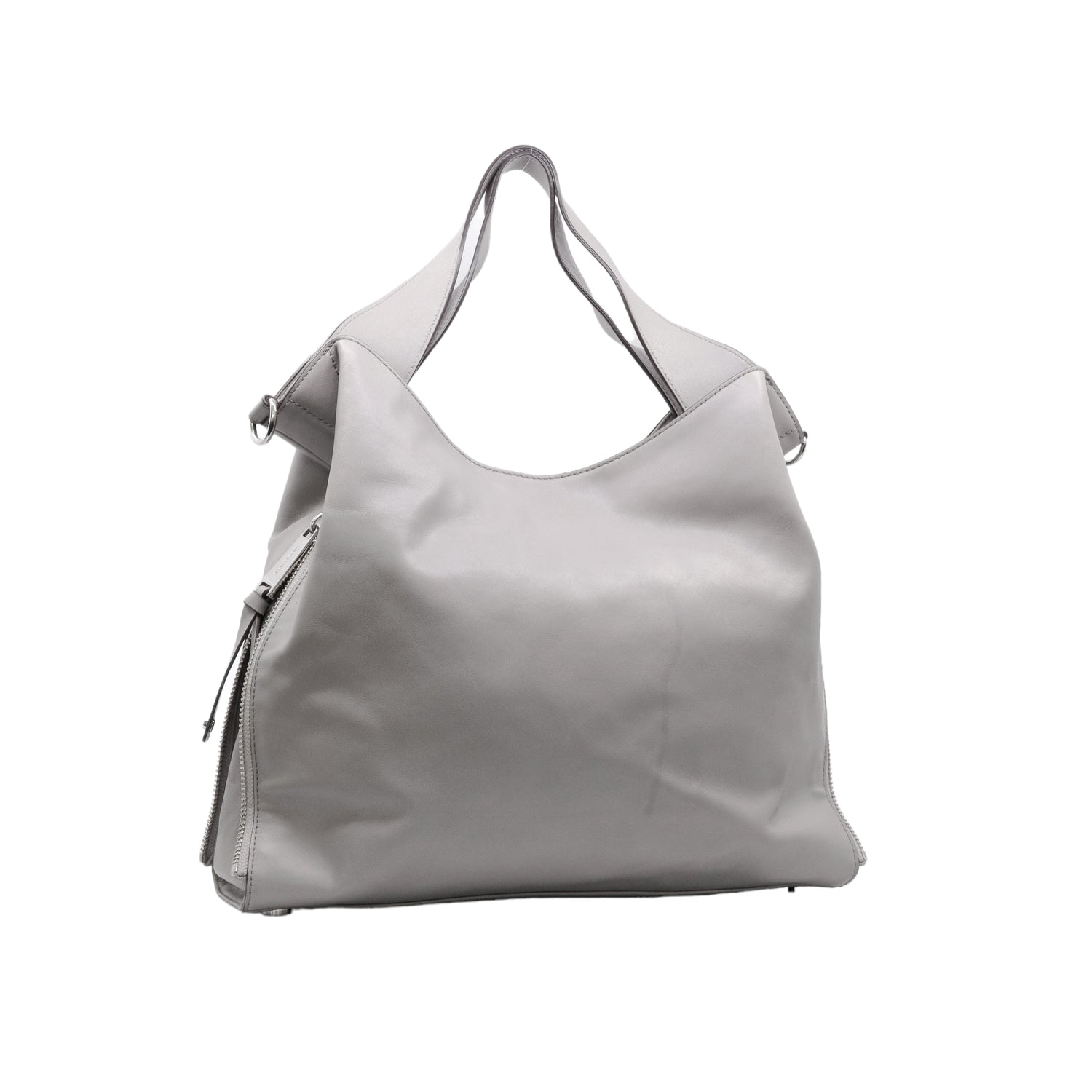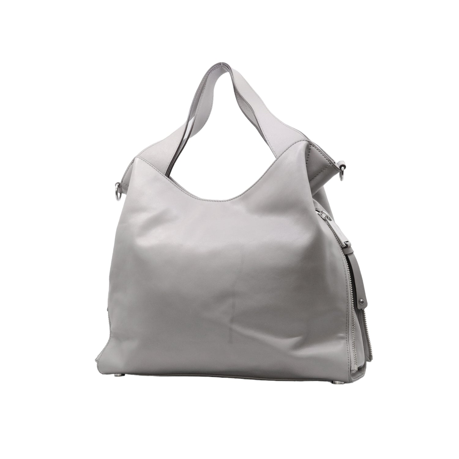 Bolso Michael Kors confeccionado en piel de becerro color gris, con interior y compartimentos en nylon, 2 asas y strap desmontable, con cierre de botón magnético, mancha en parte posterior y detalles al frente.