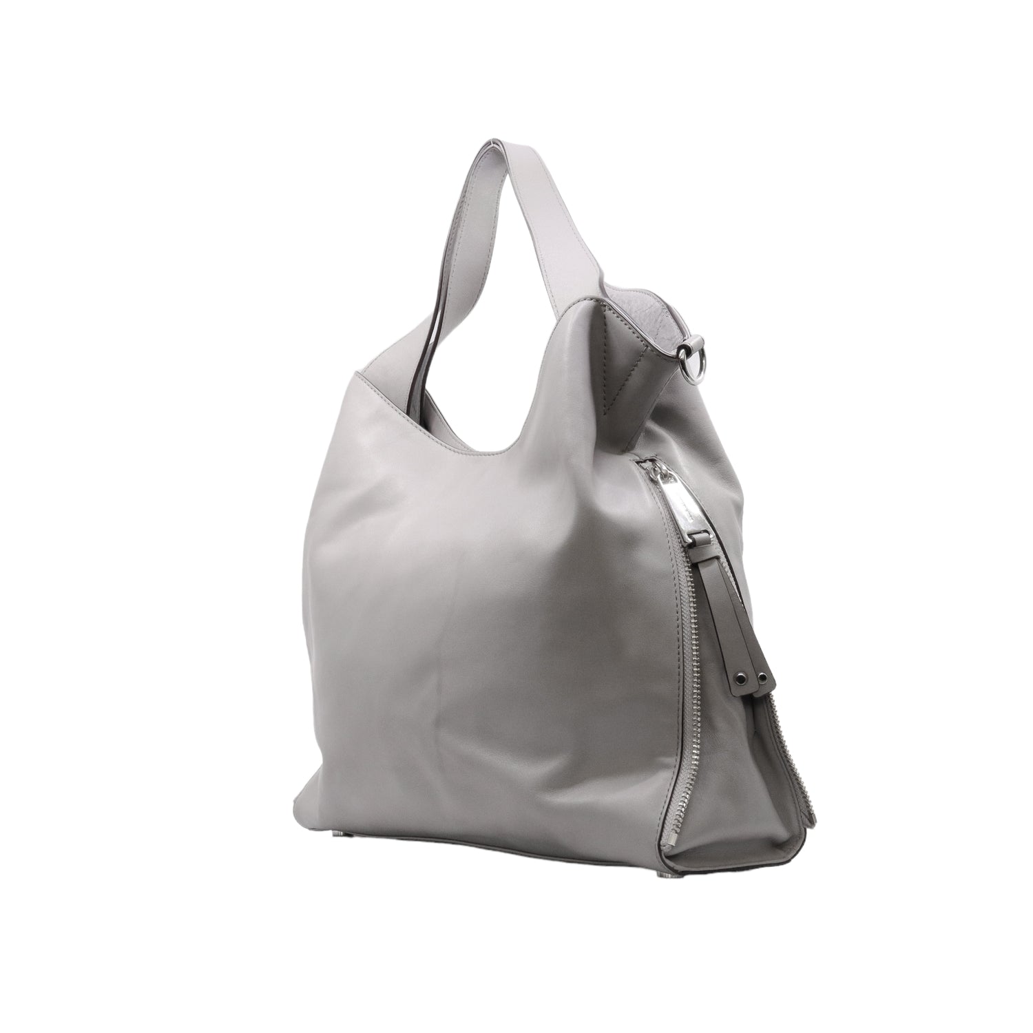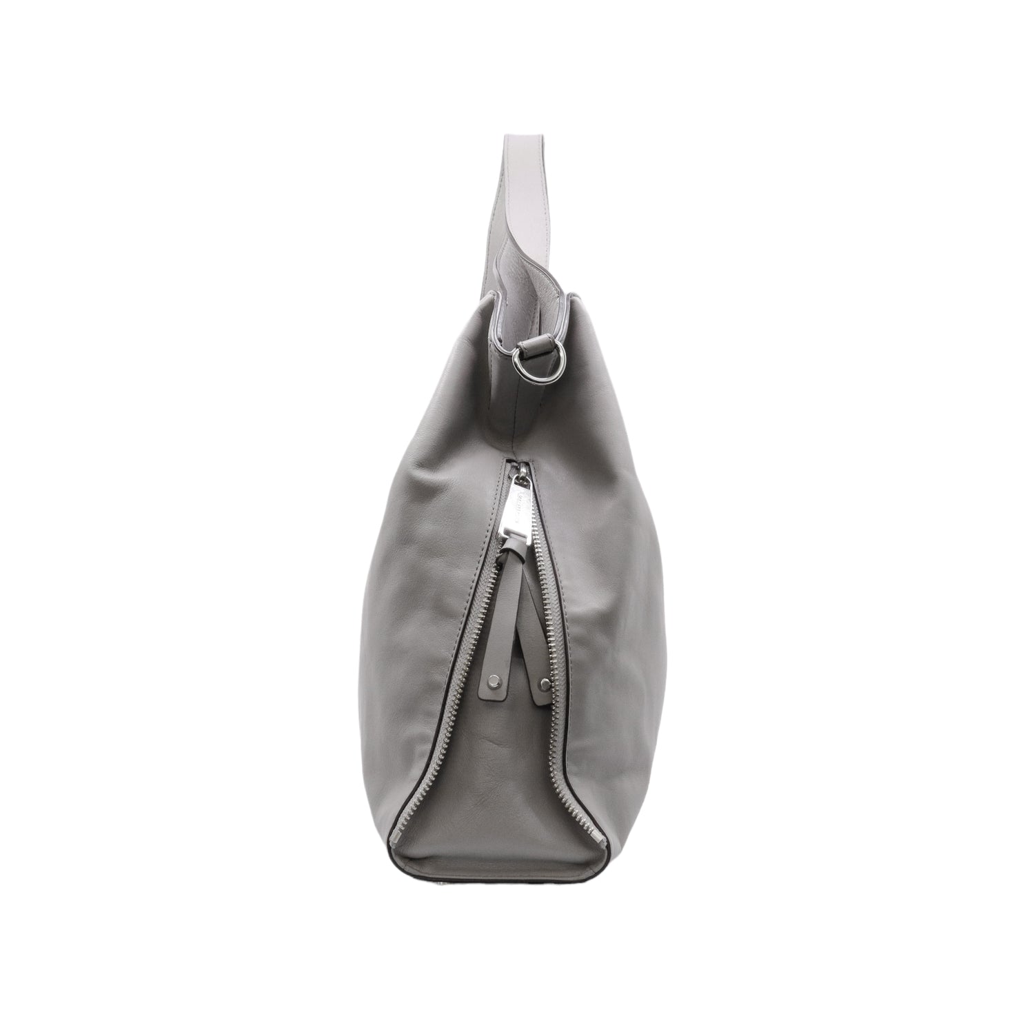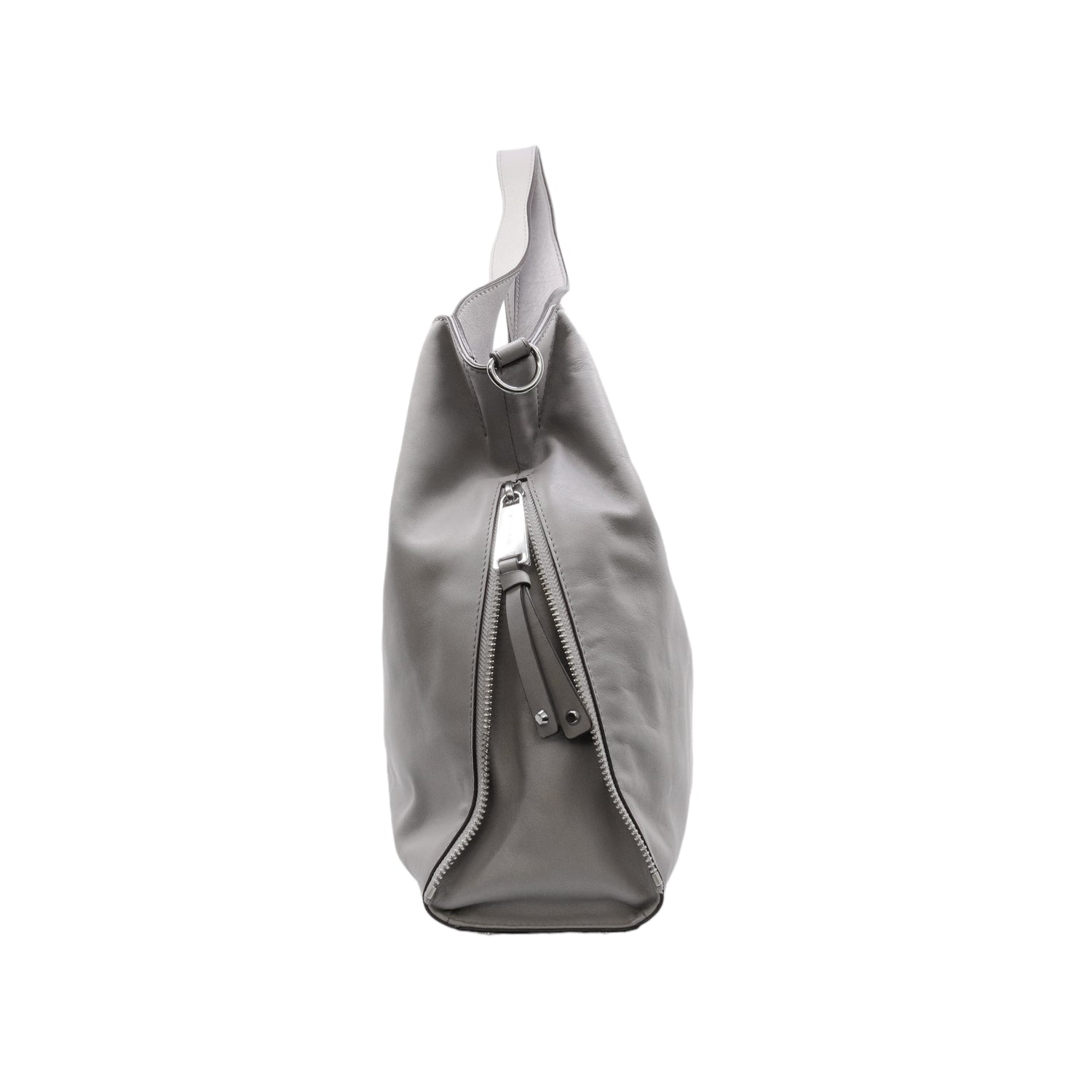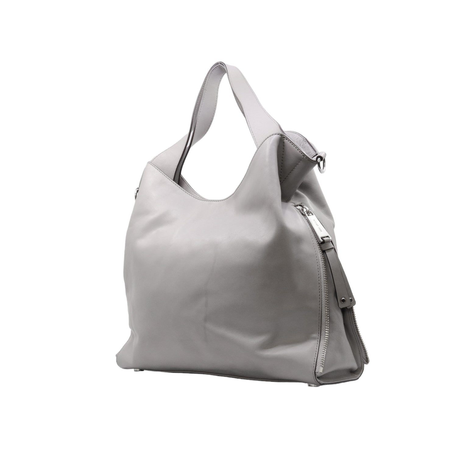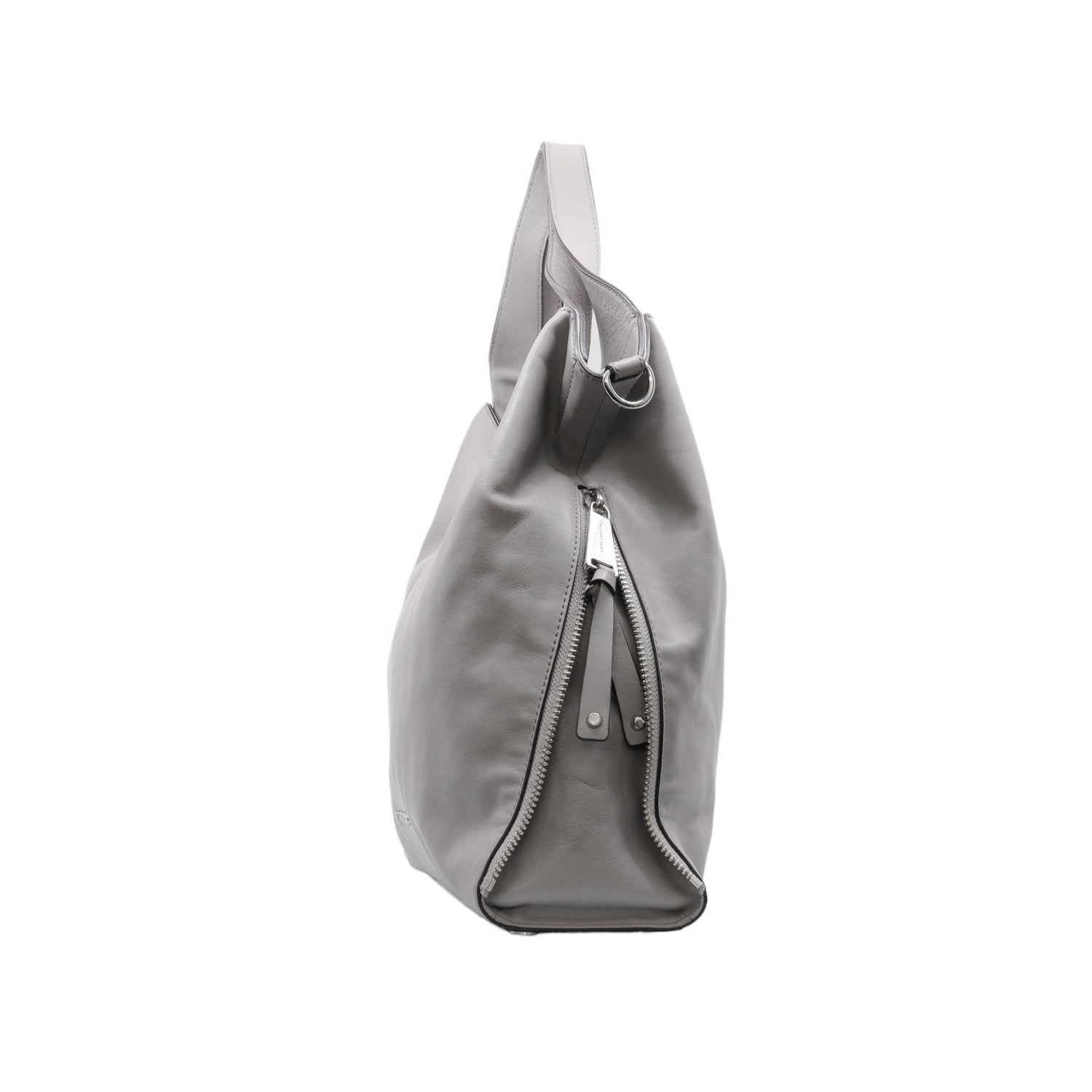 Bolso Michael Kors confeccionado en piel de becerro color gris, con interior y compartimentos en nylon, 2 asas y strap desmontable, con cierre de botón magnético, mancha en parte posterior y detalles al frente.