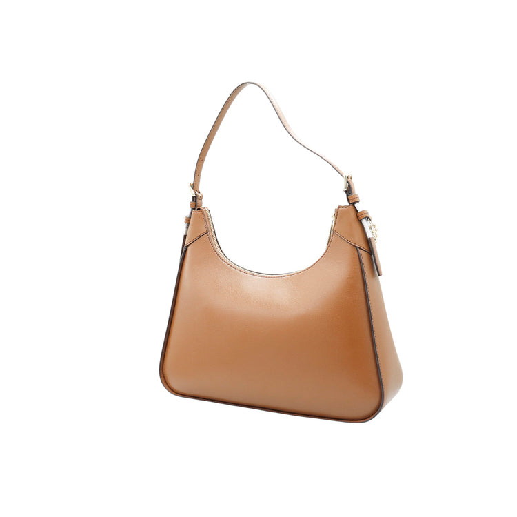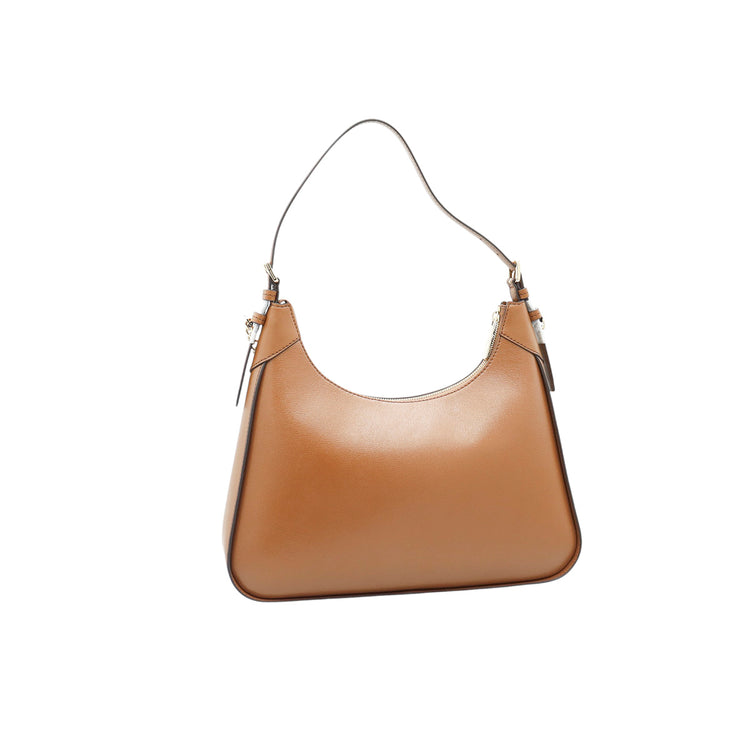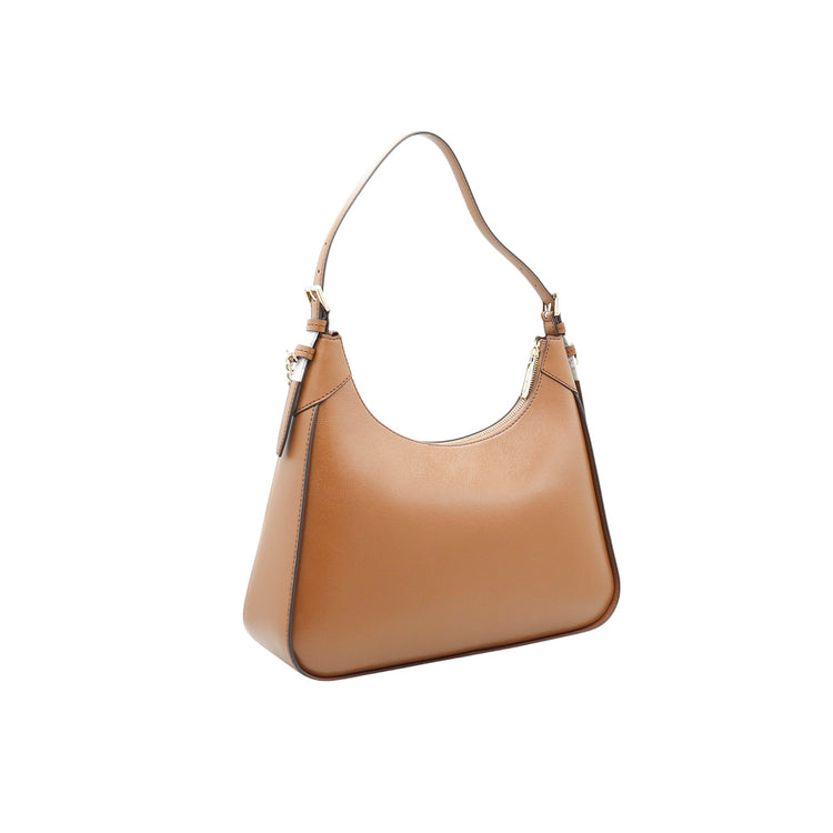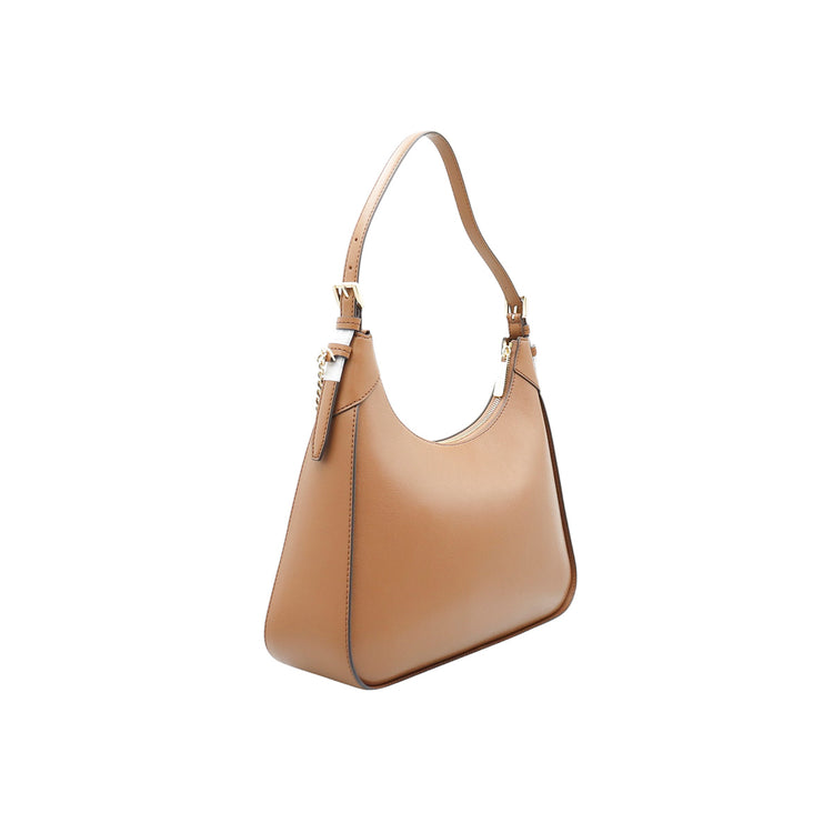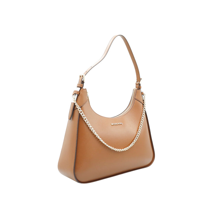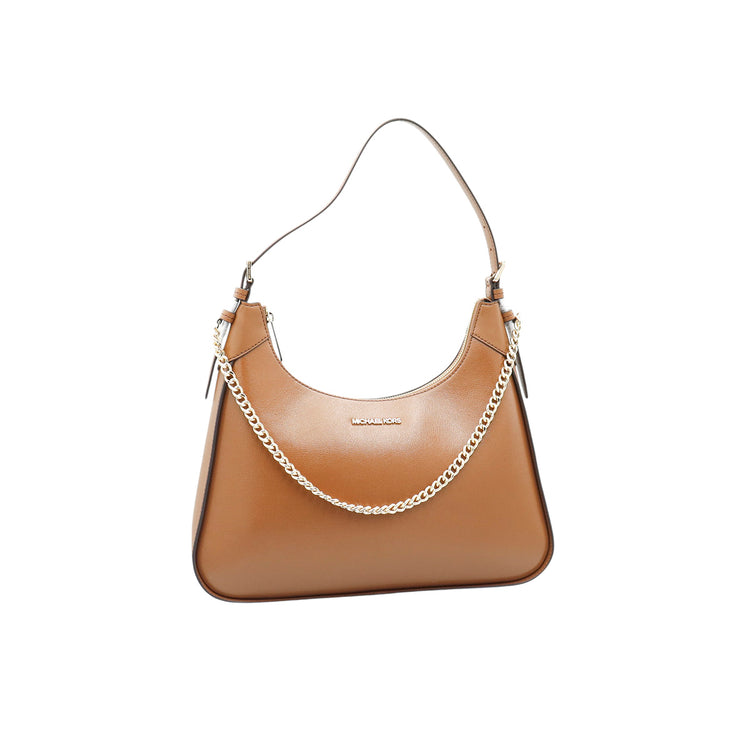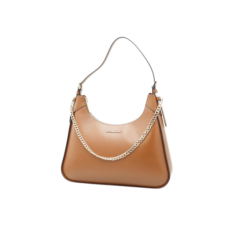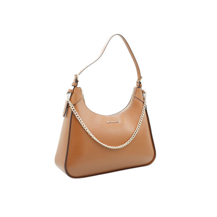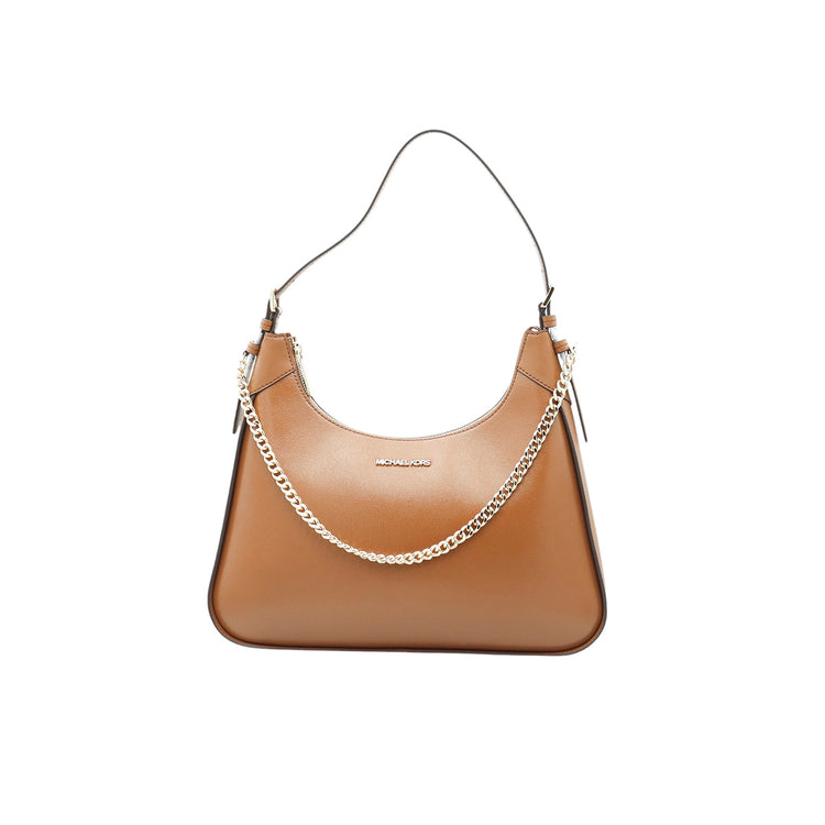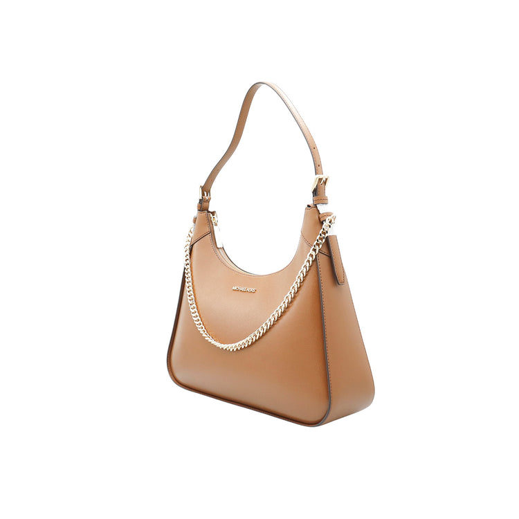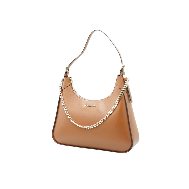 Bolso Michael Kors de la línea Wilma, confeccionado en piel color café caramelo, con cadena, cremallera y herrajes en color dorado, con asa superior en cuero flexible y ajustable, forro interno en color beige.