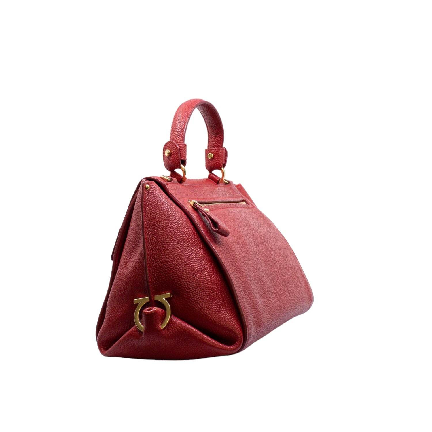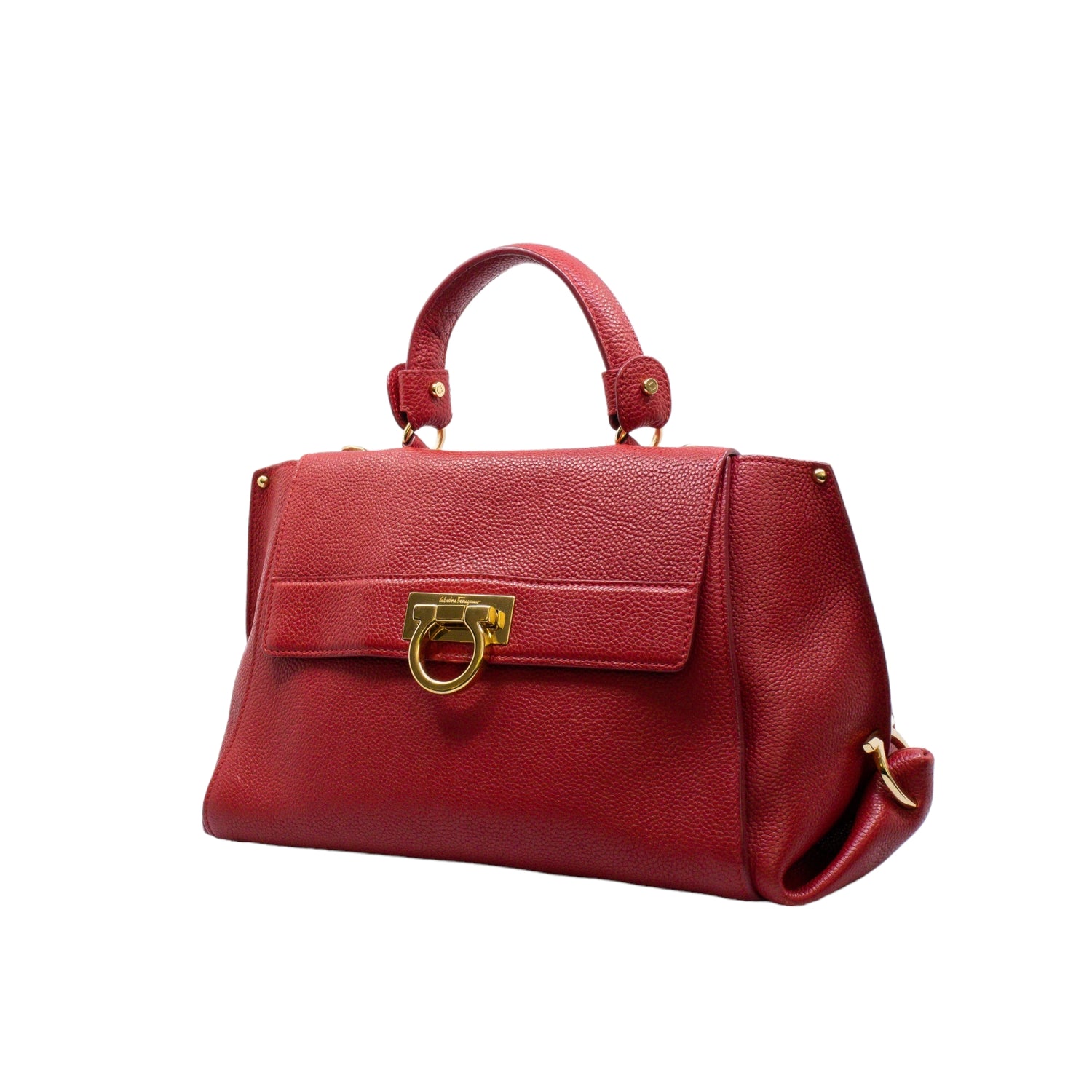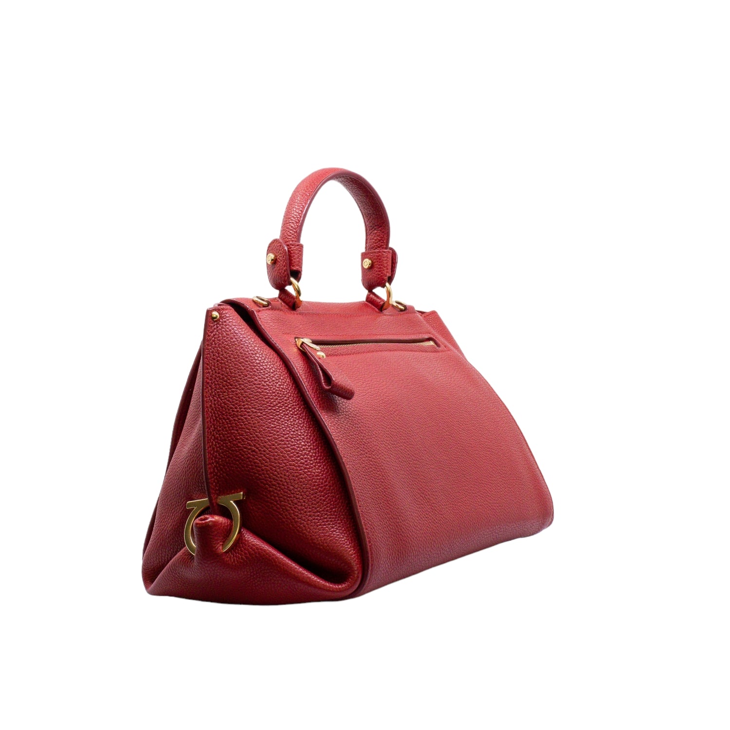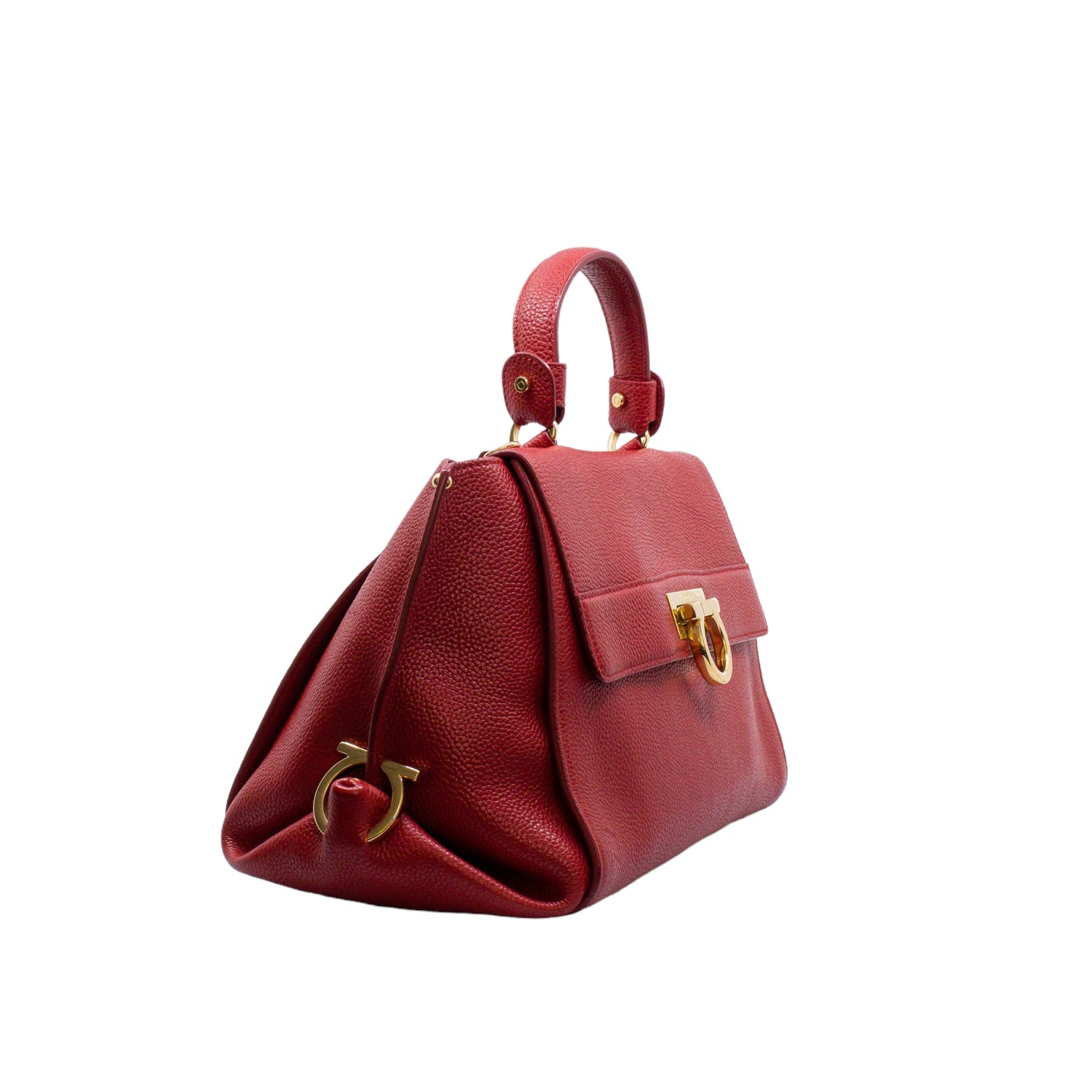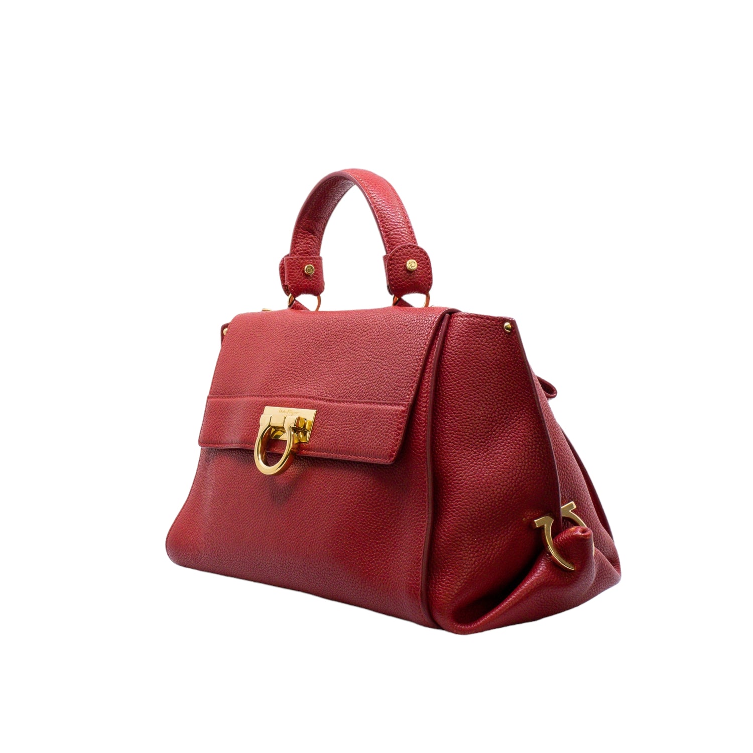 Bolso Salvatore Ferragamo modelo Sofía, confeccionado en piel de becerro color rojo, cuenta con correa extraíble en mismo material y color, y una sola asa superior, herrajes dorados, con 1 bolsillo trasero con cierre de cremallera y solapa con seguro tipo Gancini.