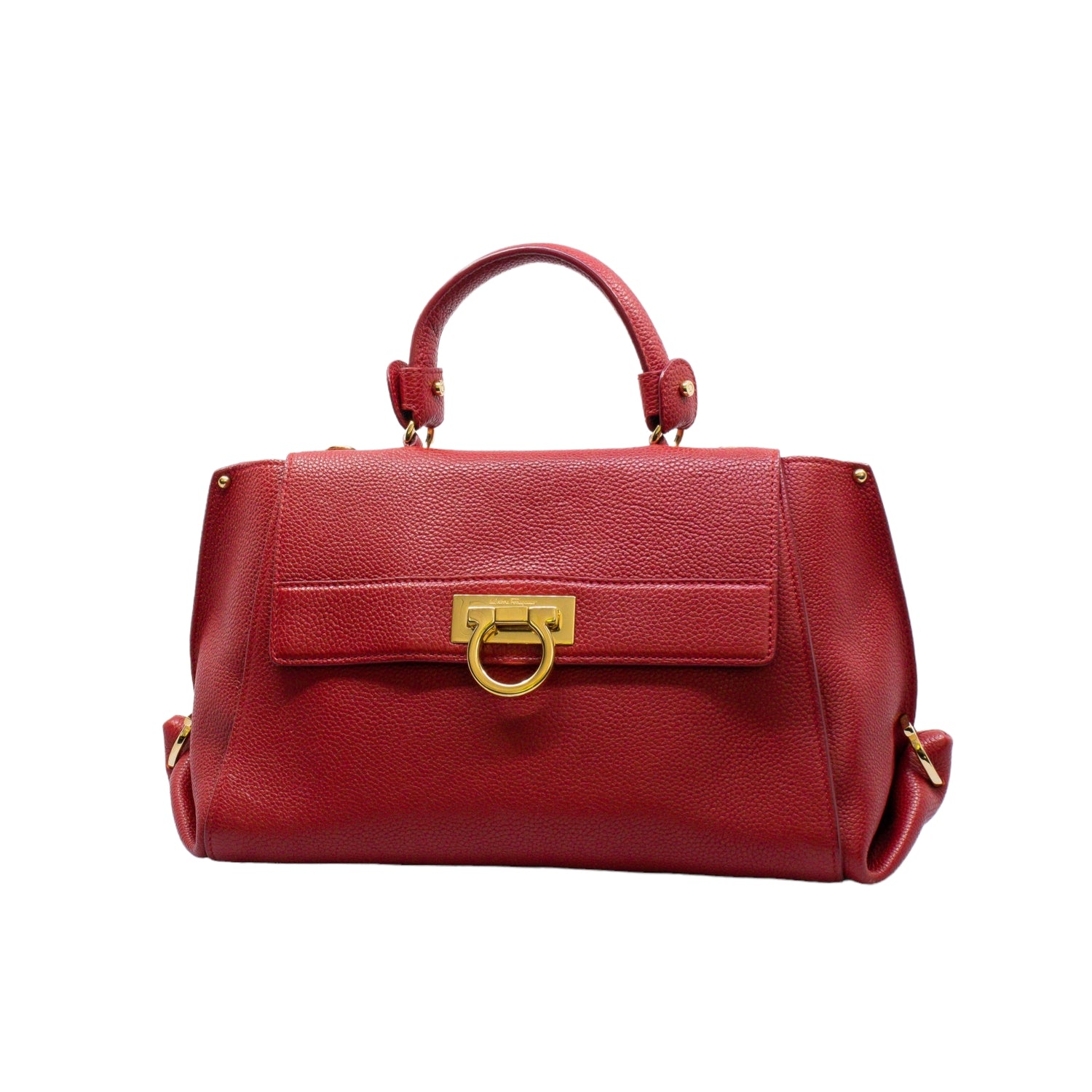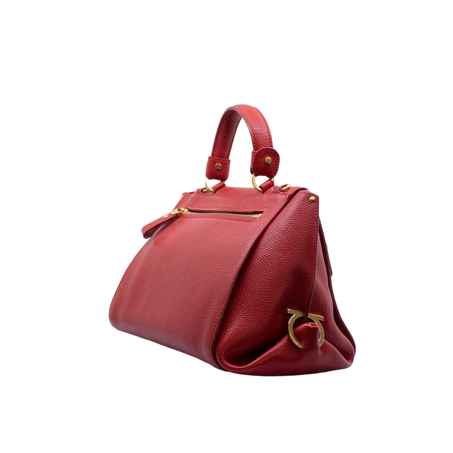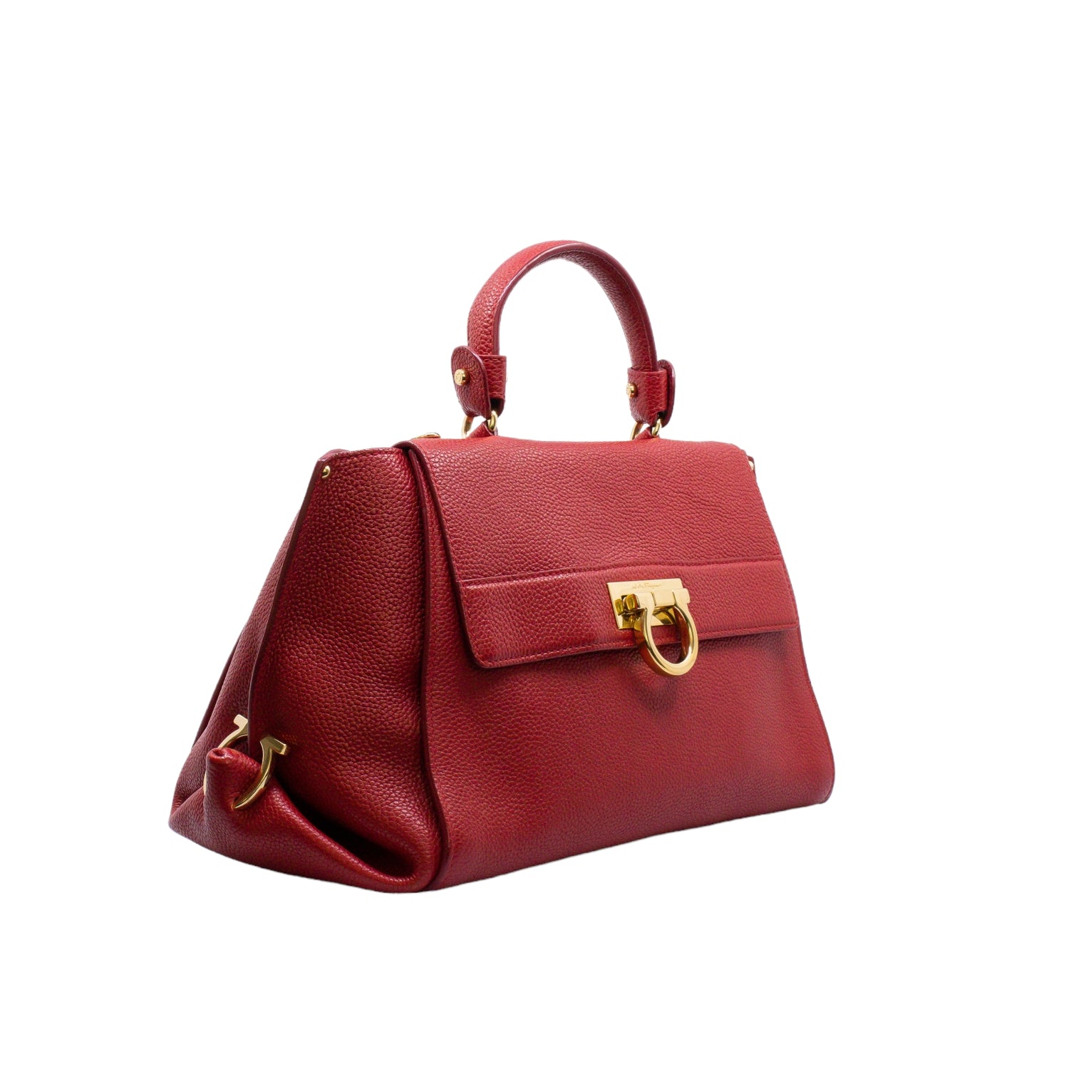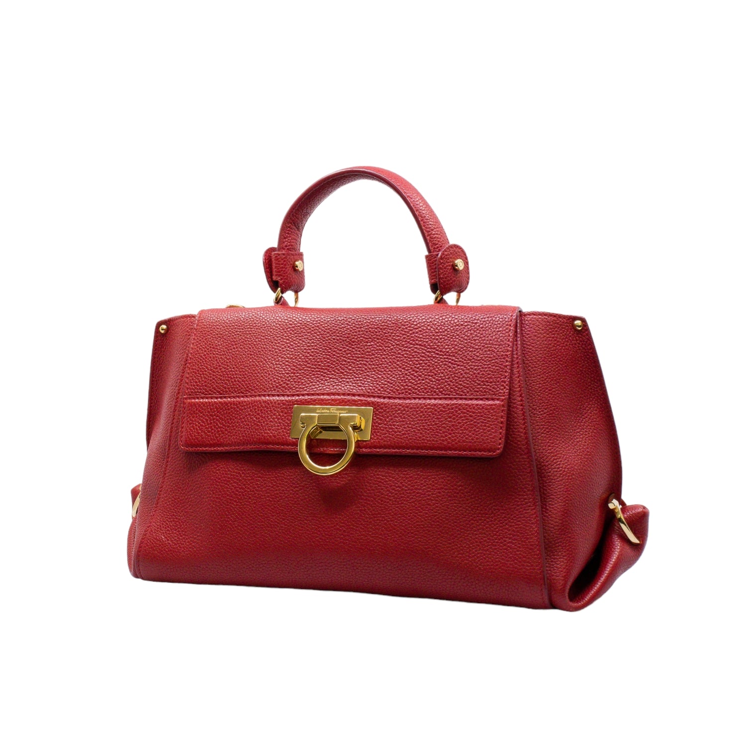 Bolso Salvatore Ferragamo modelo Sofía, confeccionado en piel de becerro color rojo, cuenta con correa extraíble en mismo material y color, y una sola asa superior, herrajes dorados, con 1 bolsillo trasero con cierre de cremallera y solapa con seguro tipo Gancini.