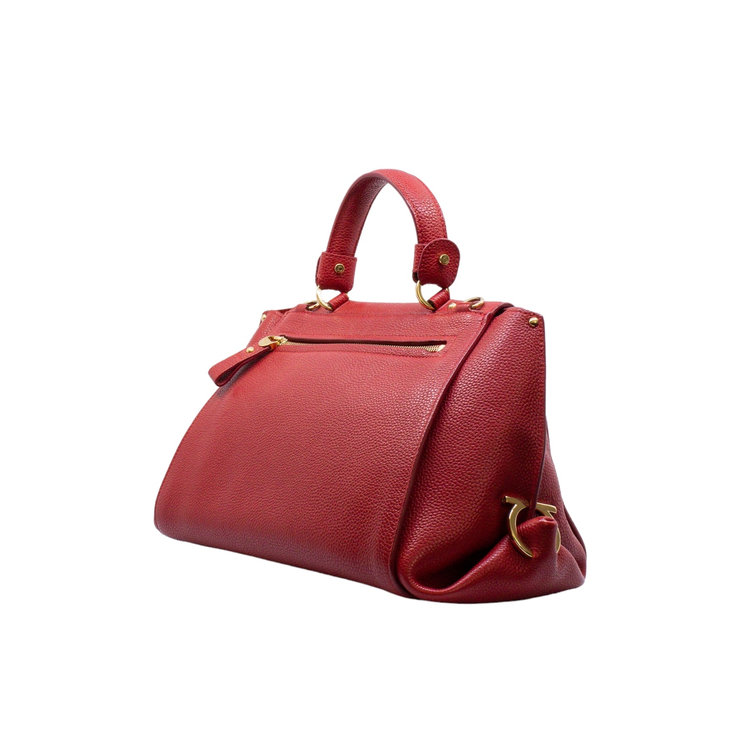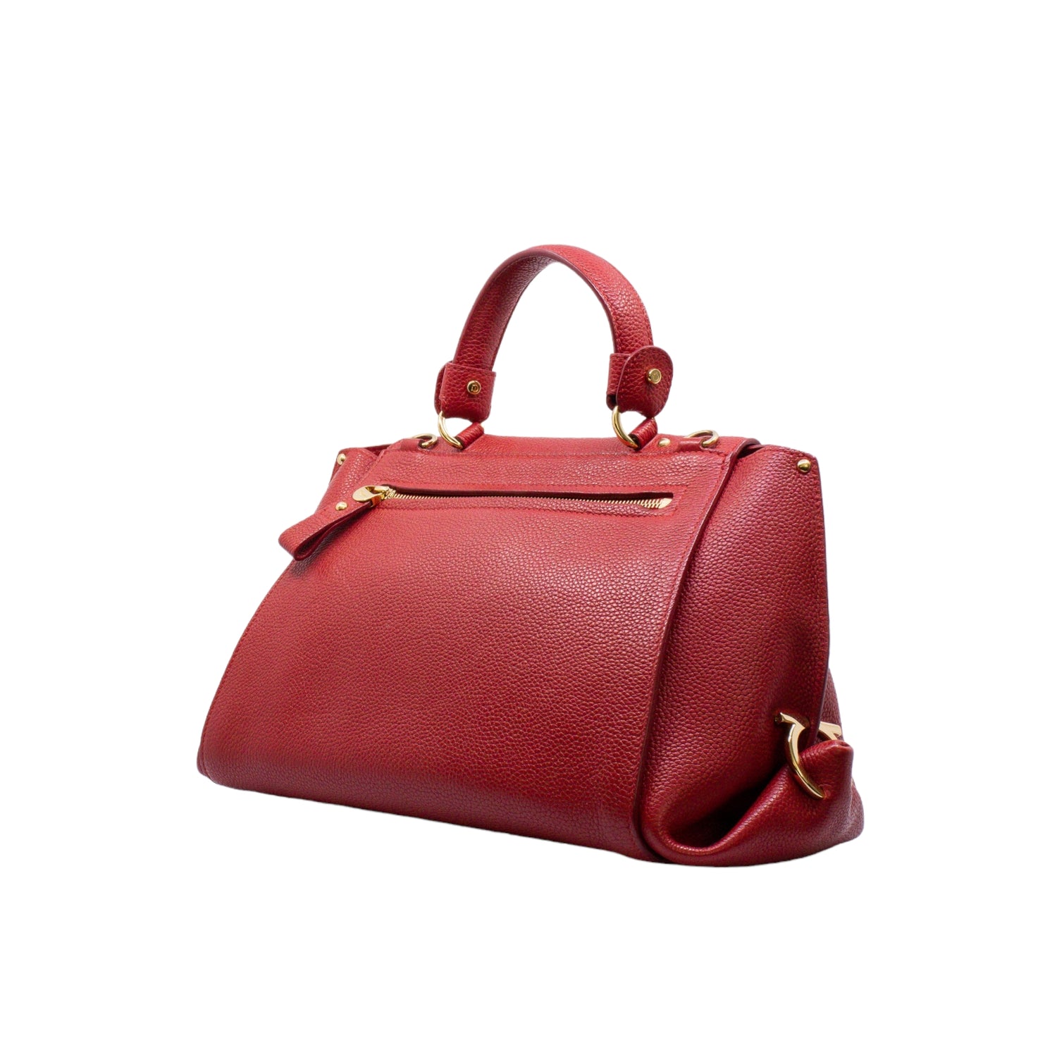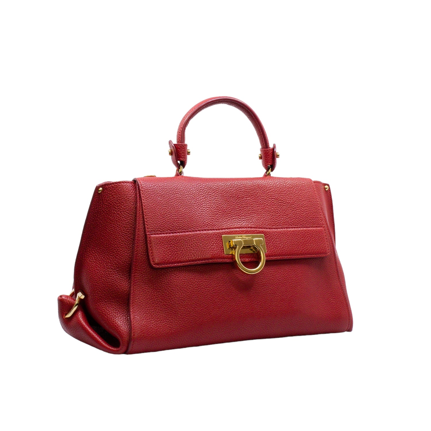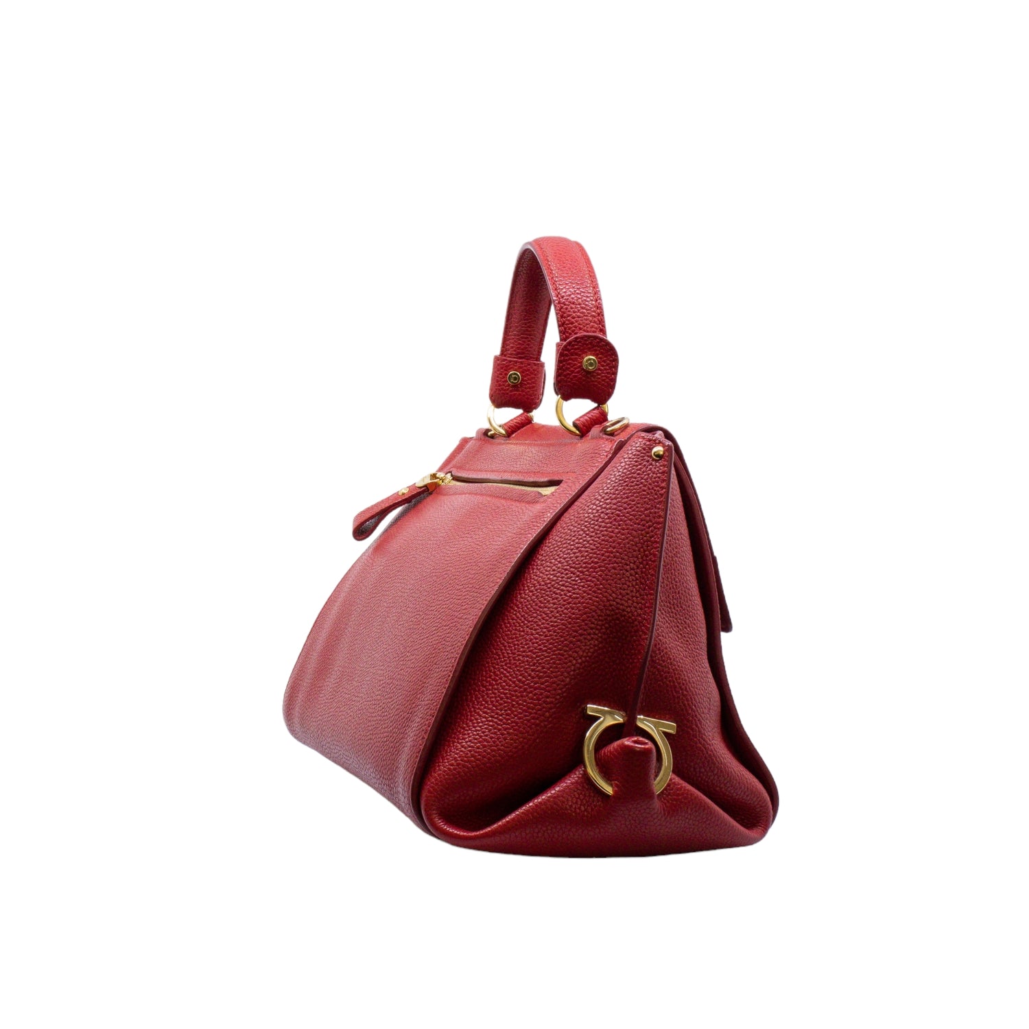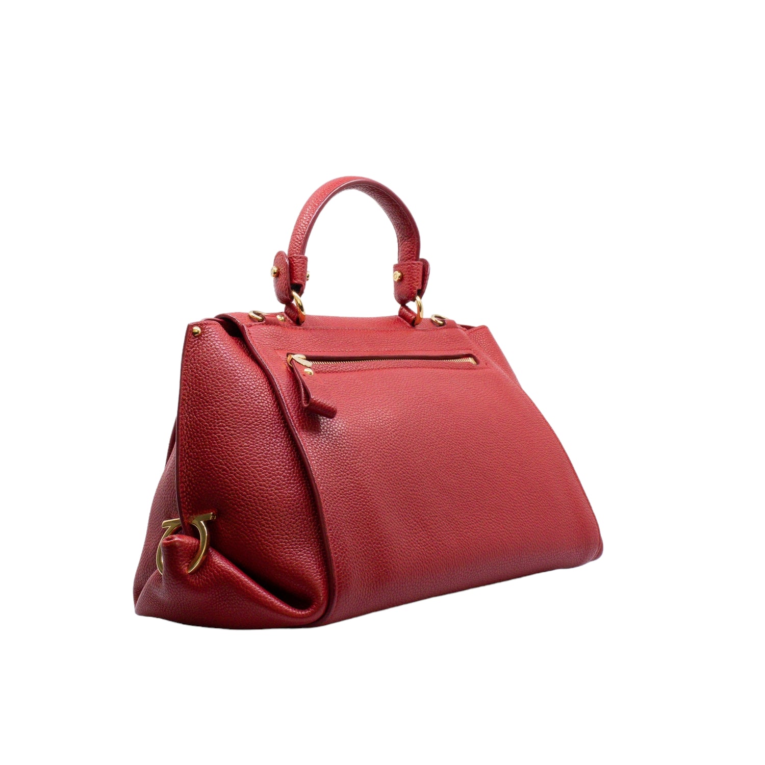 Bolso Salvatore Ferragamo modelo Sofía, confeccionado en piel de becerro color rojo, cuenta con correa extraíble en mismo material y color, y una sola asa superior, herrajes dorados, con 1 bolsillo trasero con cierre de cremallera y solapa con seguro tipo Gancini.