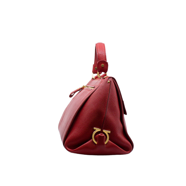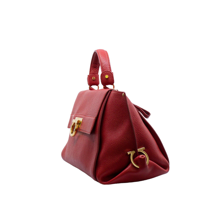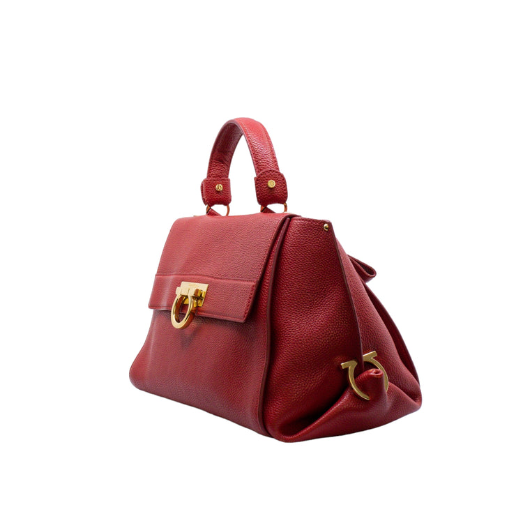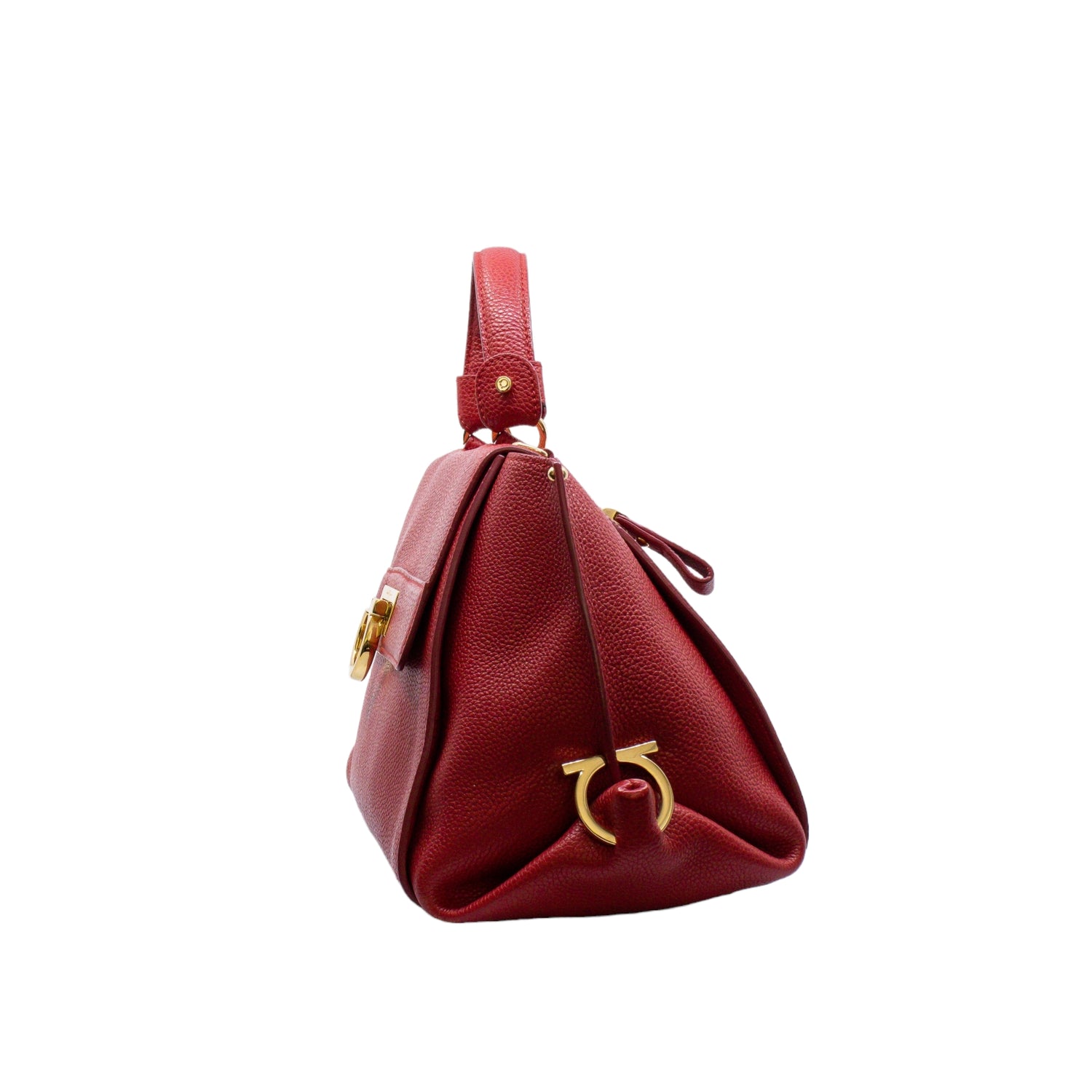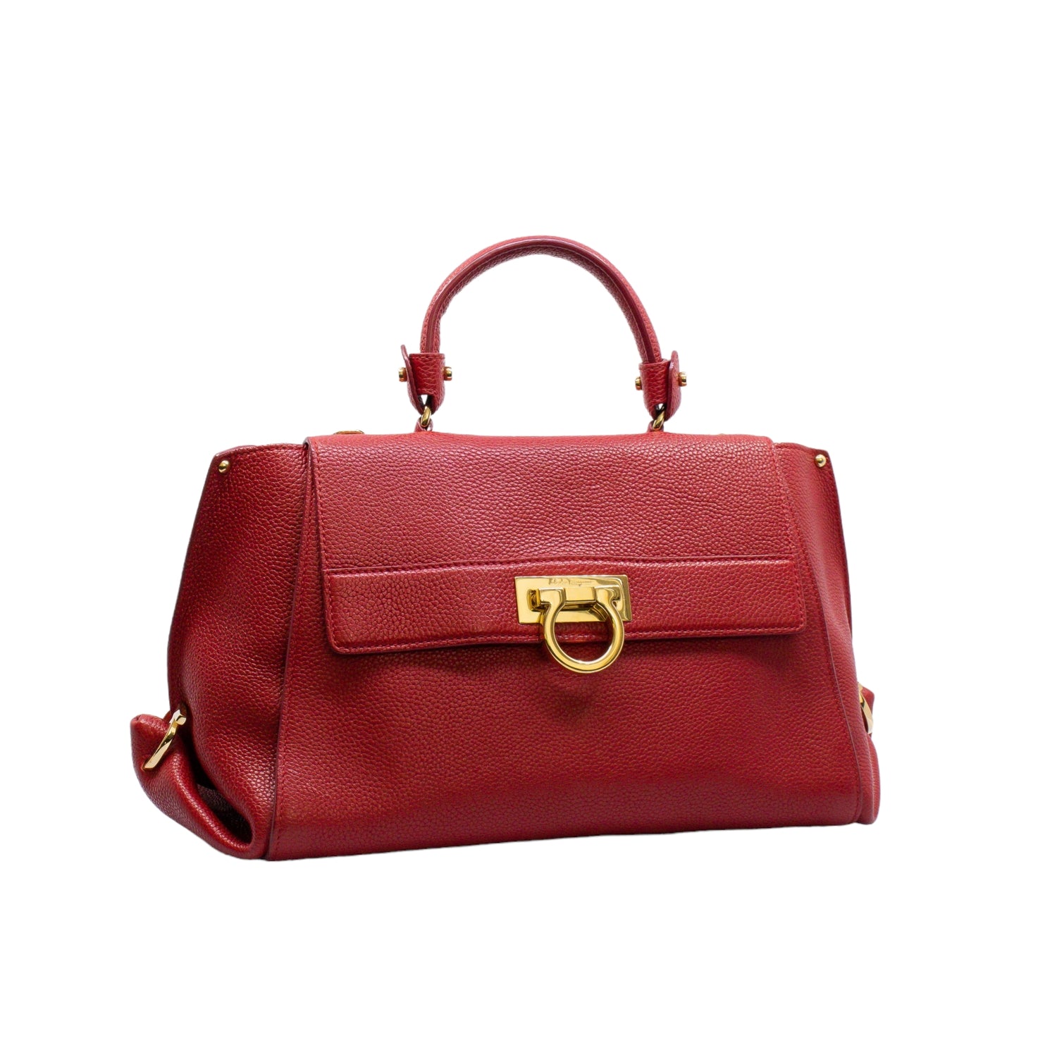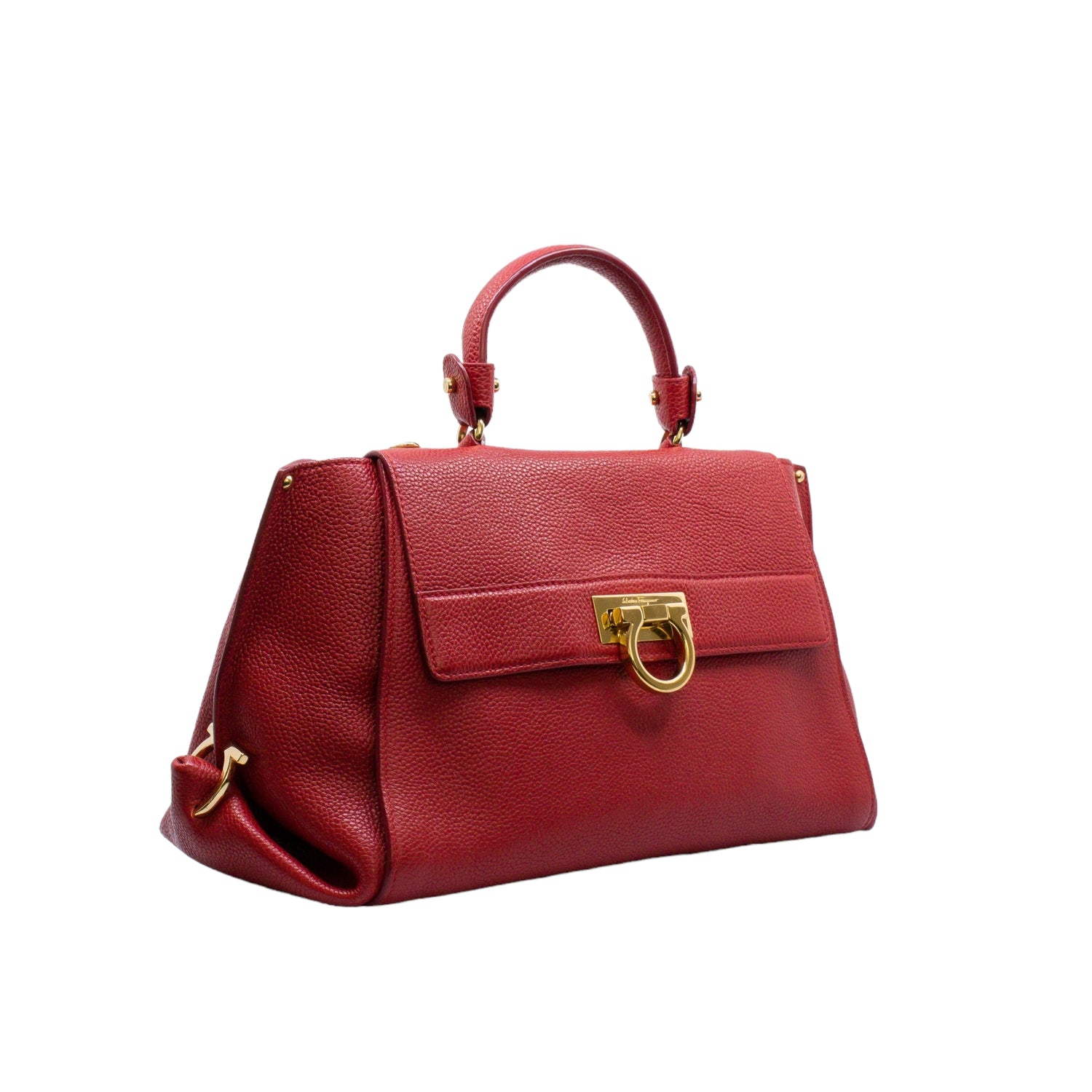 Bolso Salvatore Ferragamo modelo Sofía, confeccionado en piel de becerro color rojo, cuenta con correa extraíble en mismo material y color, y una sola asa superior, herrajes dorados, con 1 bolsillo trasero con cierre de cremallera y solapa con seguro tipo Gancini.