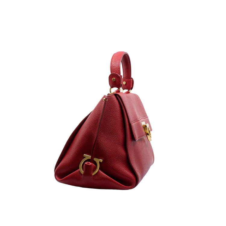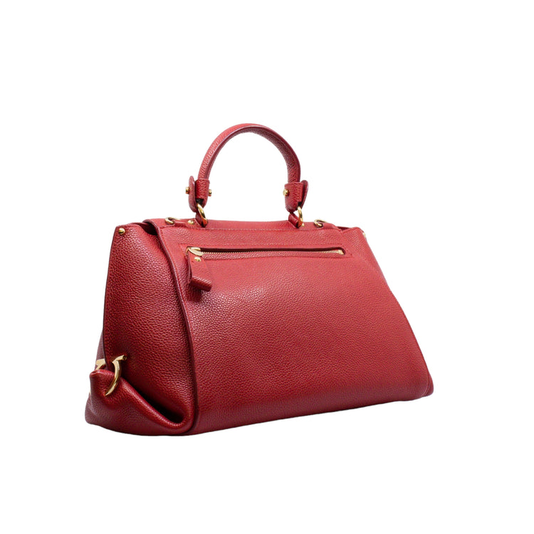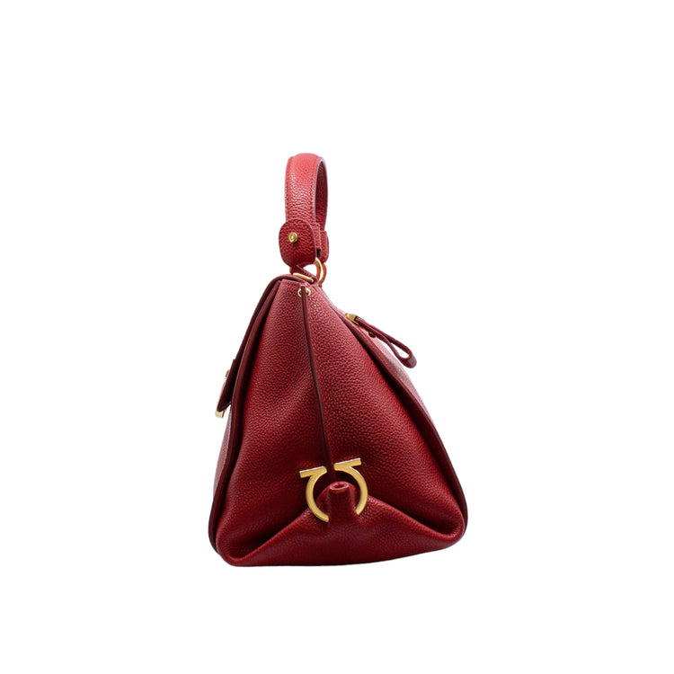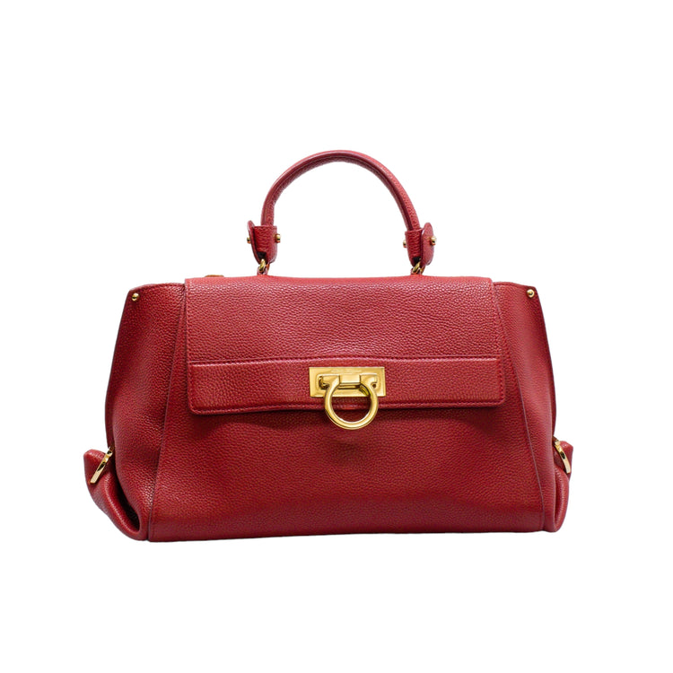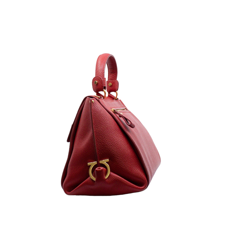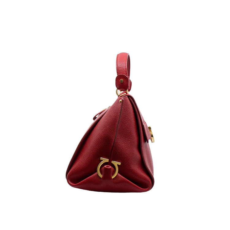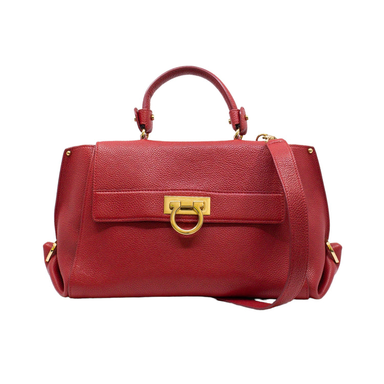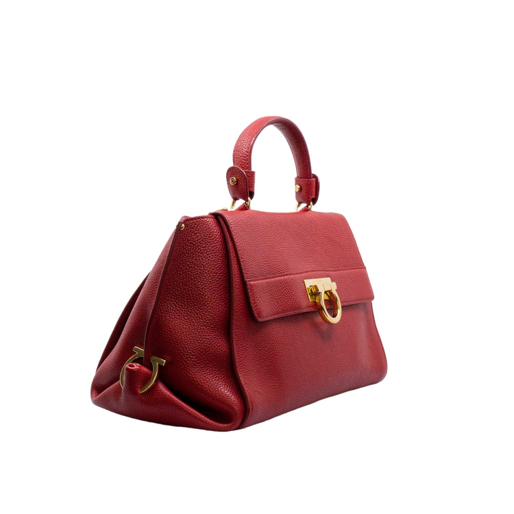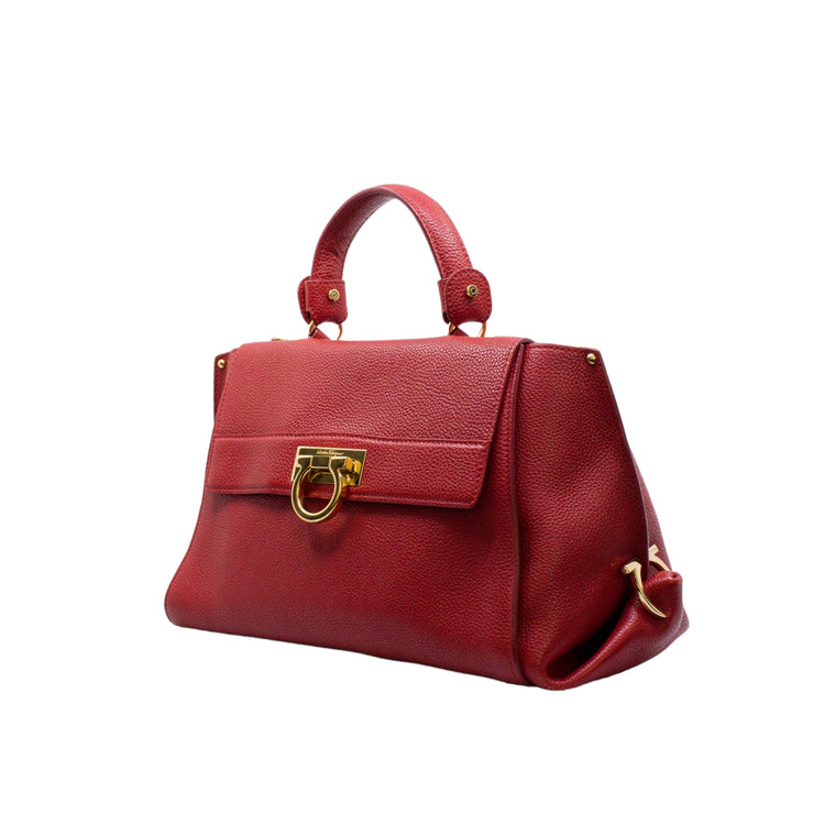 Bolso Salvatore Ferragamo modelo Sofía, confeccionado en piel de becerro color rojo, cuenta con correa extraíble en mismo material y color, y una sola asa superior, herrajes dorados, con 1 bolsillo trasero con cierre de cremallera y solapa con seguro tipo Gancini.