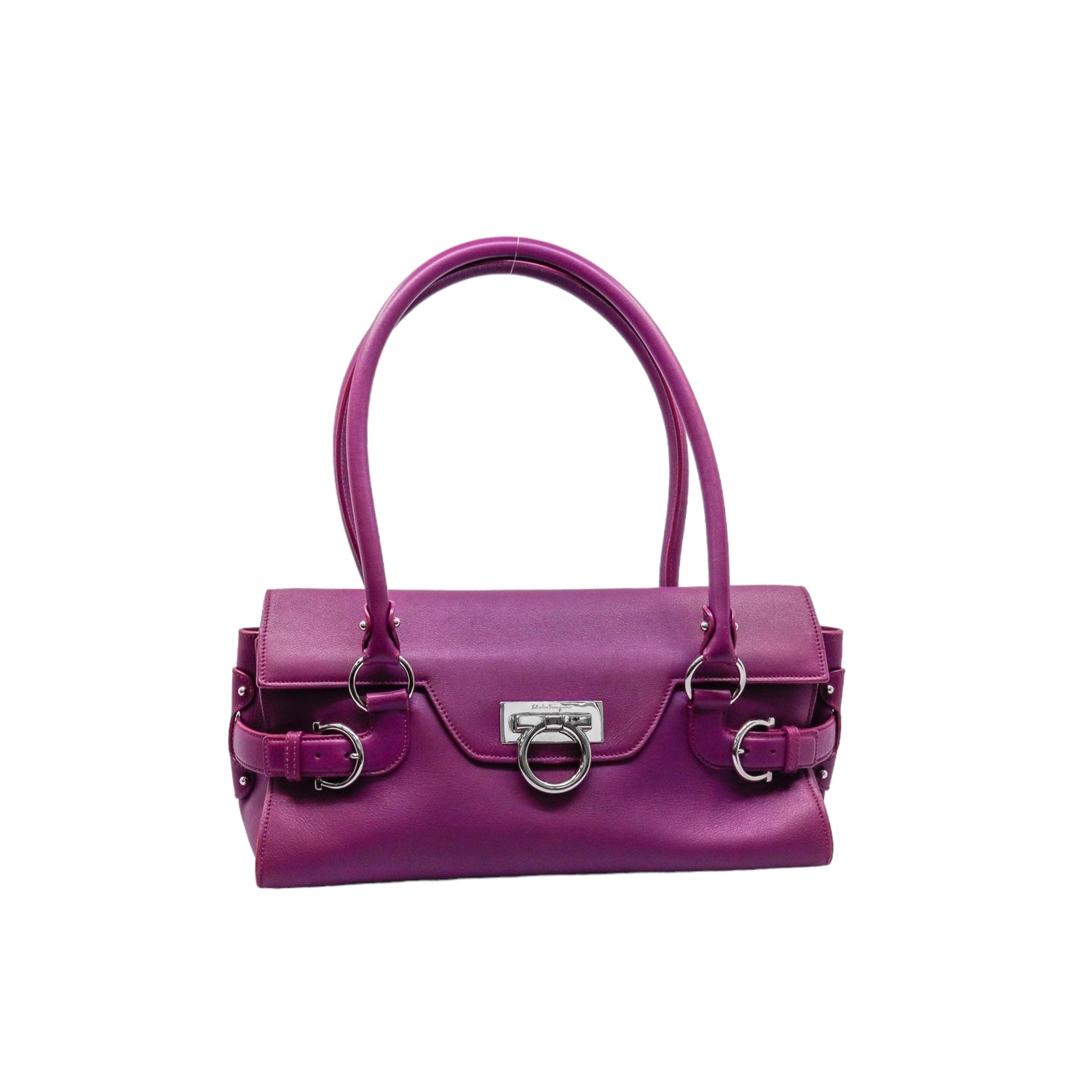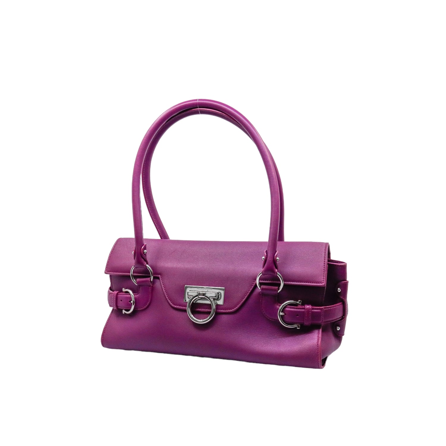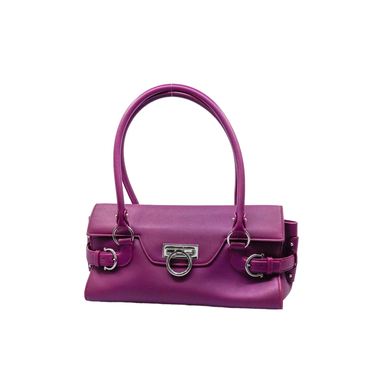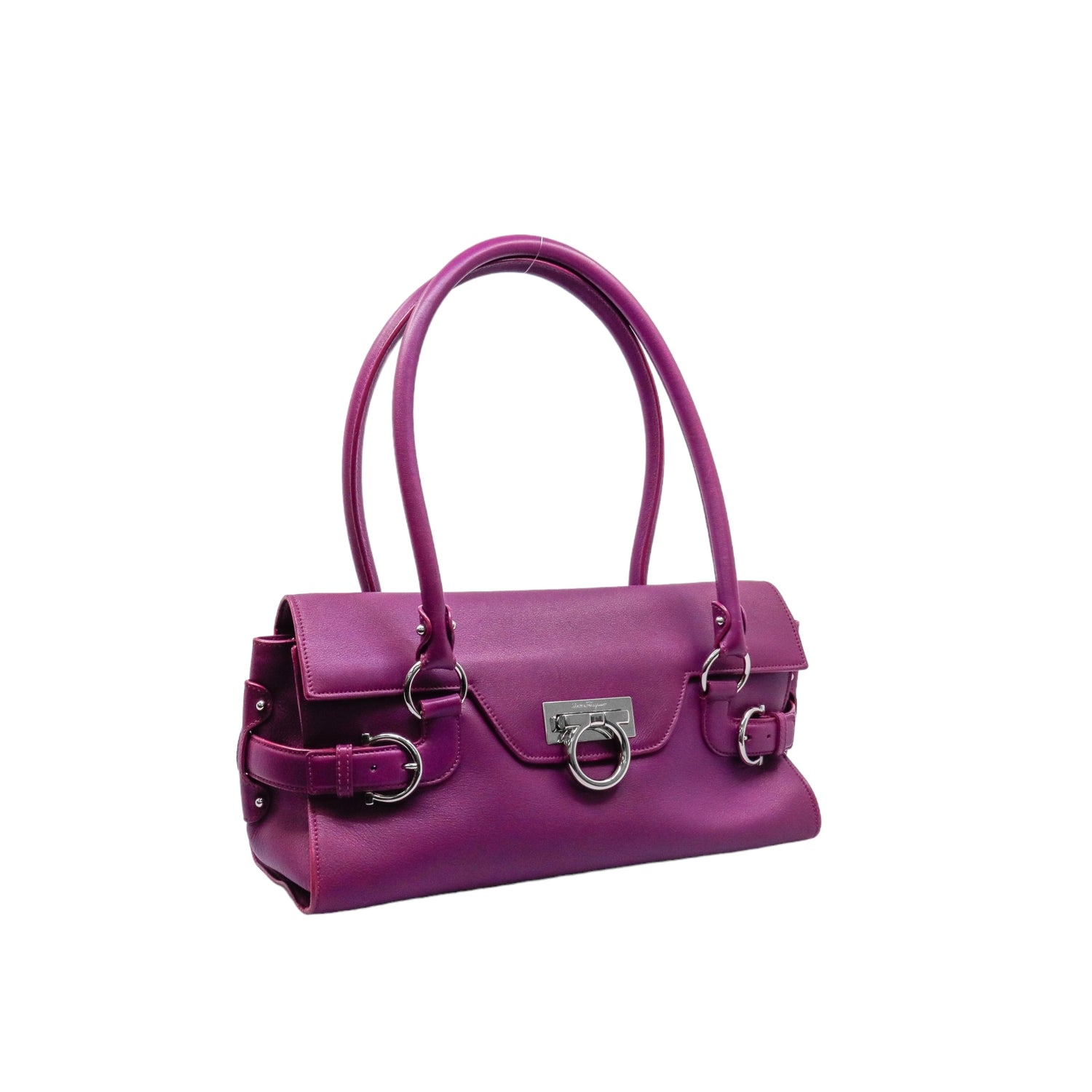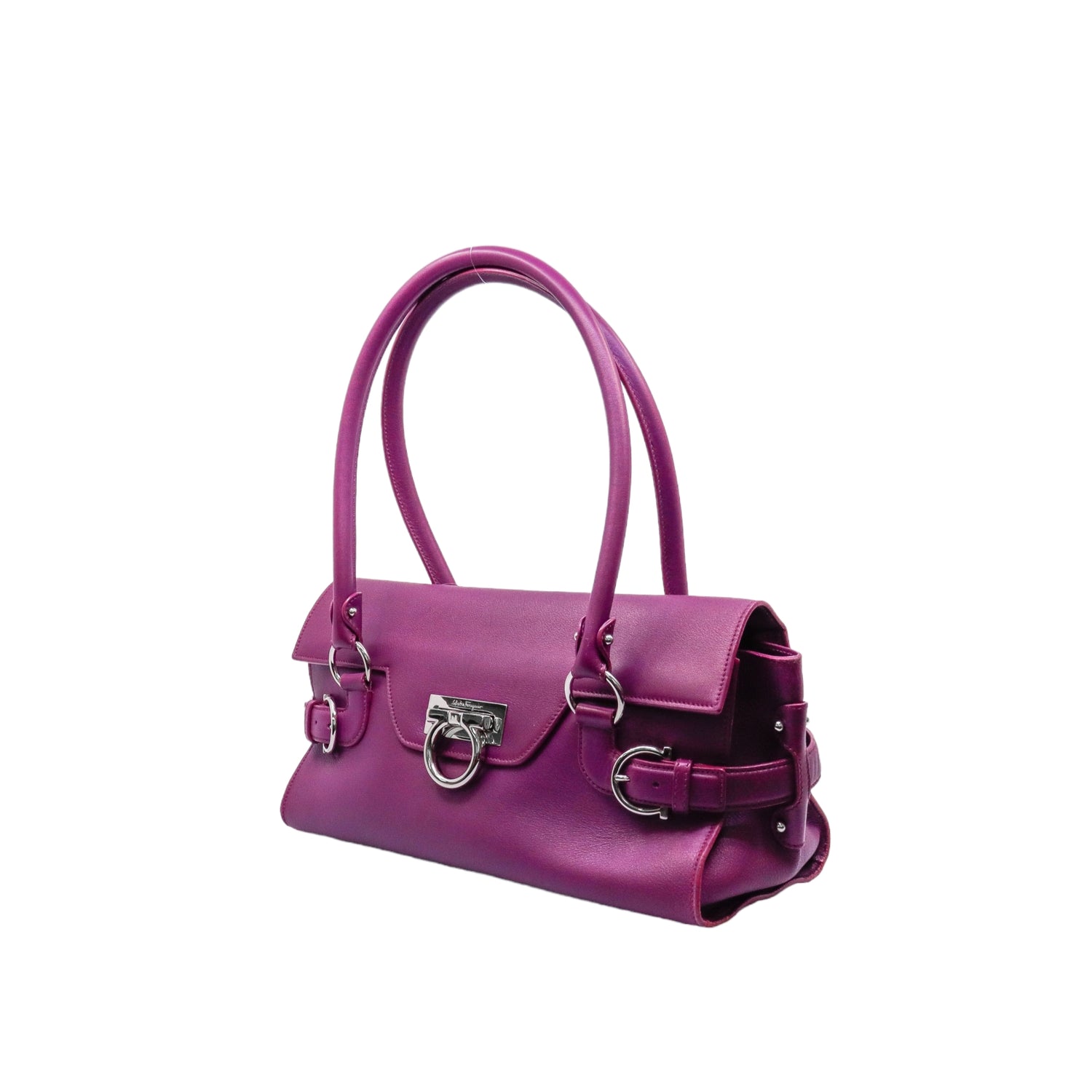 Bolso Salvatore Ferragamo de la clásica línea Gancini, confeccionado en suave piel de becerro color morado con 2 asas rígidas en el mismo tono y material, con forro interno en color marrón, broche en la solapa y herrajes en metal plateado.