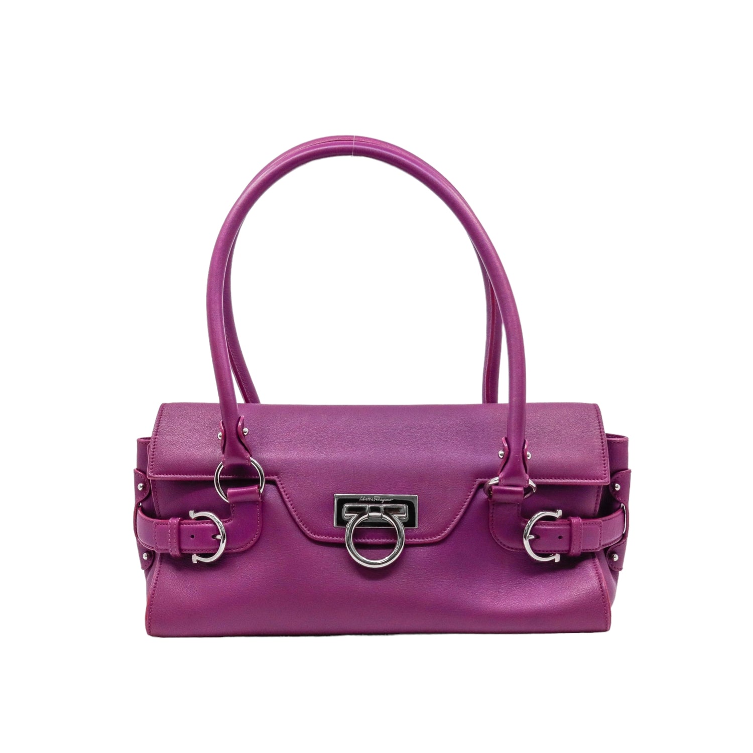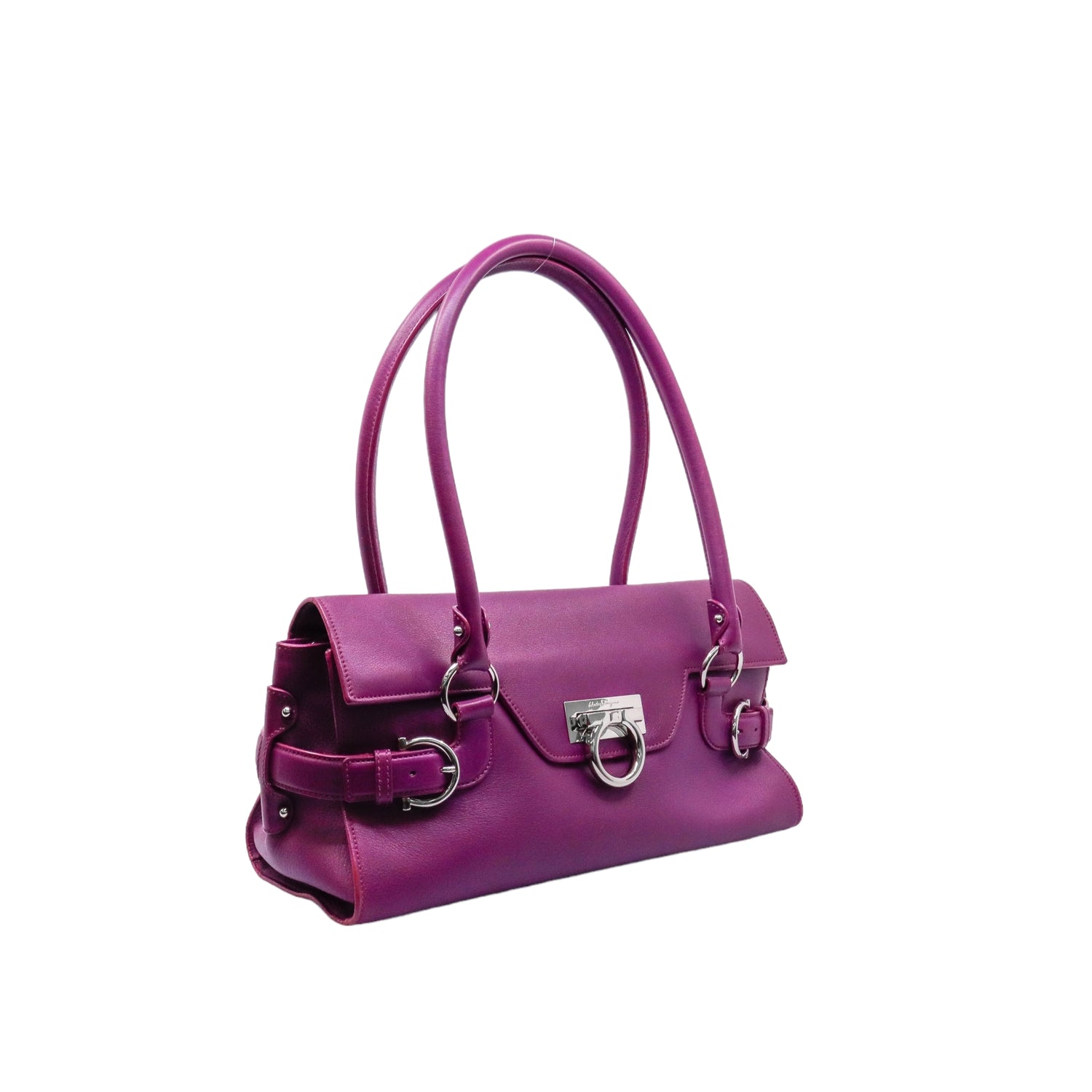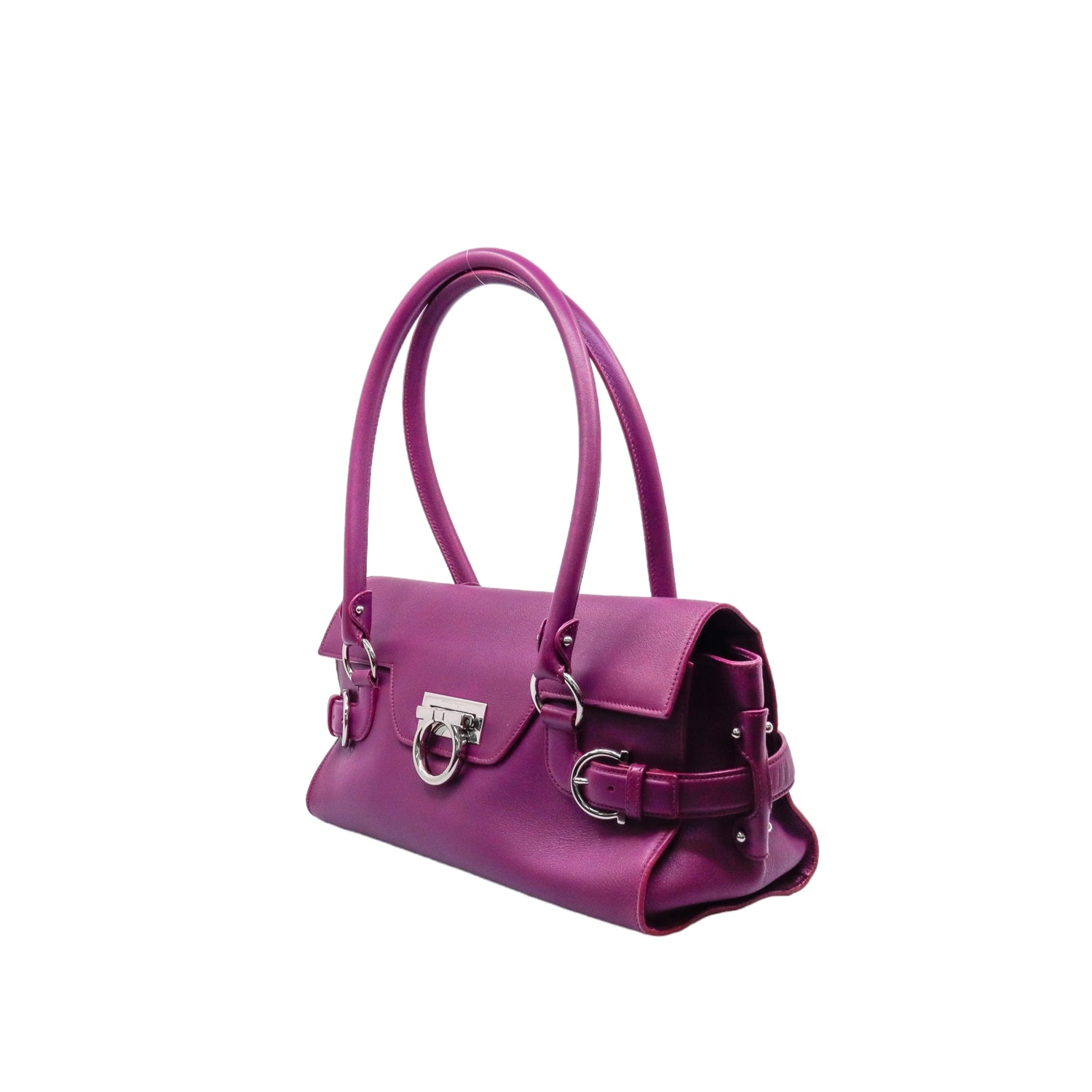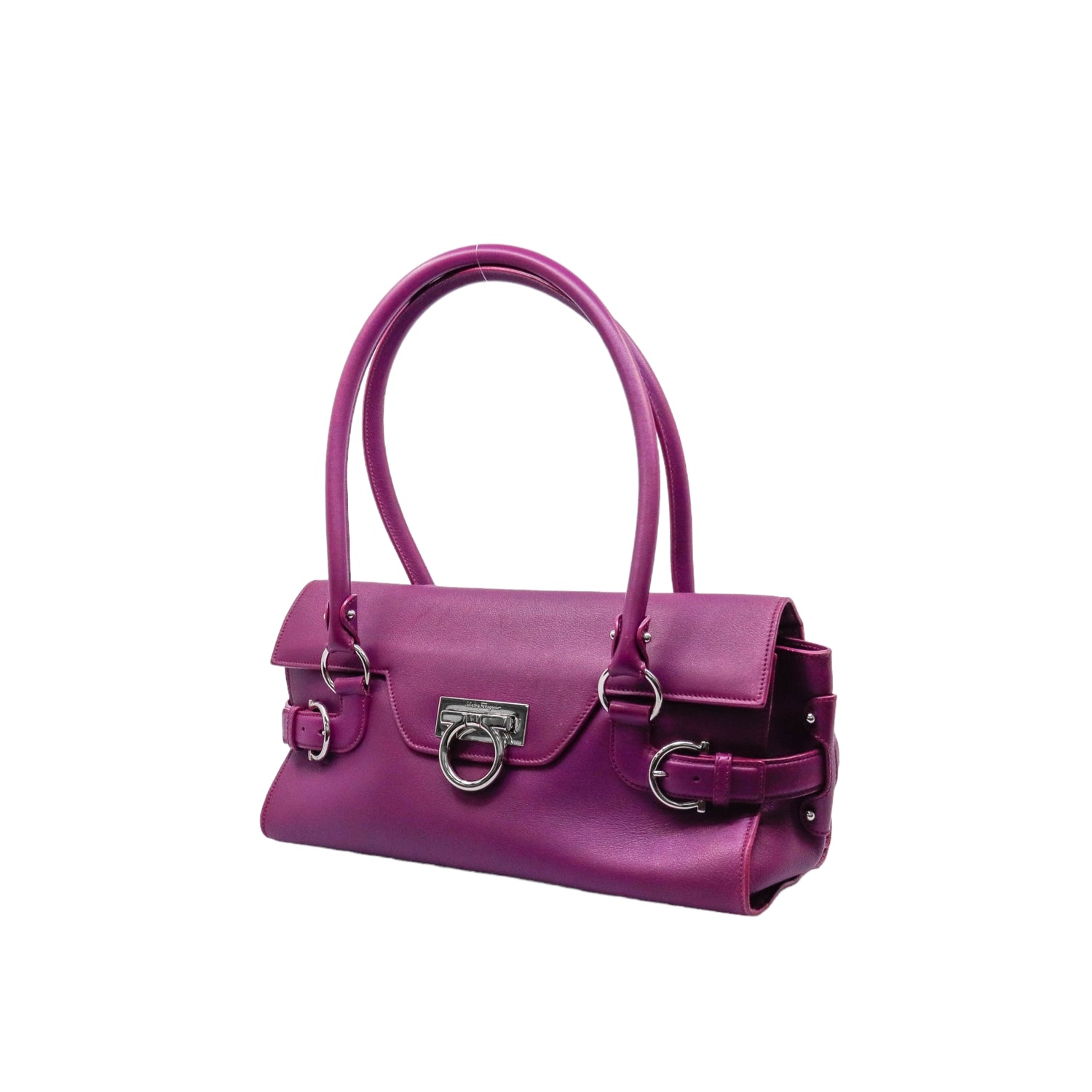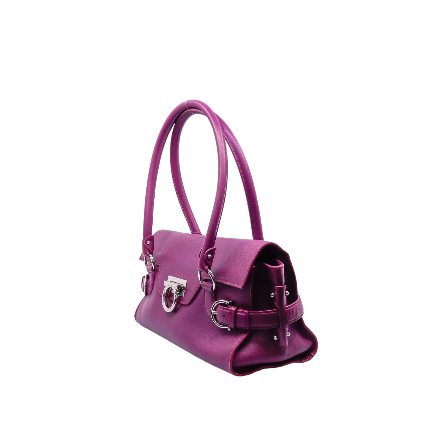 Bolso Salvatore Ferragamo de la clásica línea Gancini, confeccionado en suave piel de becerro color morado con 2 asas rígidas en el mismo tono y material, con forro interno en color marrón, broche en la solapa y herrajes en metal plateado.