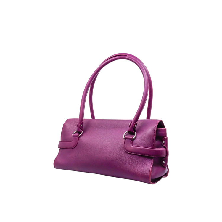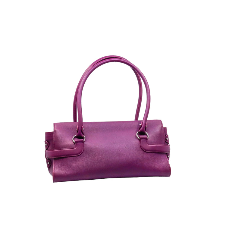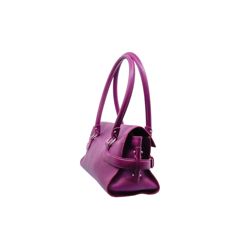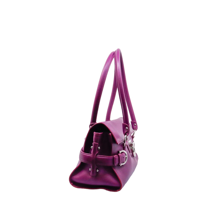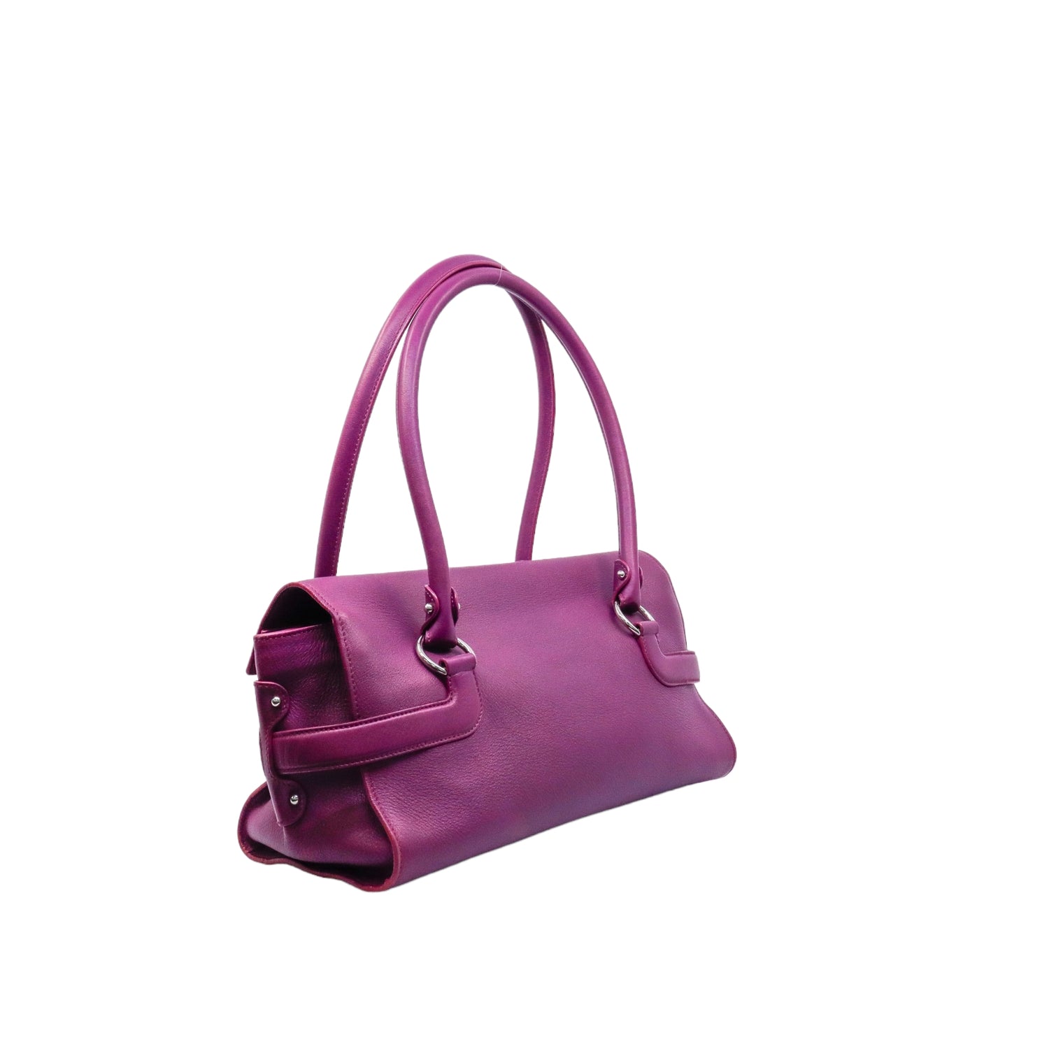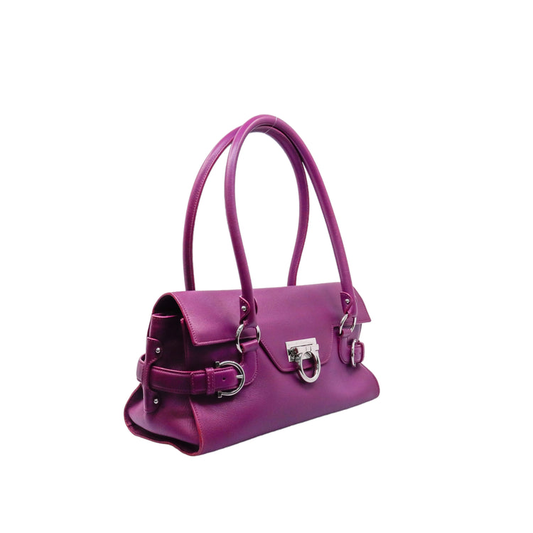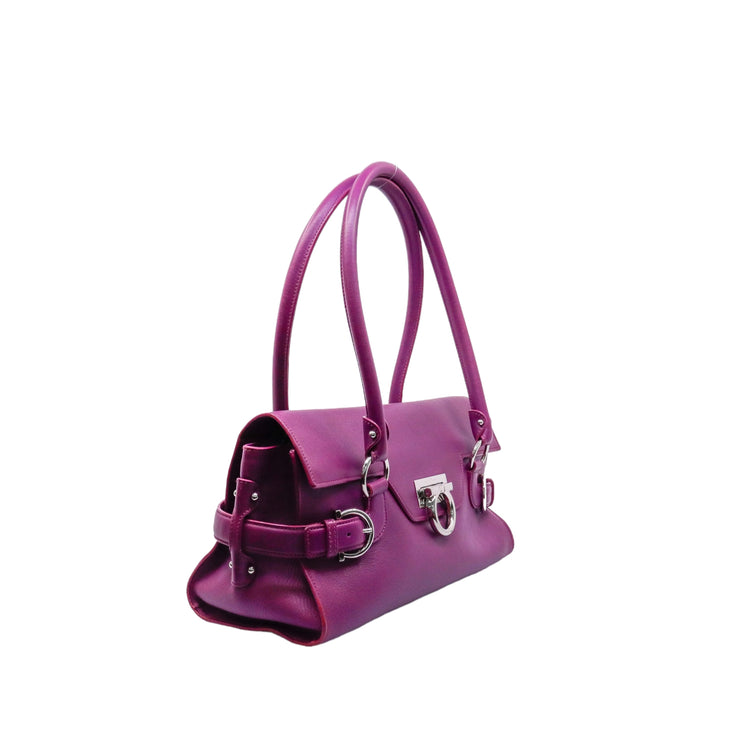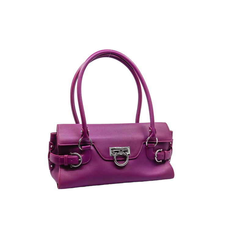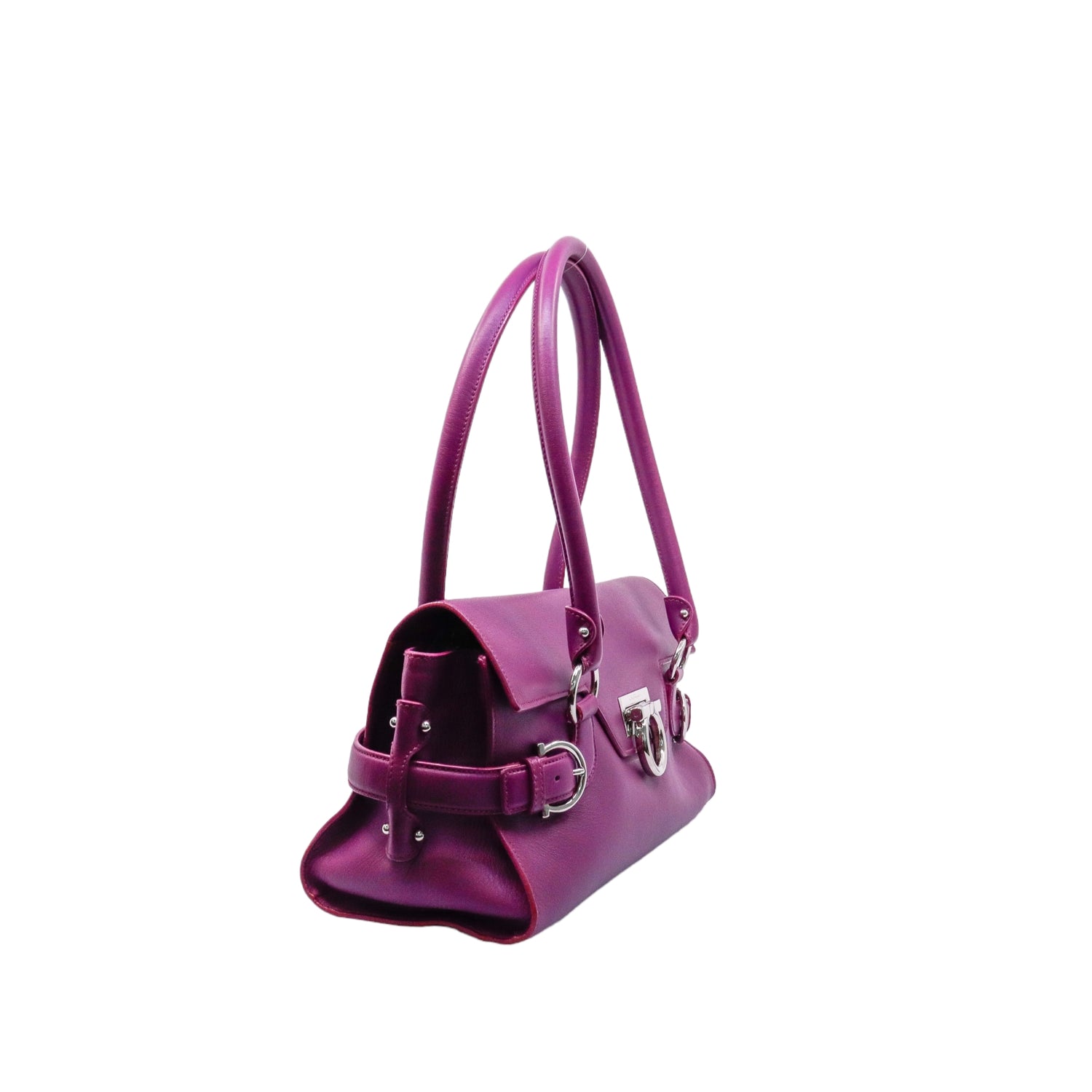 Bolso Salvatore Ferragamo de la clásica línea Gancini, confeccionado en suave piel de becerro color morado con 2 asas rígidas en el mismo tono y material, con forro interno en color marrón, broche en la solapa y herrajes en metal plateado.