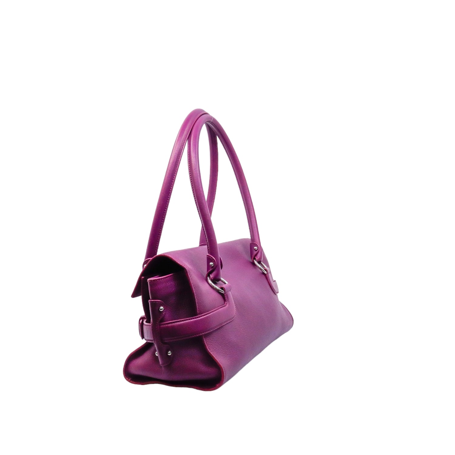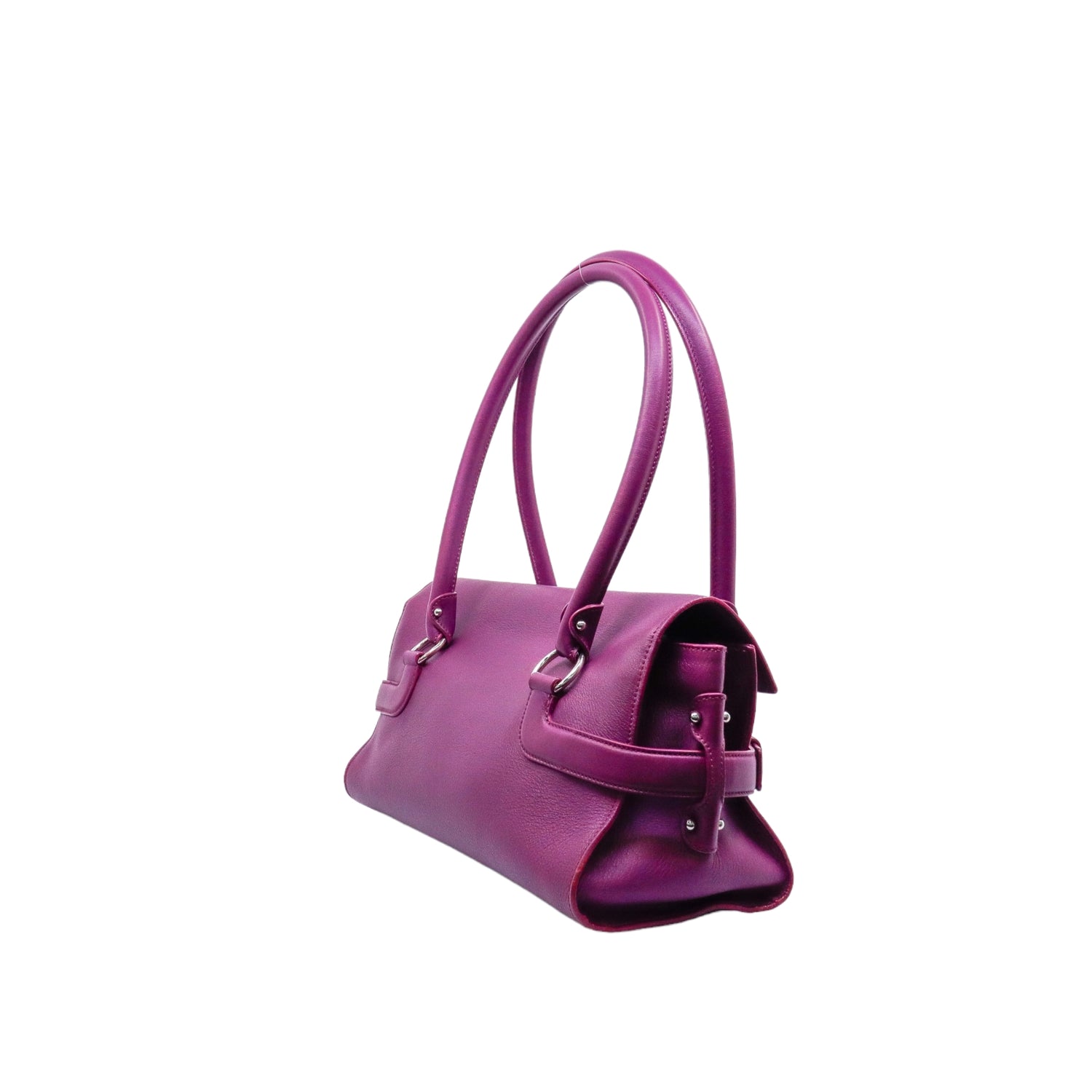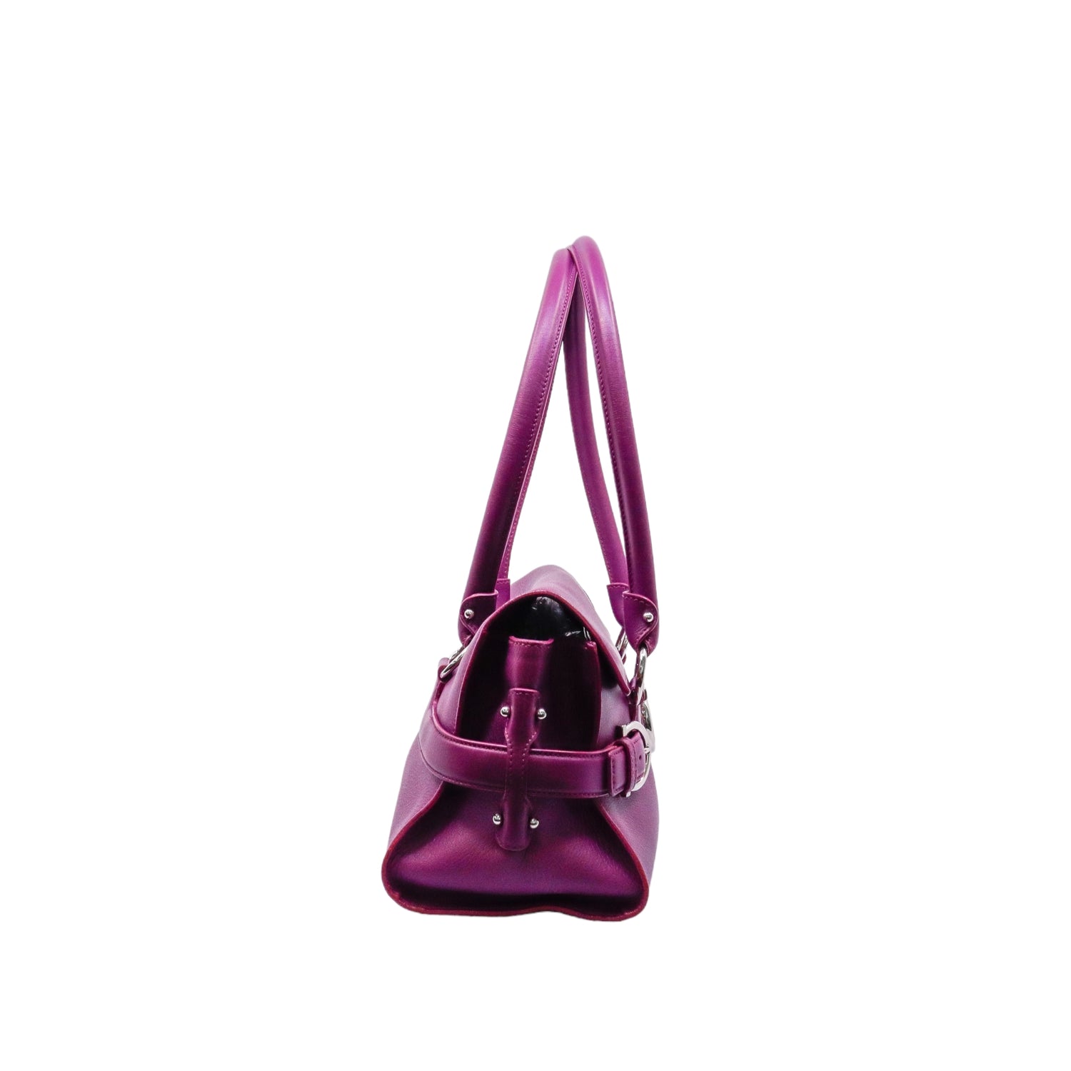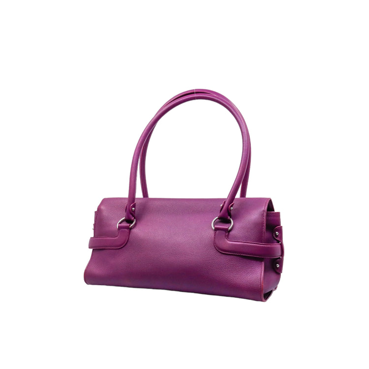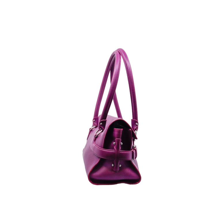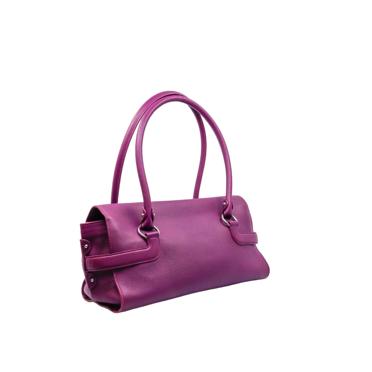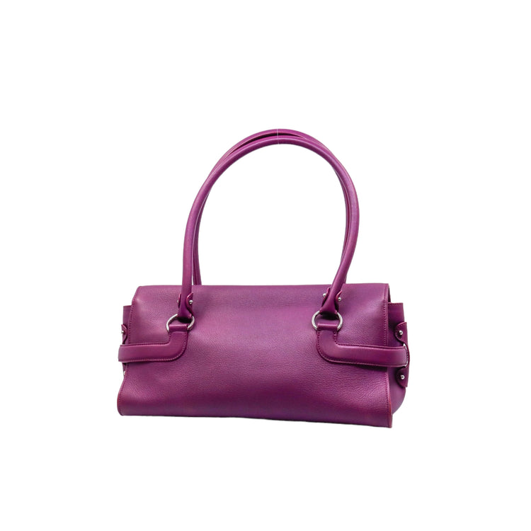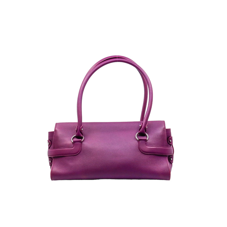 Bolso Salvatore Ferragamo de la clásica línea Gancini, confeccionado en suave piel de becerro color morado con 2 asas rígidas en el mismo tono y material, con forro interno en color marrón, broche en la solapa y herrajes en metal plateado.