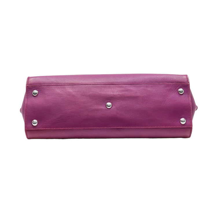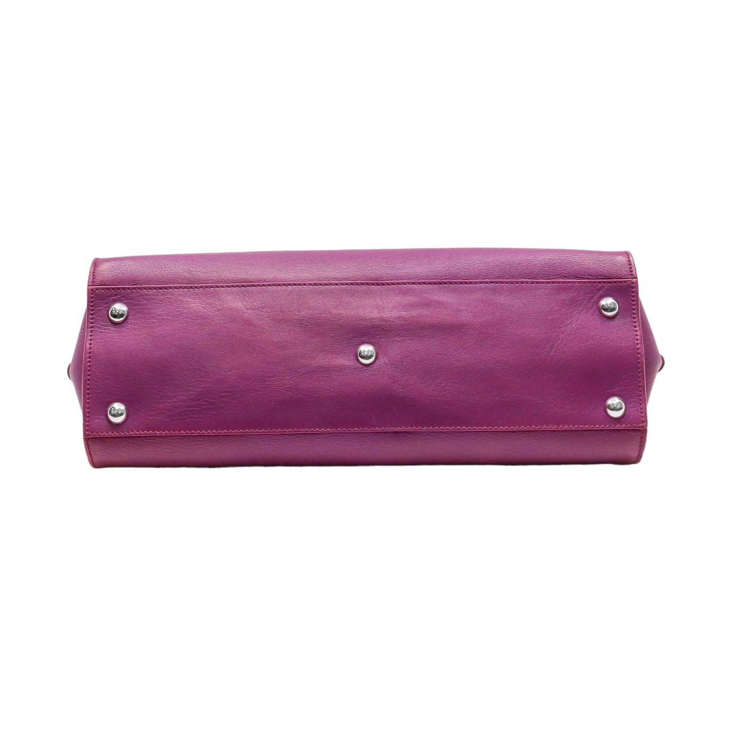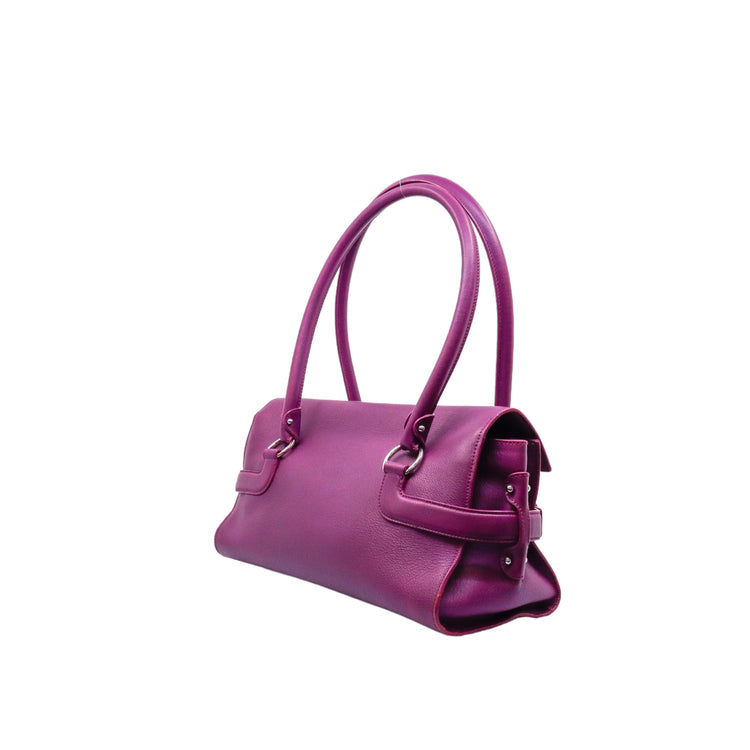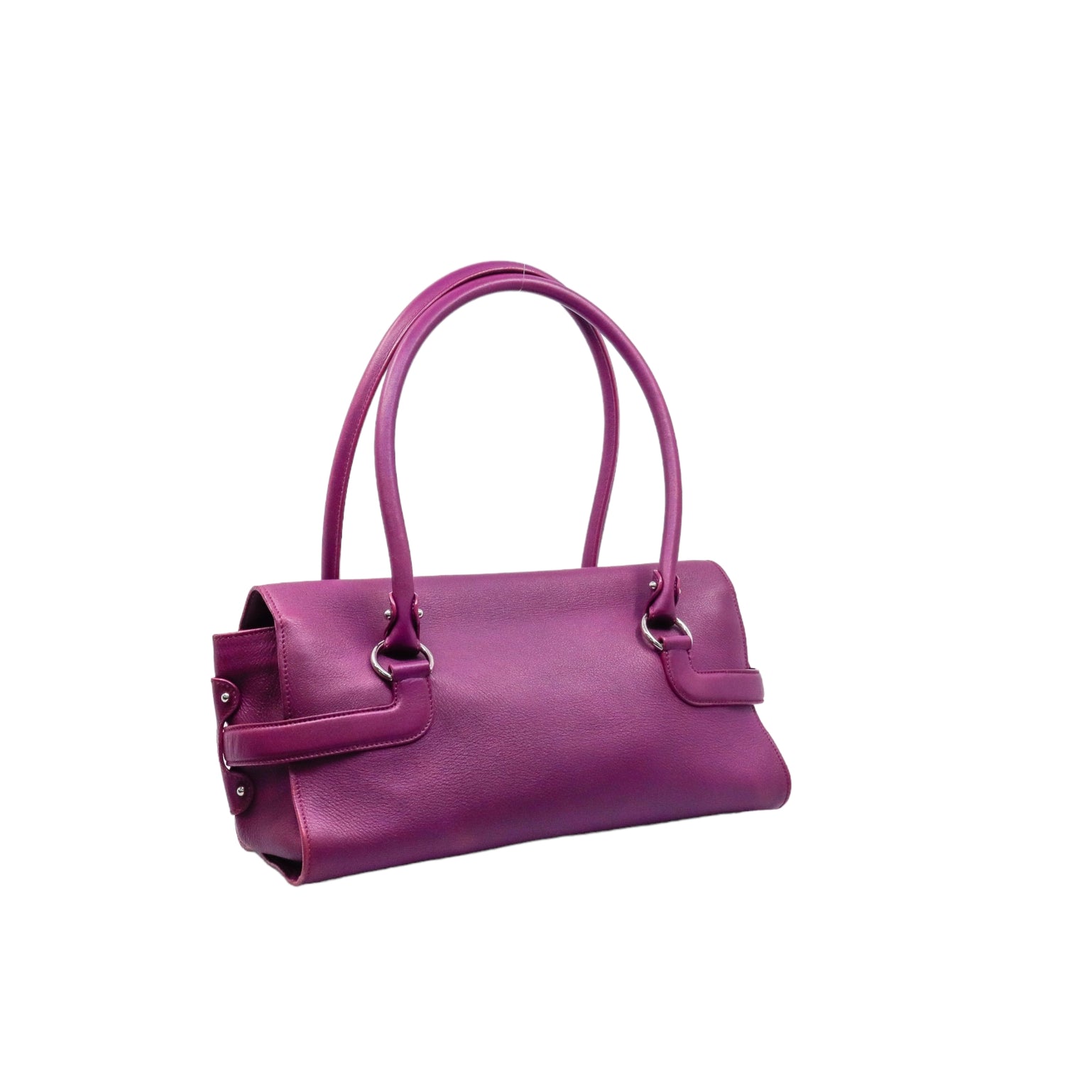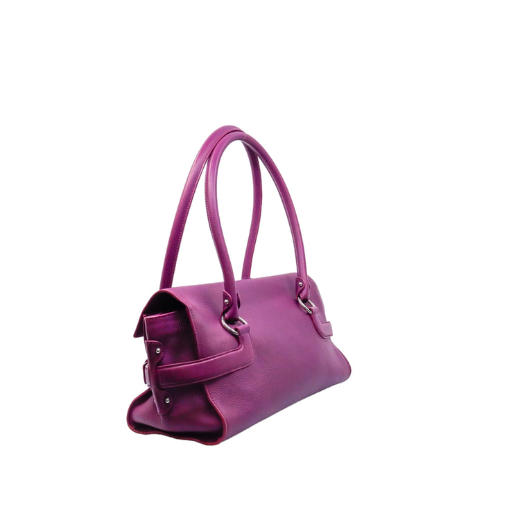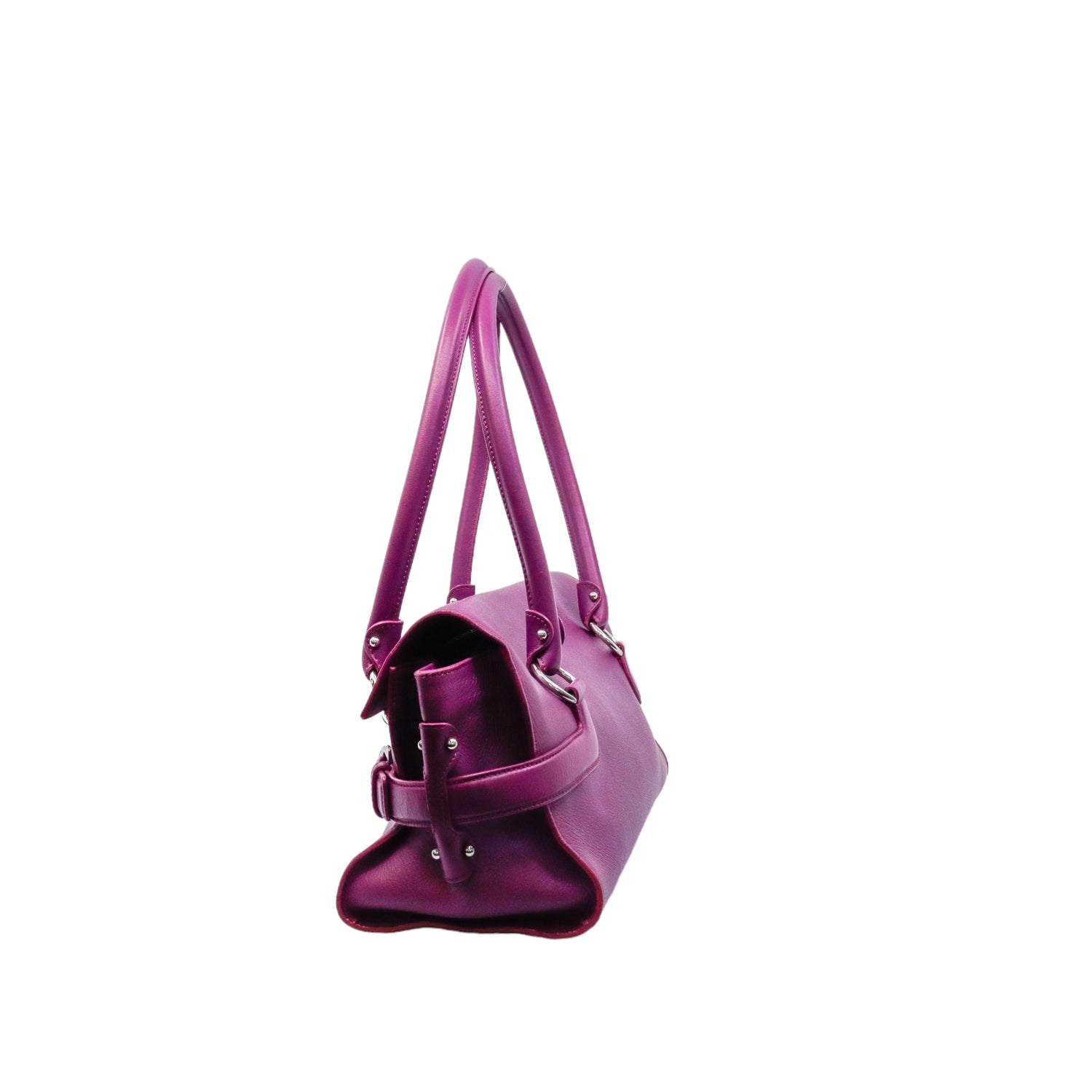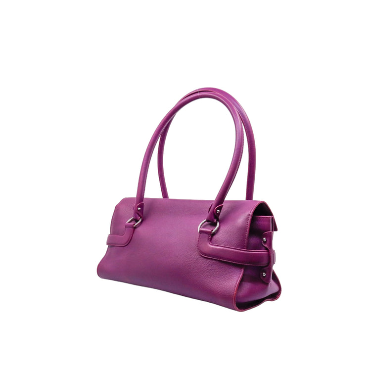 Bolso Salvatore Ferragamo de la clásica línea Gancini, confeccionado en suave piel de becerro color morado con 2 asas rígidas en el mismo tono y material, con forro interno en color marrón, broche en la solapa y herrajes en metal plateado.