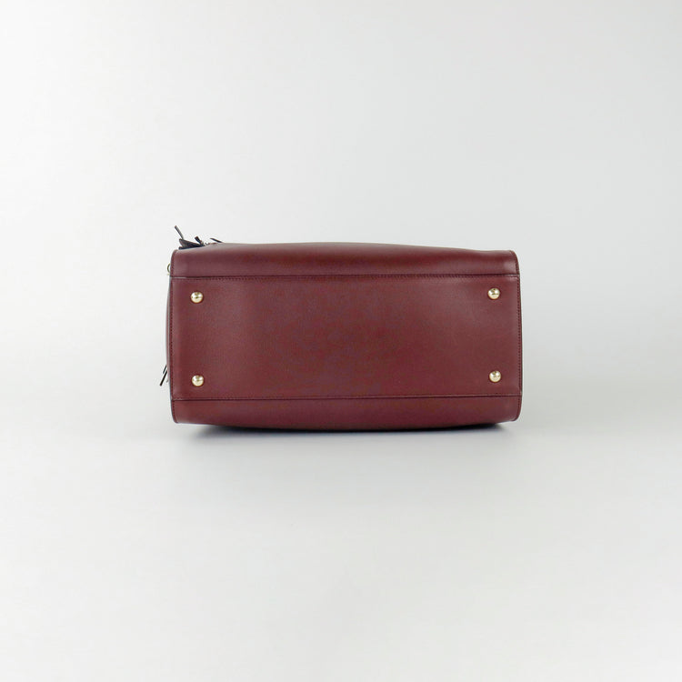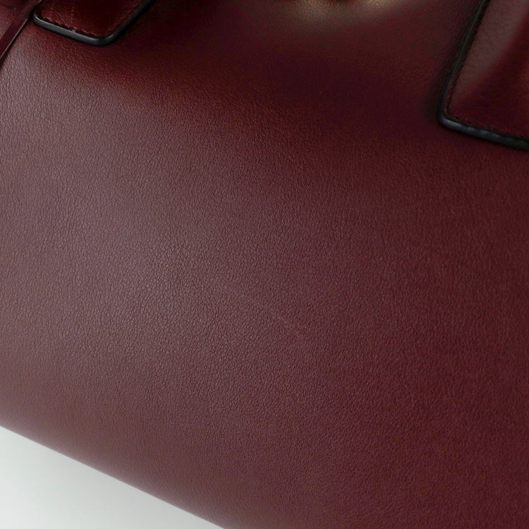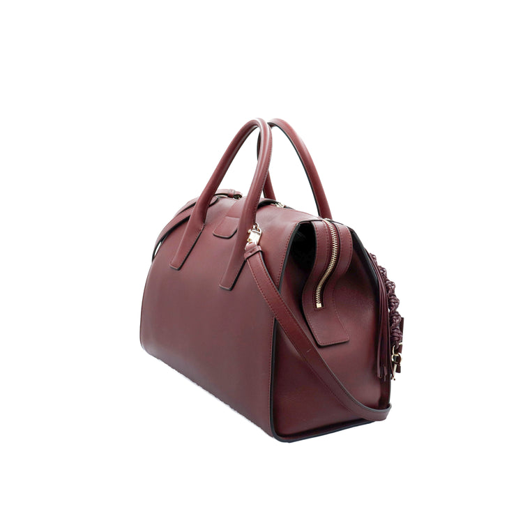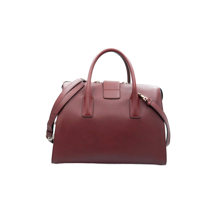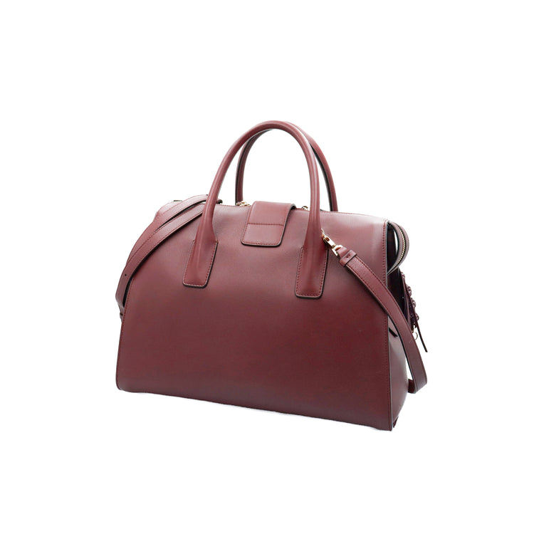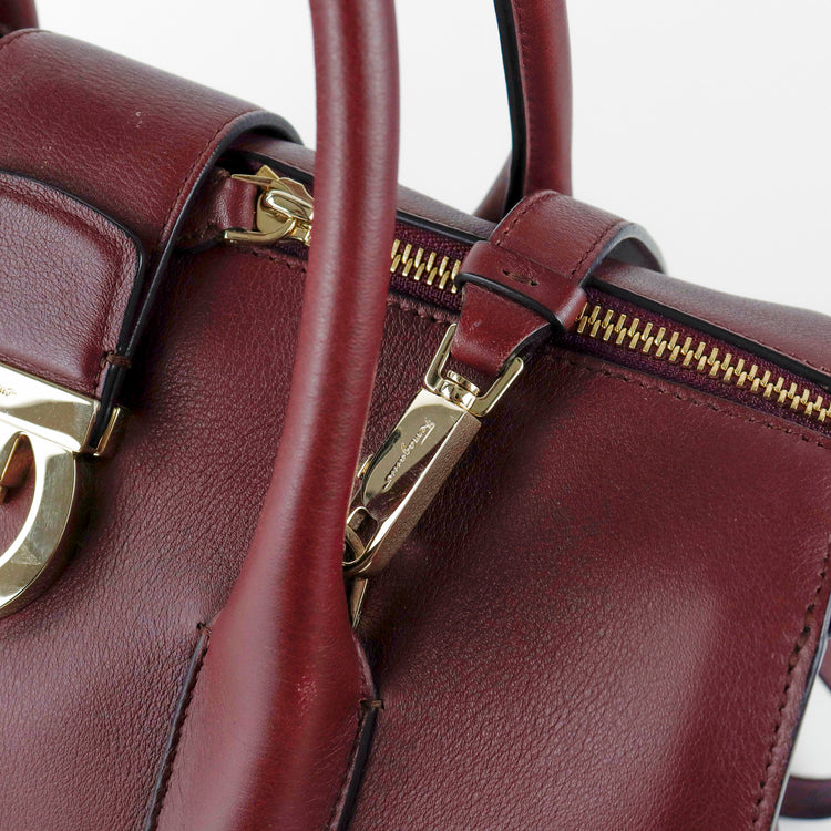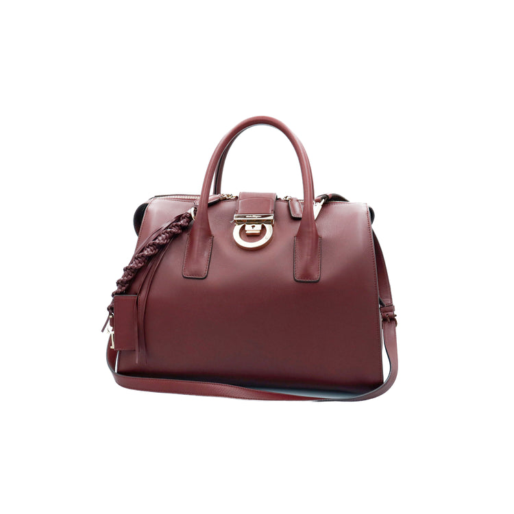 Bolso Salvatore Ferragamo Gancini confeccionado en piel color rojo burdeos, con 2 asas rígidas, una correa de cuero plana desmontable, forro interno en cuero con cierre superior tipo cremallera y herraje con el logo Gancini al frente.