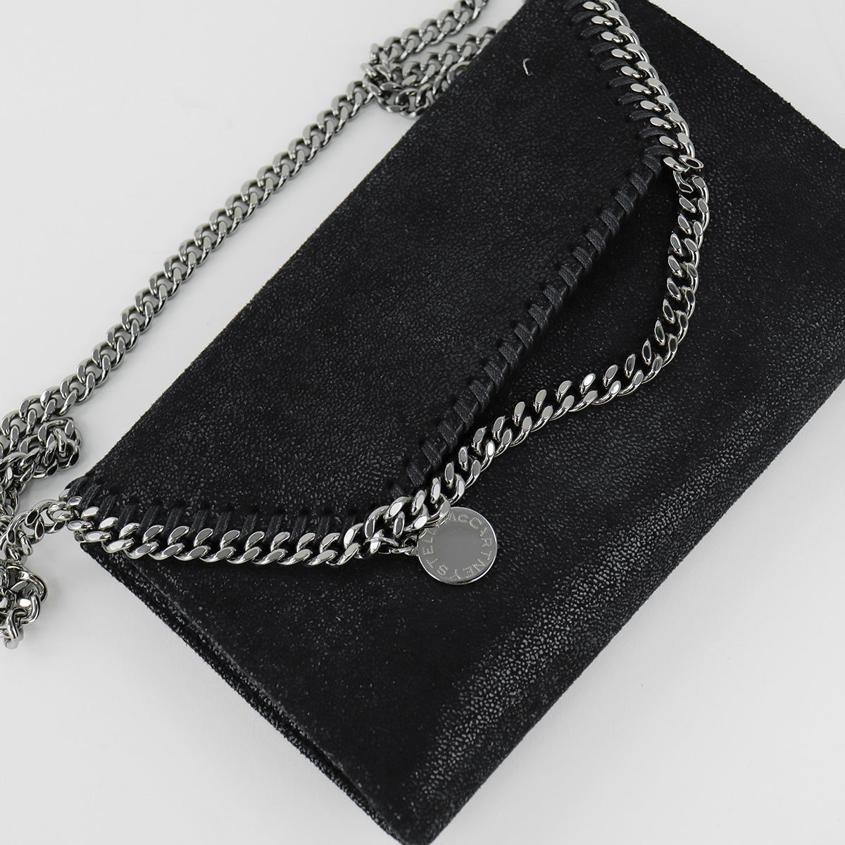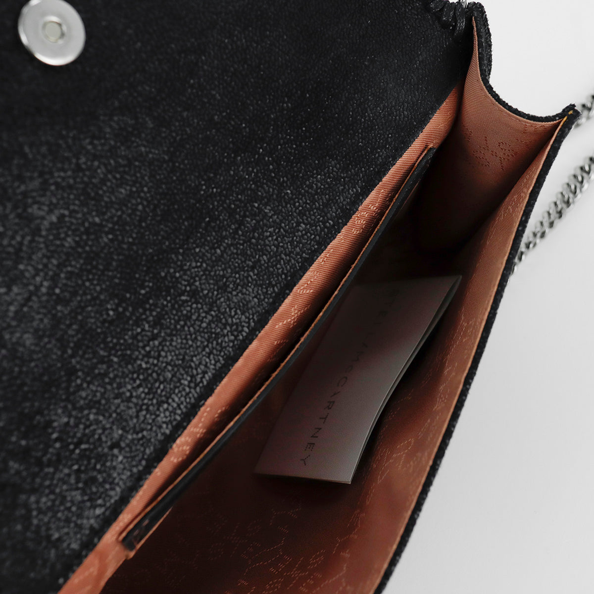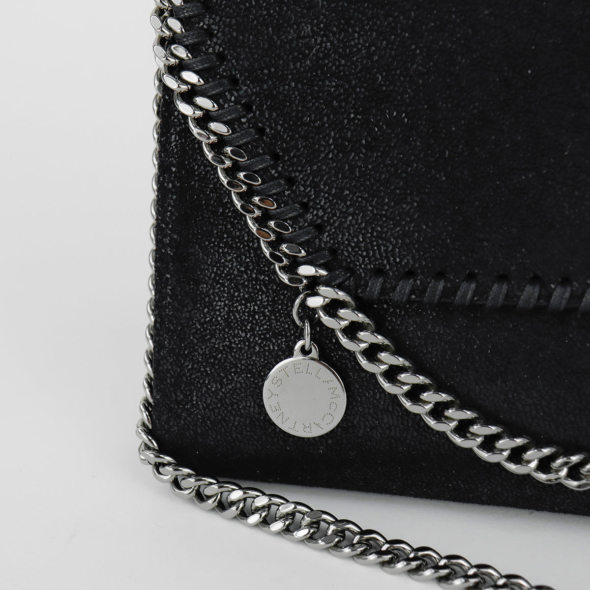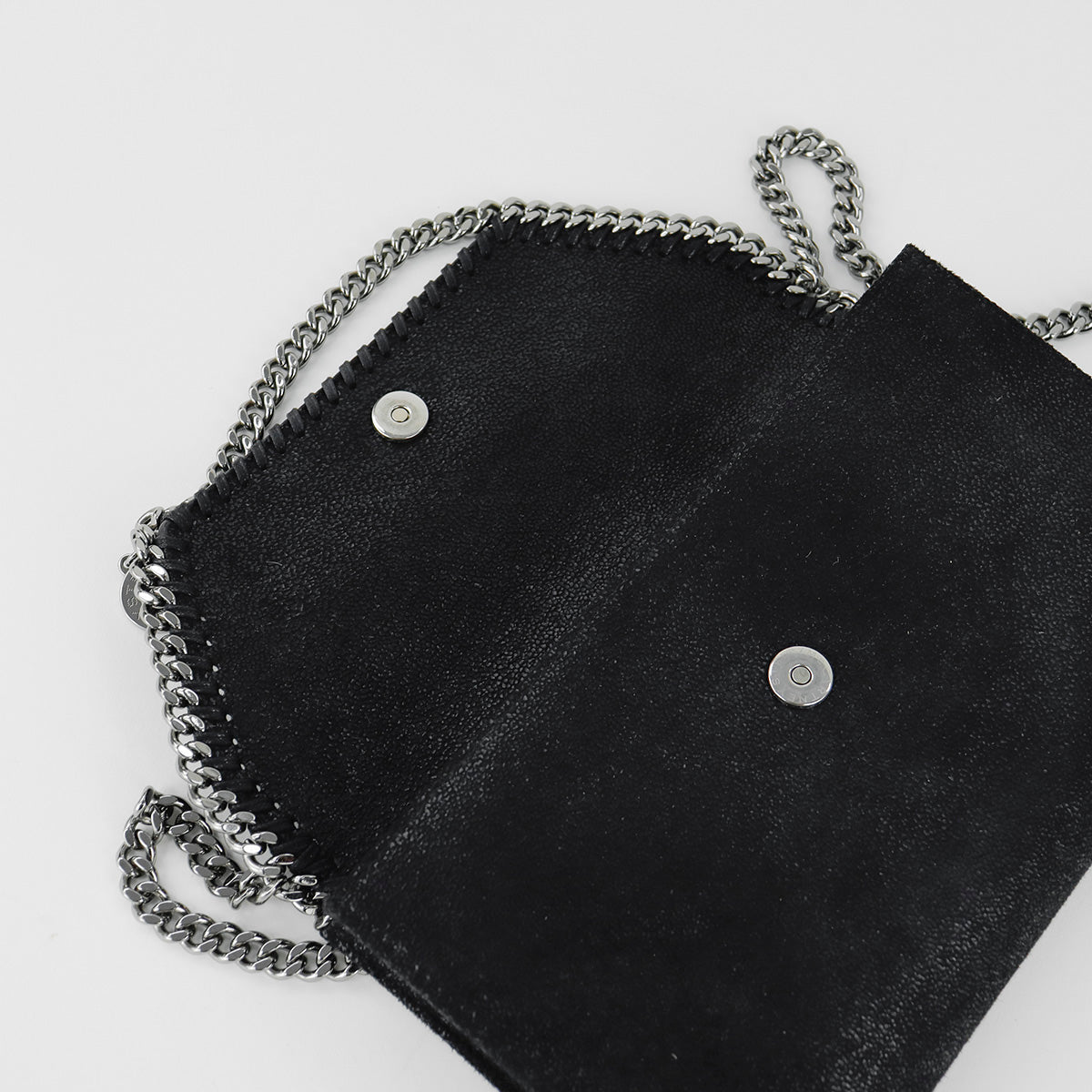 Bolso Stella McCartney, modelo Mini Falabella Crossbody Bag, confeccionado en cuero sintético color negro elaborado a base de poliéster reciclado o poliuretano, con forro interno en textil nude, con herrajes en color plateado.