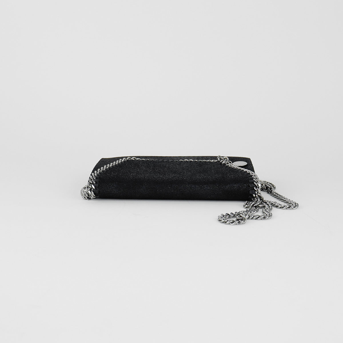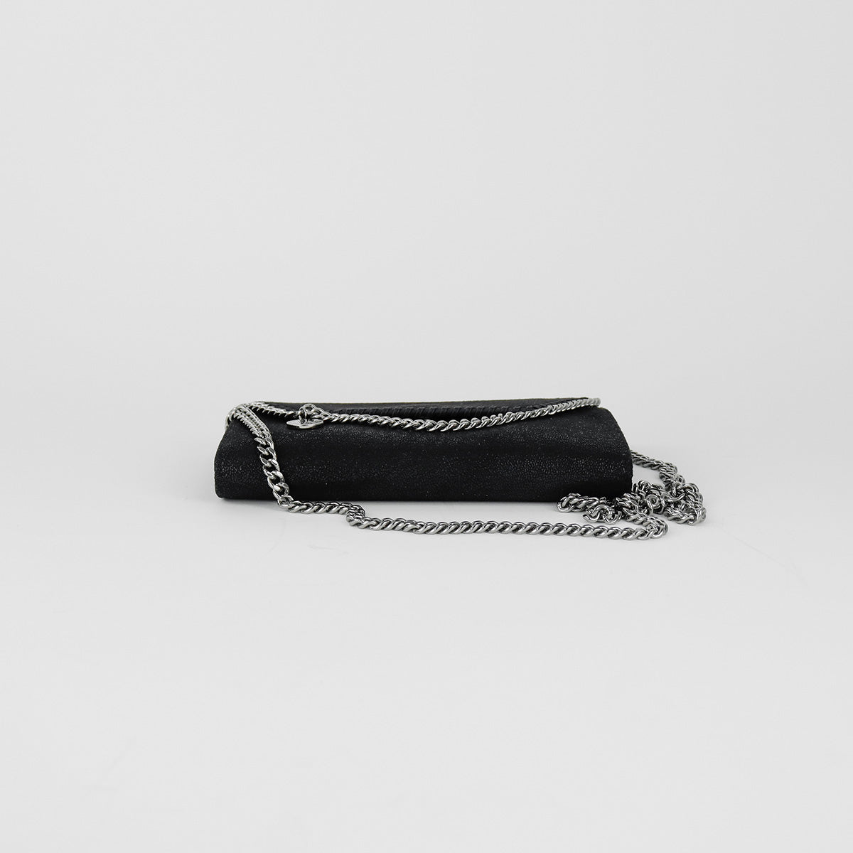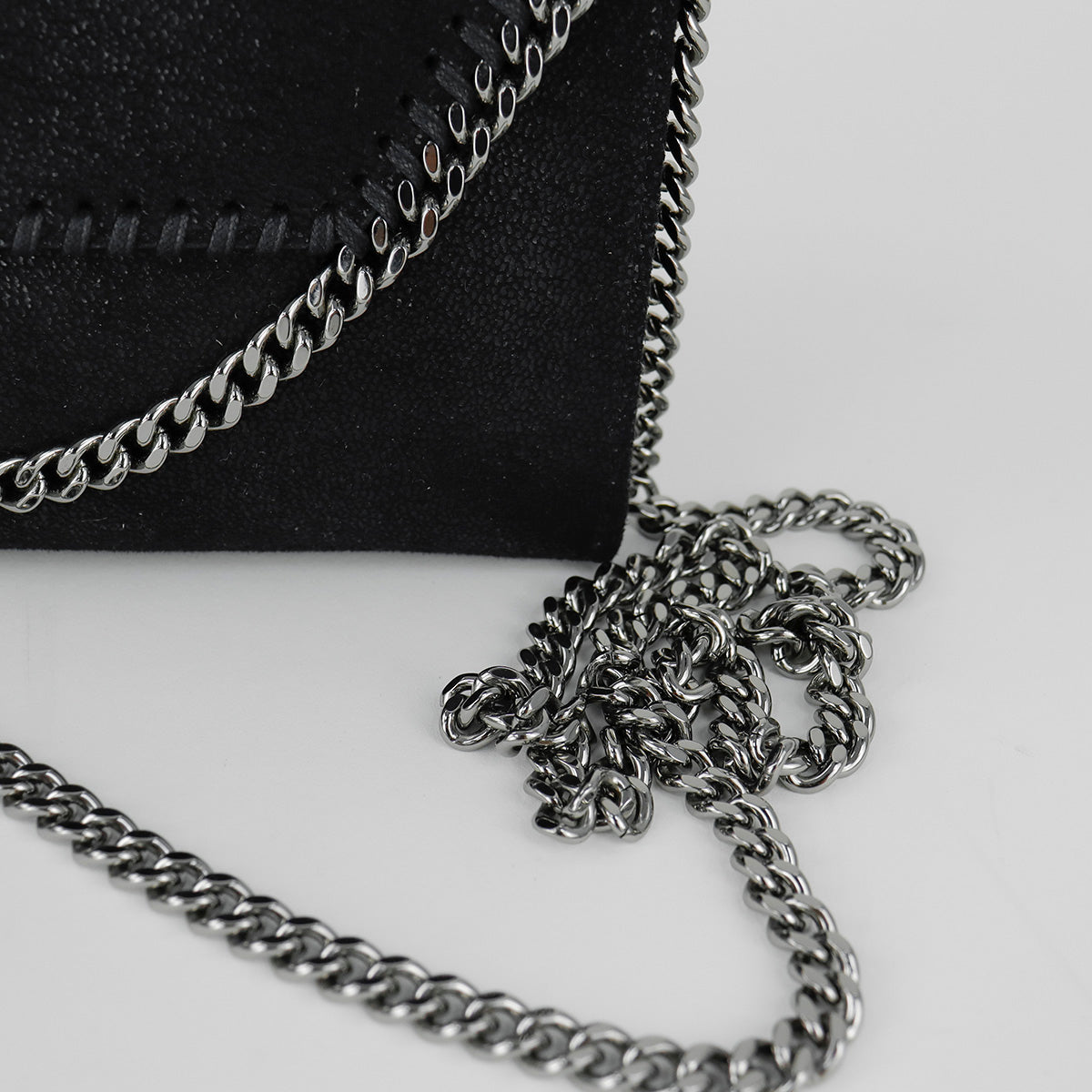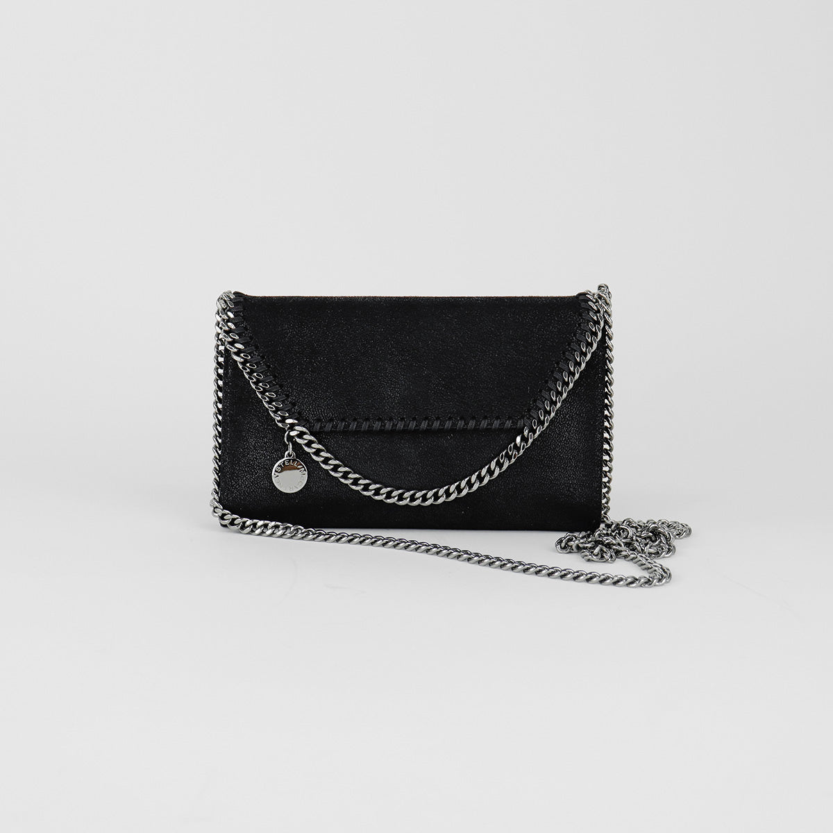 Bolso Stella McCartney, modelo Mini Falabella Crossbody Bag, confeccionado en cuero sintético color negro elaborado a base de poliéster reciclado o poliuretano, con forro interno en textil nude, con herrajes en color plateado.