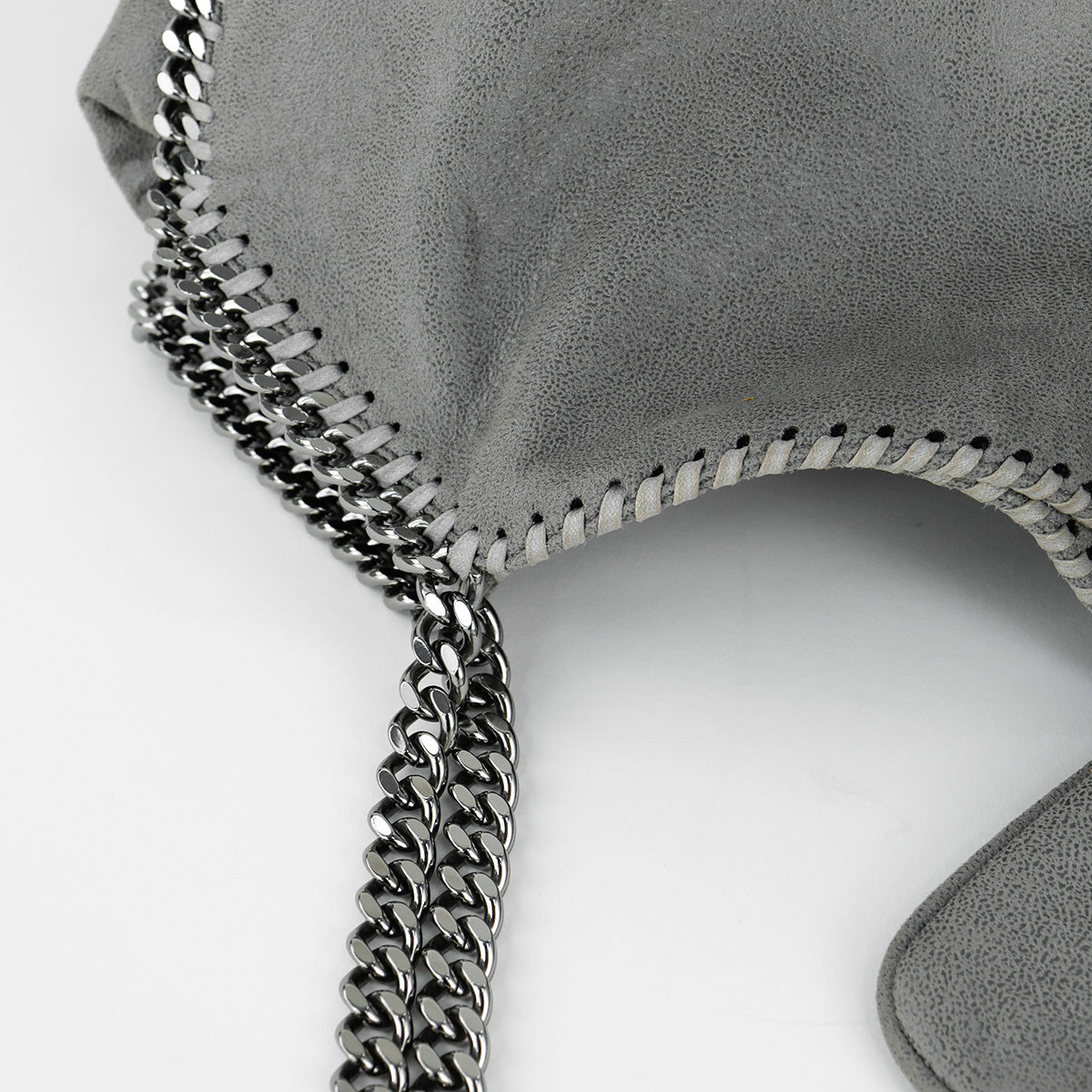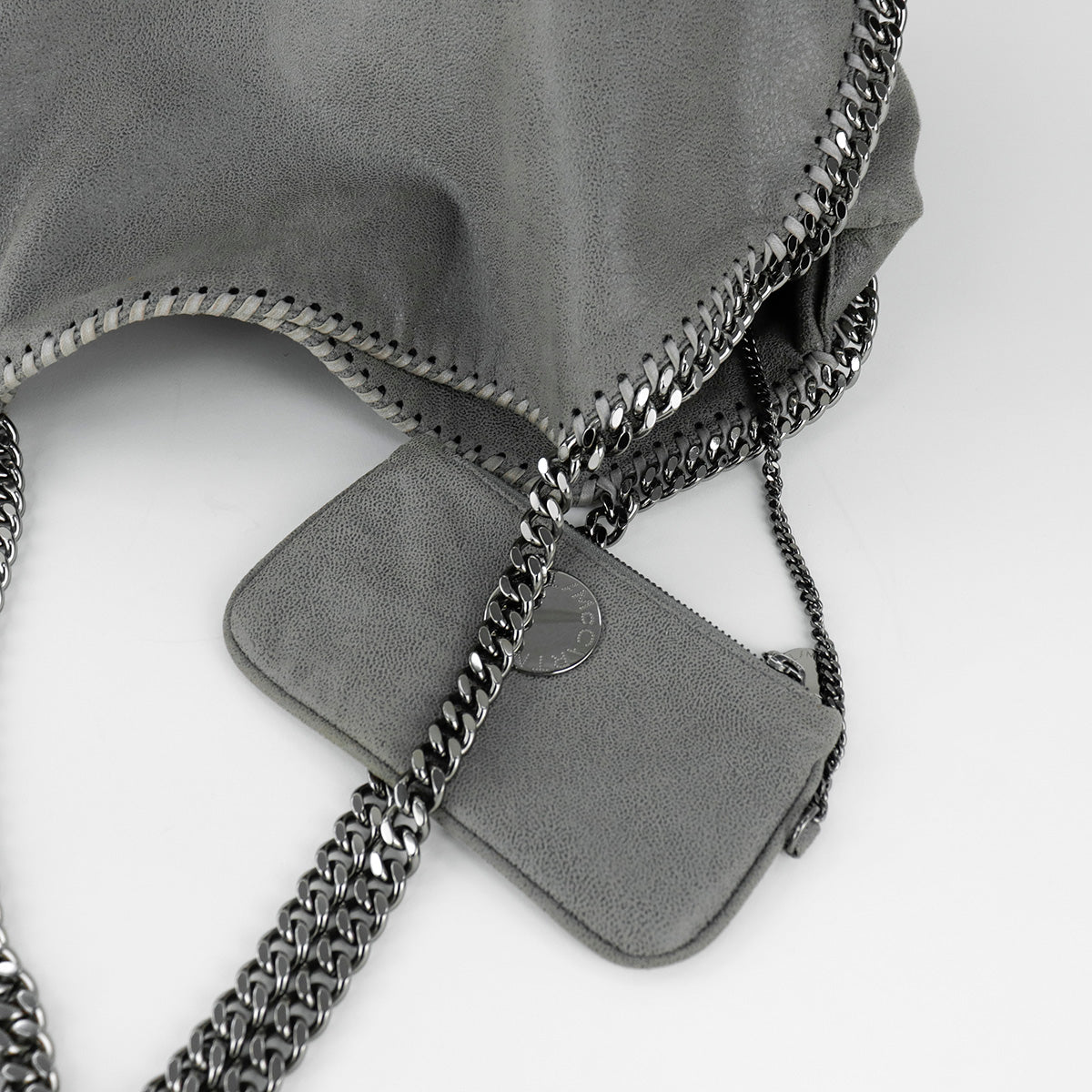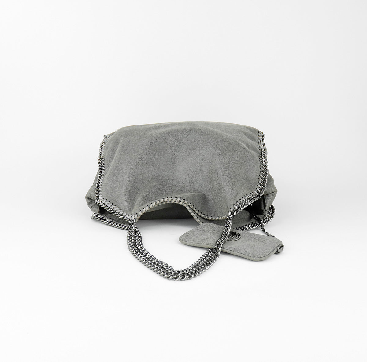 Bolso Stella McCartney, modelo Falabella Tote Bag, confeccionado en cuero sintético color gris elaborado a base de poliéster reciclado o poliuretano, con forro interno en textil nude, con herrajes en color plateado y monedero extraíble.