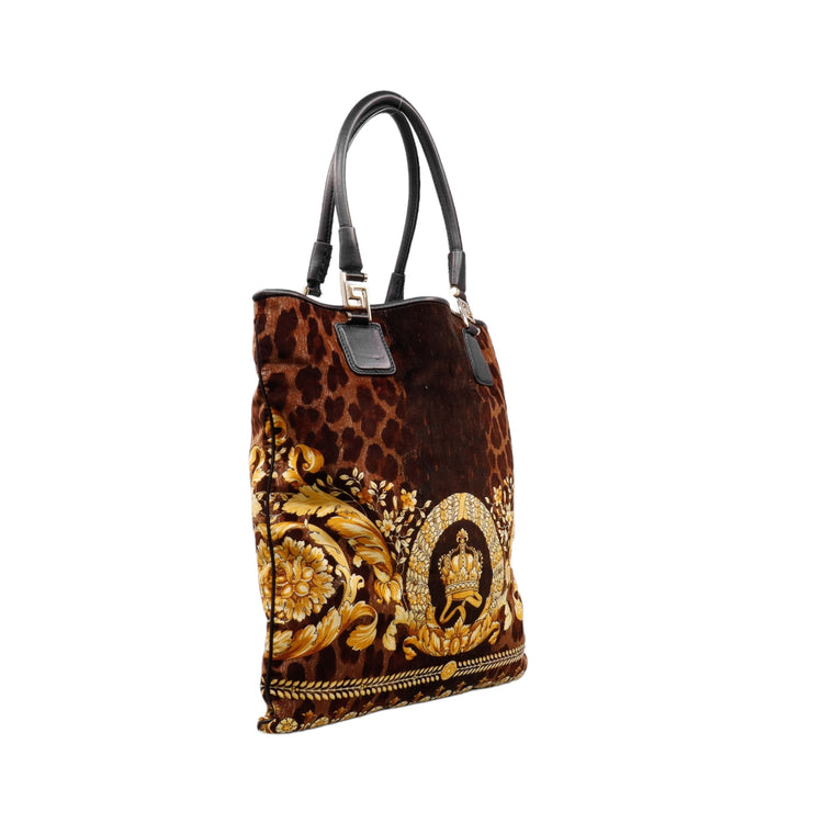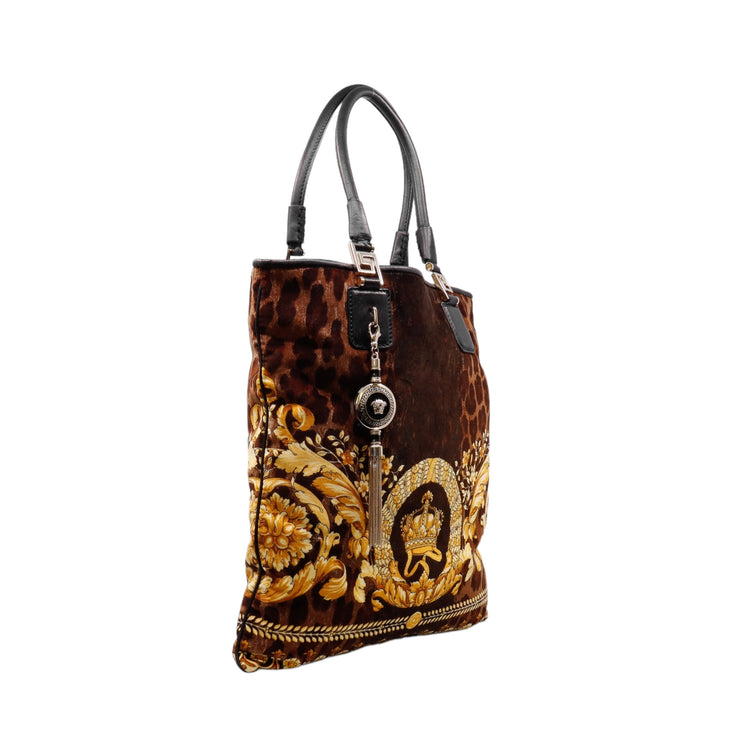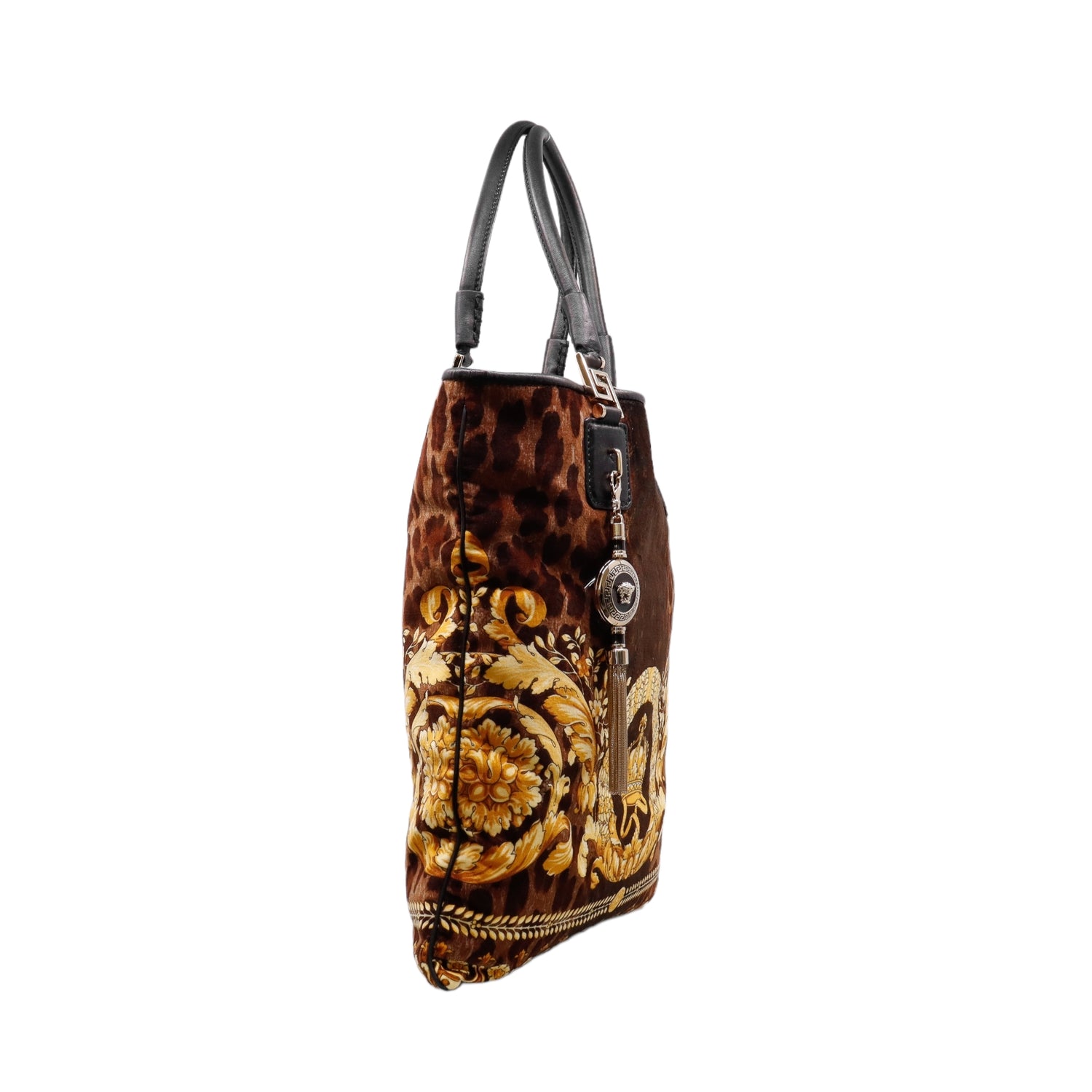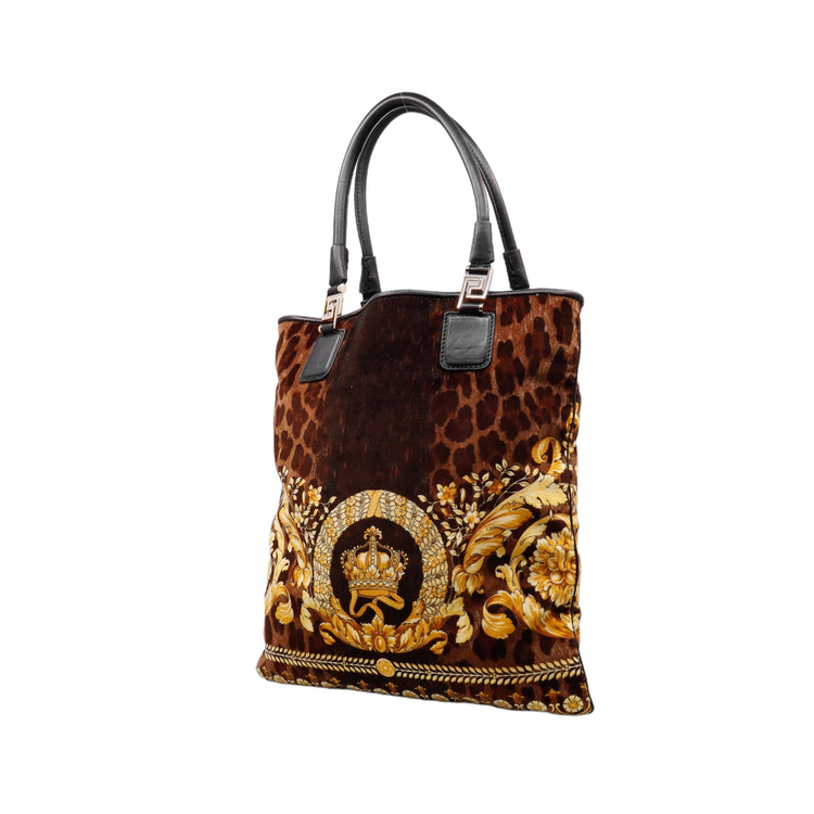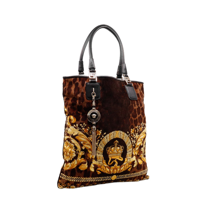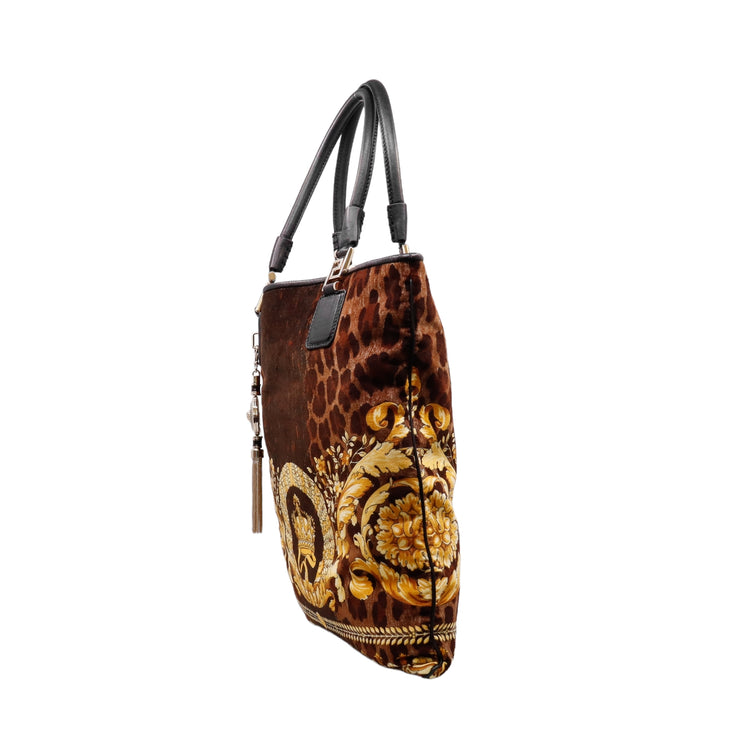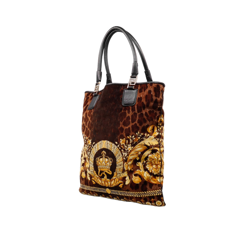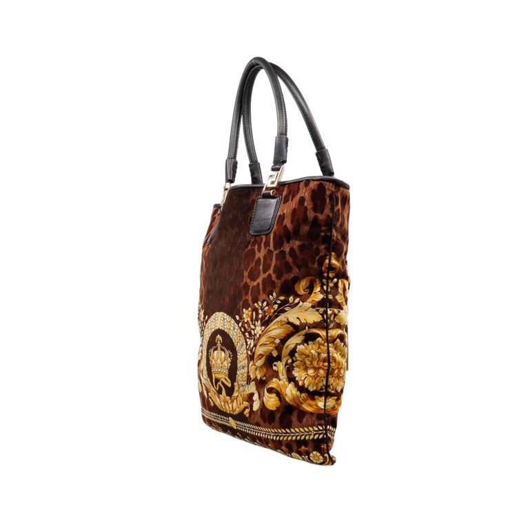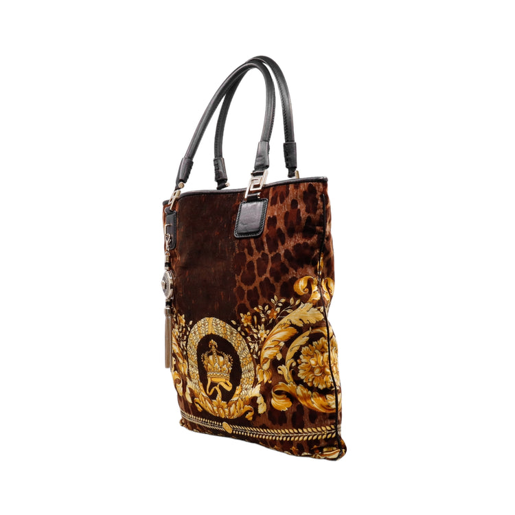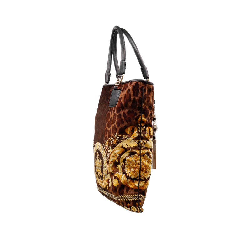 Bolsa tipo tote marca Versace de la línea Vanitas bag, confeccionada en textil aterciopelado animal print, con 2 asas de piel, cierre superior con seguro de botón magnético, con charm y herrajes en color dorado.